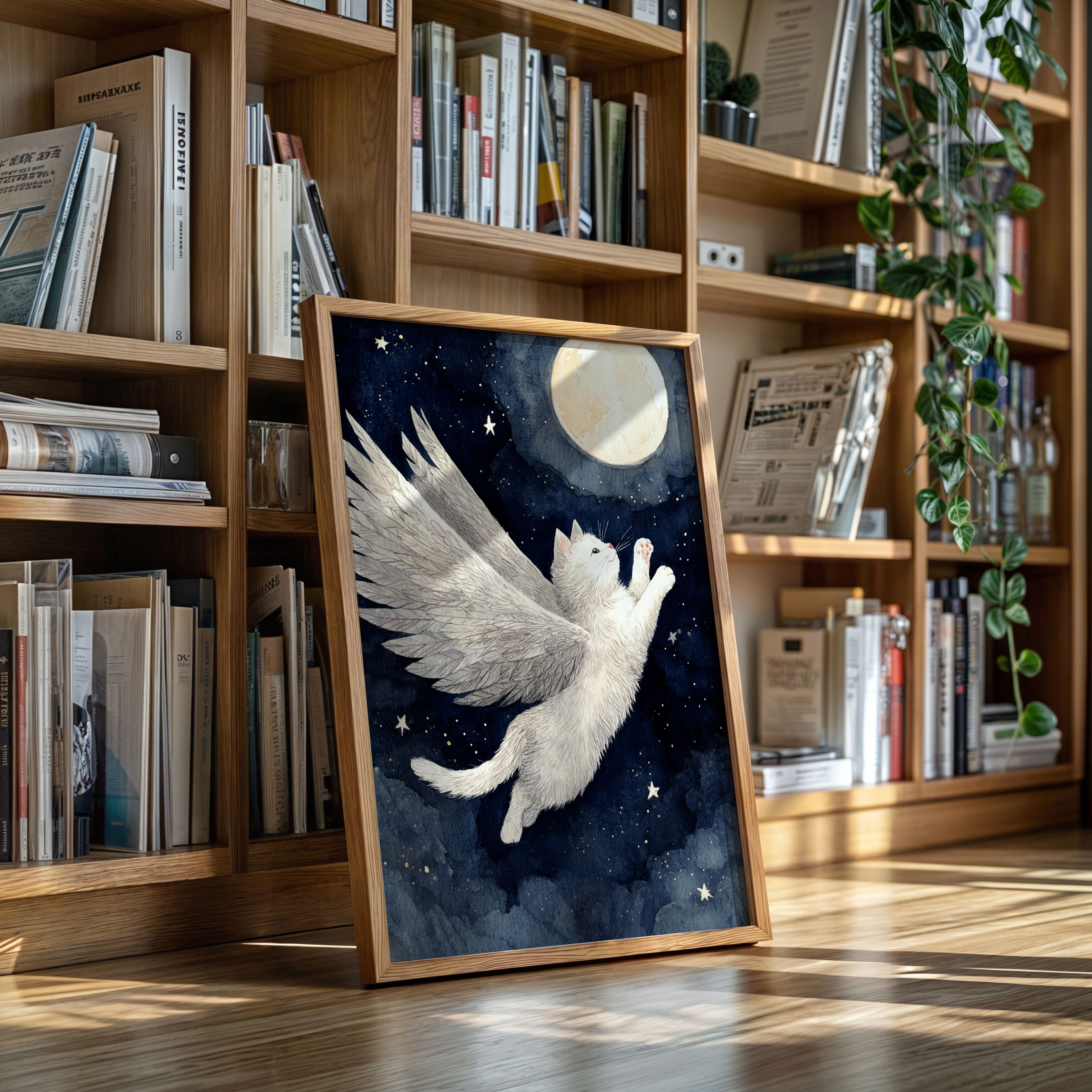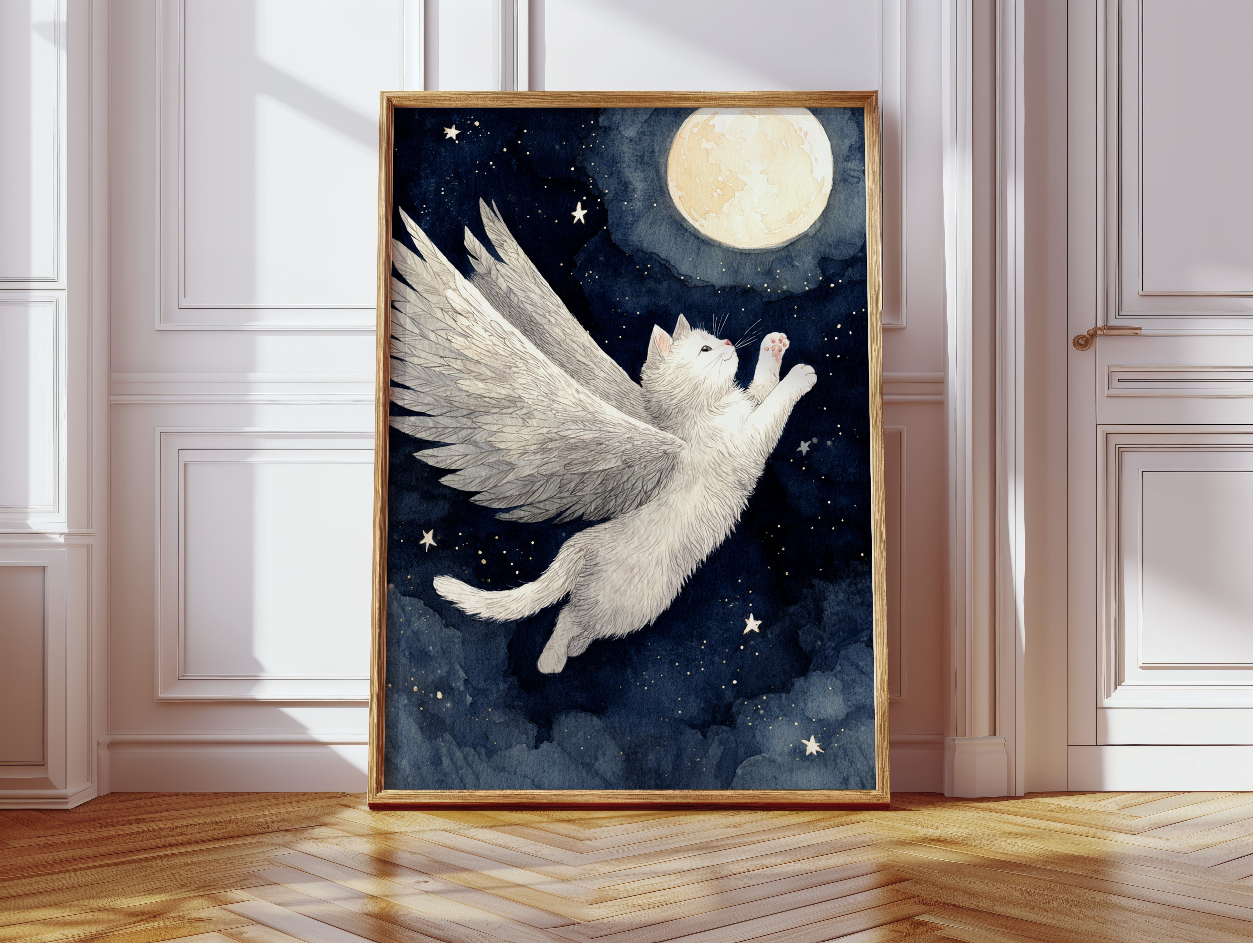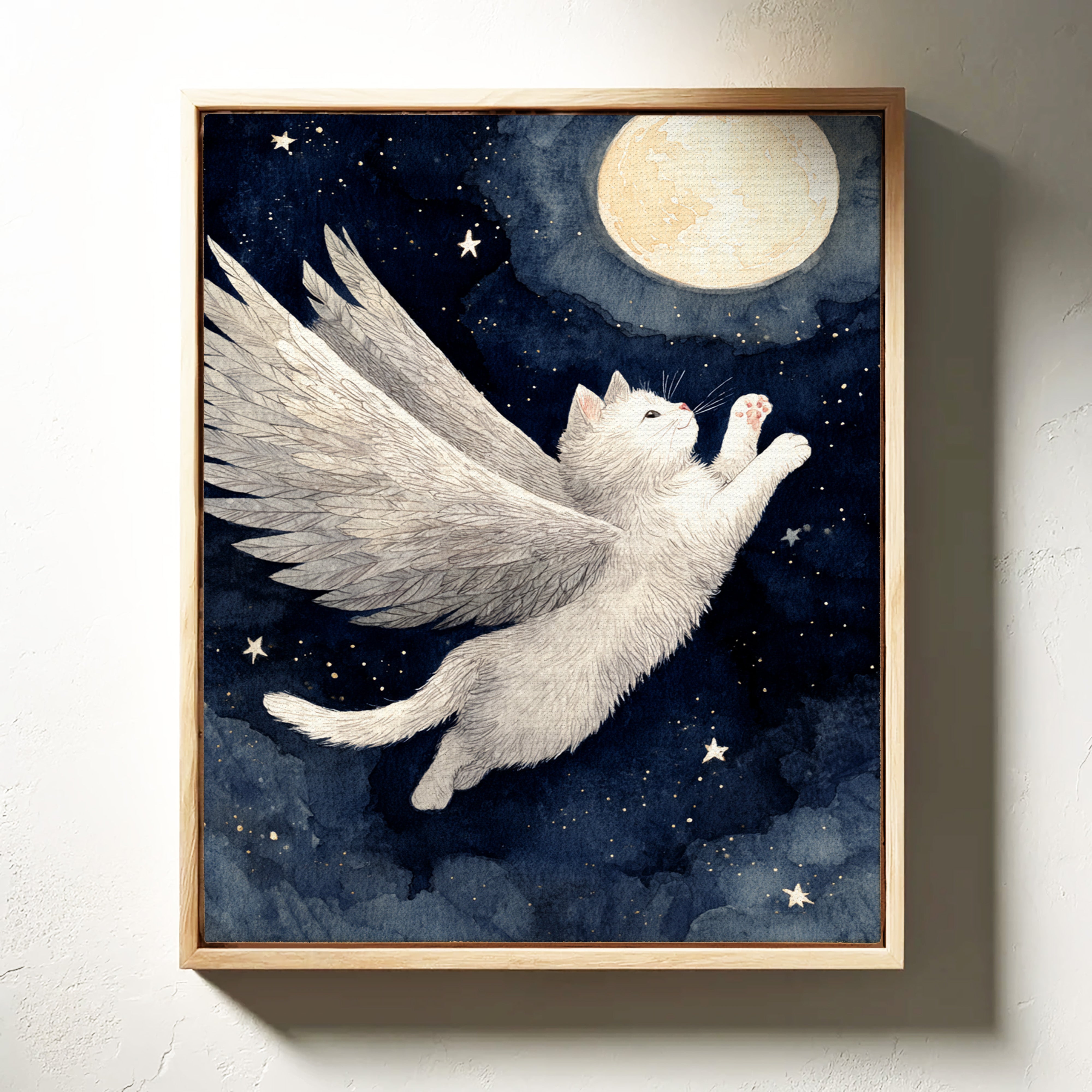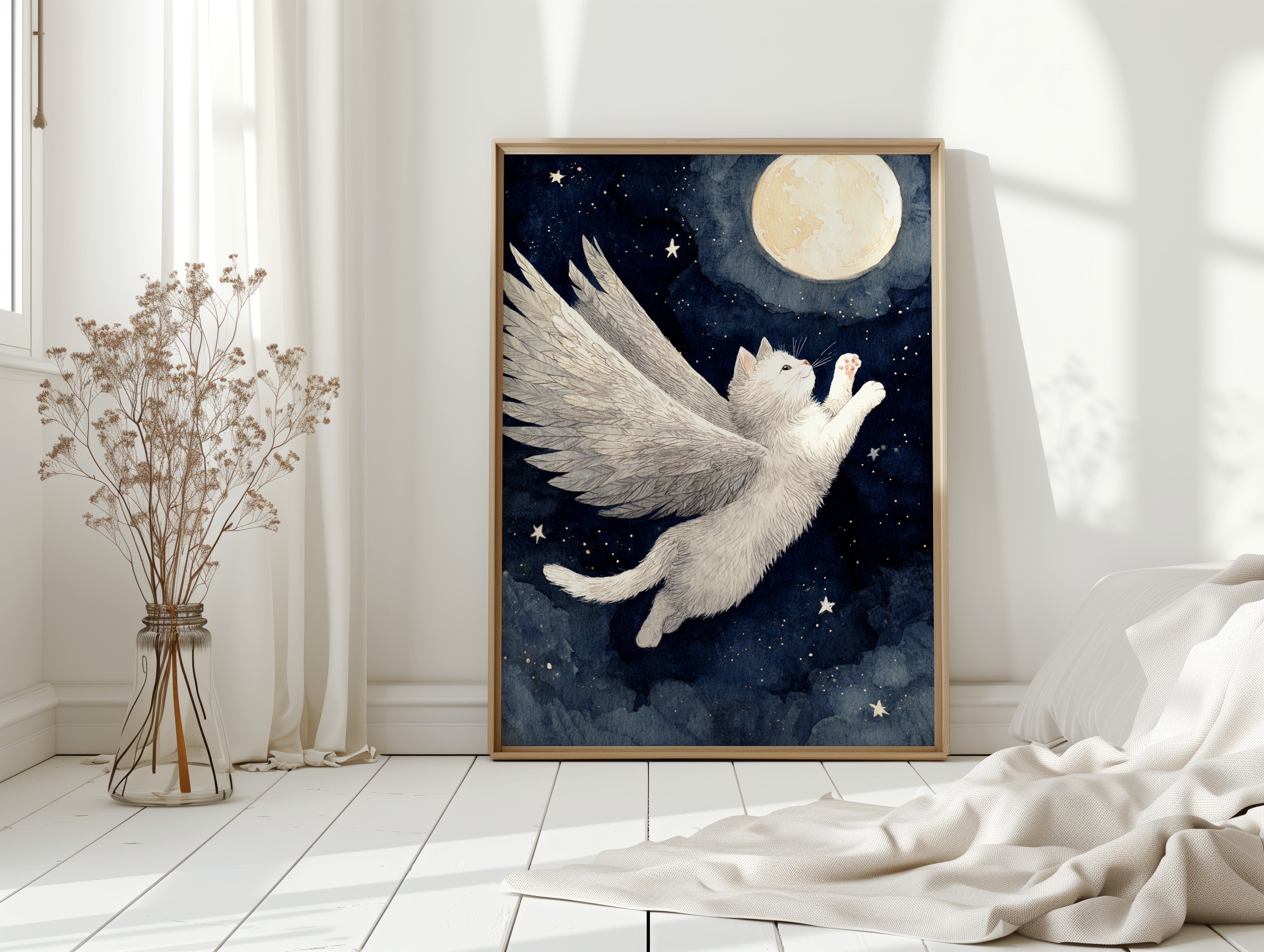 In a midnight ballet, a feline leaps, wings unfurled, reaching for celestial wonders. This piece captures the artisanal charm of whimsy and wonder. The soft, muted colors blend harmoniously, evoking a sense of tranquility as the cat ascends through the starry expanse, each feather shimmering with the light of a thousand dreams. Ideal for a cozy nook or a child's bedroom, inviting imagination and warmth.