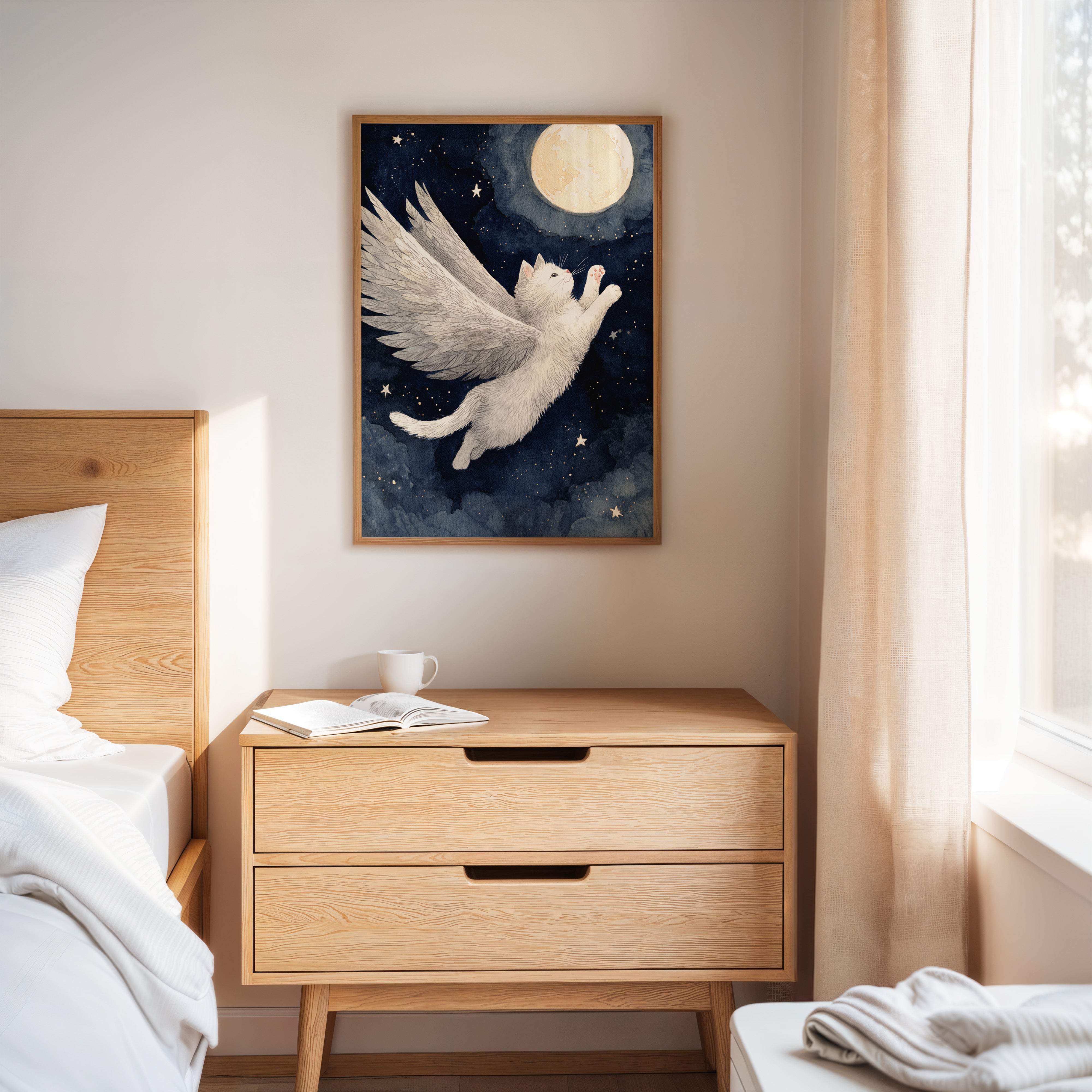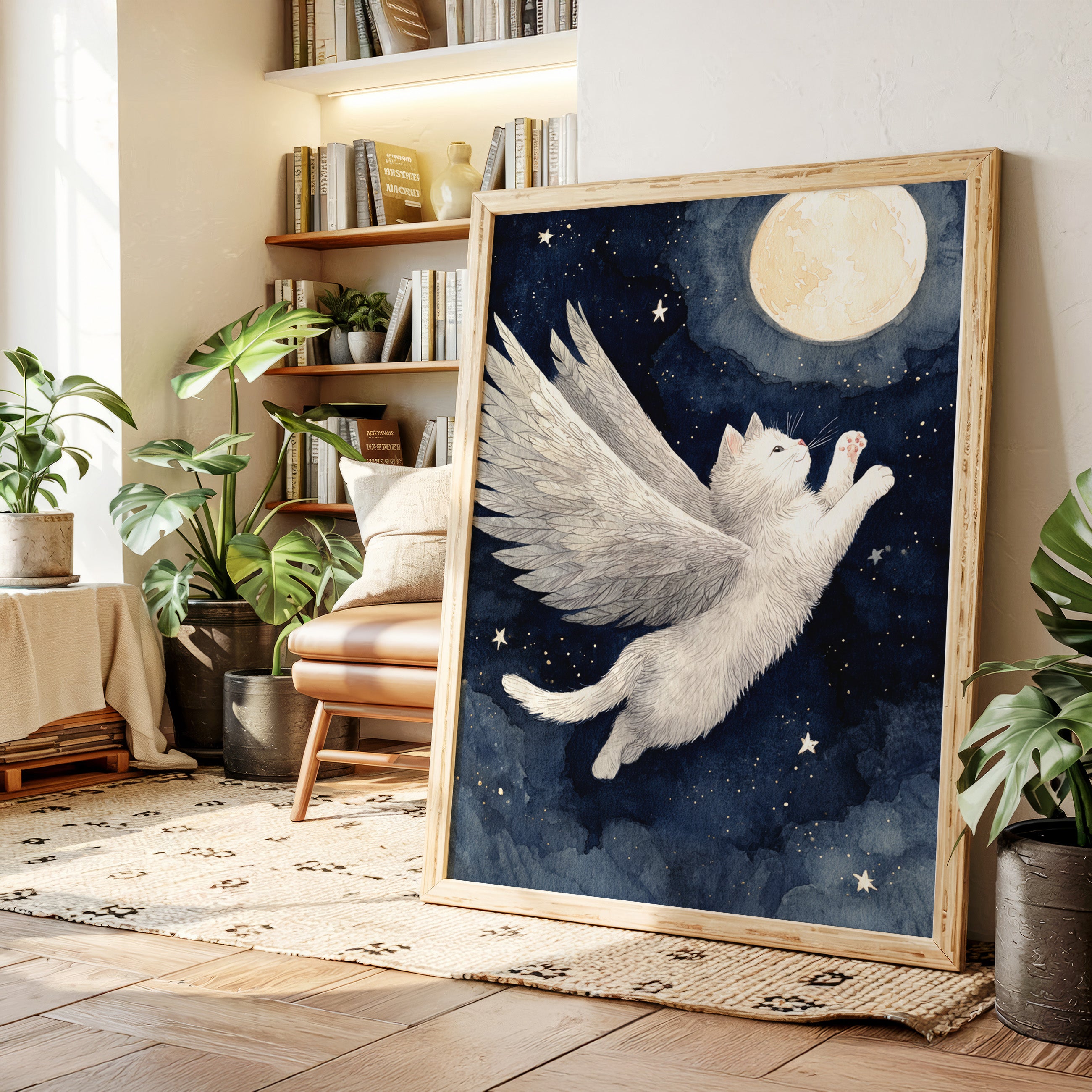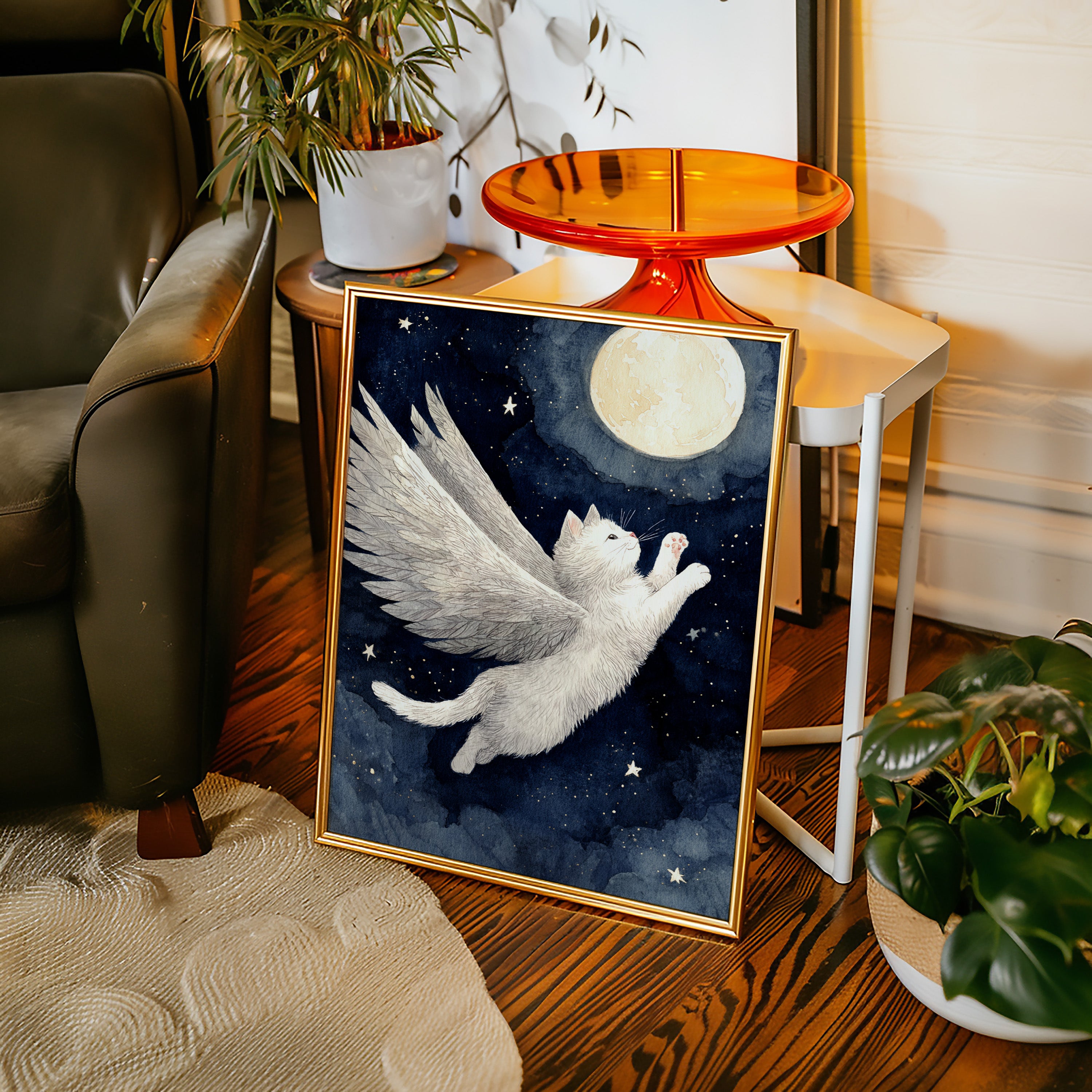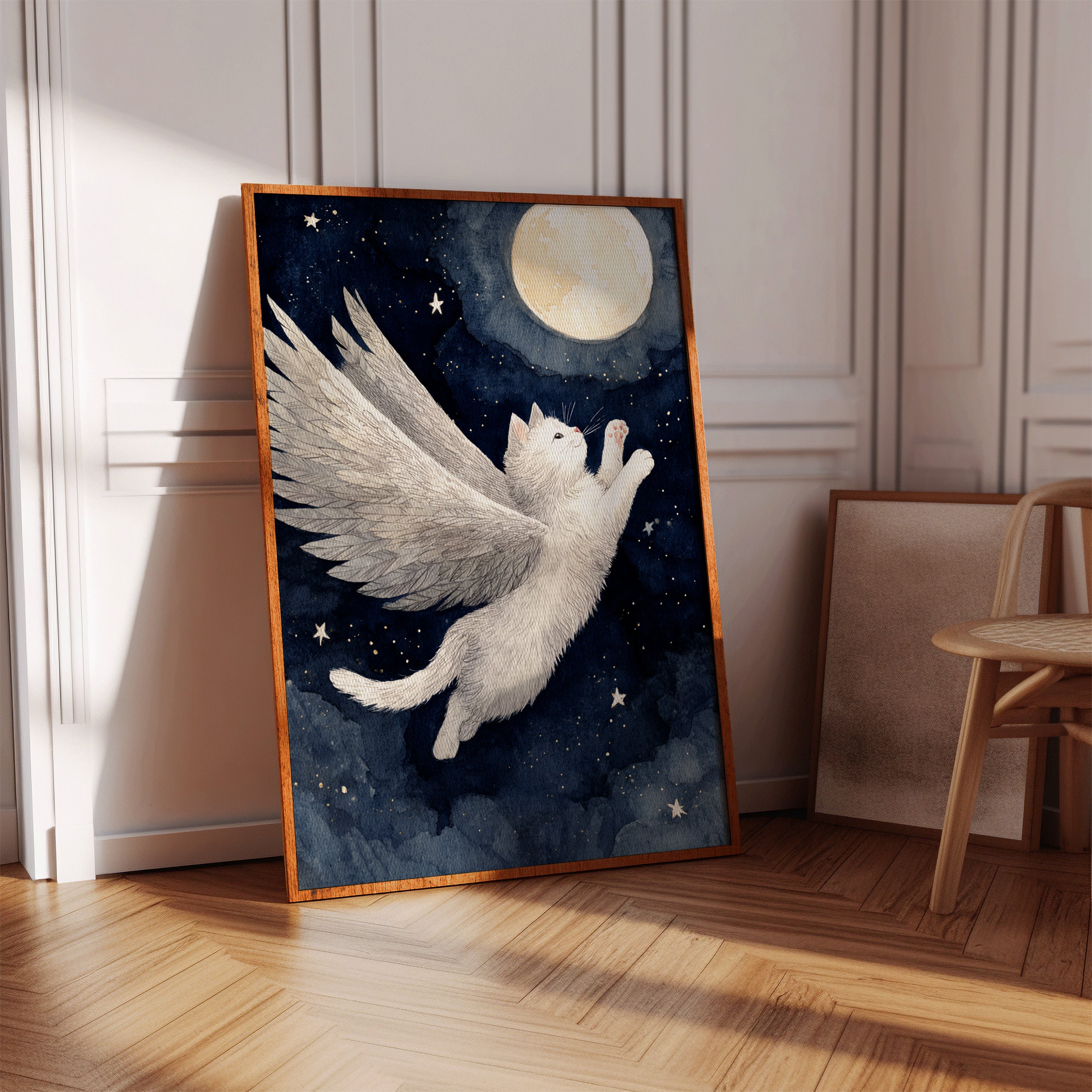In a midnight ballet, a feline leaps, wings unfurled, reaching for celestial wonders. This piece captures the artisanal charm of whimsy and wonder. The soft, muted colors blend harmoniously, evoking a sense of tranquility as the cat ascends through the starry expanse, each feather shimmering with the light of a thousand dreams. Ideal for a cozy nook or a child's bedroom, inviting imagination and warmth.