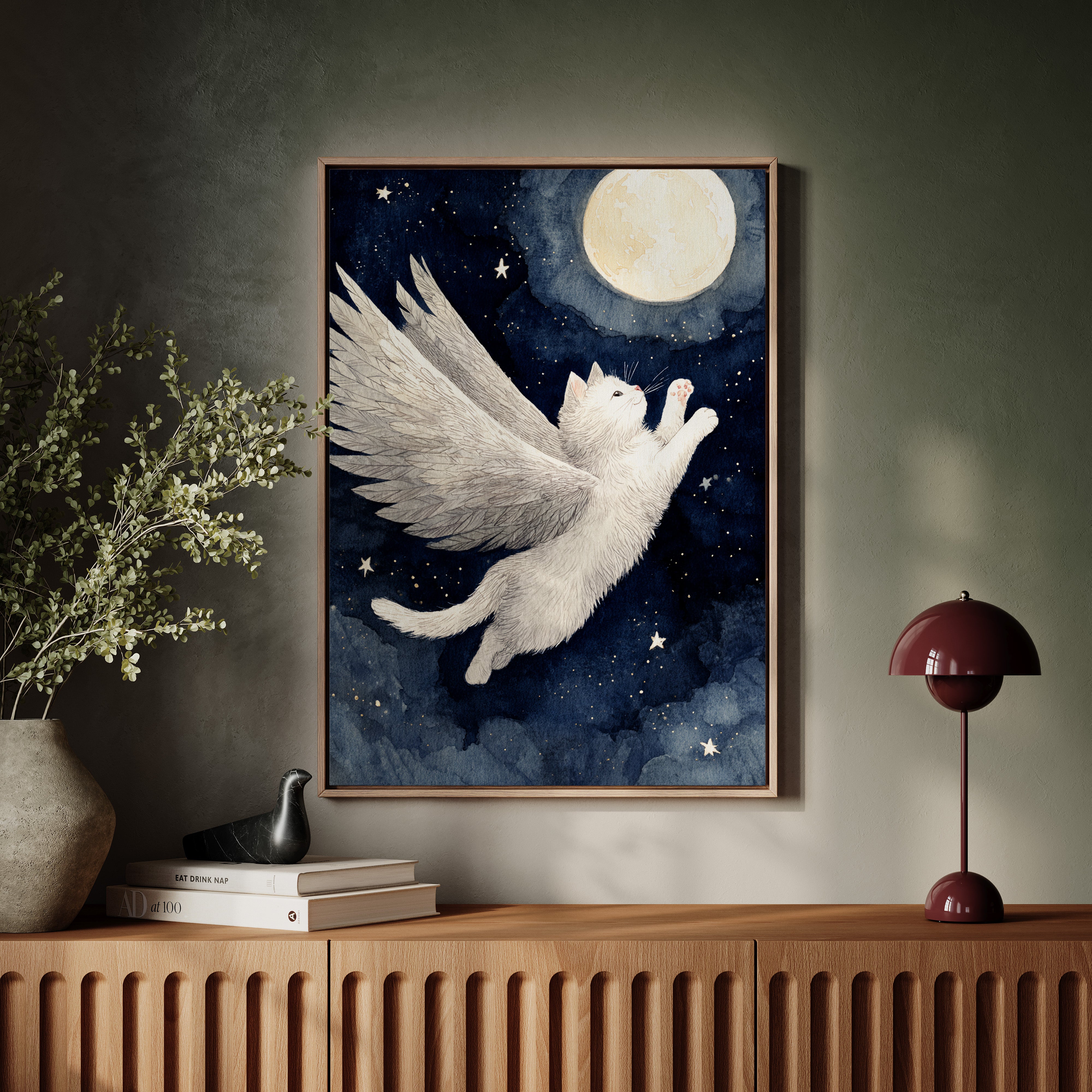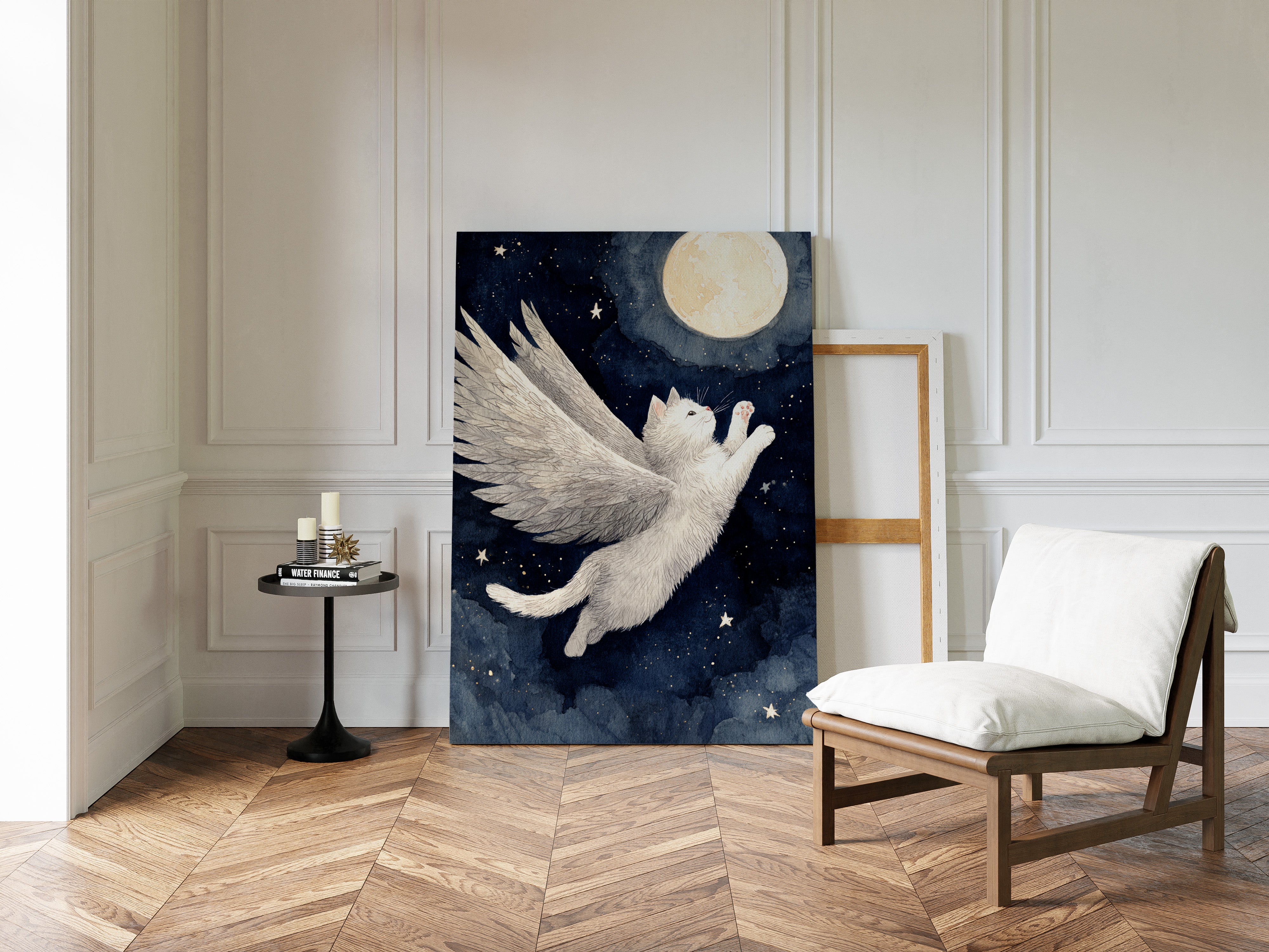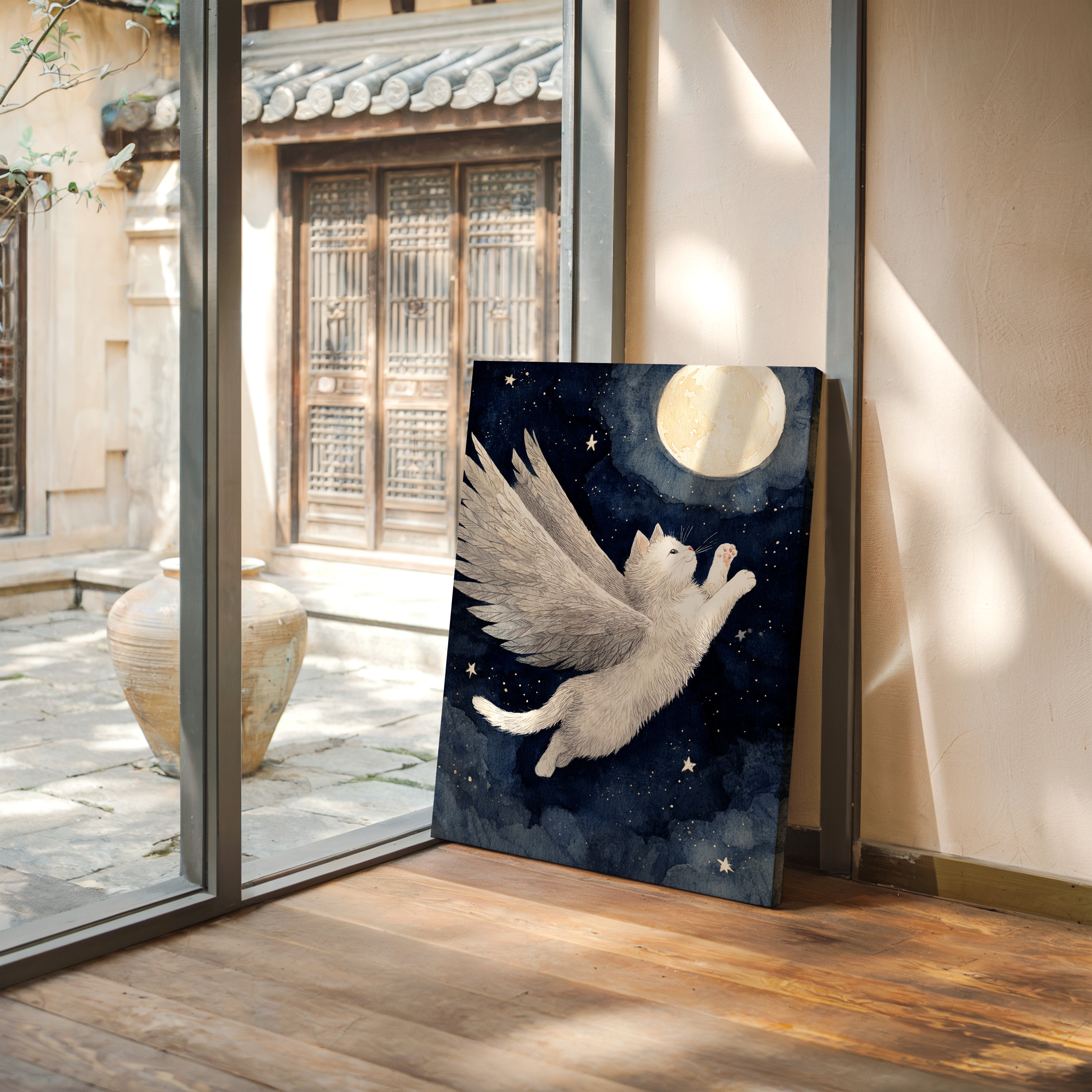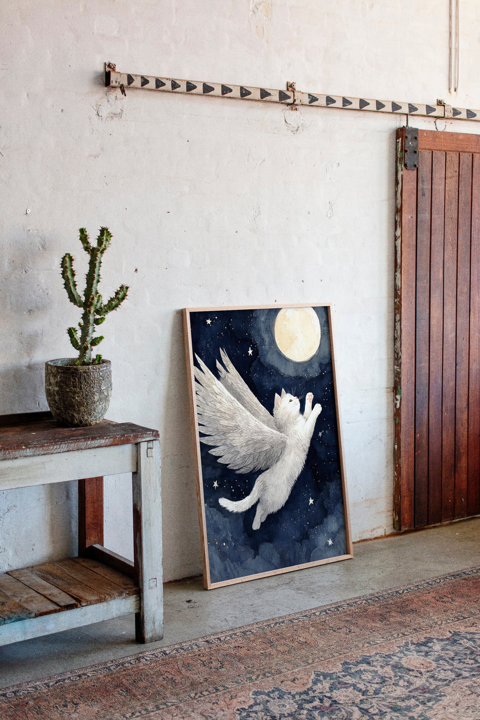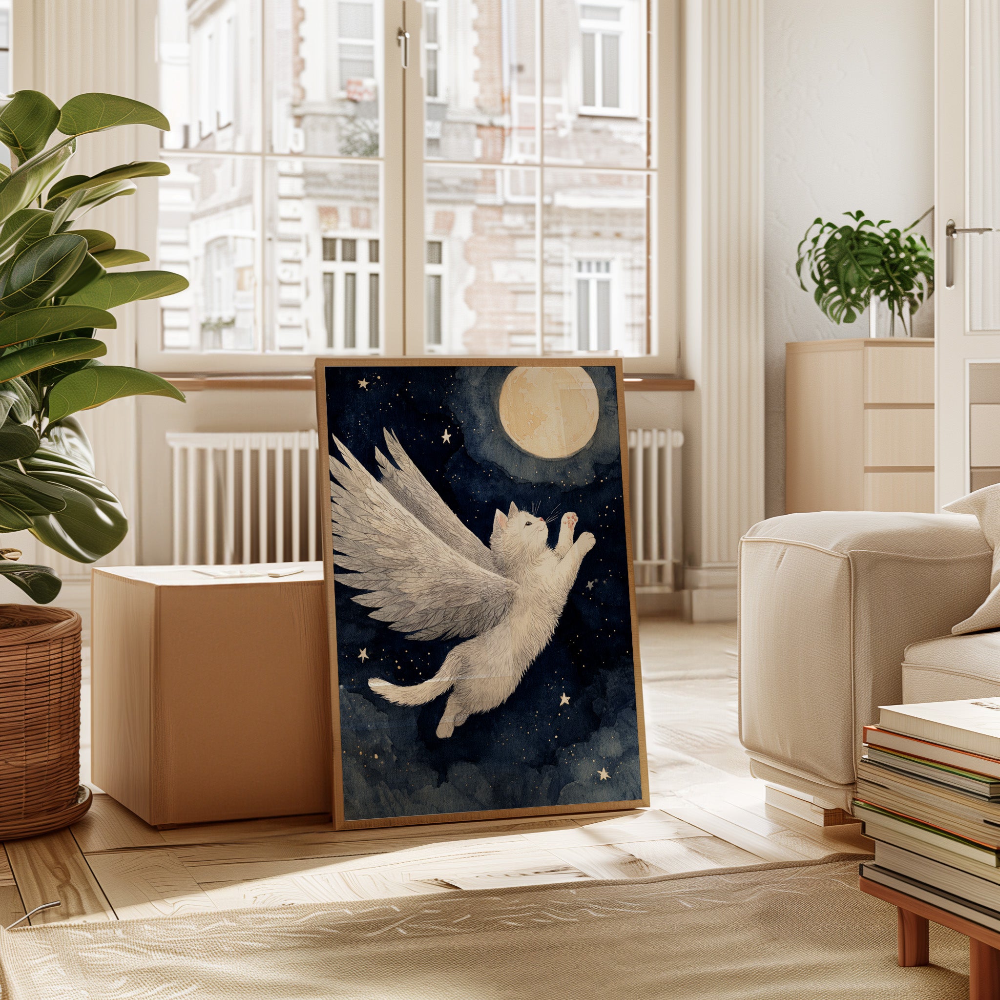 In a midnight ballet, a feline leaps, wings unfurled, reaching for celestial wonders. This piece captures the artisanal charm of whimsy and wonder. The soft, muted colors blend harmoniously, evoking a sense of tranquility as the cat ascends through the starry expanse, each feather shimmering with the light of a thousand dreams. Ideal for a cozy nook or a child's bedroom, inviting imagination and warmth.