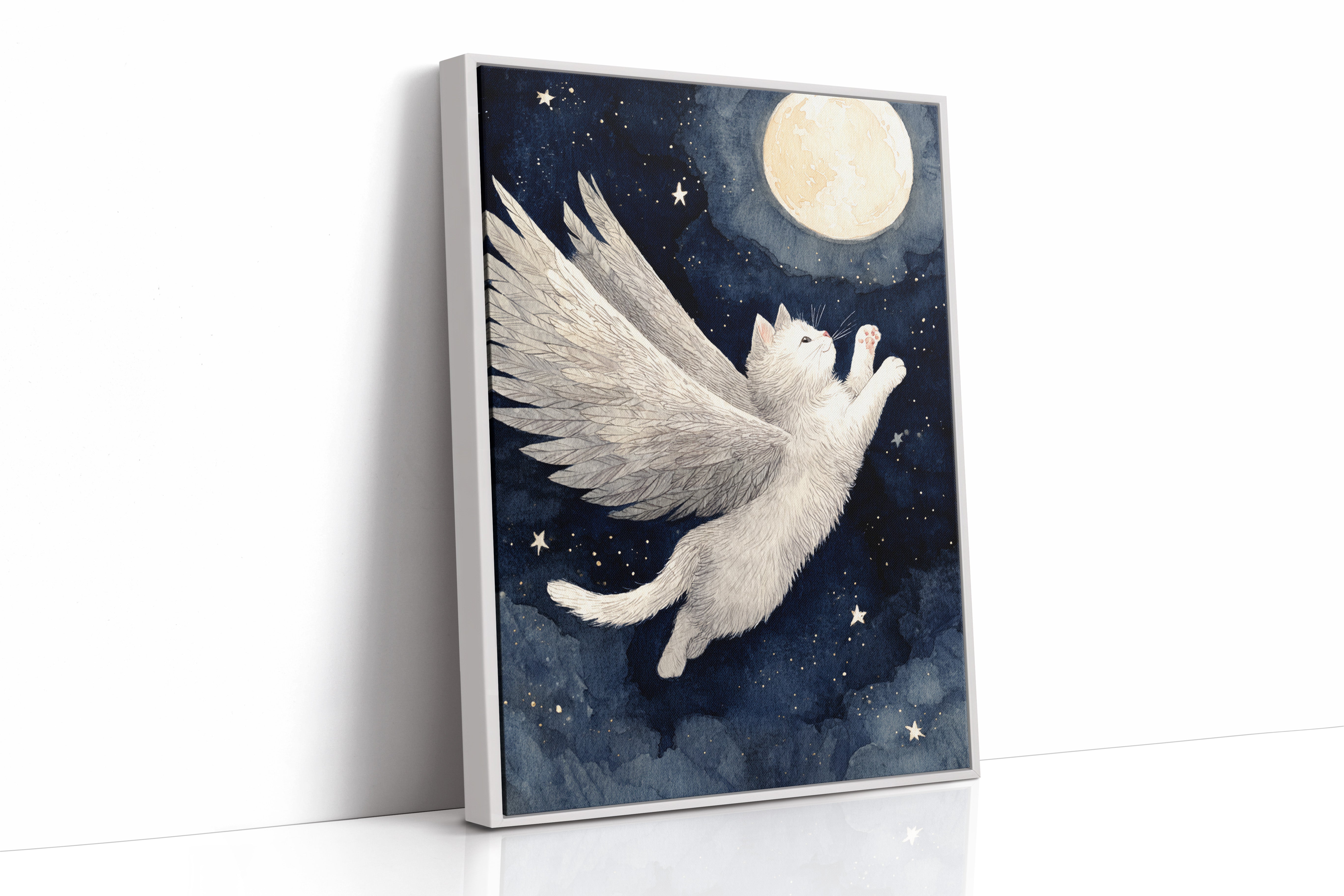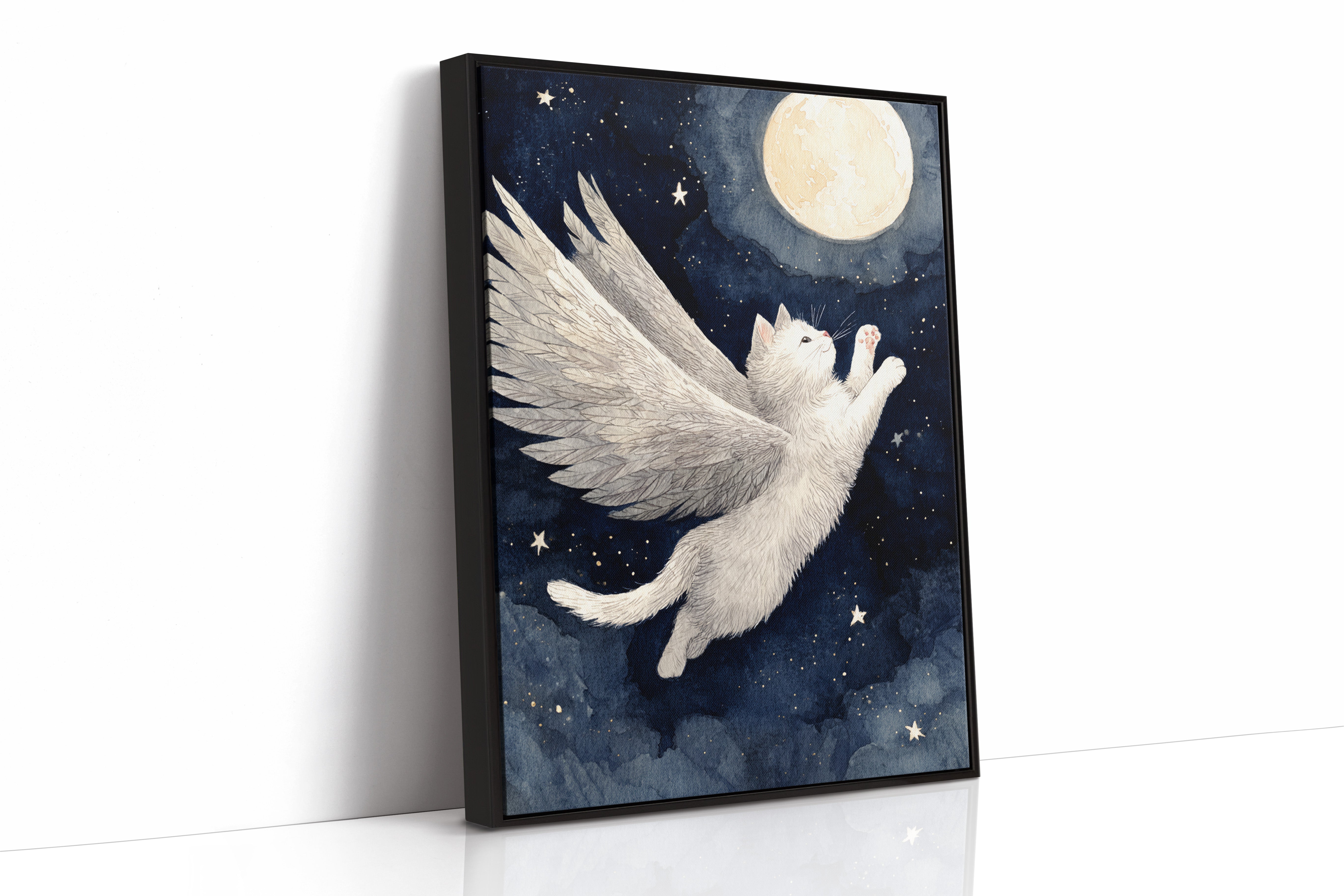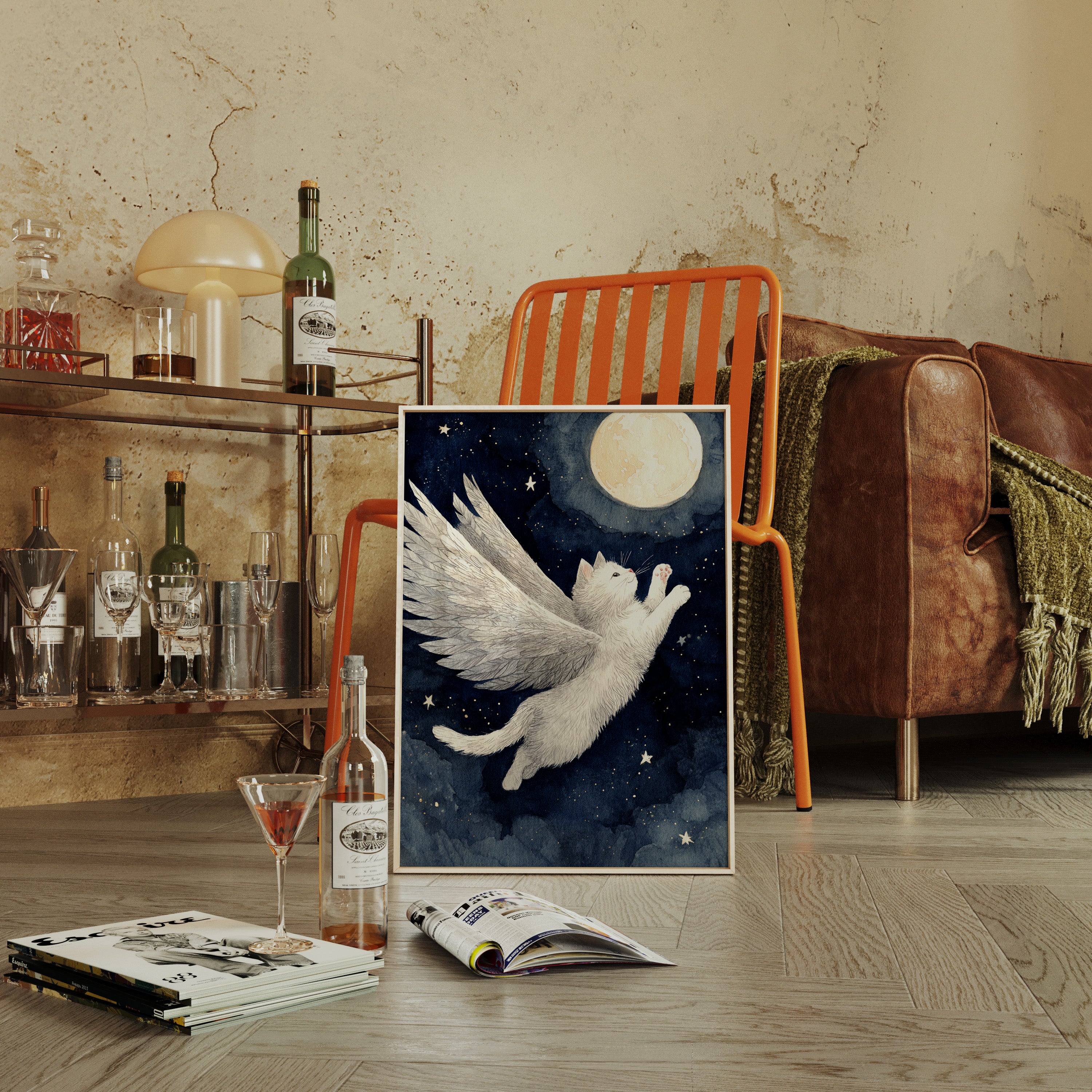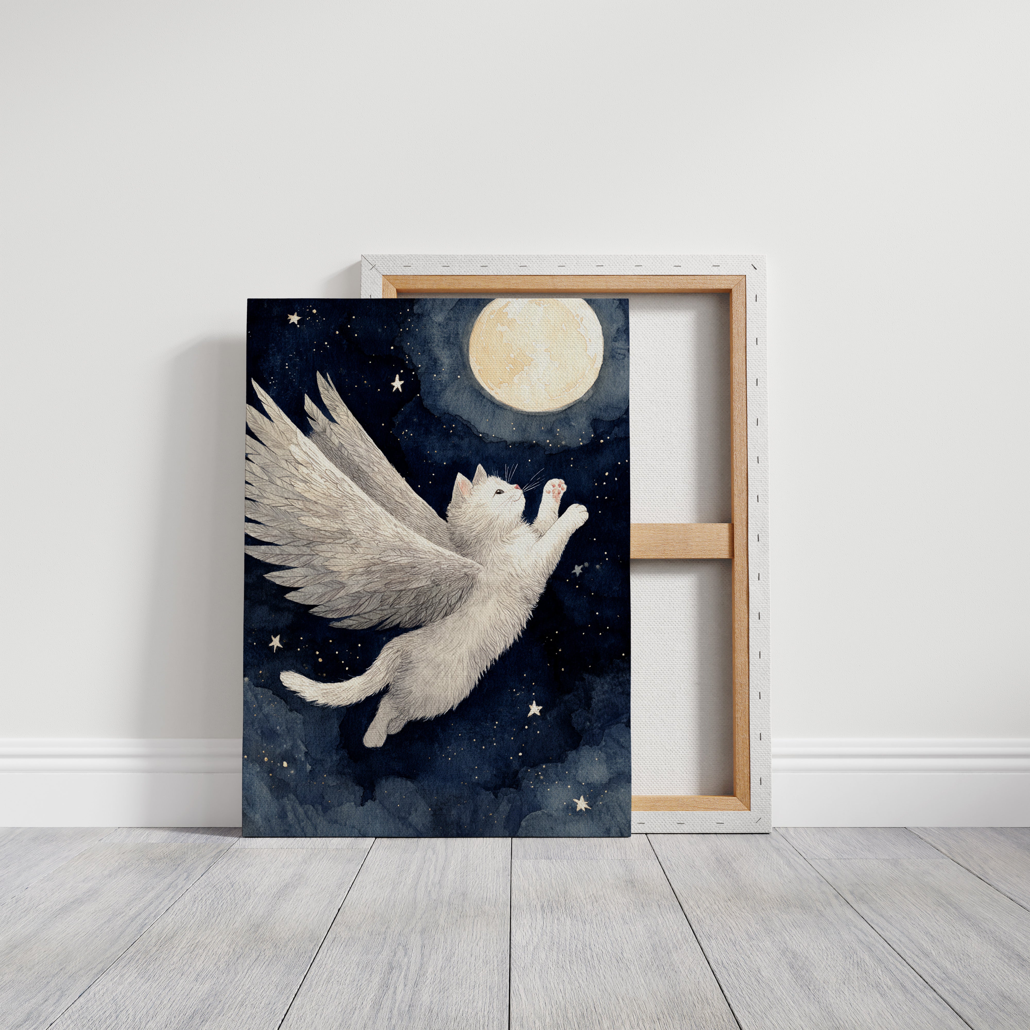In a midnight ballet, a feline leaps, wings unfurled, reaching for celestial wonders. This piece captures the artisanal charm of whimsy and wonder. The soft, muted colors blend harmoniously, evoking a sense of tranquility as the cat ascends through the starry expanse, each feather shimmering with the light of a thousand dreams. Ideal for a cozy nook or a child's bedroom, inviting imagination and warmth.