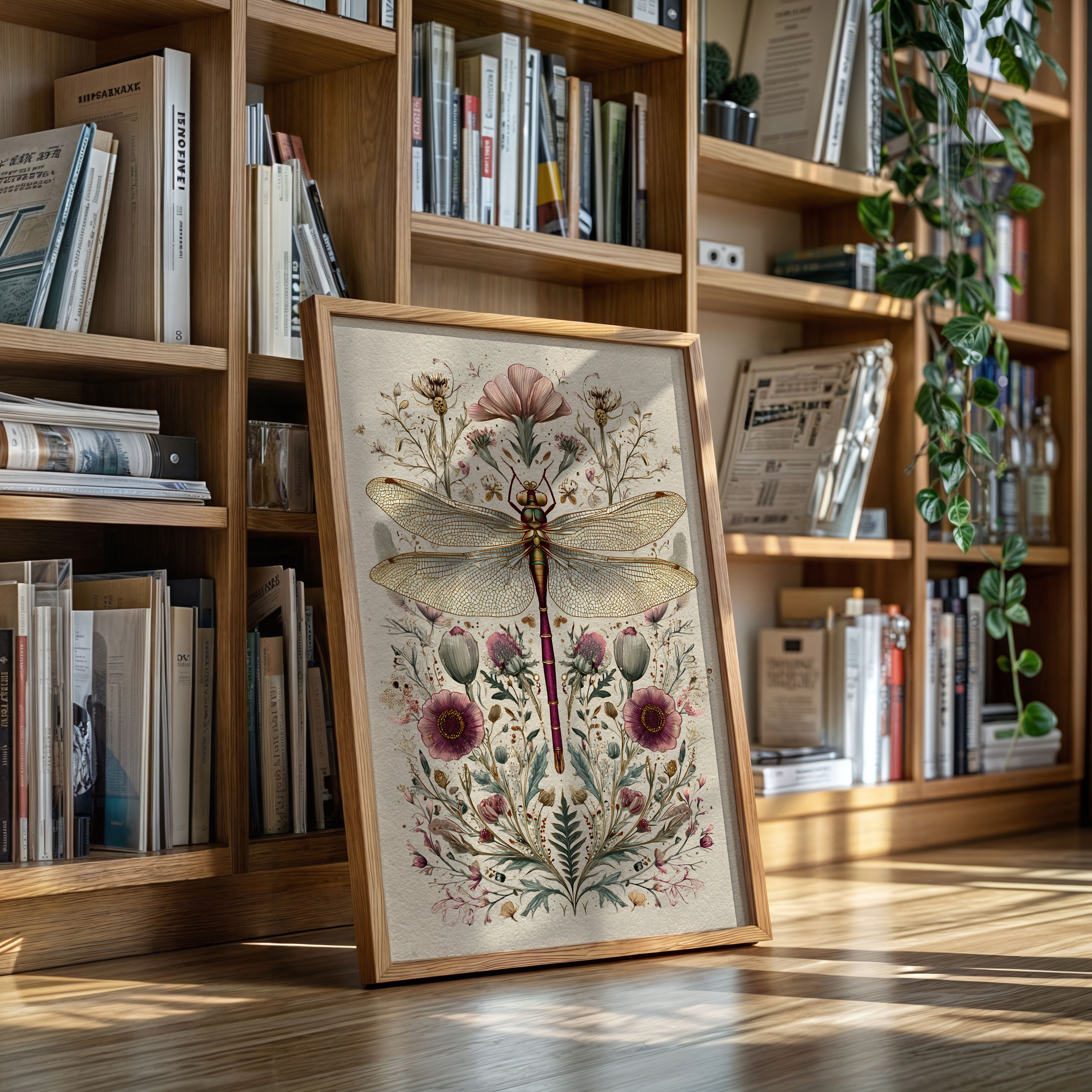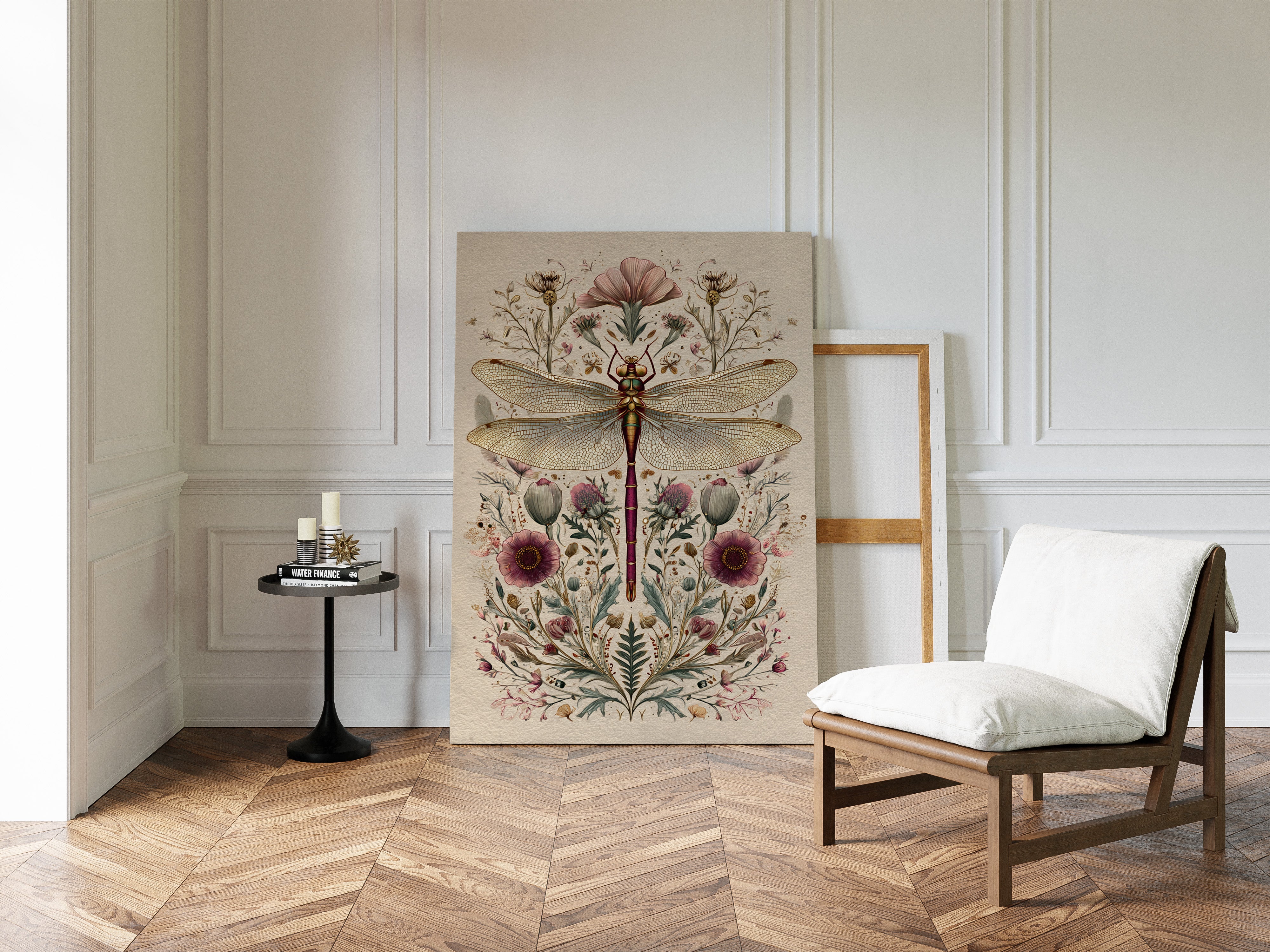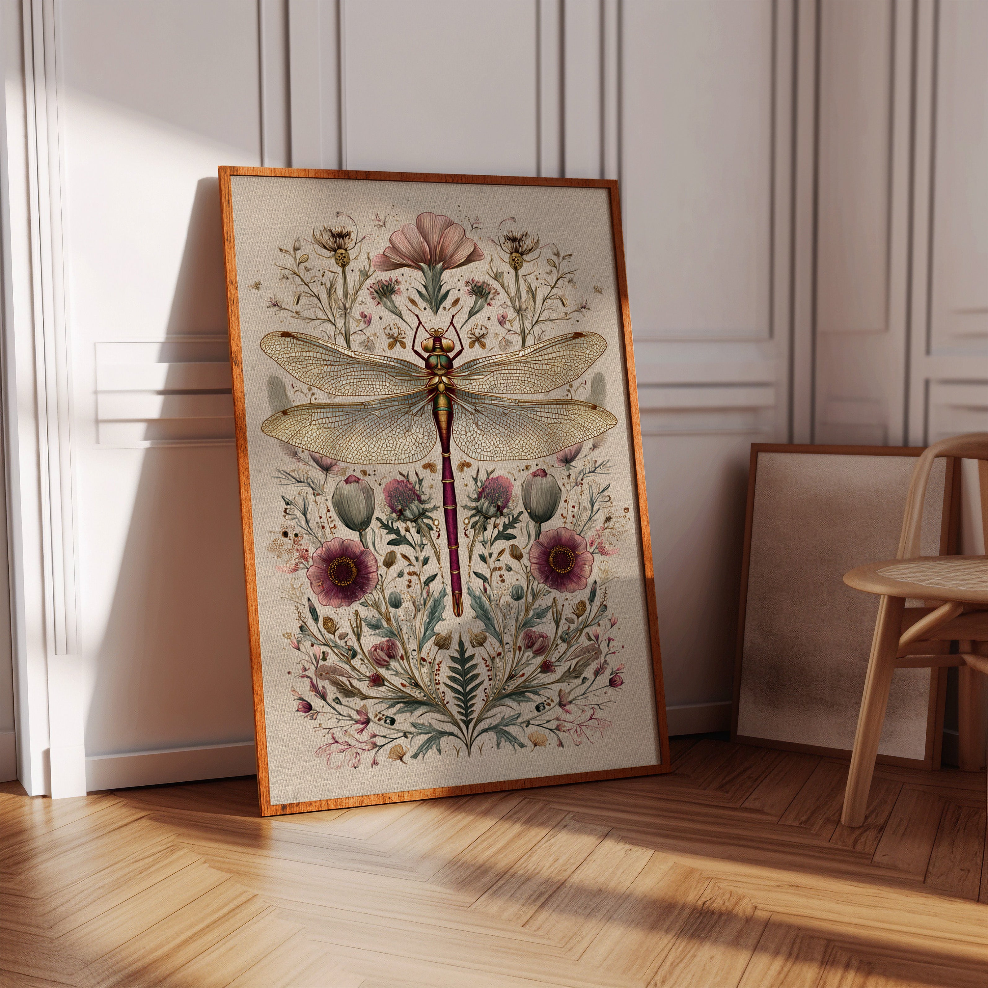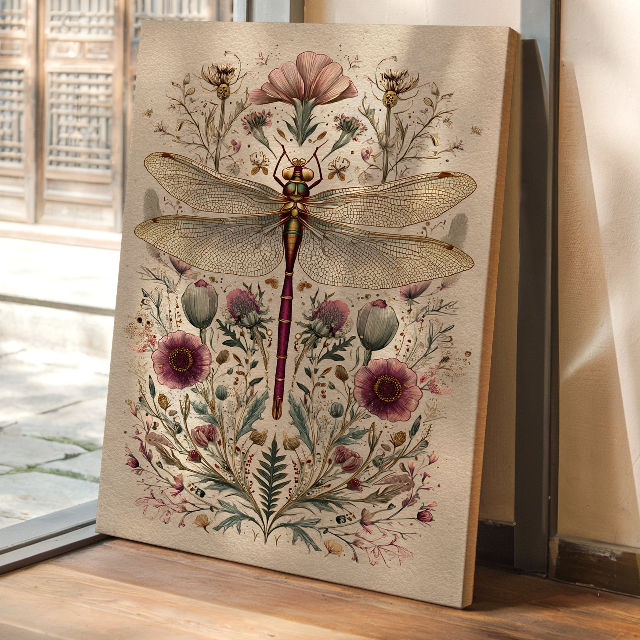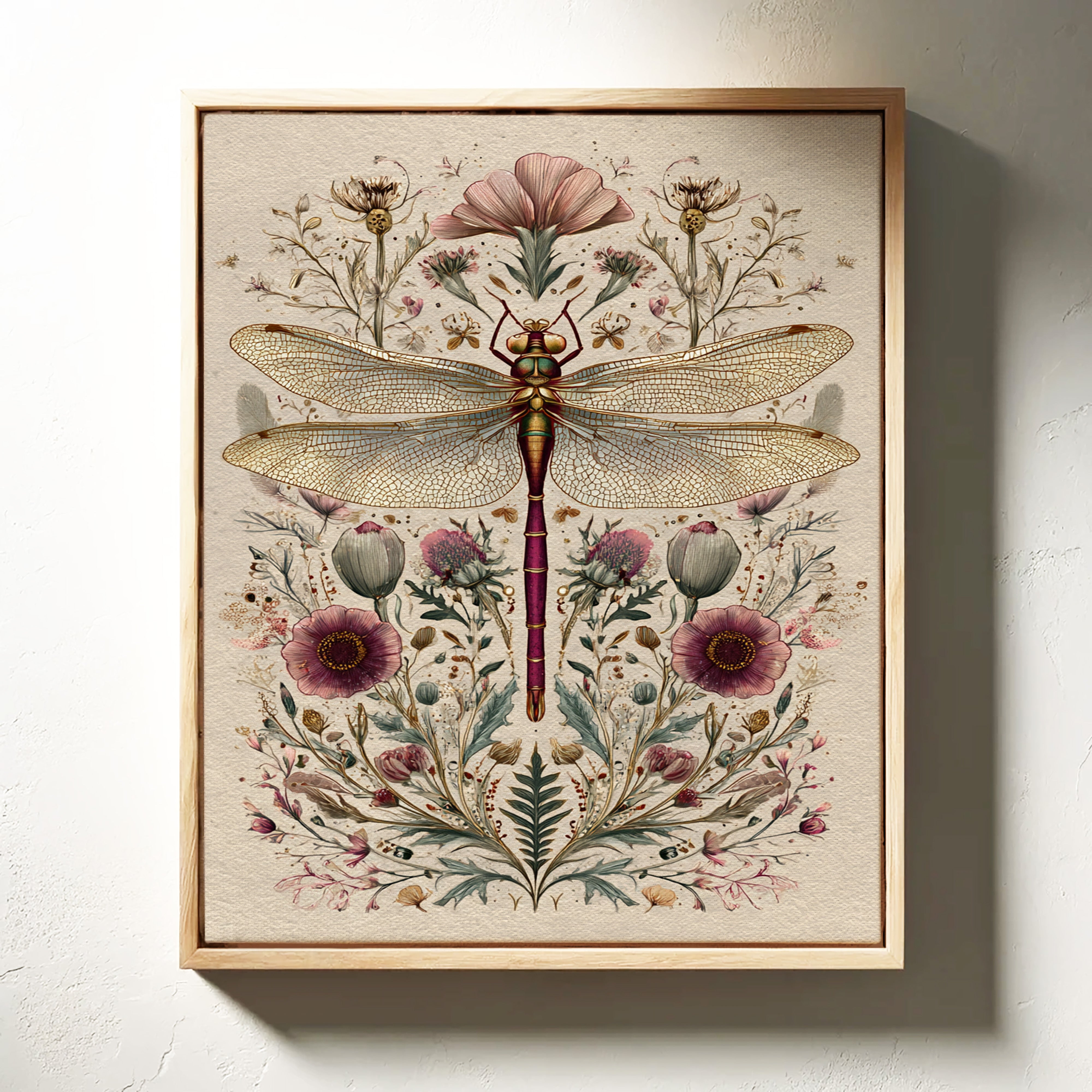 In a garden where colors intertwine, a dragonfly perches gracefully, embodying the delicate balance of life. This piece captures the essence of the artisanal style, melding nature's beauty with intricate details. The dragonfly, adorned with shimmering wings, emerges from a tapestry of blossoms and foliage, inviting viewers into a world of wonder. Ideal for a serene reading nook or a vibrant kitchen space, this artwork breathes life into any corner.
