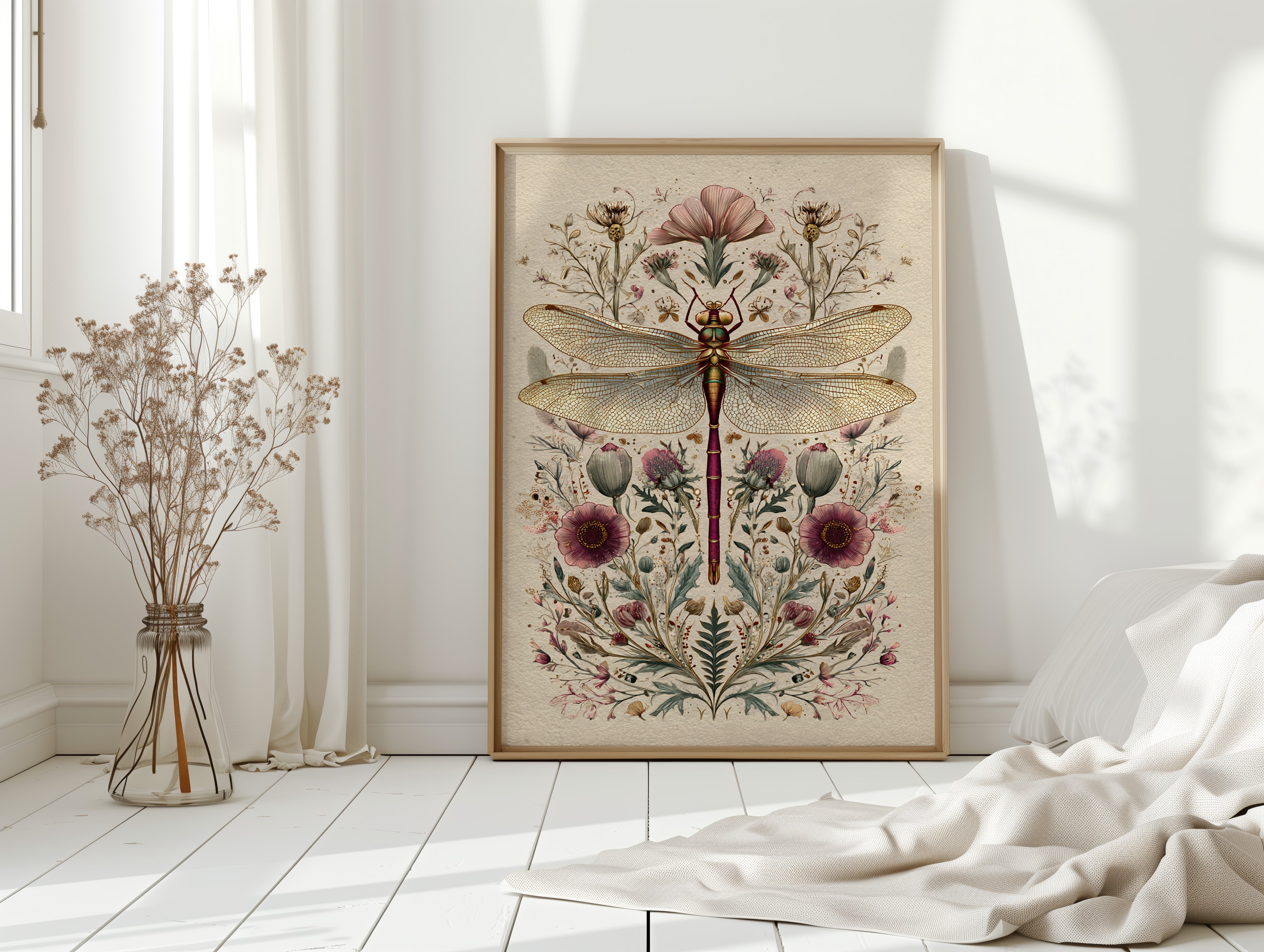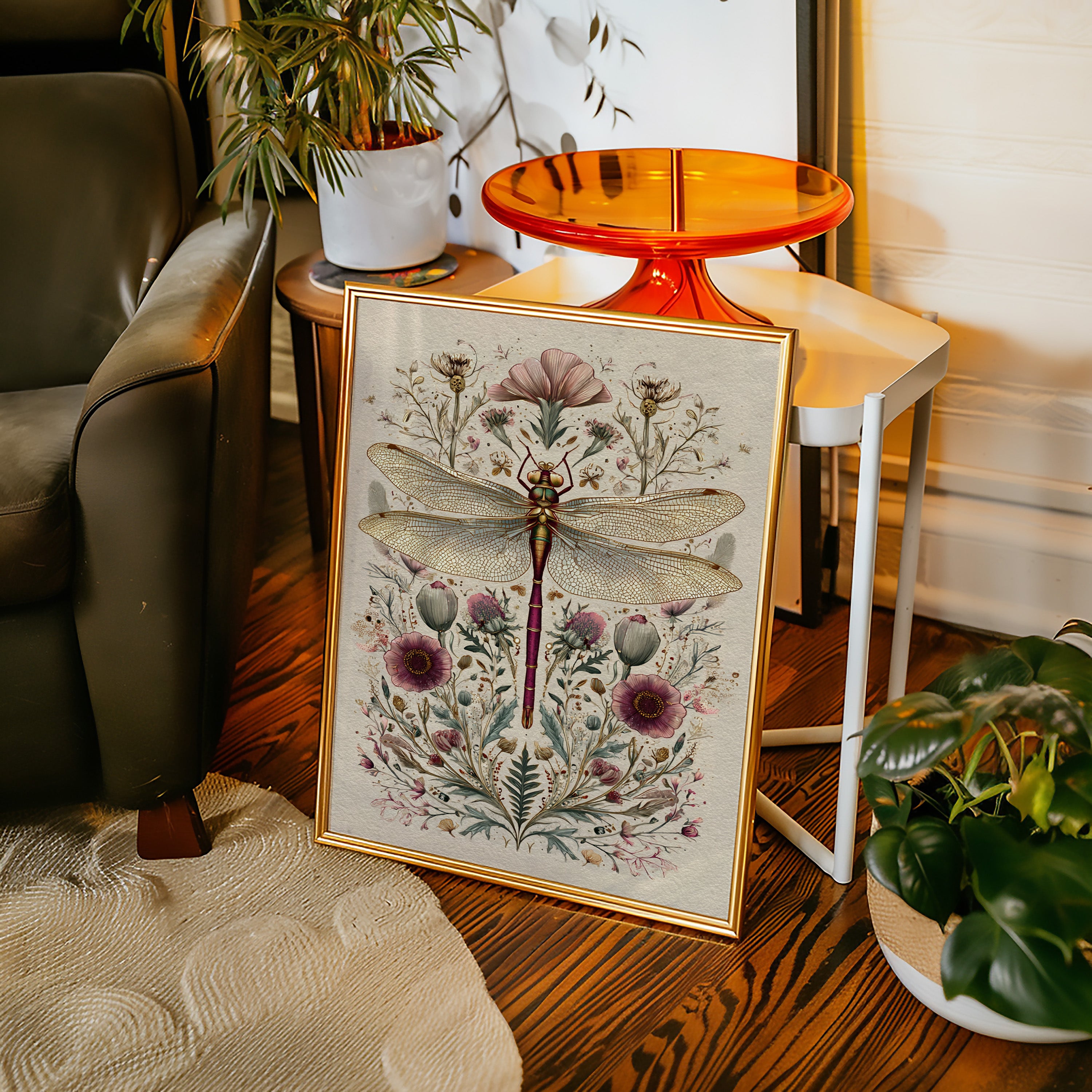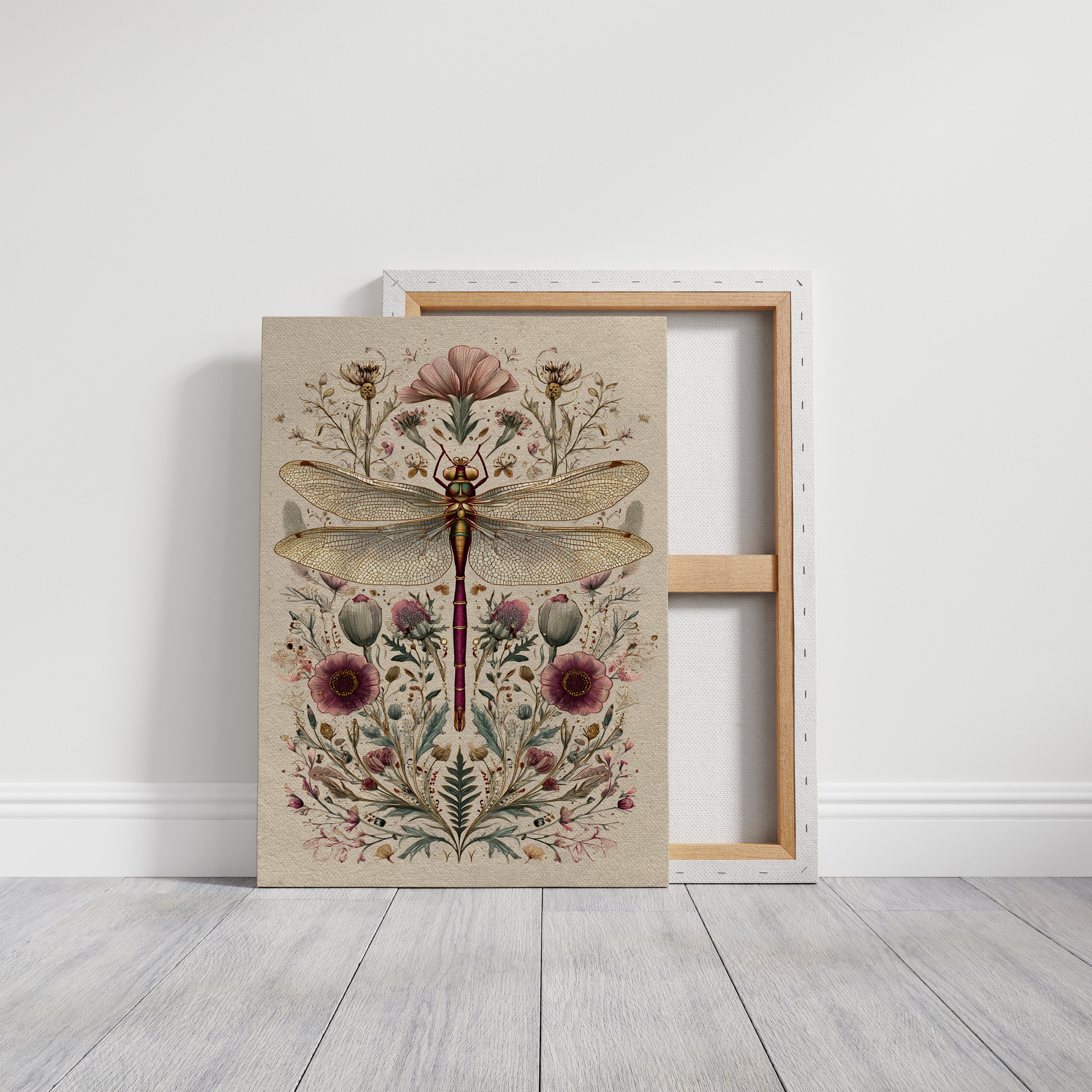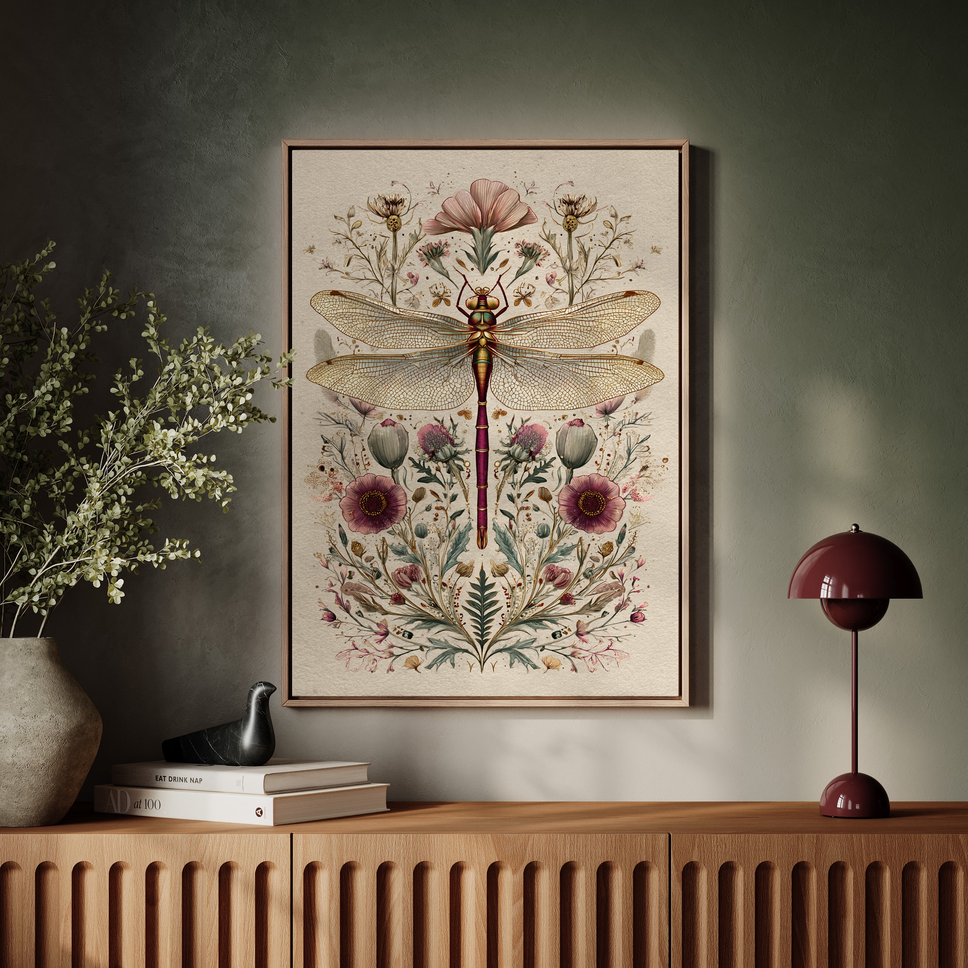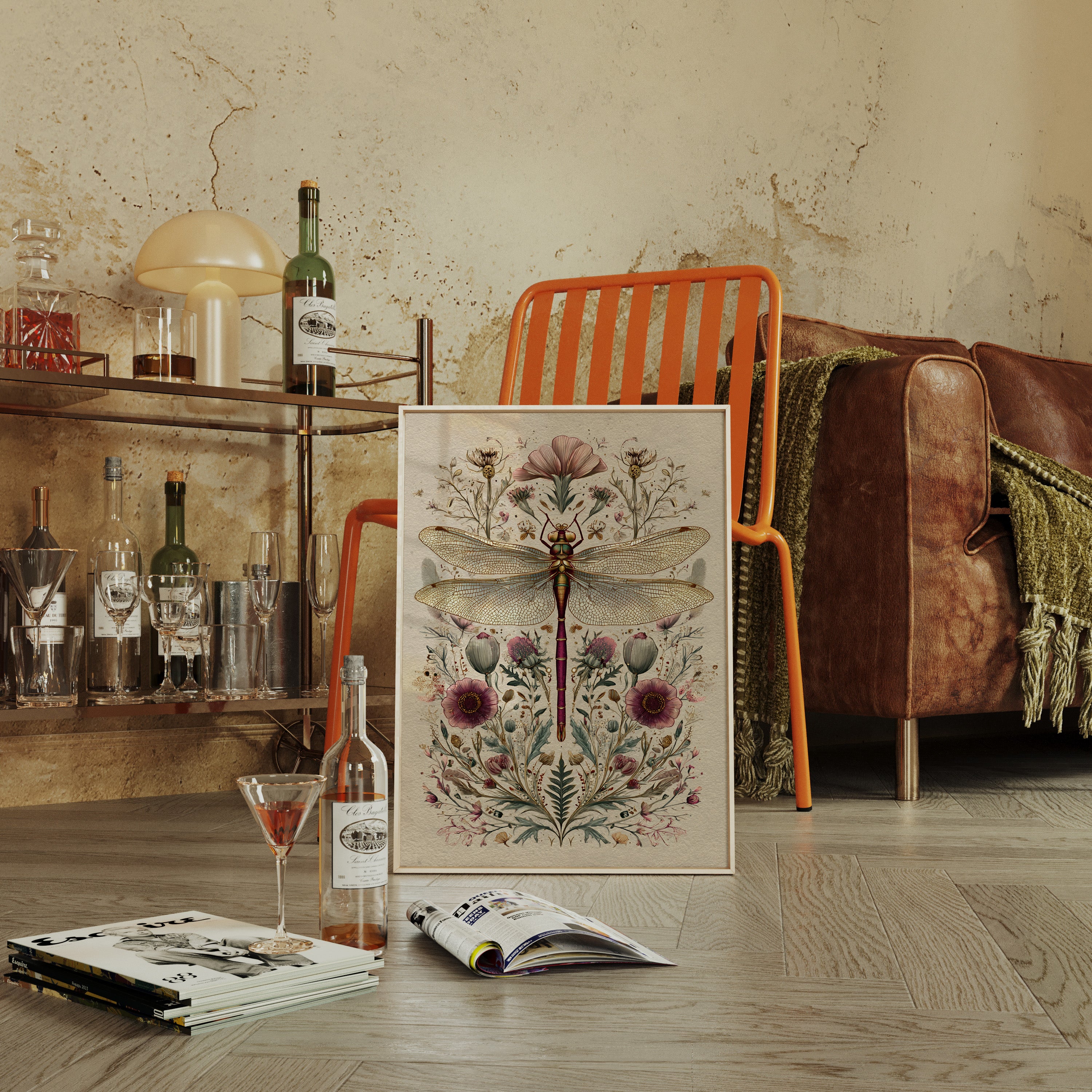 In a garden where colors intertwine, a dragonfly perches gracefully, embodying the delicate balance of life. This piece captures the essence of the artisanal style, melding nature's beauty with intricate details. The dragonfly, adorned with shimmering wings, emerges from a tapestry of blossoms and foliage, inviting viewers into a world of wonder. Ideal for a serene reading nook or a vibrant kitchen space, this artwork breathes life into any corner.