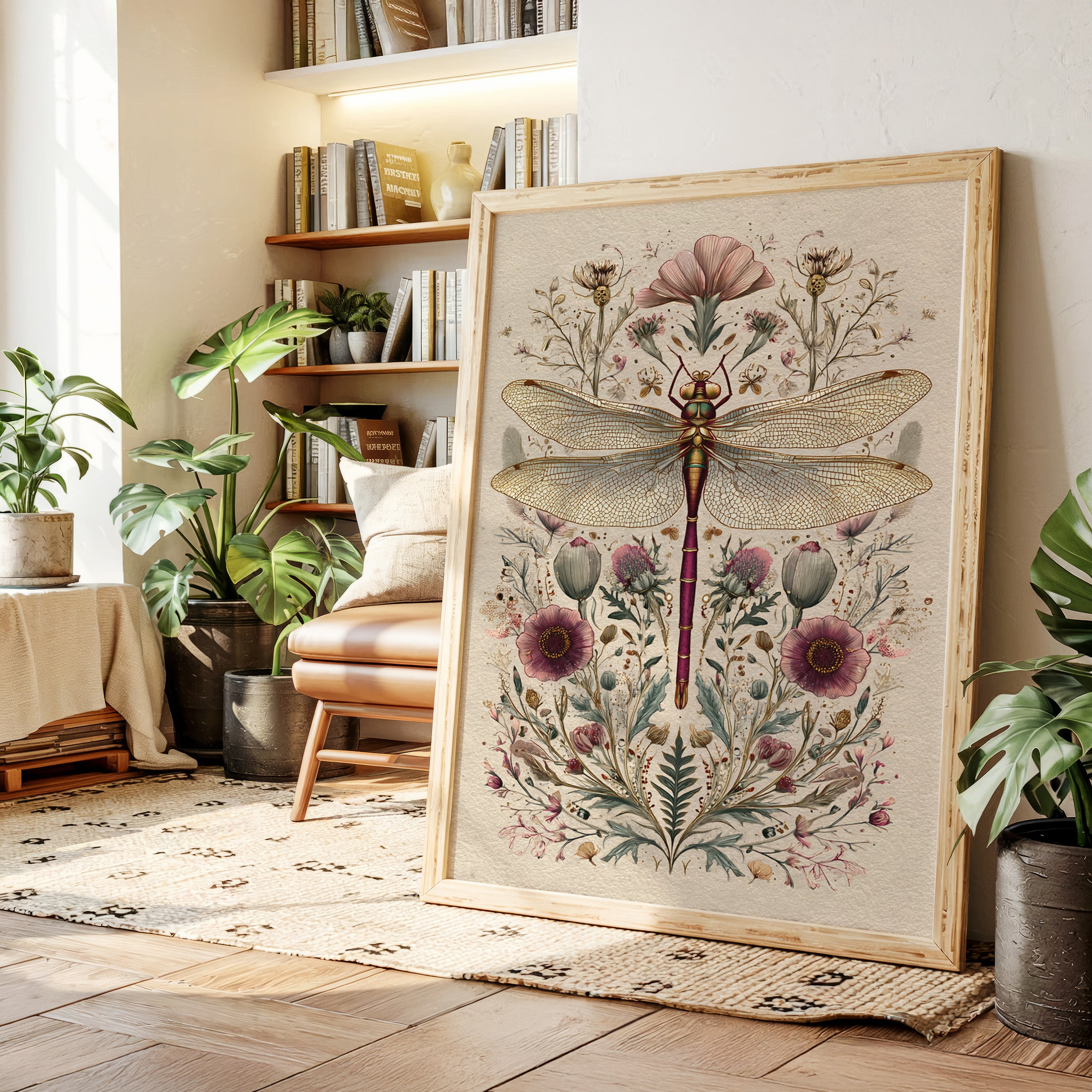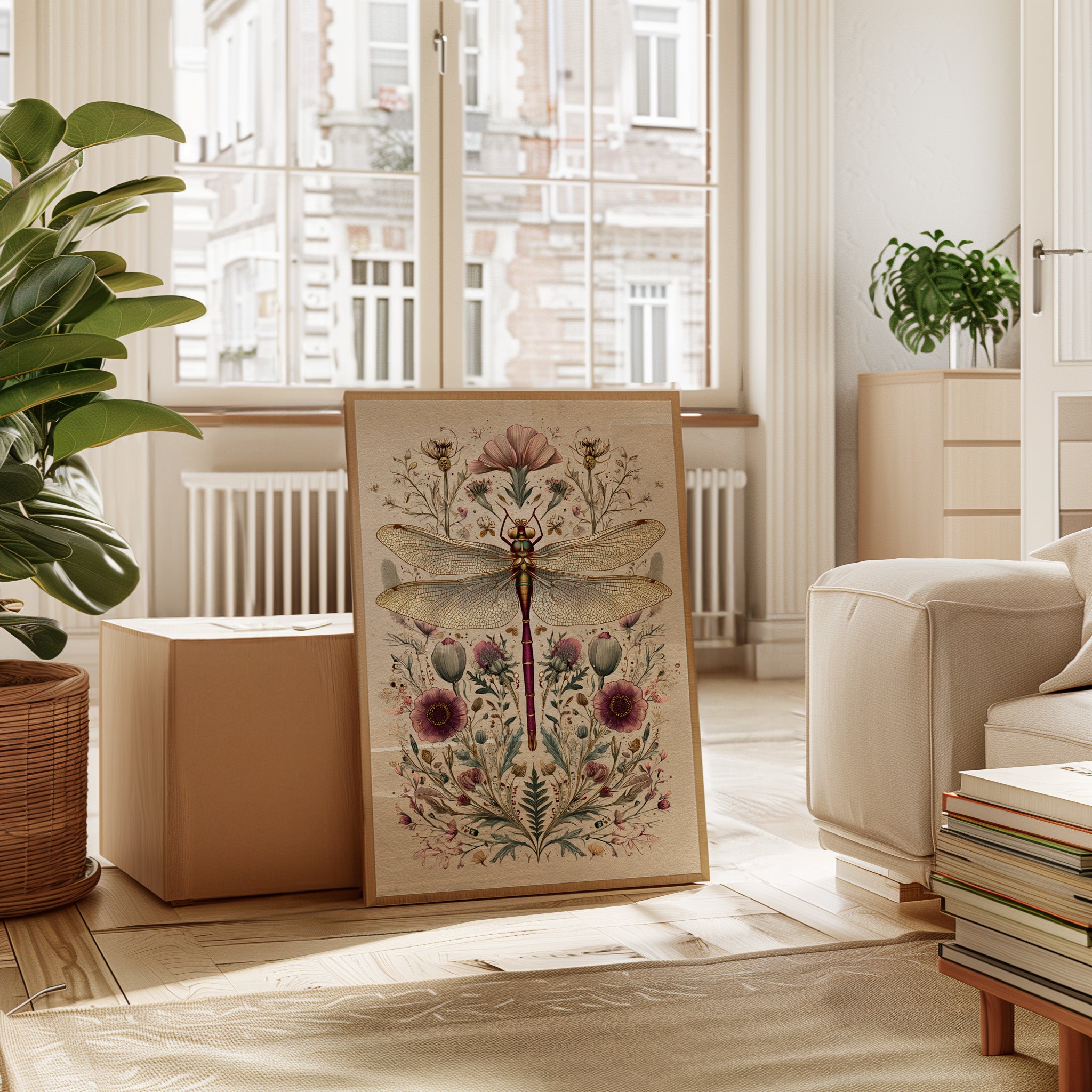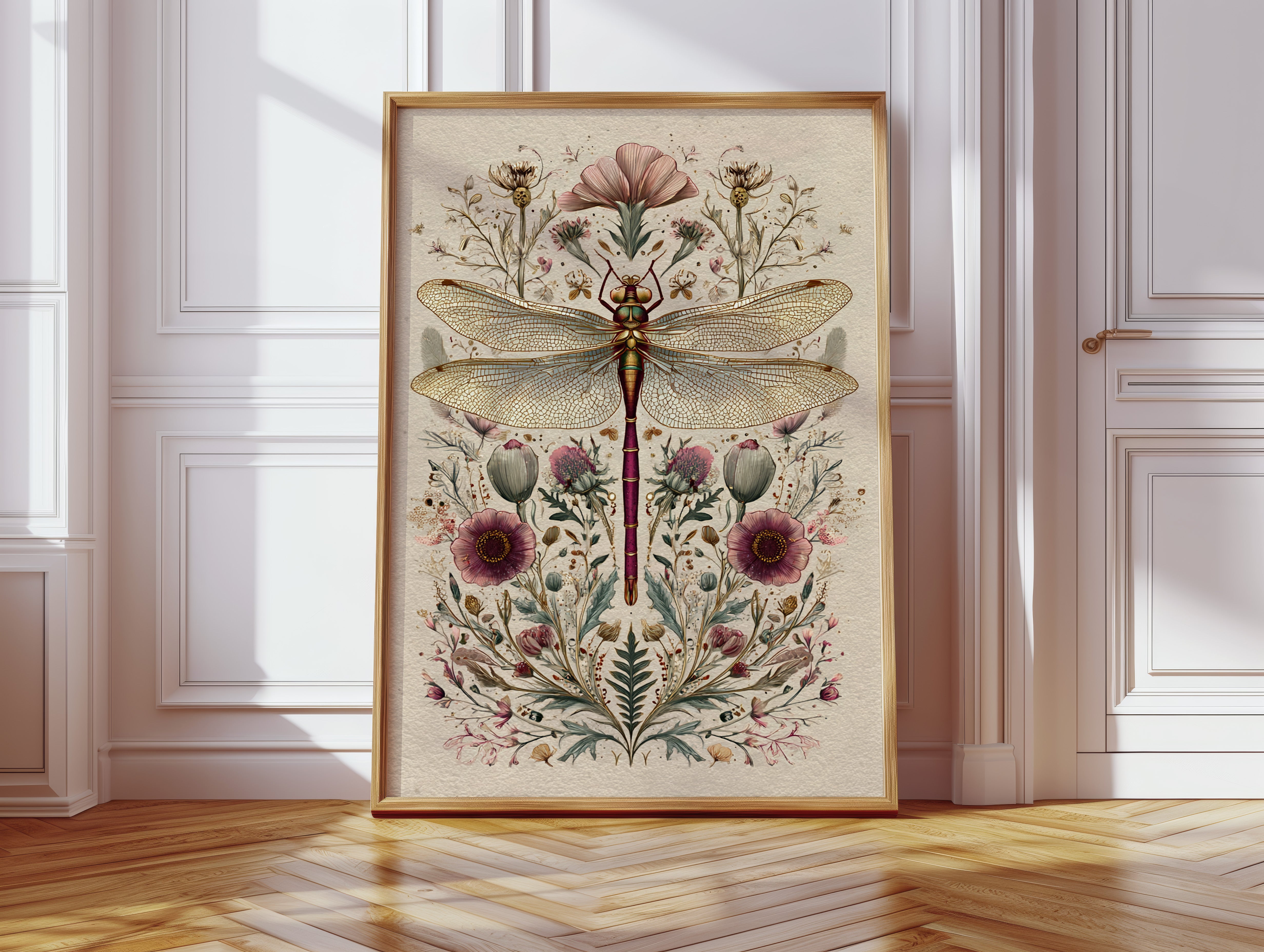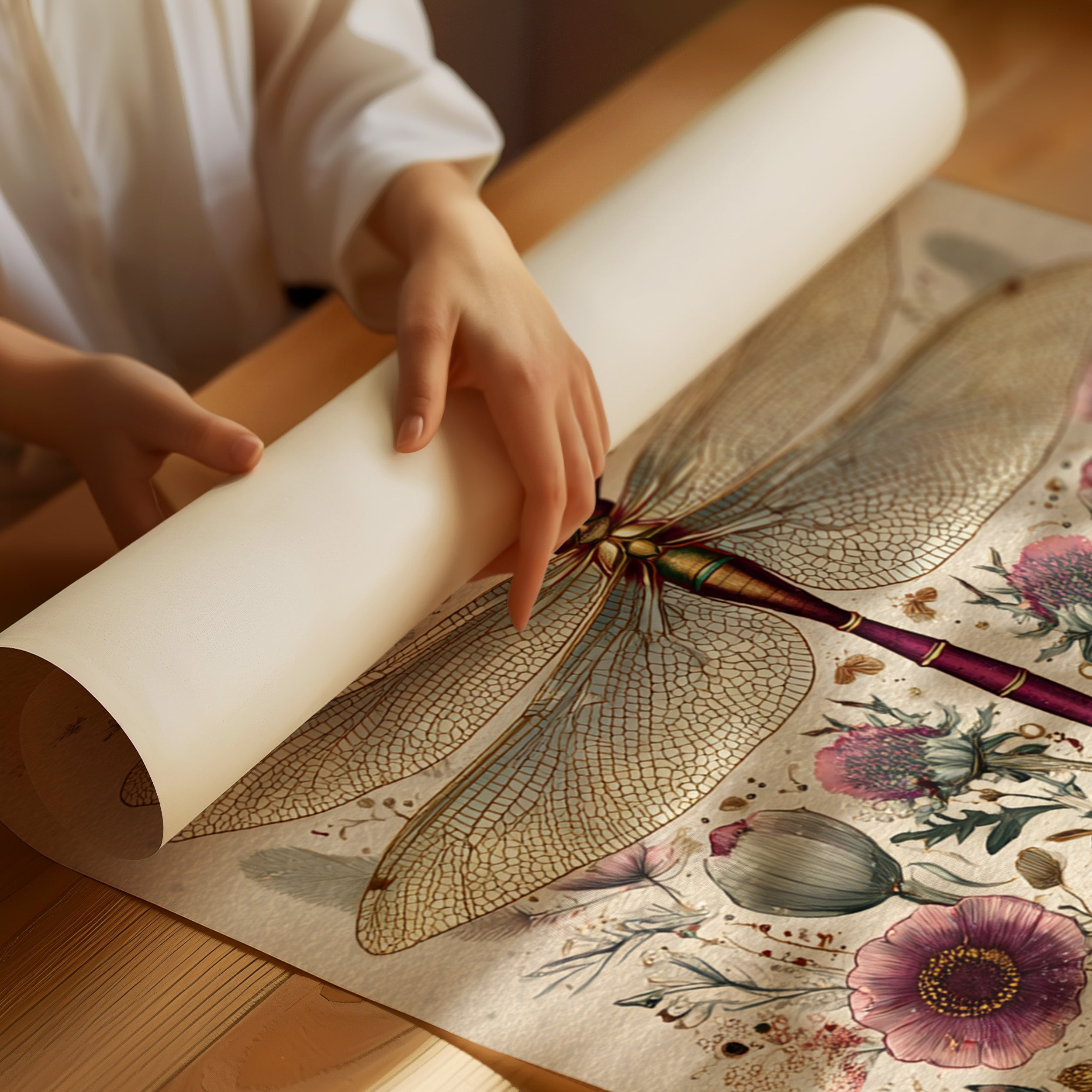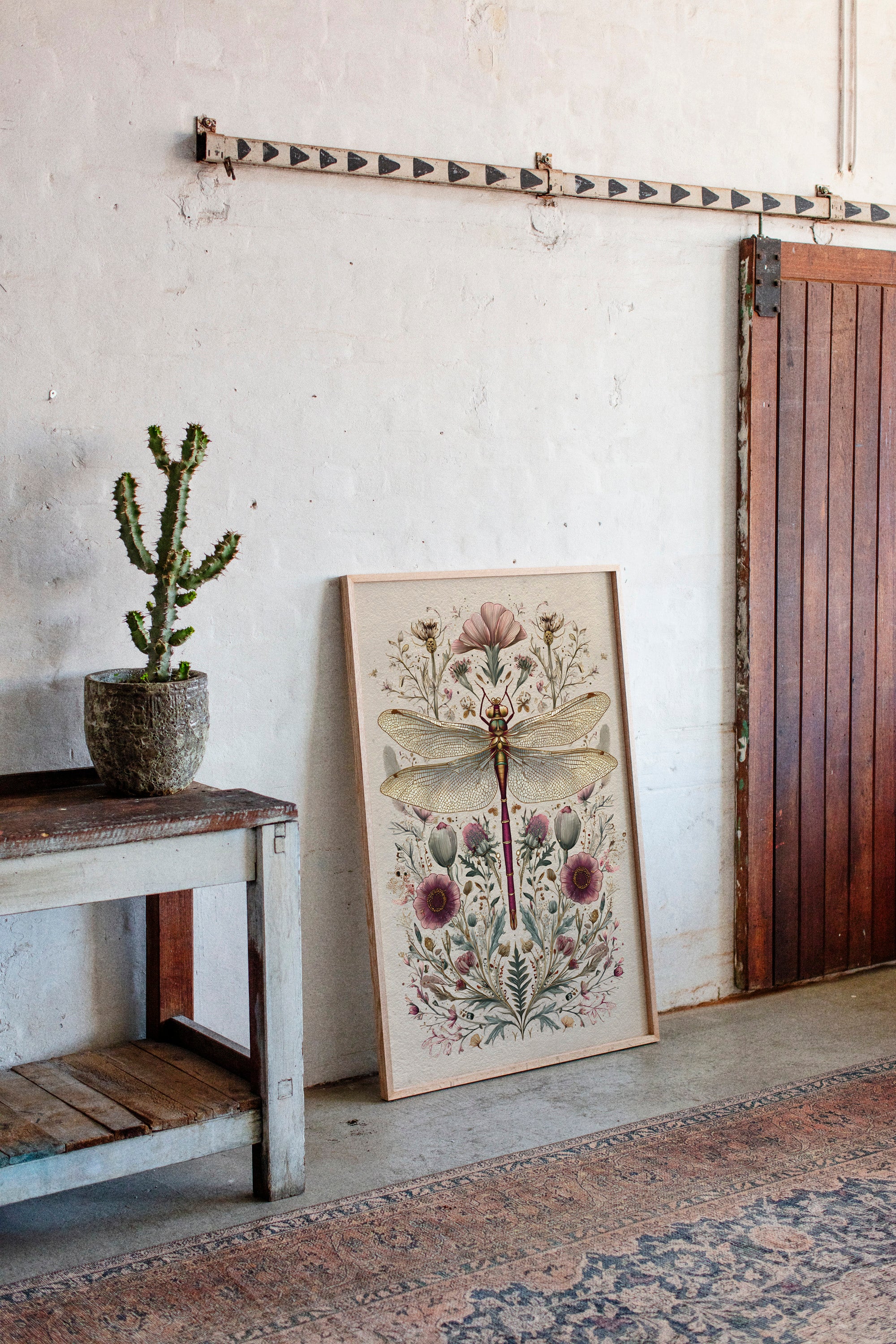 In a garden where colors intertwine, a dragonfly perches gracefully, embodying the delicate balance of life. This piece captures the essence of the artisanal style, melding nature's beauty with intricate details. The dragonfly, adorned with shimmering wings, emerges from a tapestry of blossoms and foliage, inviting viewers into a world of wonder. Ideal for a serene reading nook or a vibrant kitchen space, this artwork breathes life into any corner.