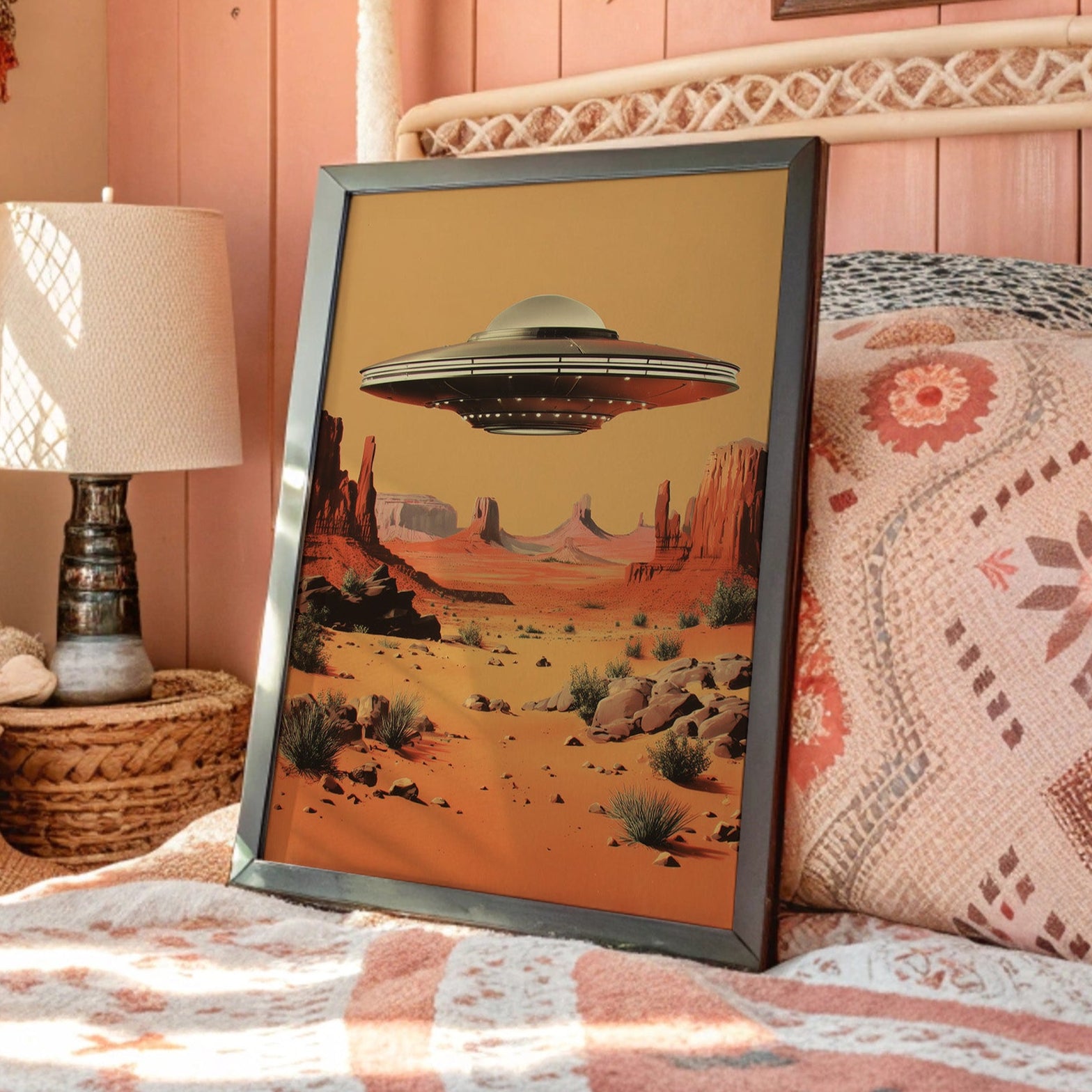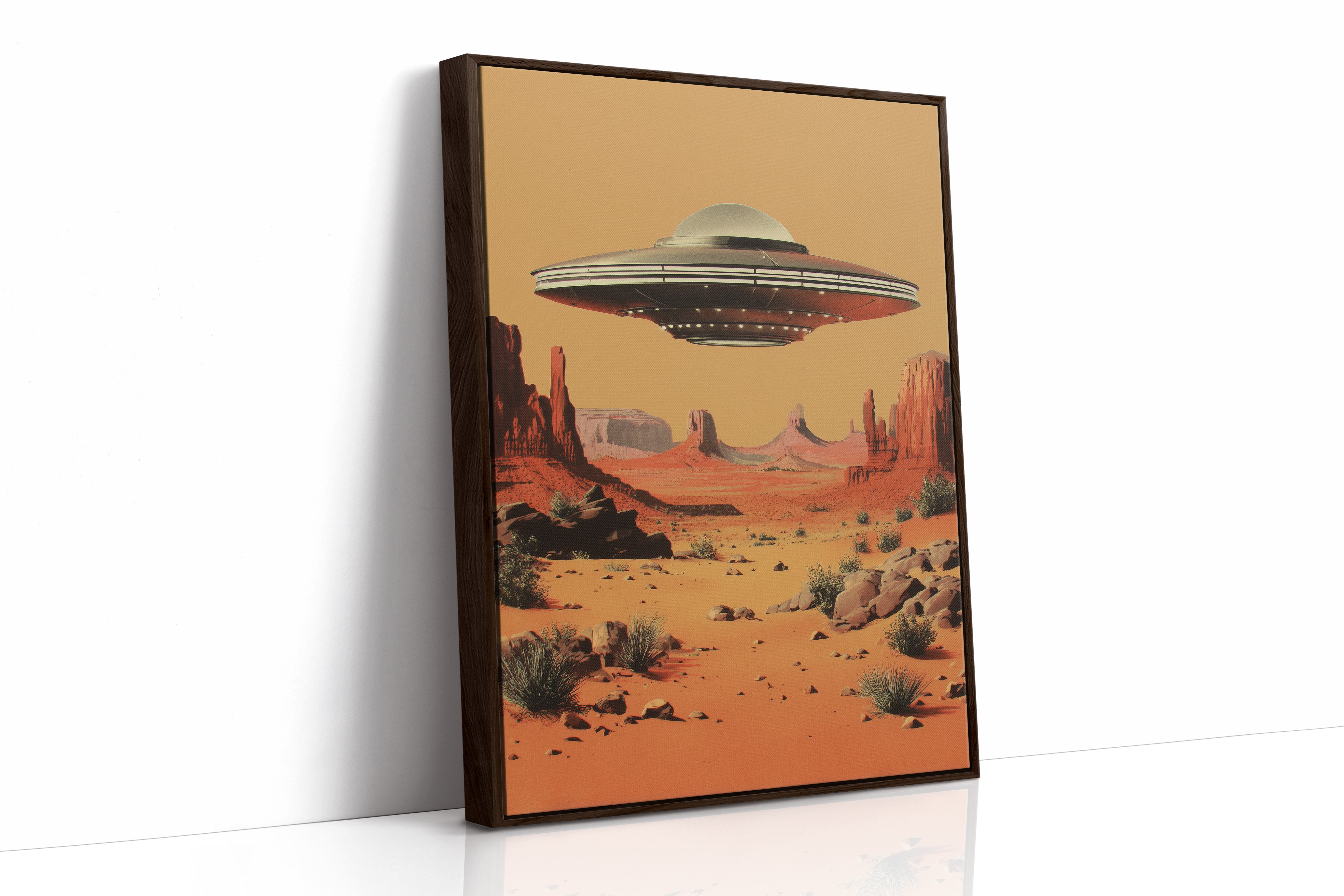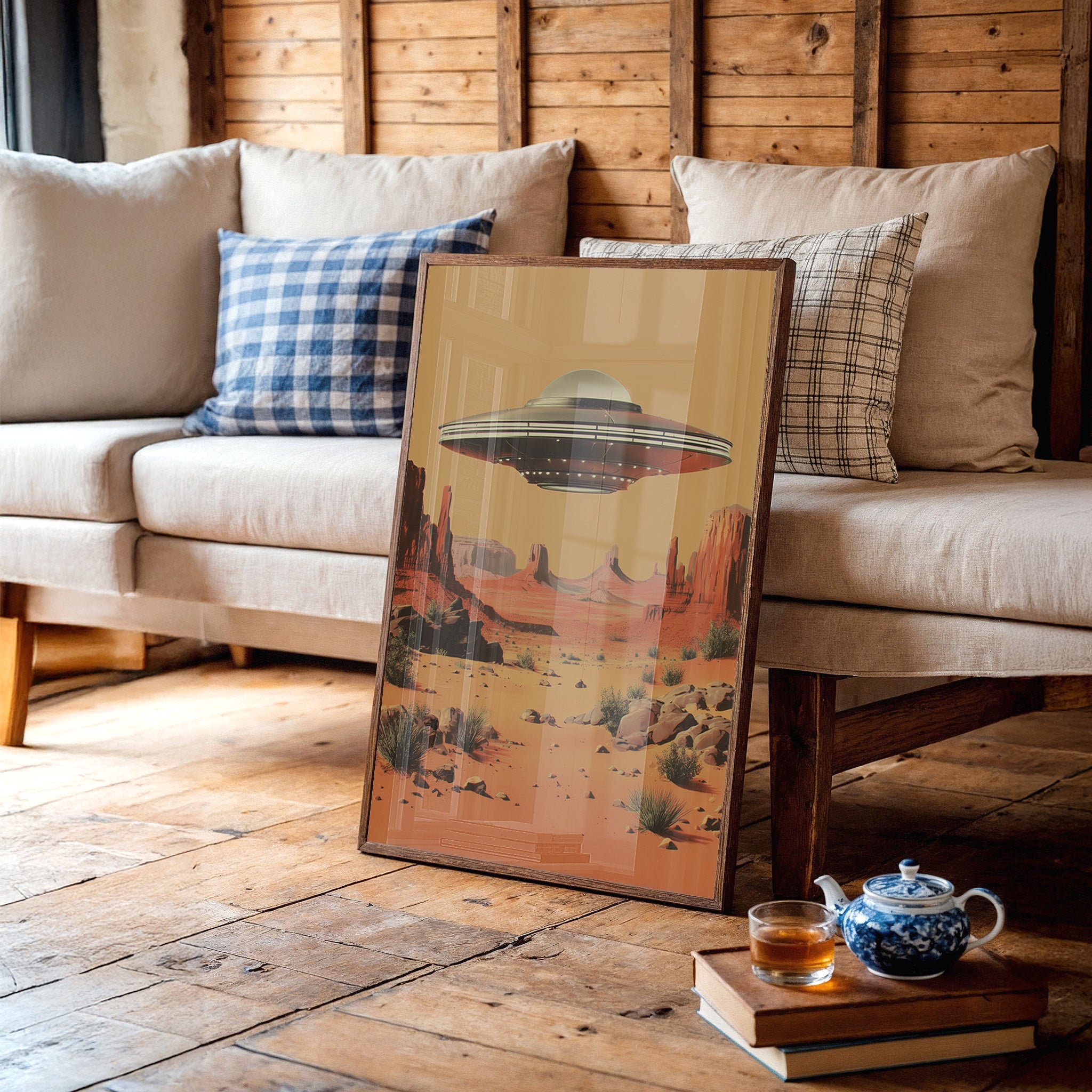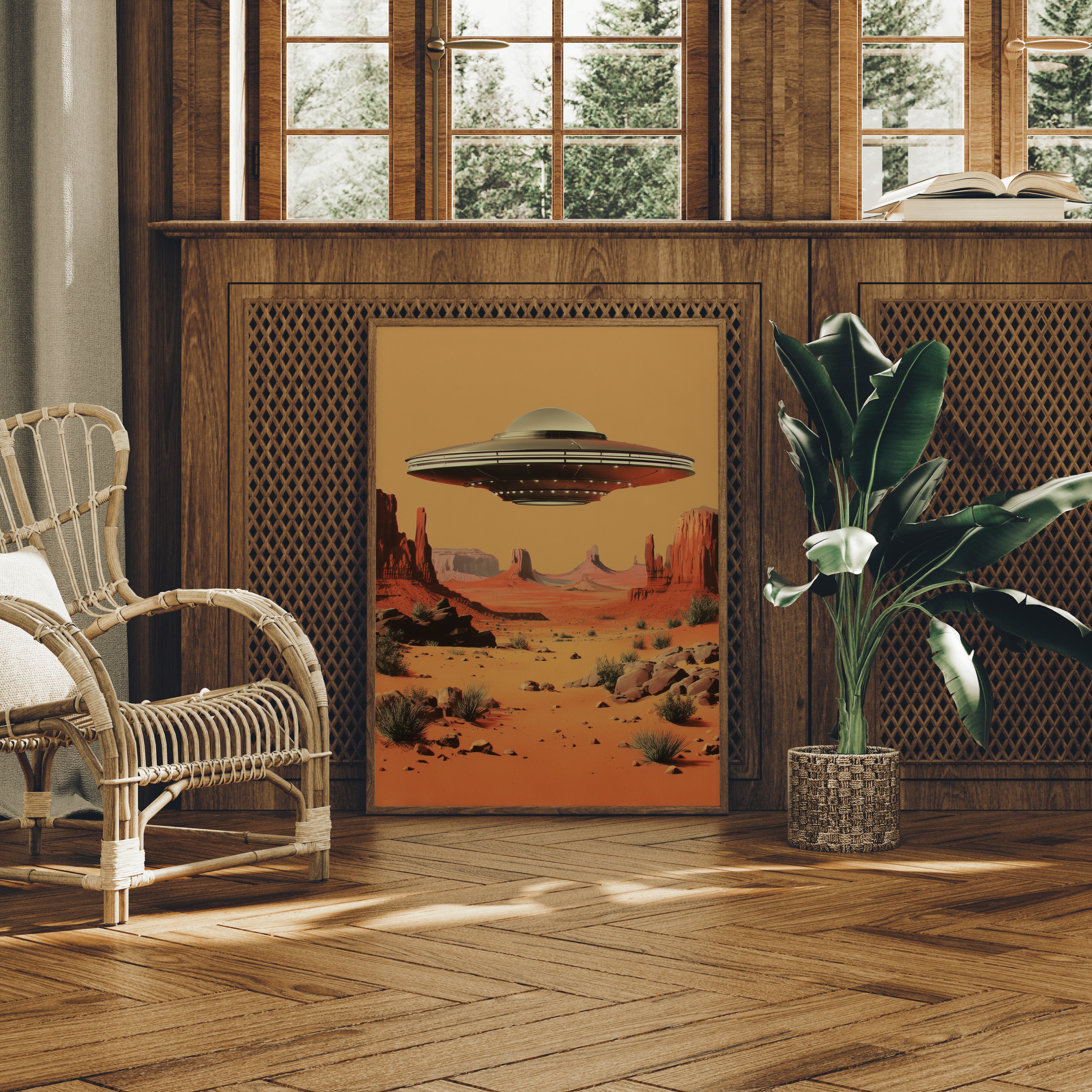 A retro-futuristic scene unfolds as a metallic UFO hovers mysteriously over the iconic red rocks of Monument Valley. The warm ochre sky bathes ancient mesas in golden light, while desert scrub and scattered stones dot the rusty landscape below. This playful blend of sci-fi and southwestern imagery creates an unexpected narrative in the timeless desert setting. Perfect for adding a conversation-starting focal point to a modern rustic den, home office, or any space celebrating the spirit of adventure and imagination.