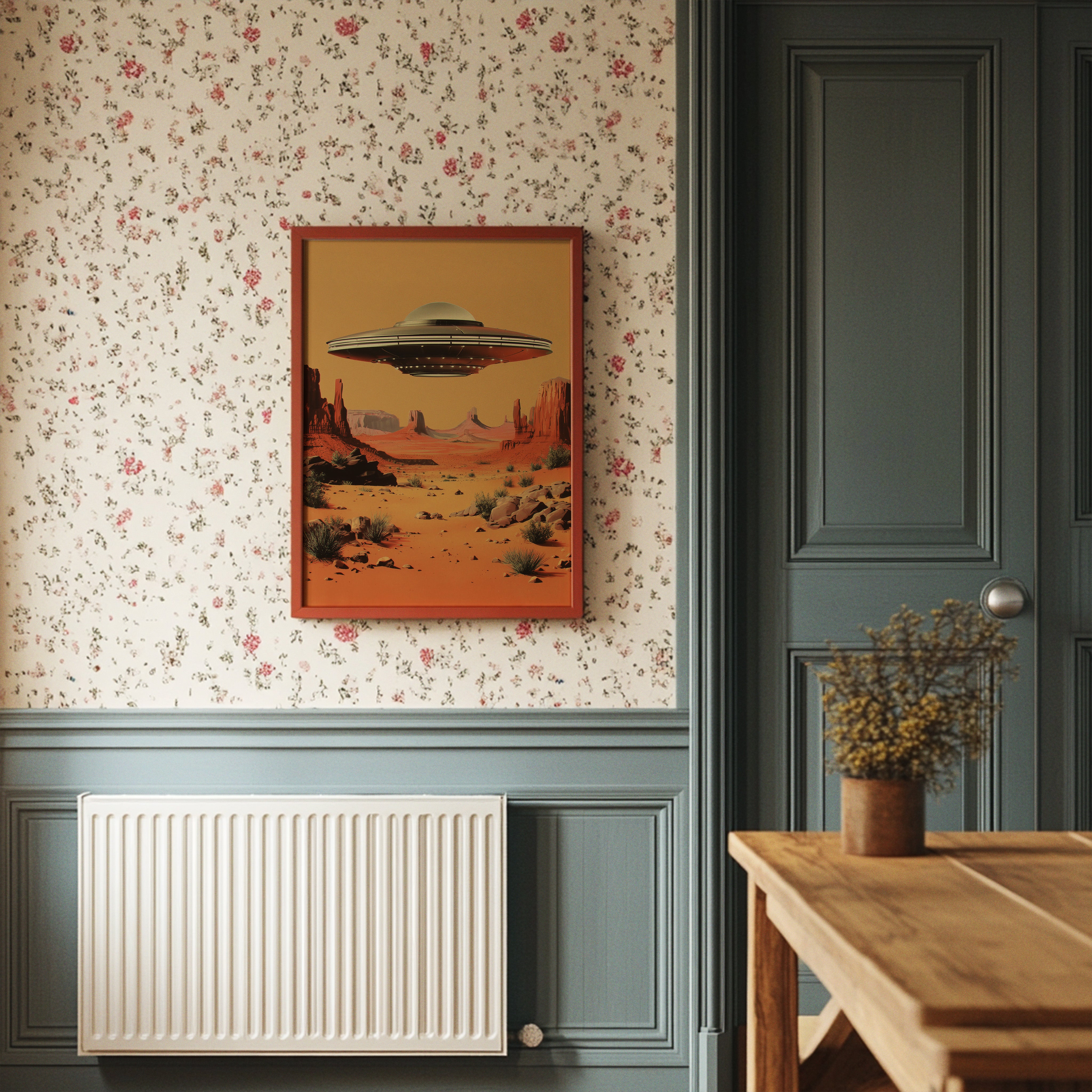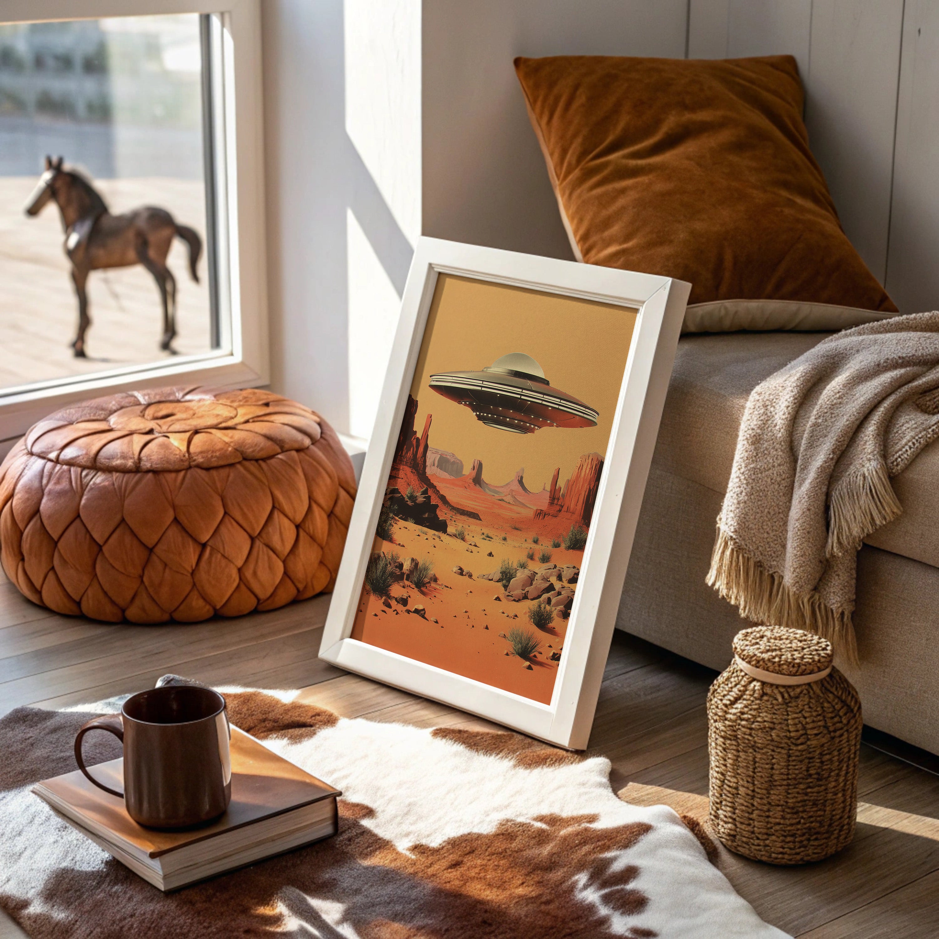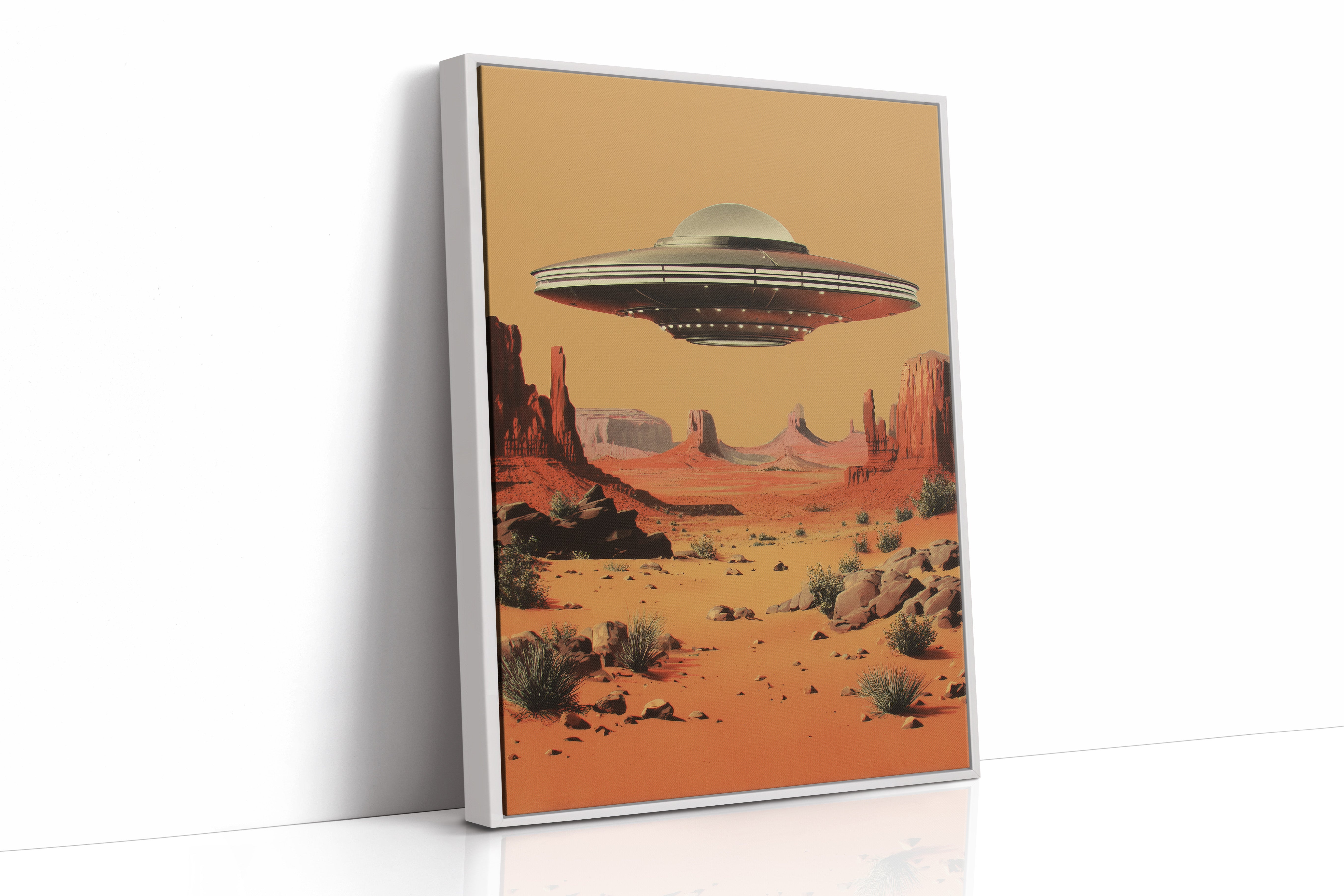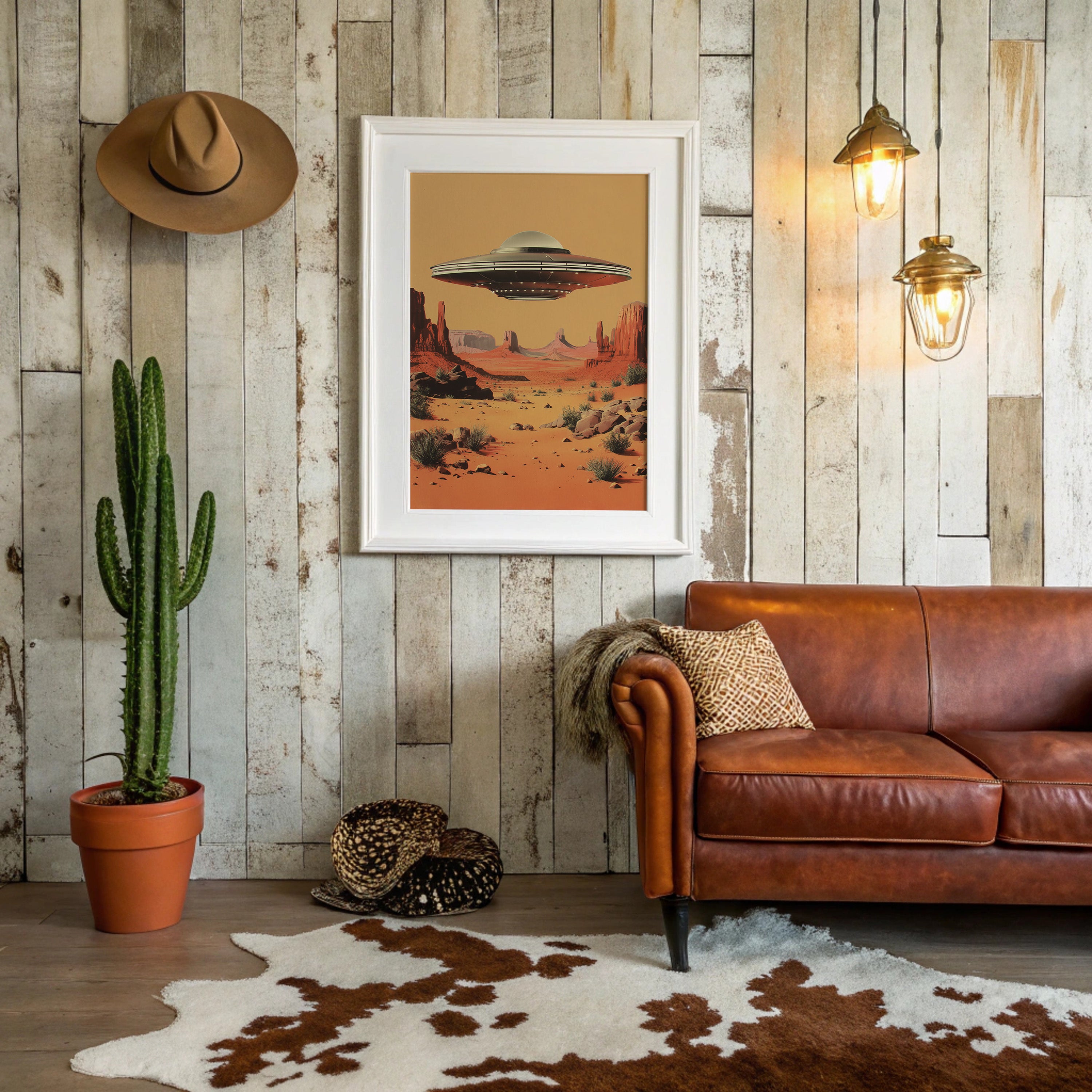 A retro-futuristic scene unfolds as a metallic UFO hovers mysteriously over the iconic red rocks of Monument Valley. The warm ochre sky bathes ancient mesas in golden light, while desert scrub and scattered stones dot the rusty landscape below. This playful blend of sci-fi and southwestern imagery creates an unexpected narrative in the timeless desert setting. Perfect for adding a conversation-starting focal point to a modern rustic den, home office, or any space celebrating the spirit of adventure and imagination.