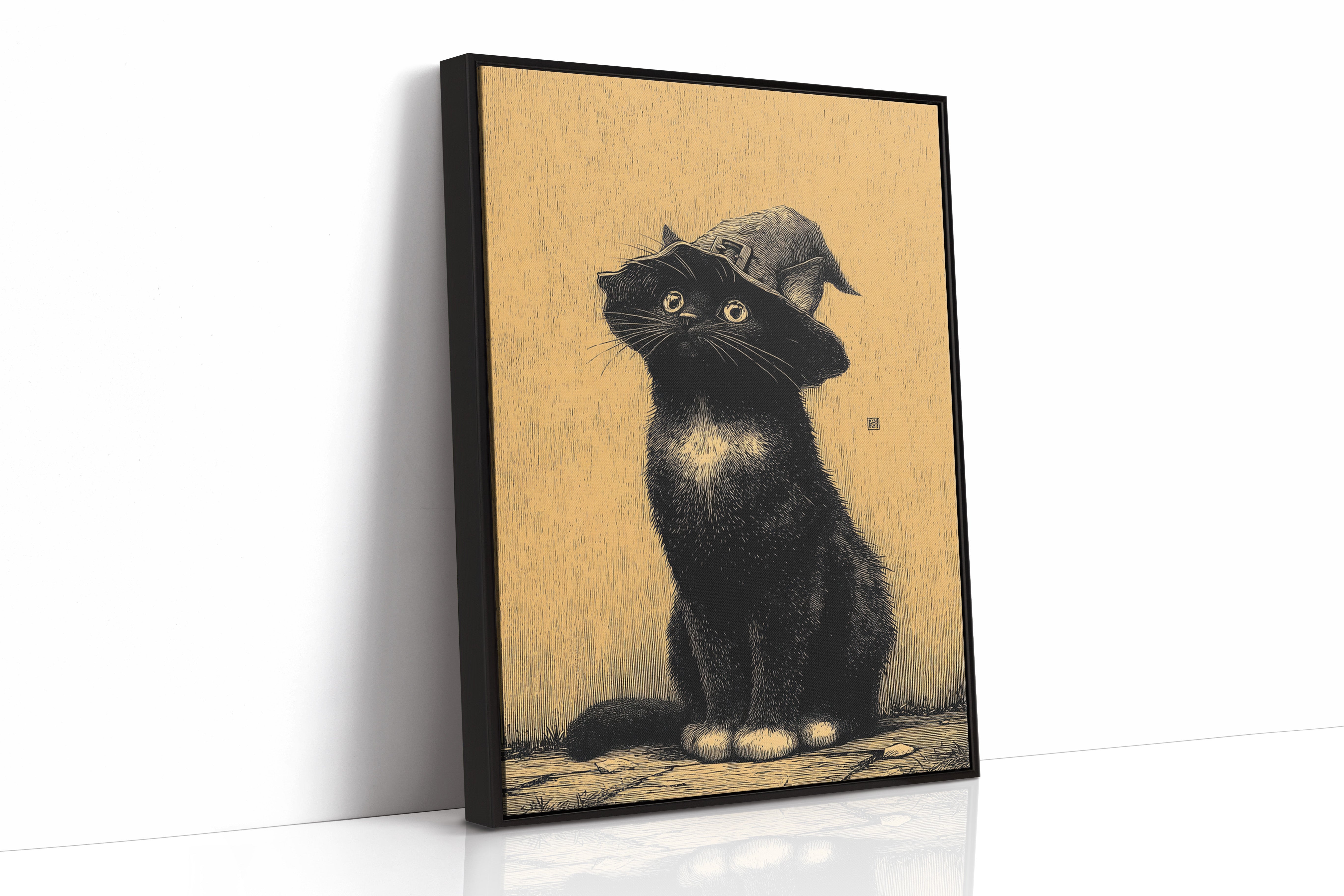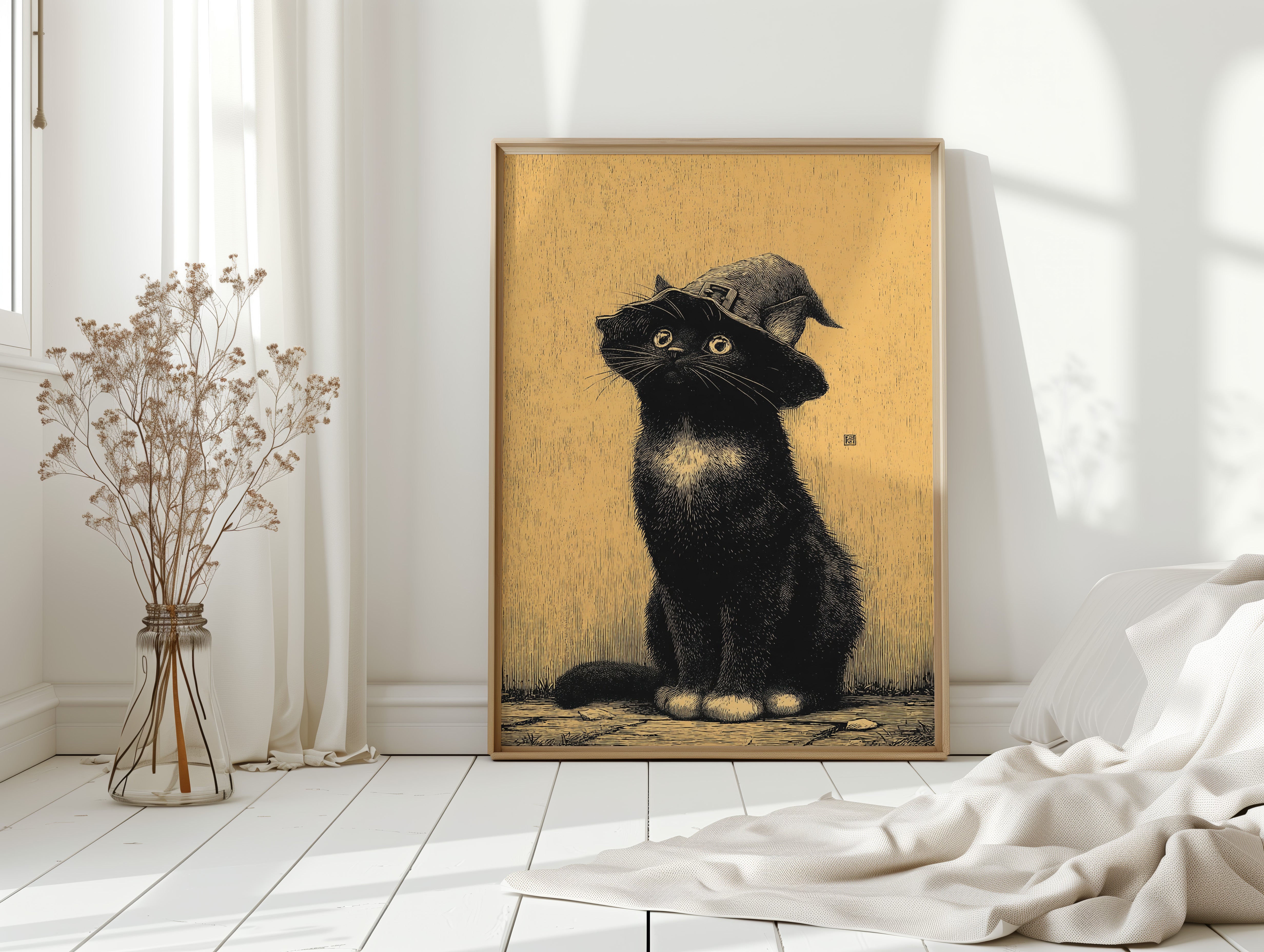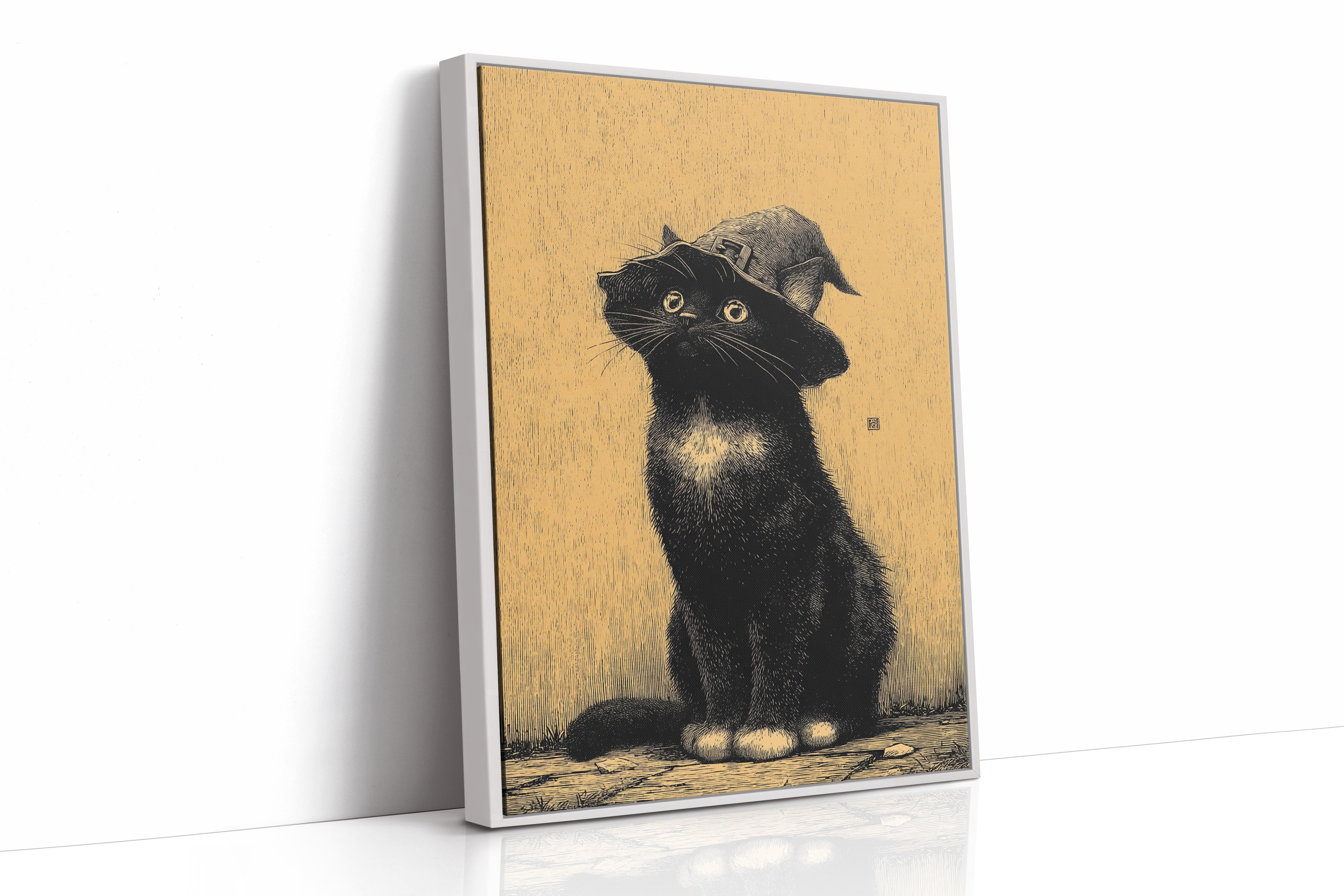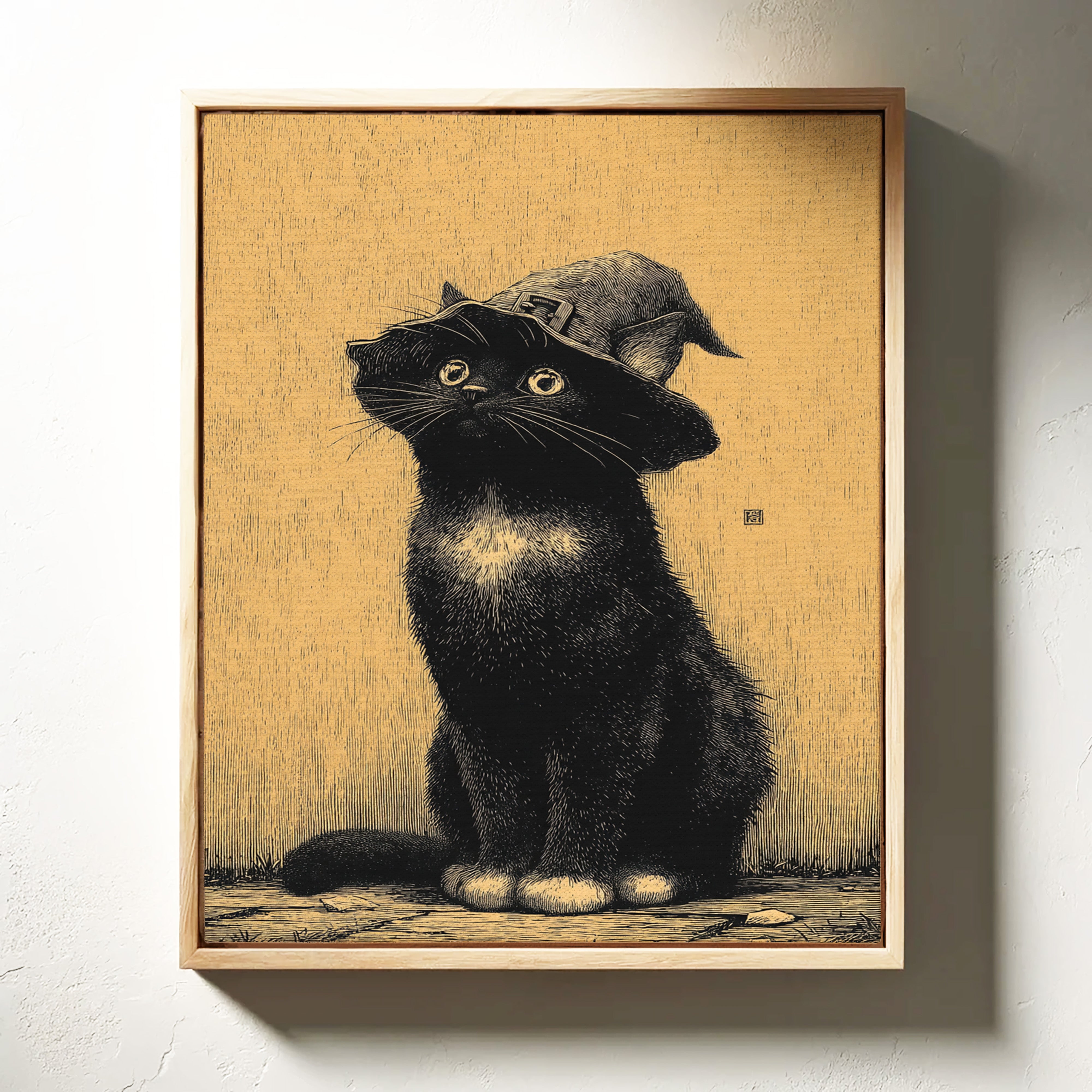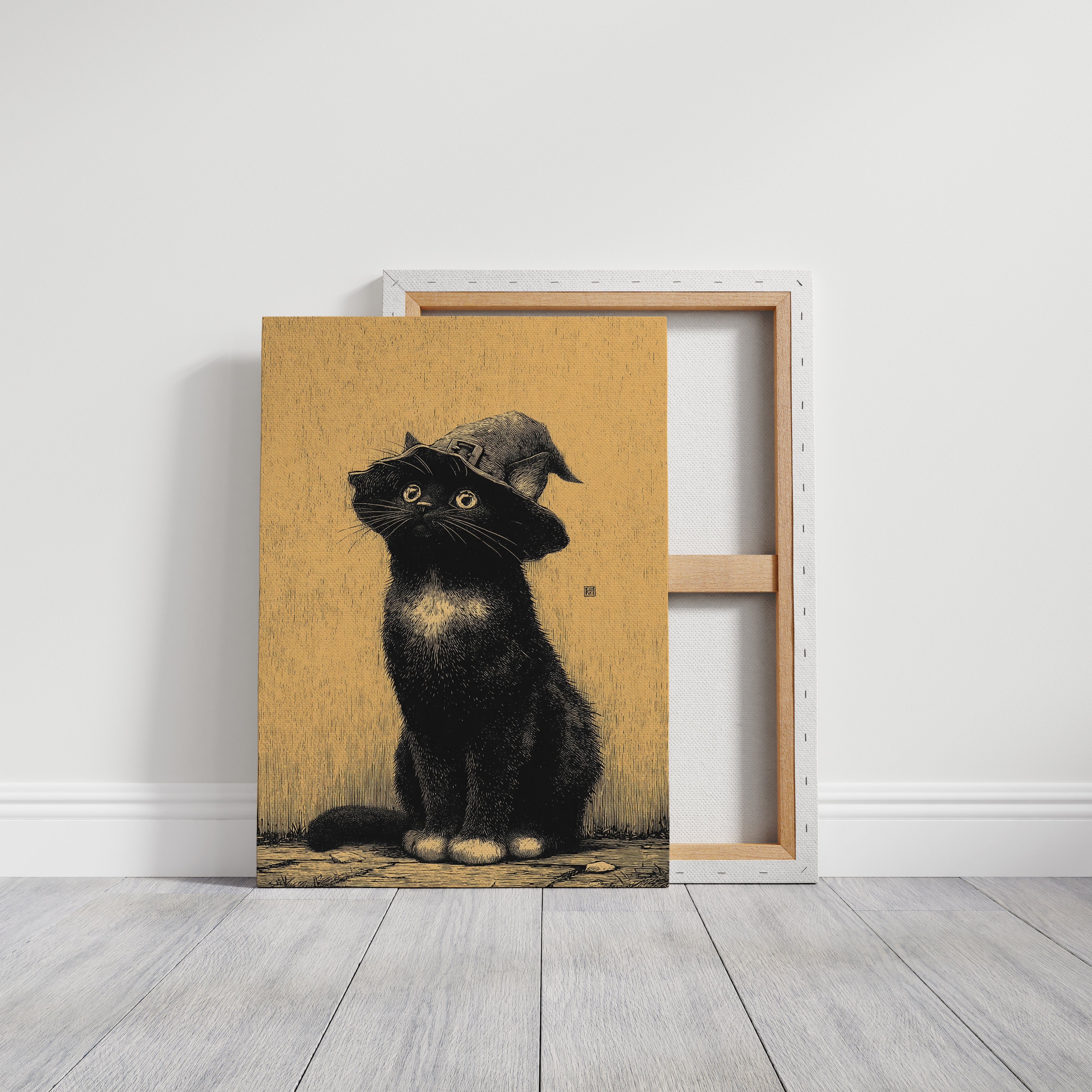 A curious gaze meets the observer, a feline dressed in whimsical attire, poised as if ready to embark on a magical adventure. This piece captures the essence of contemporary storytelling through its playful yet striking imagery. The black cat, adorned with a whimsical hat, stands against a warm golden backdrop, creating a delightful contrast that invites smiles and sparks the imagination. Ideal for a cozy reading nook or a whimsical children's room, this enchanting artwork adds a touch of charm to any space.
