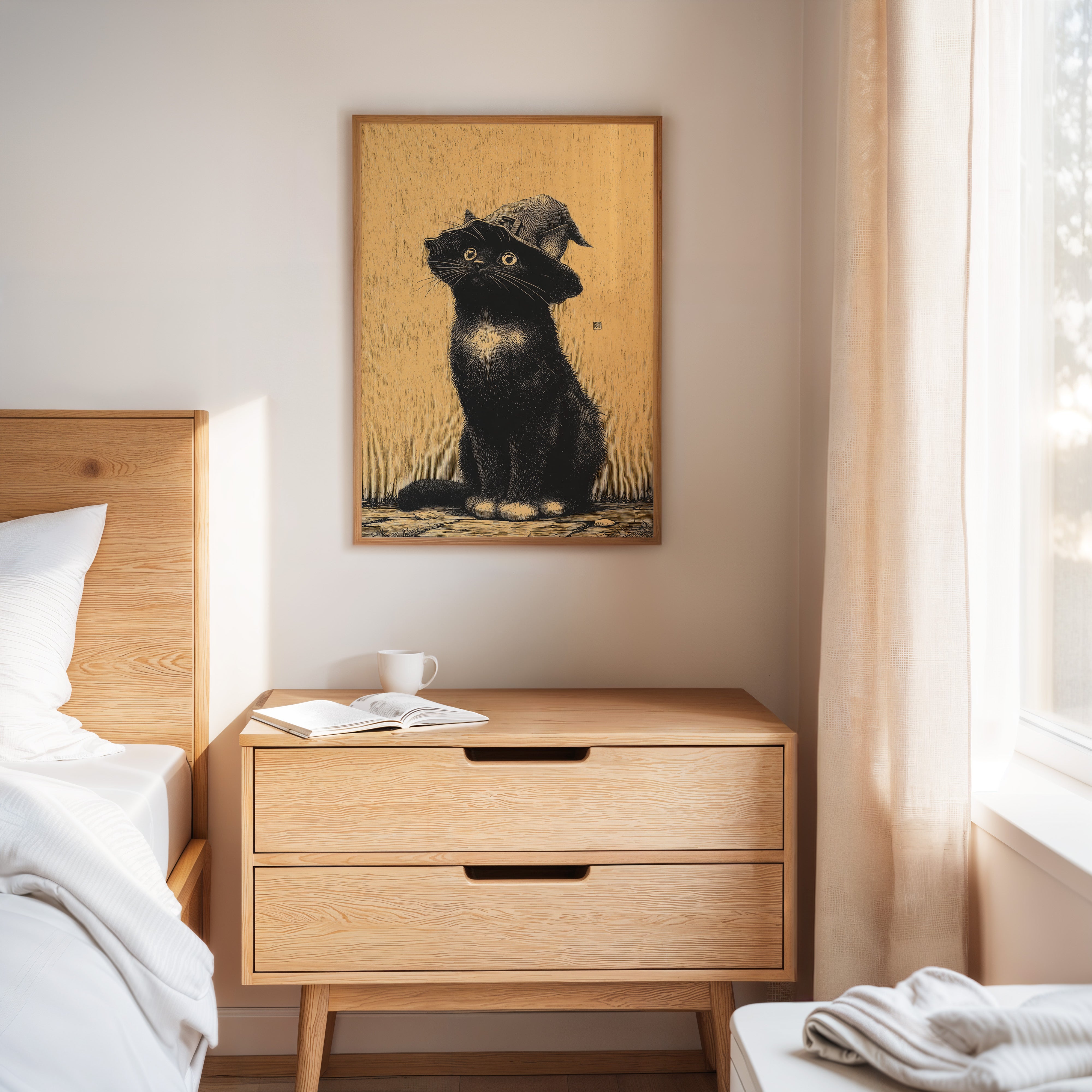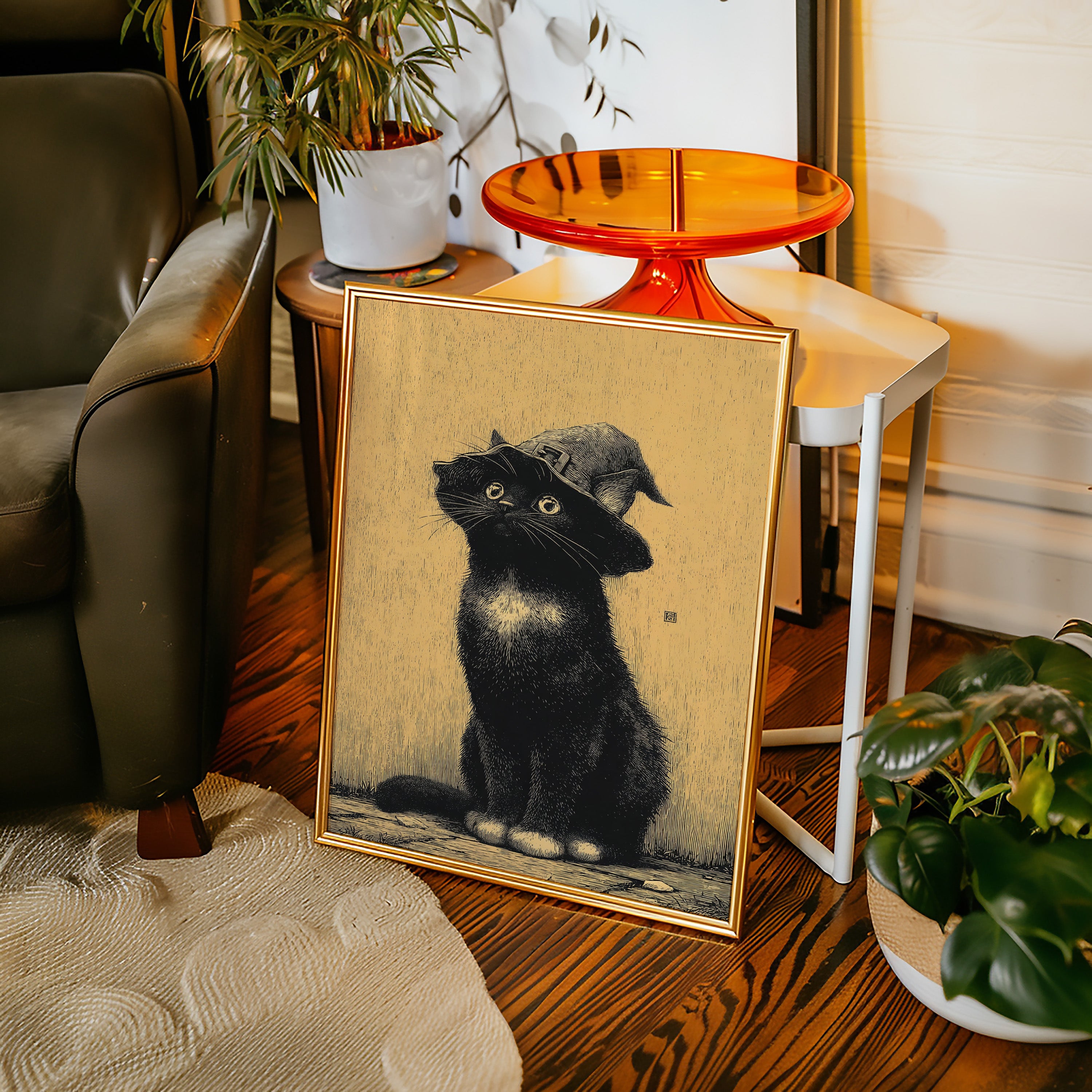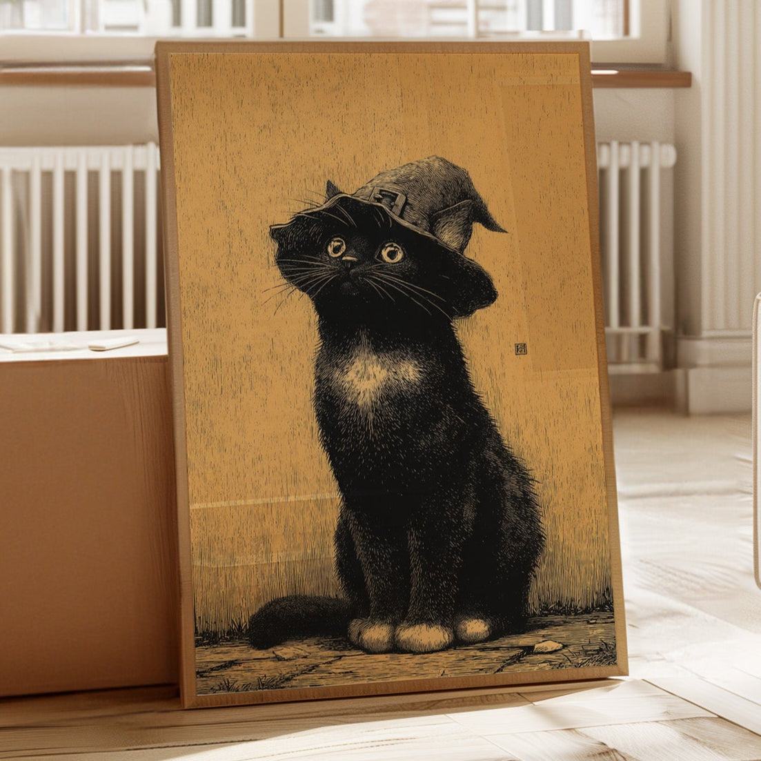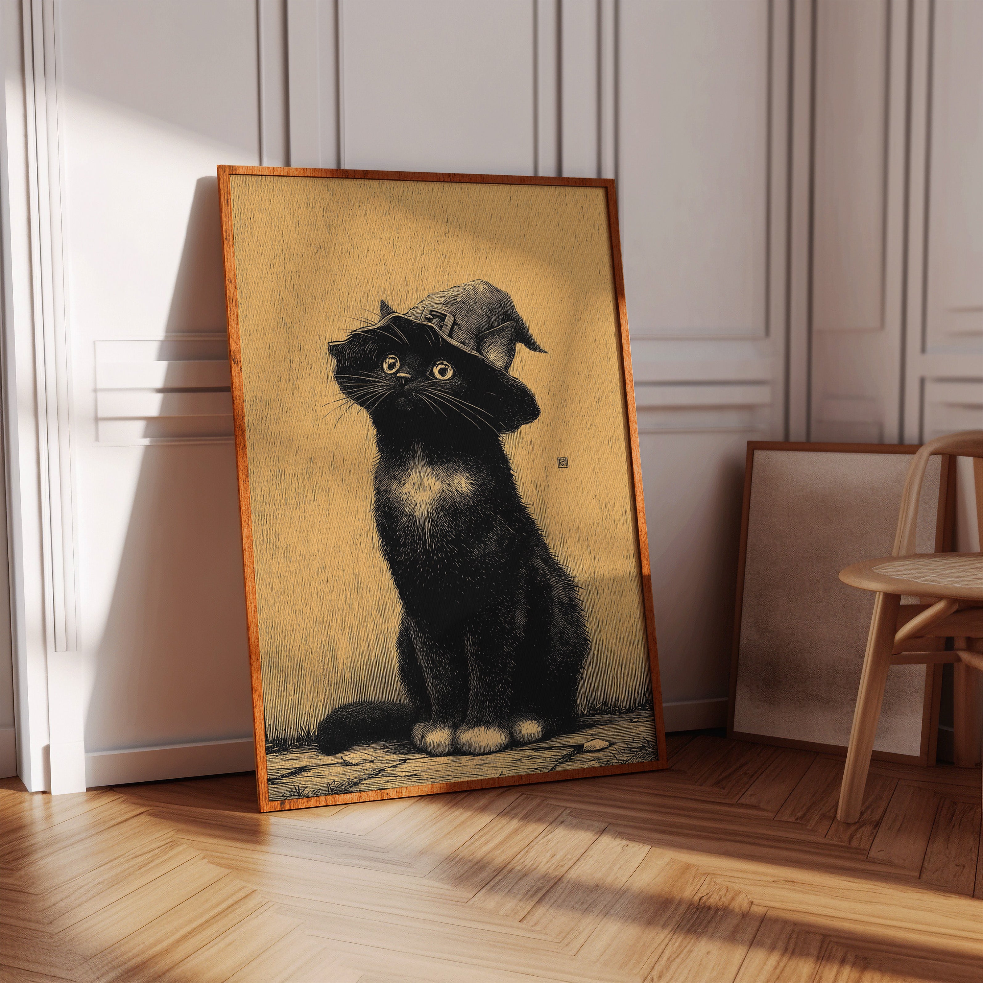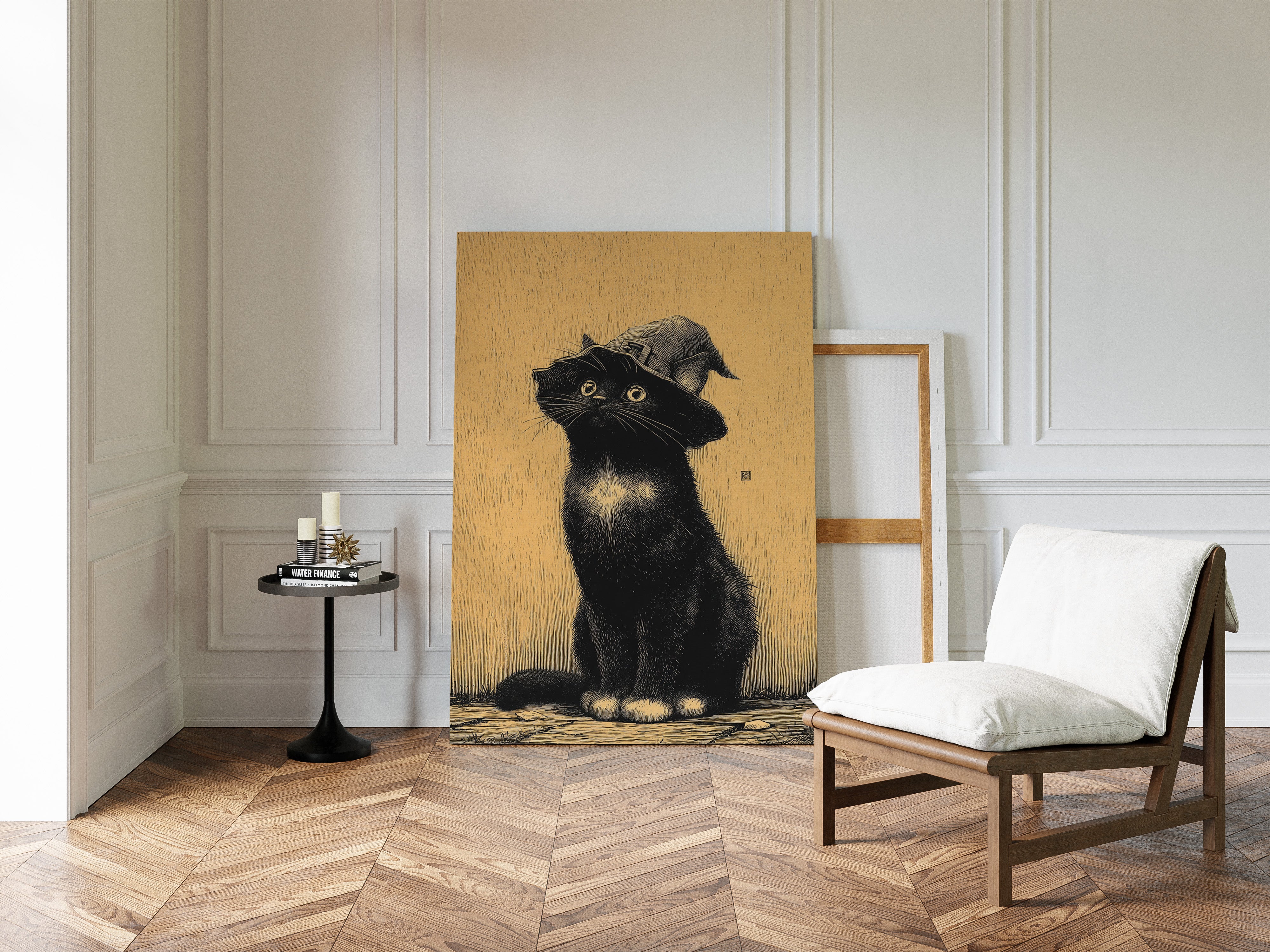 A curious gaze meets the observer, a feline dressed in whimsical attire, poised as if ready to embark on a magical adventure. This piece captures the essence of contemporary storytelling through its playful yet striking imagery. The black cat, adorned with a whimsical hat, stands against a warm golden backdrop, creating a delightful contrast that invites smiles and sparks the imagination. Ideal for a cozy reading nook or a whimsical children's room, this enchanting artwork adds a touch of charm to any space.