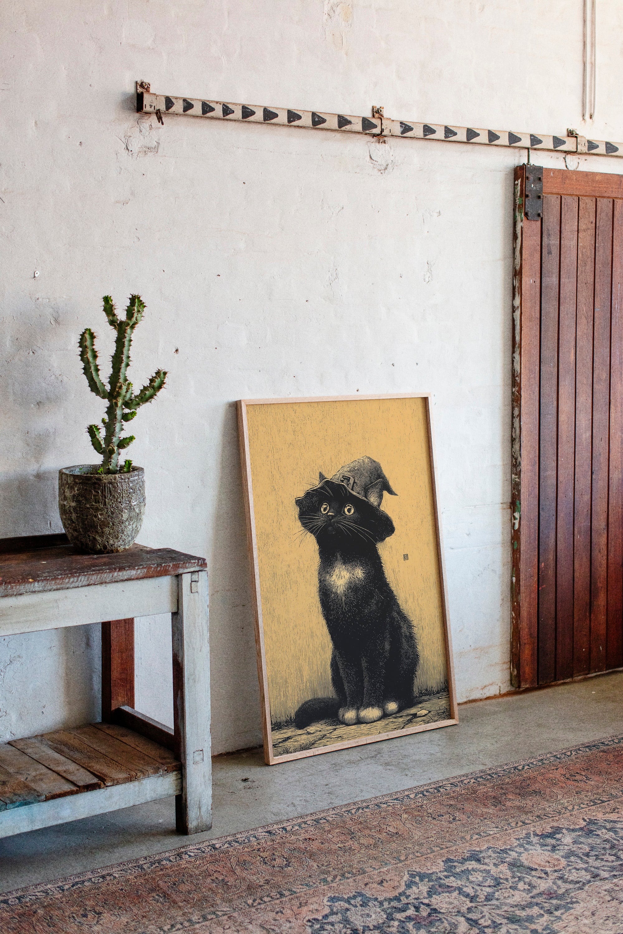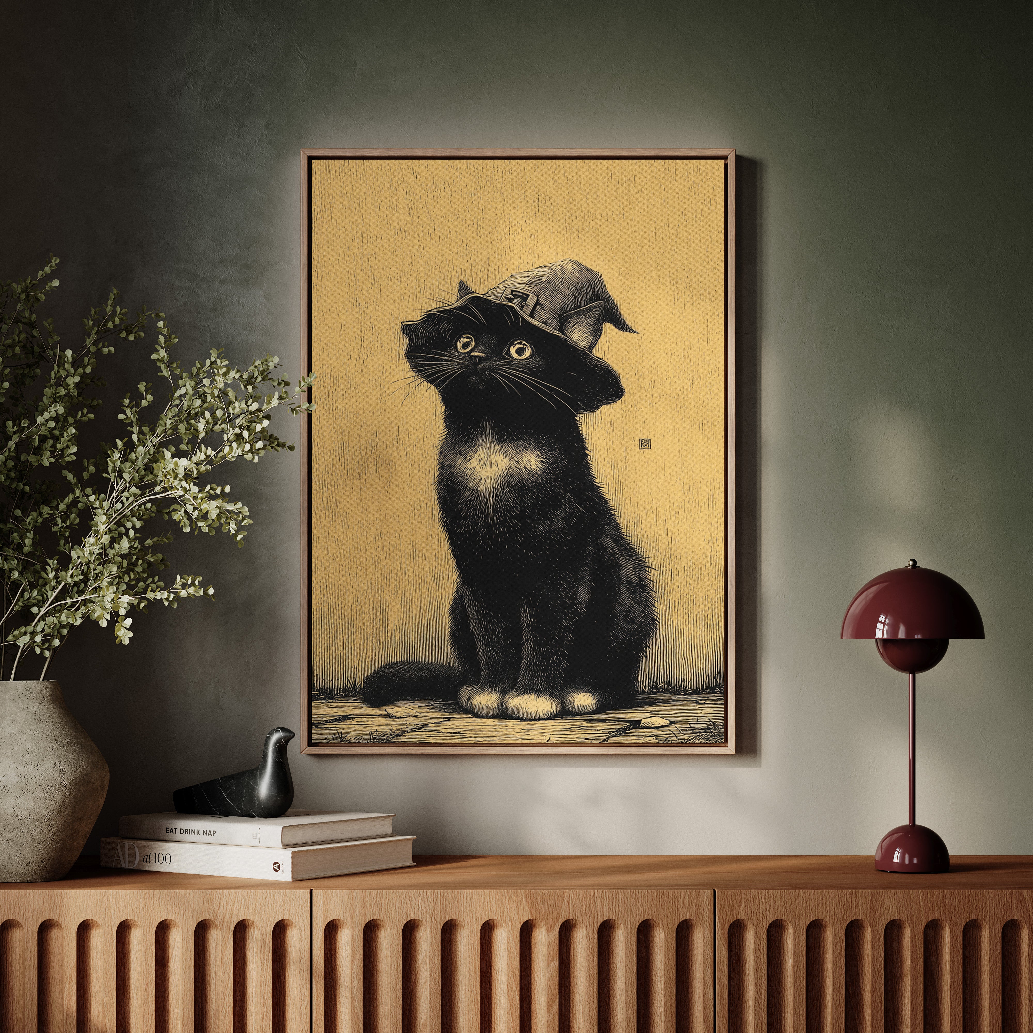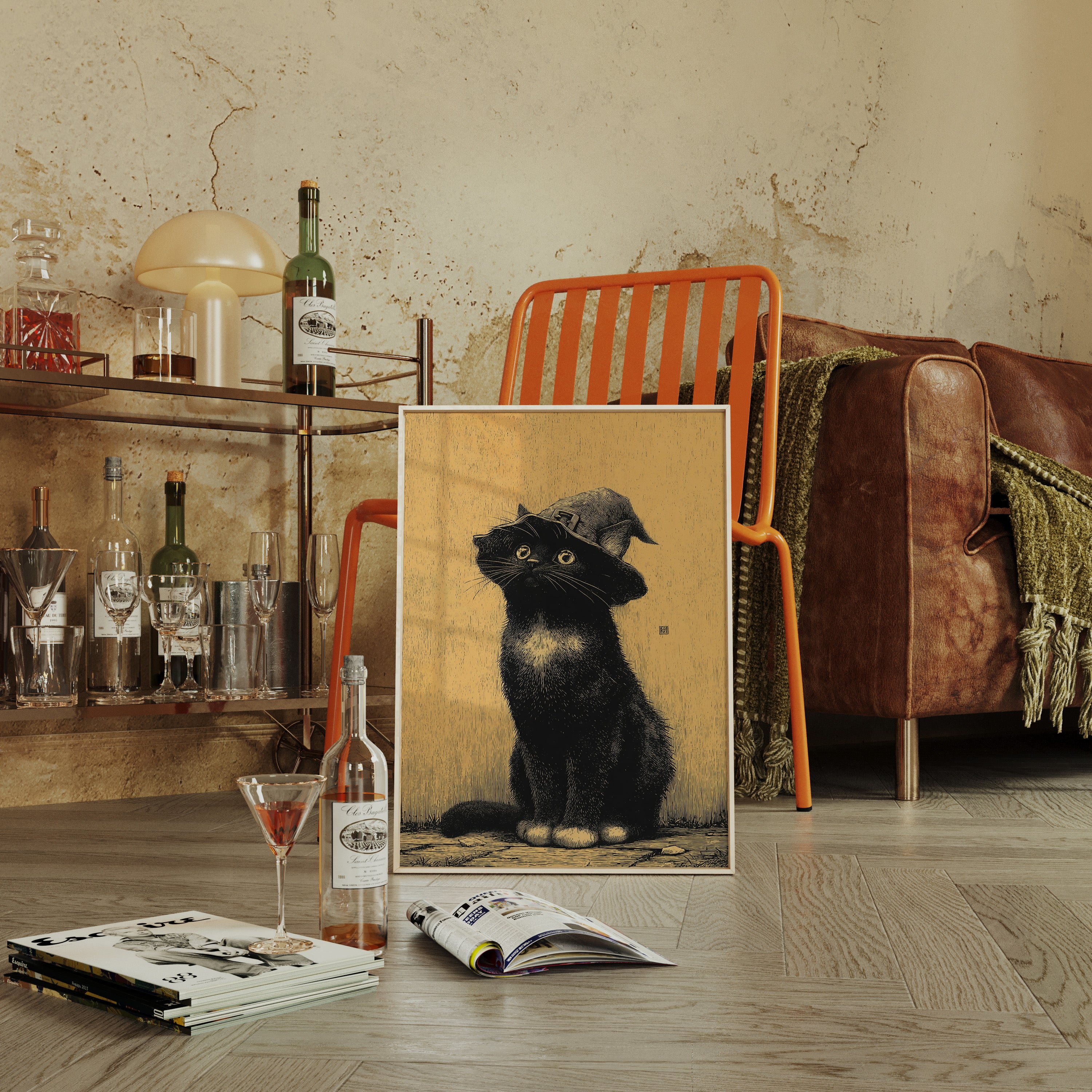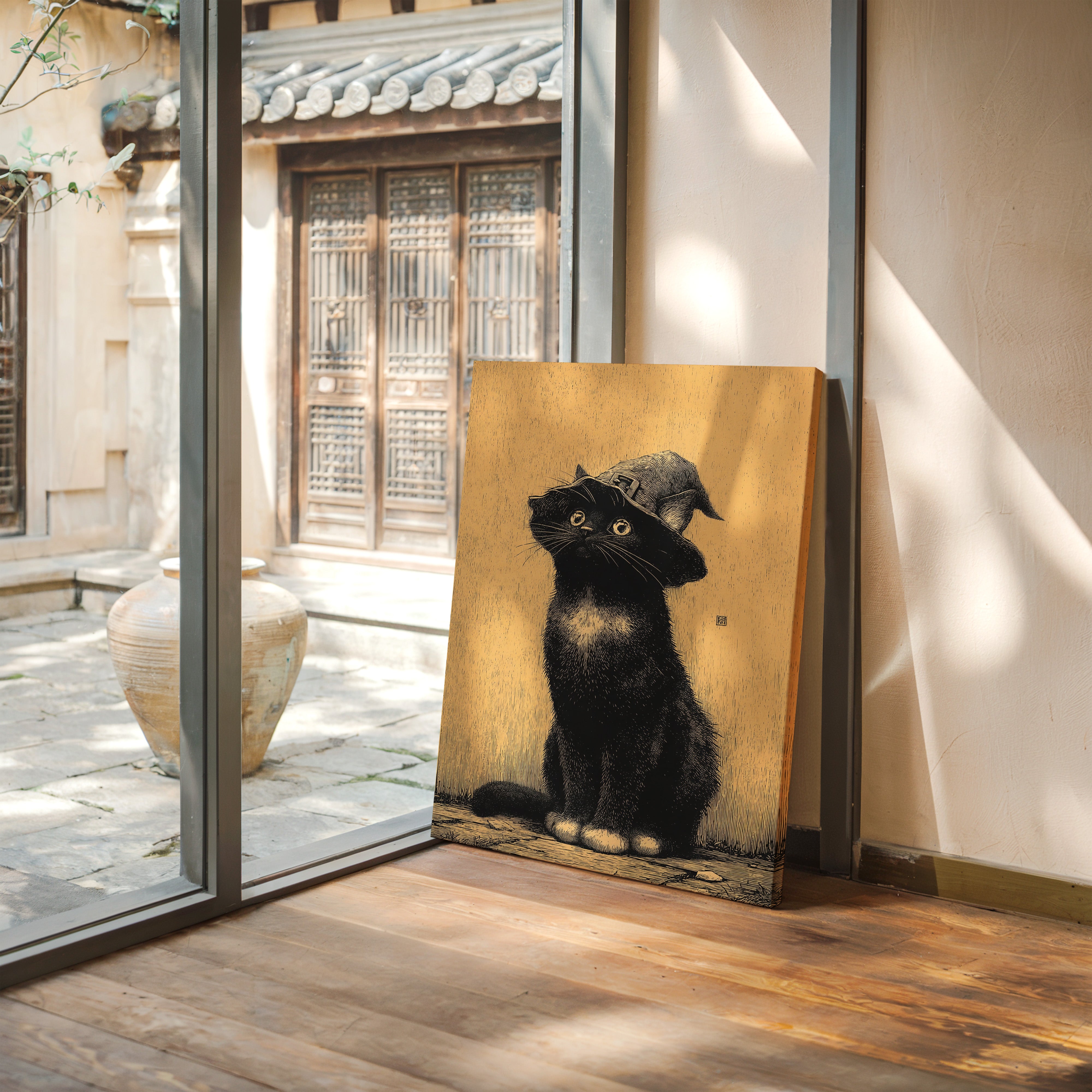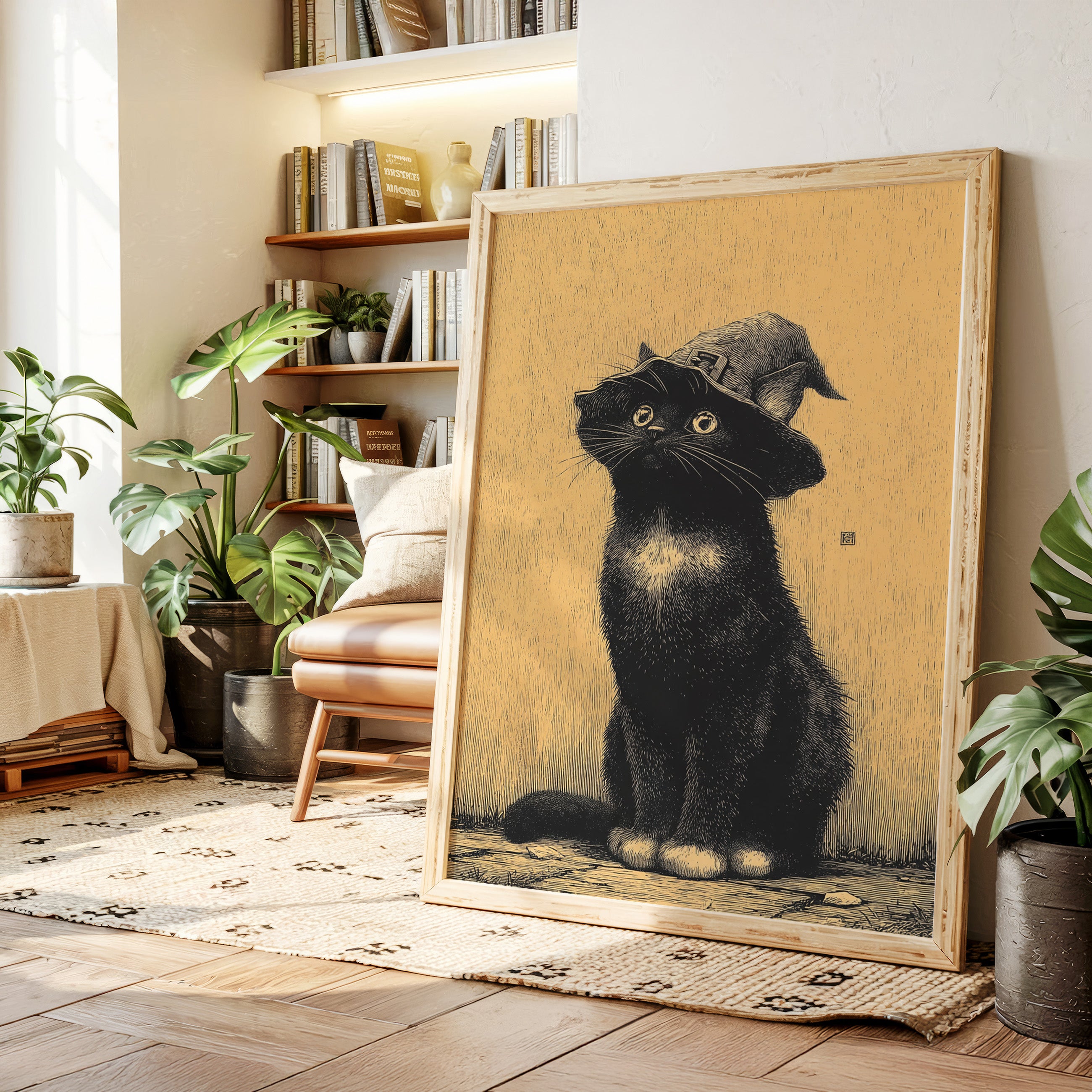 A curious gaze meets the observer, a feline dressed in whimsical attire, poised as if ready to embark on a magical adventure. This piece captures the essence of contemporary storytelling through its playful yet striking imagery. The black cat, adorned with a whimsical hat, stands against a warm golden backdrop, creating a delightful contrast that invites smiles and sparks the imagination. Ideal for a cozy reading nook or a whimsical children's room, this enchanting artwork adds a touch of charm to any space.