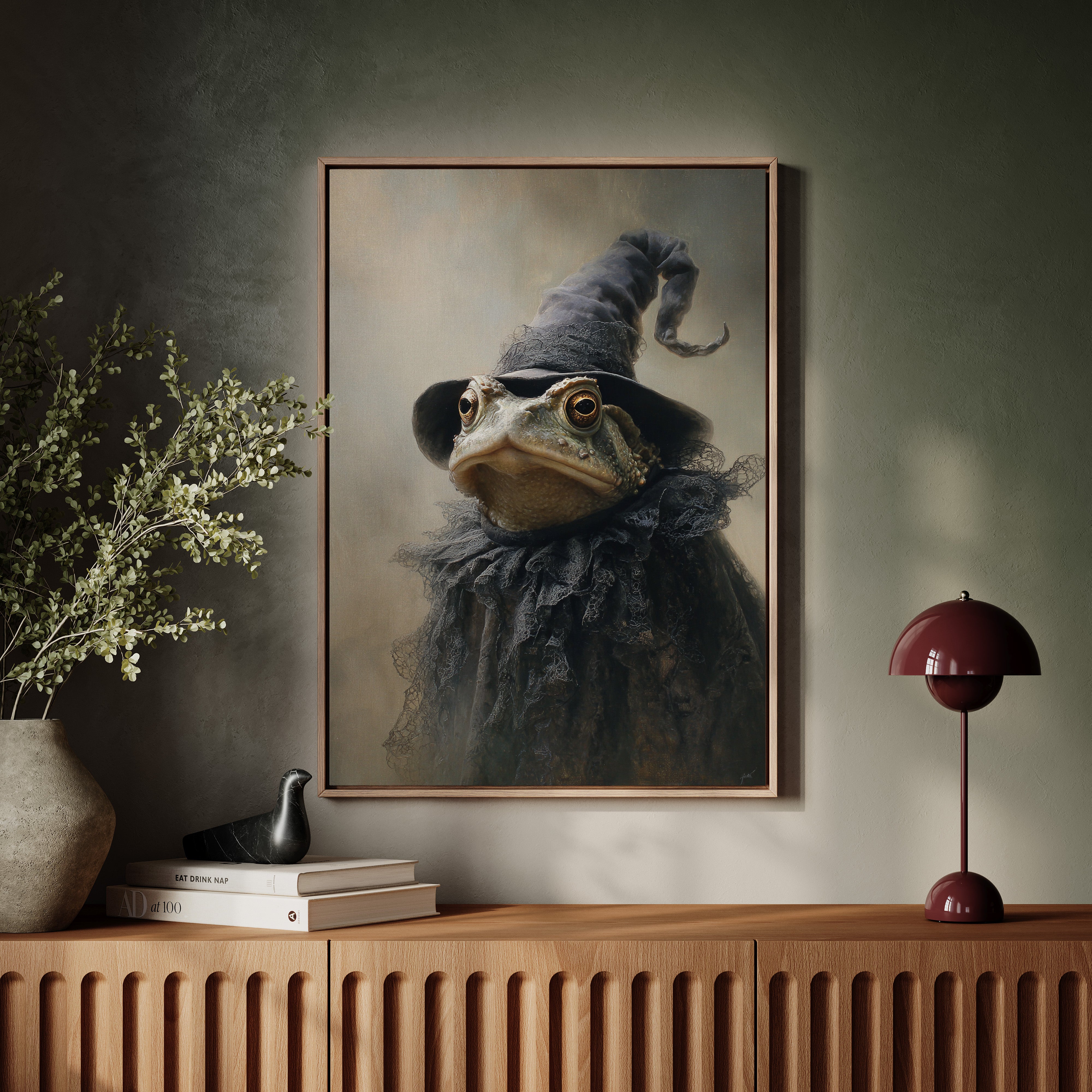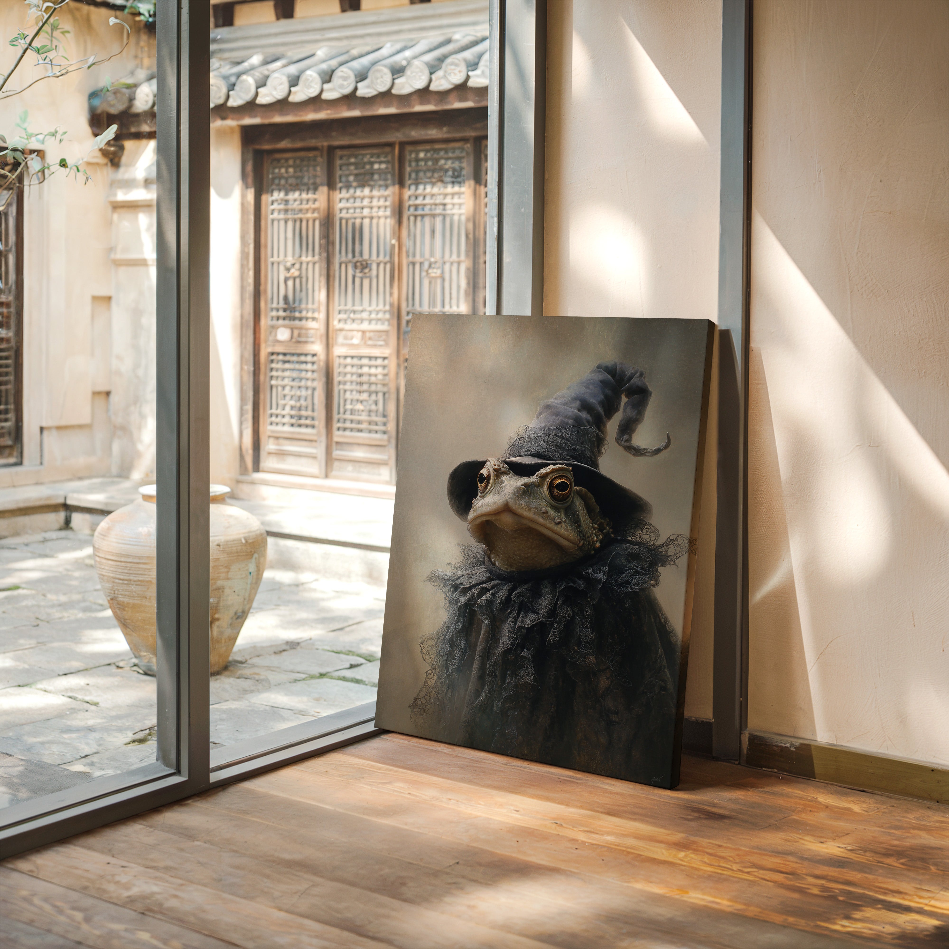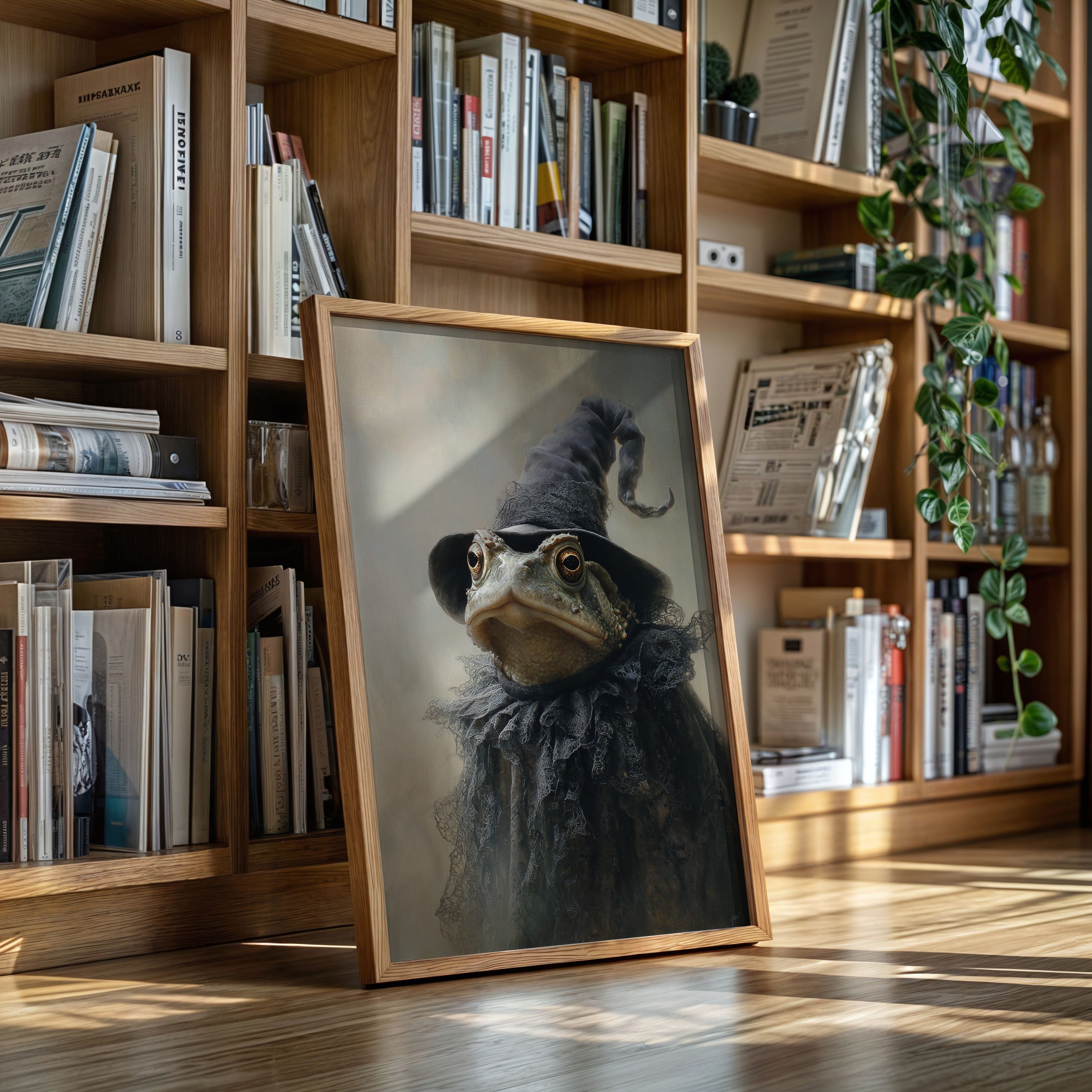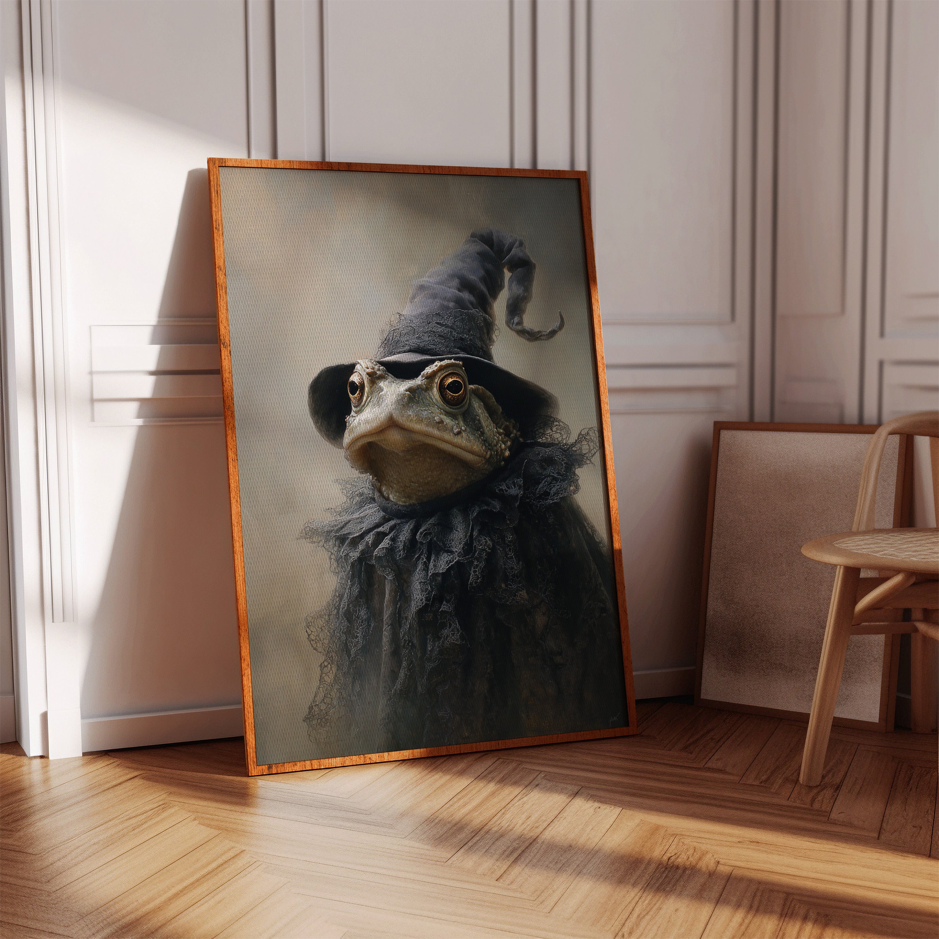In a world where magic lingers in the air, an unlikely sage stands resolute, cloaked in dark lace and a crooked hat. This piece captures the whimsy and curiosity of the 'Artisanal' collection, blending fantasy with intricate craftsmanship. The rich textures of the ruffled collar and the vivid, expressive eyes draw you into a realm where the ordinary meets the extraordinary. Ideal for a cozy reading nook or a whimsical corner of your home, this piece invites imagination and storytelling.
