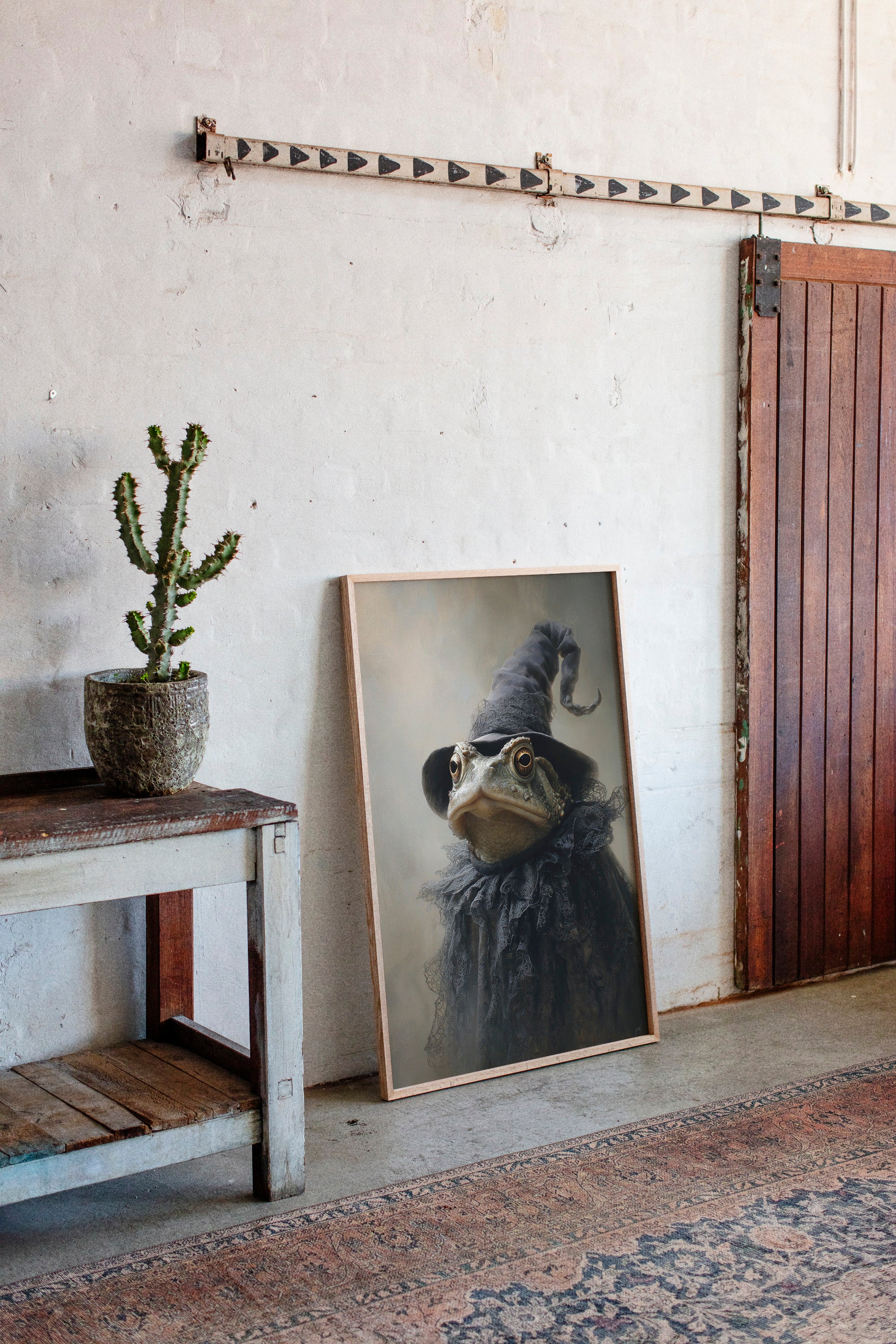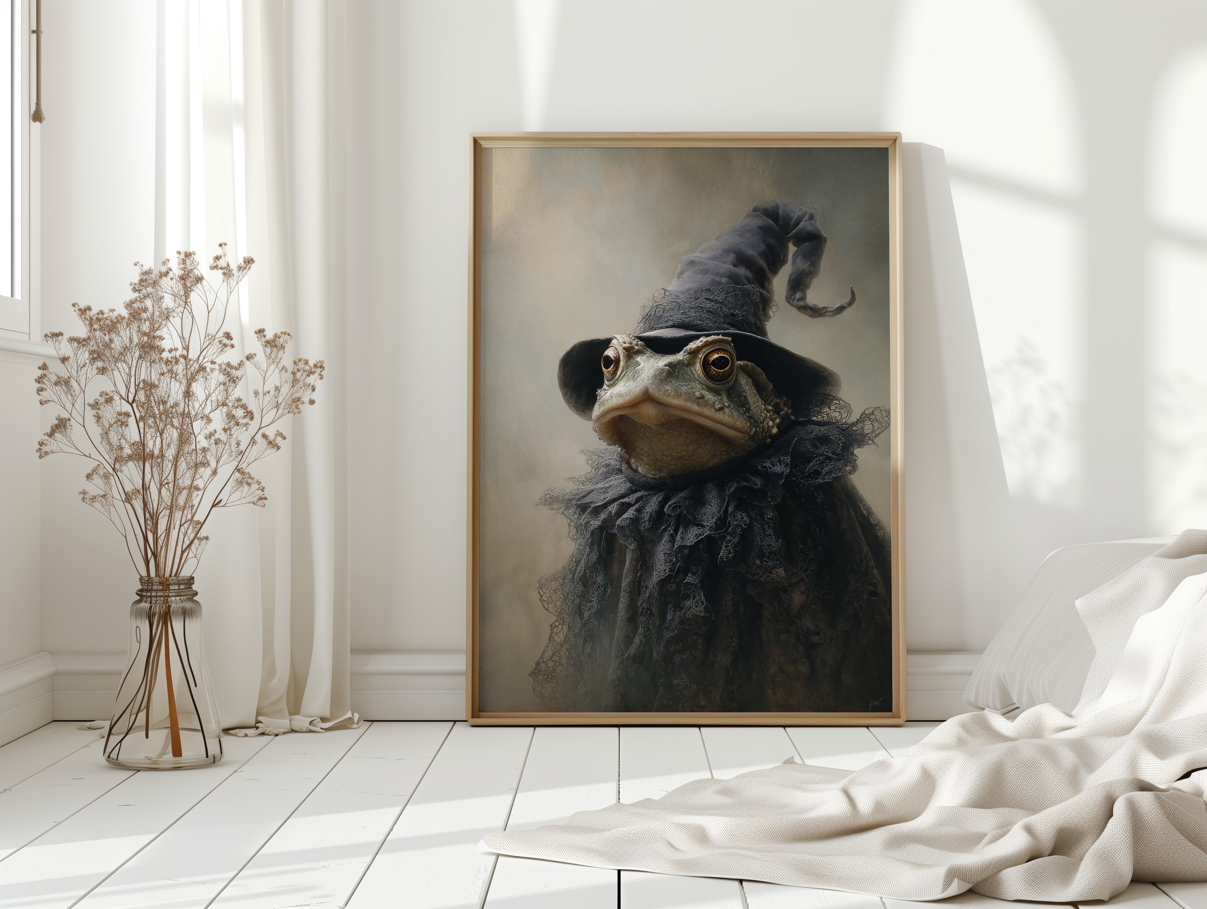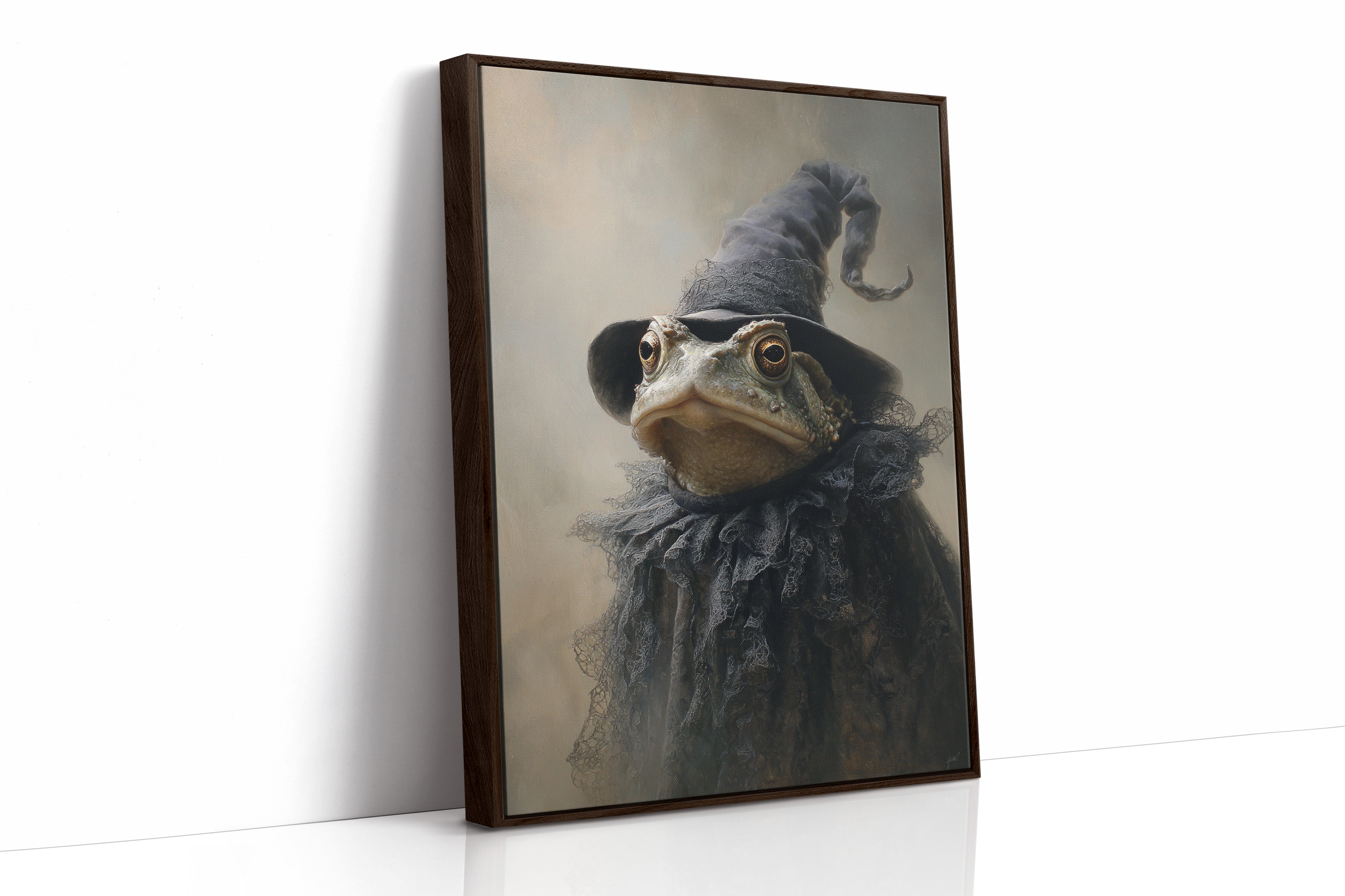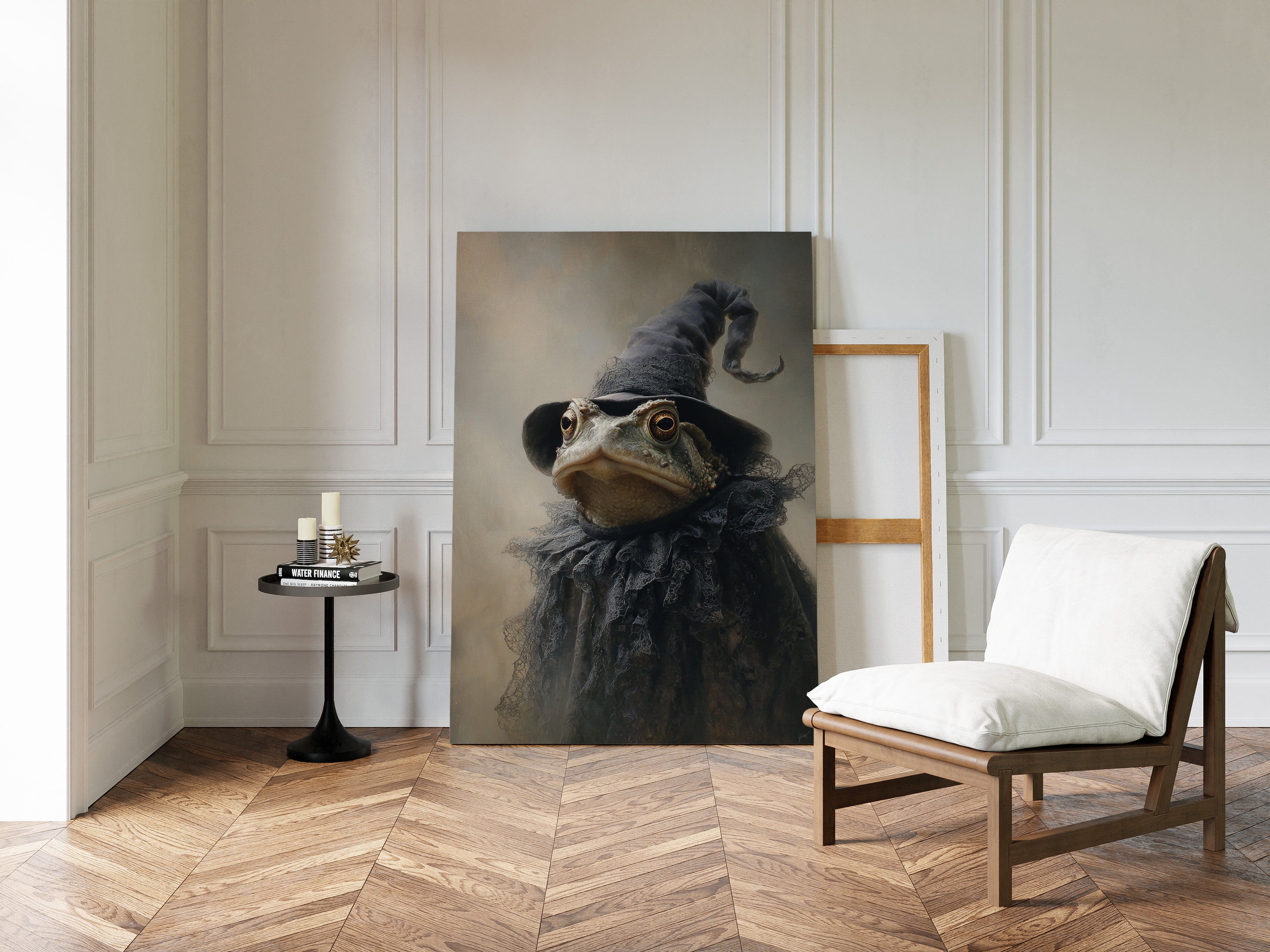 In a world where magic lingers in the air, an unlikely sage stands resolute, cloaked in dark lace and a crooked hat. This piece captures the whimsy and curiosity of the 'Artisanal' collection, blending fantasy with intricate craftsmanship. The rich textures of the ruffled collar and the vivid, expressive eyes draw you into a realm where the ordinary meets the extraordinary. Ideal for a cozy reading nook or a whimsical corner of your home, this piece invites imagination and storytelling.