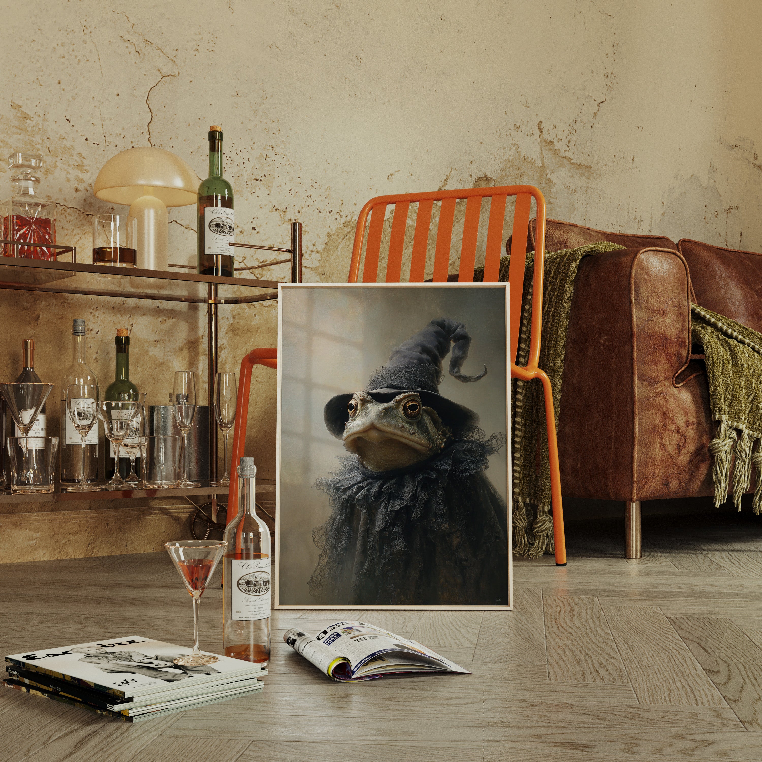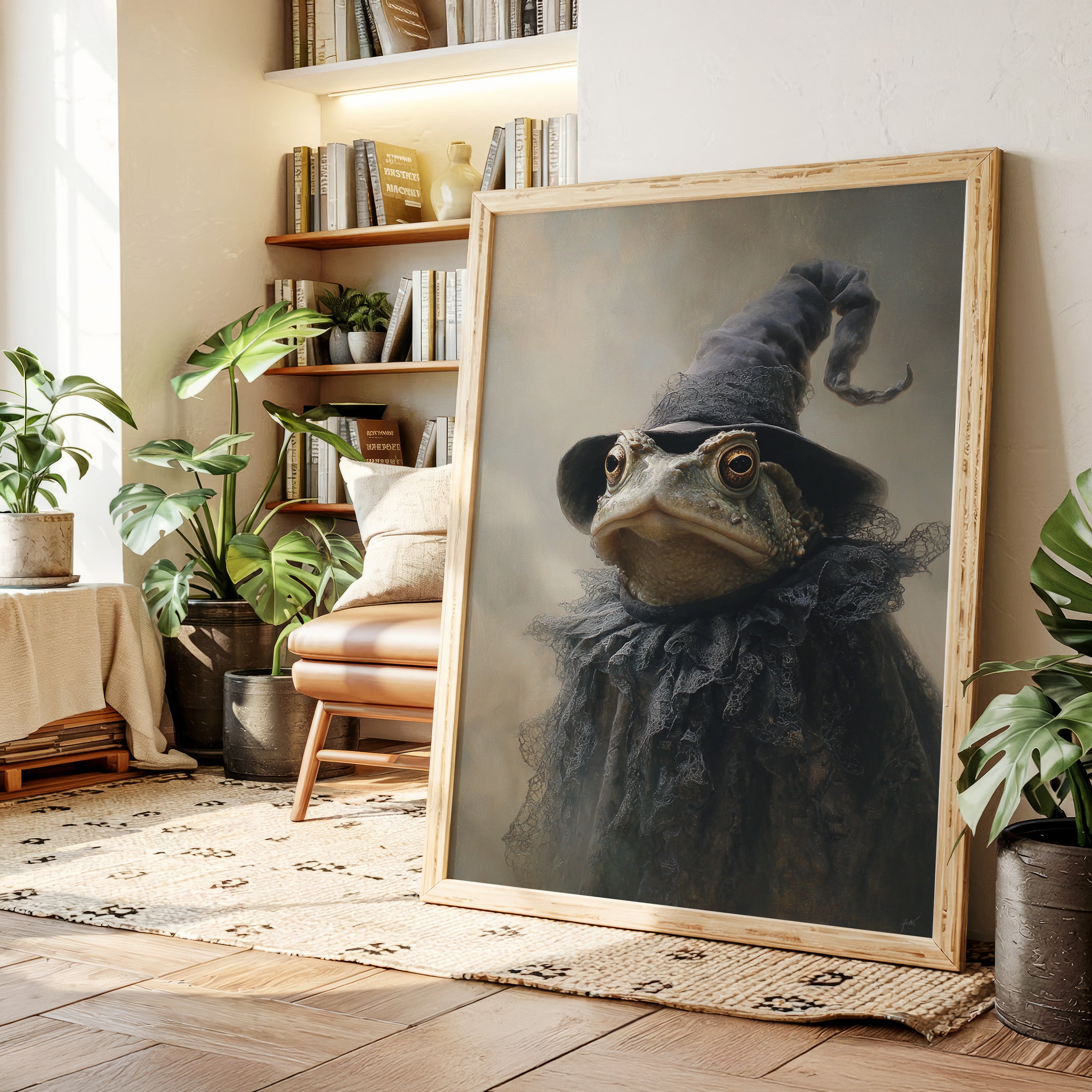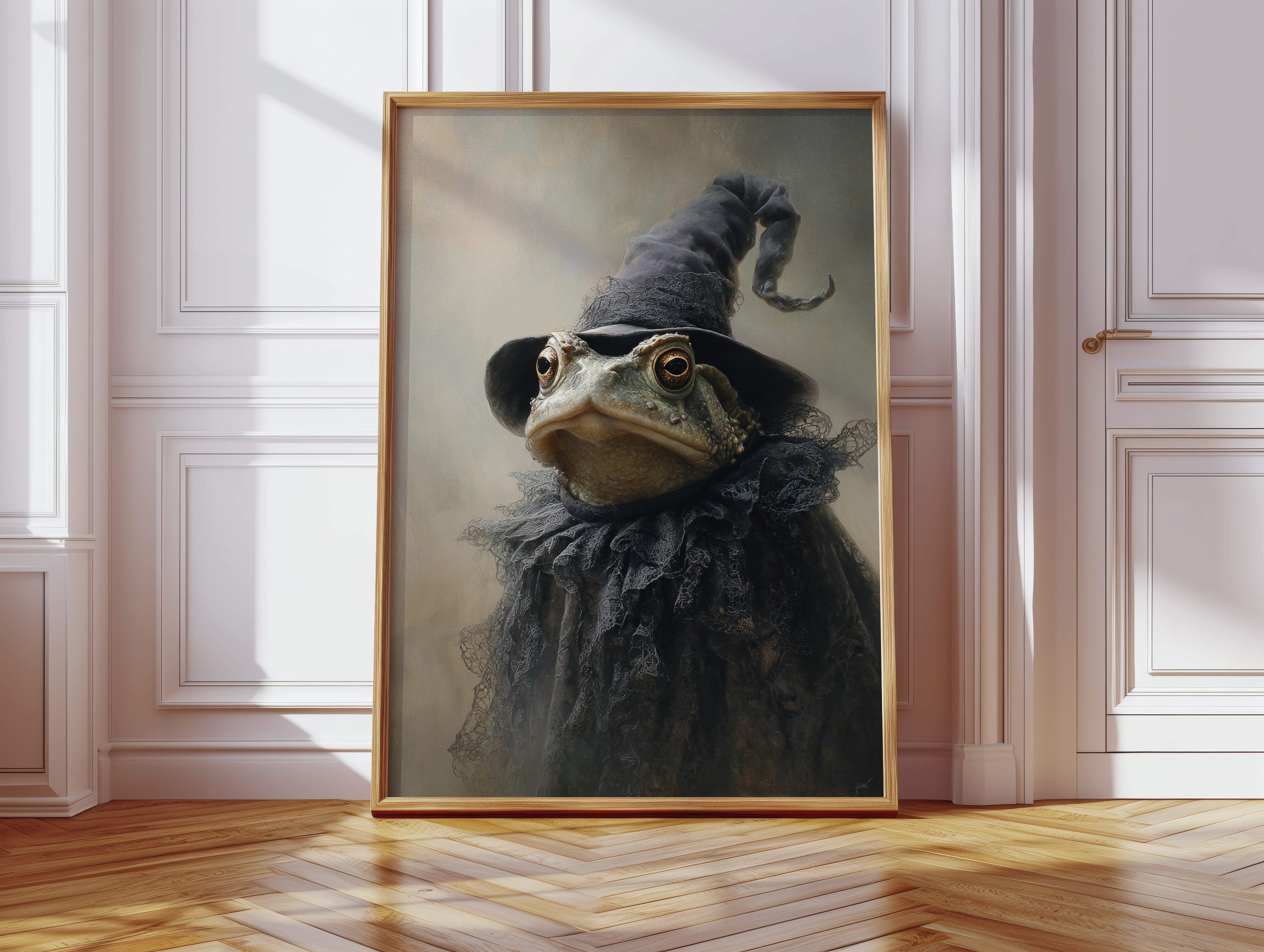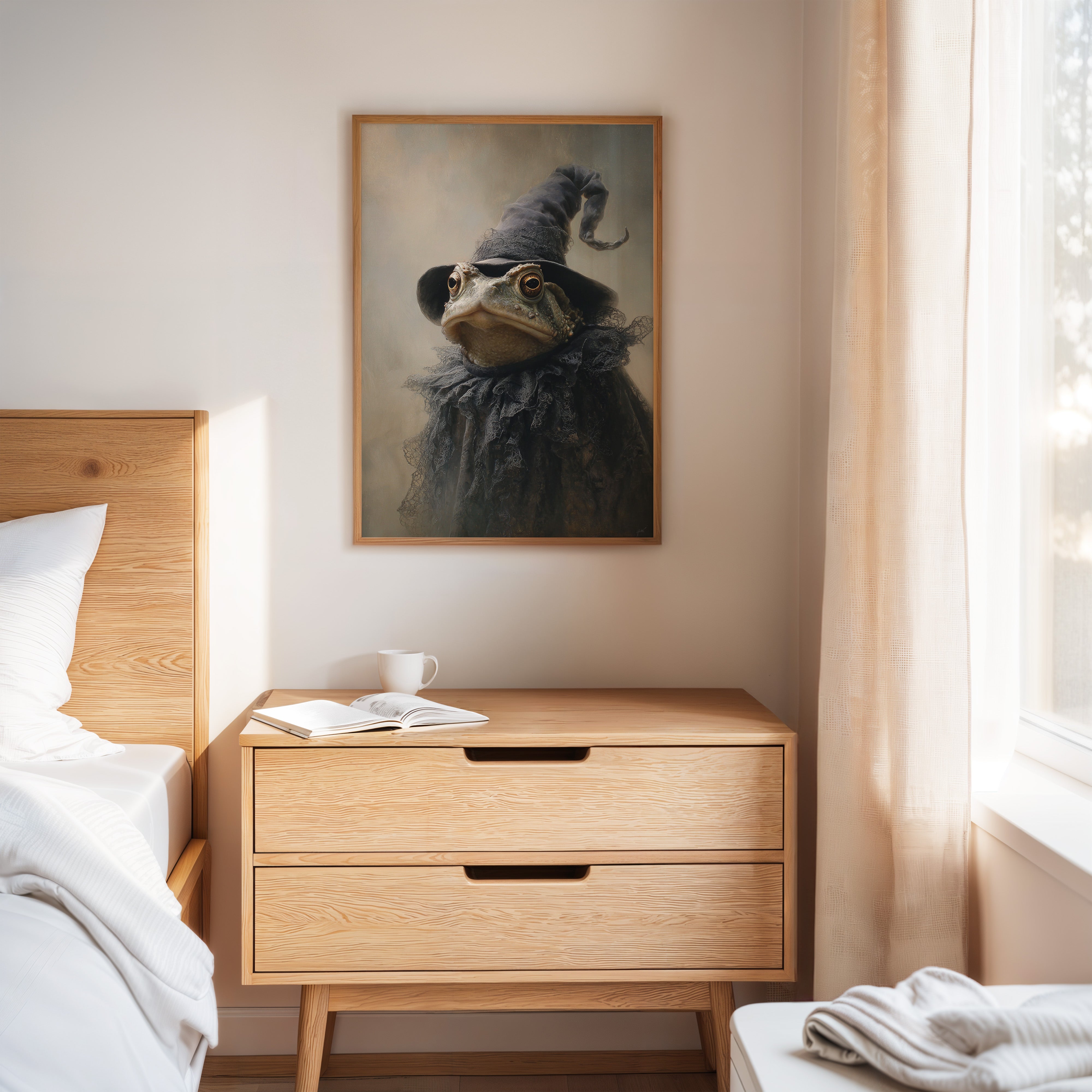 In a world where magic lingers in the air, an unlikely sage stands resolute, cloaked in dark lace and a crooked hat. This piece captures the whimsy and curiosity of the 'Artisanal' collection, blending fantasy with intricate craftsmanship. The rich textures of the ruffled collar and the vivid, expressive eyes draw you into a realm where the ordinary meets the extraordinary. Ideal for a cozy reading nook or a whimsical corner of your home, this piece invites imagination and storytelling.