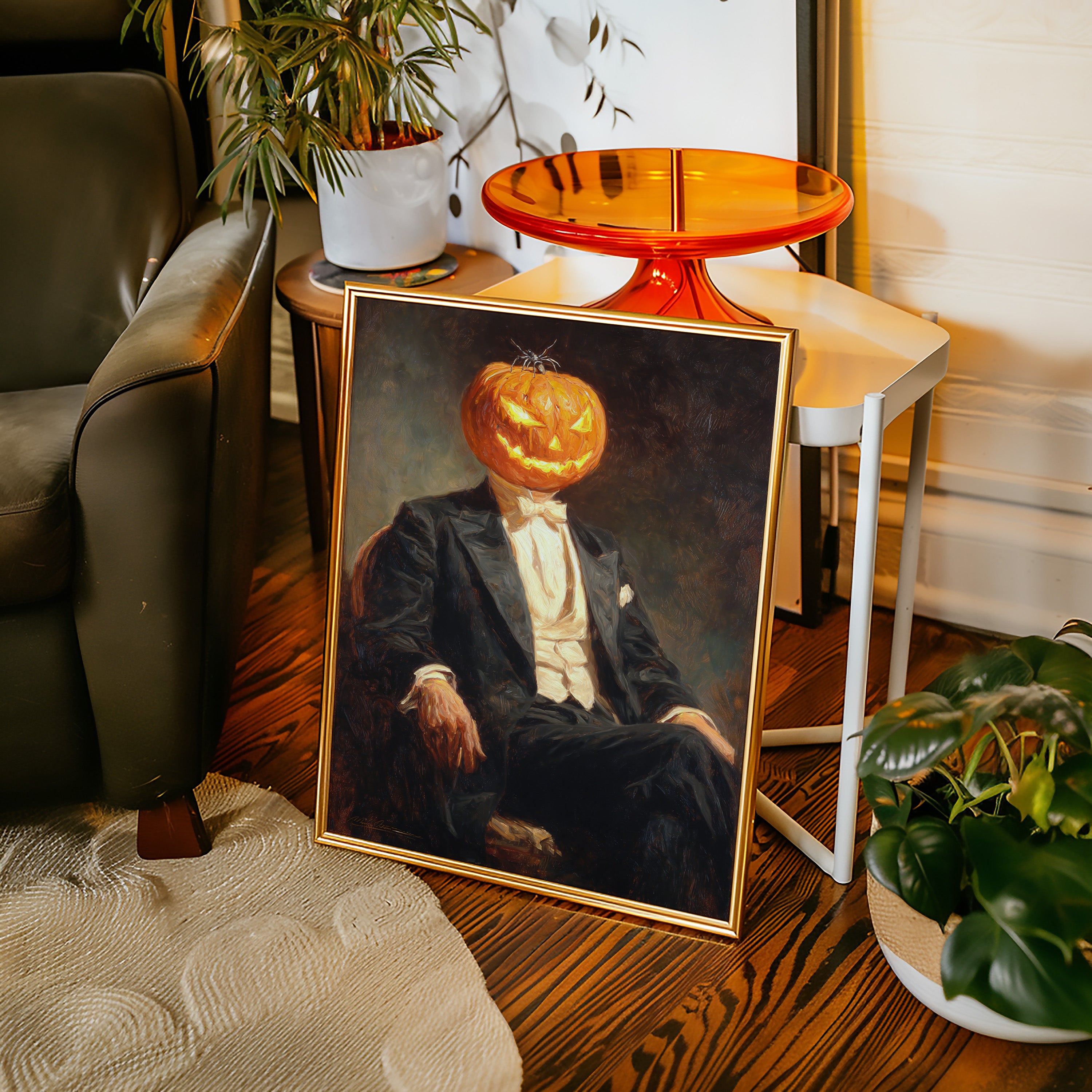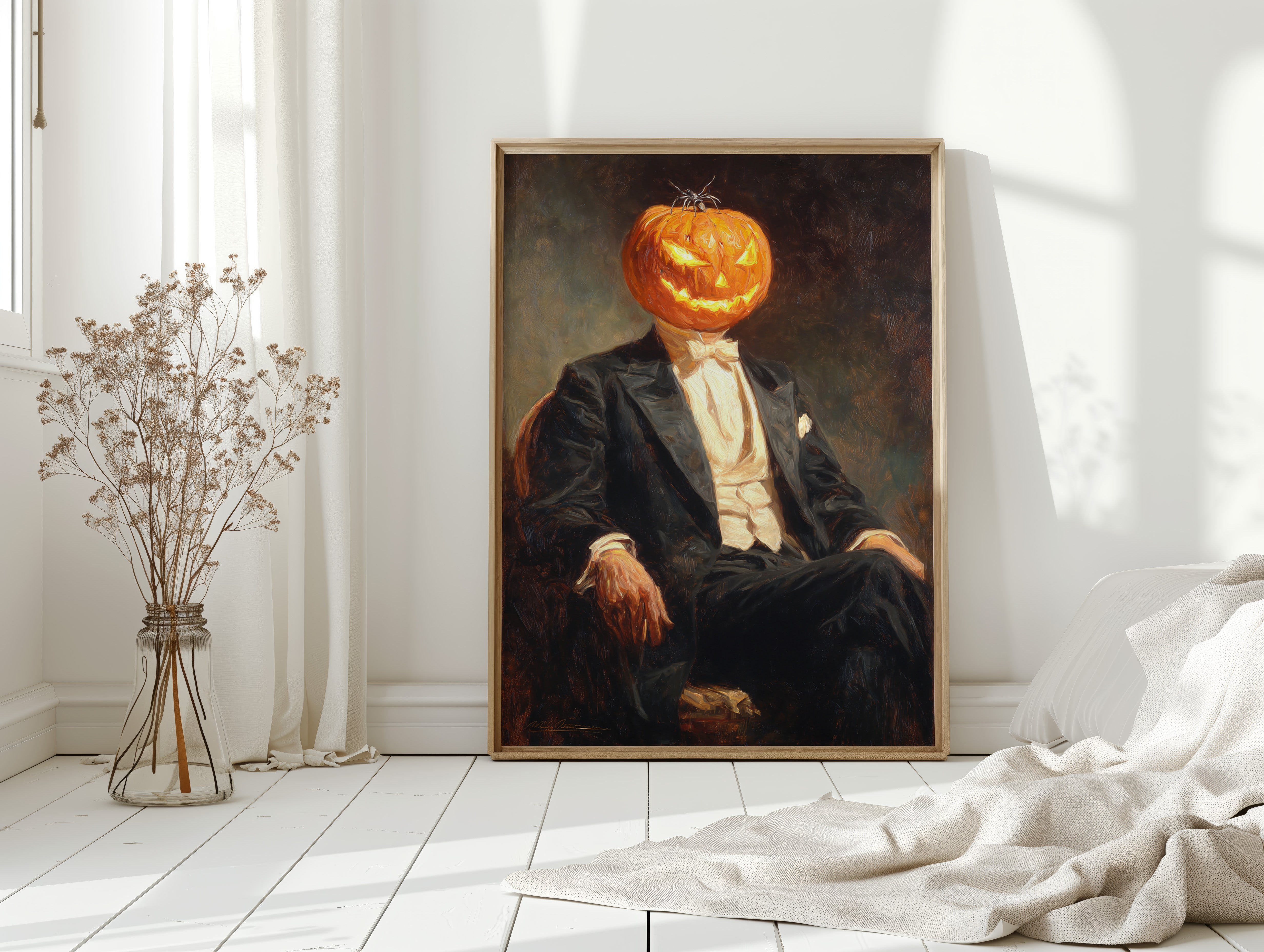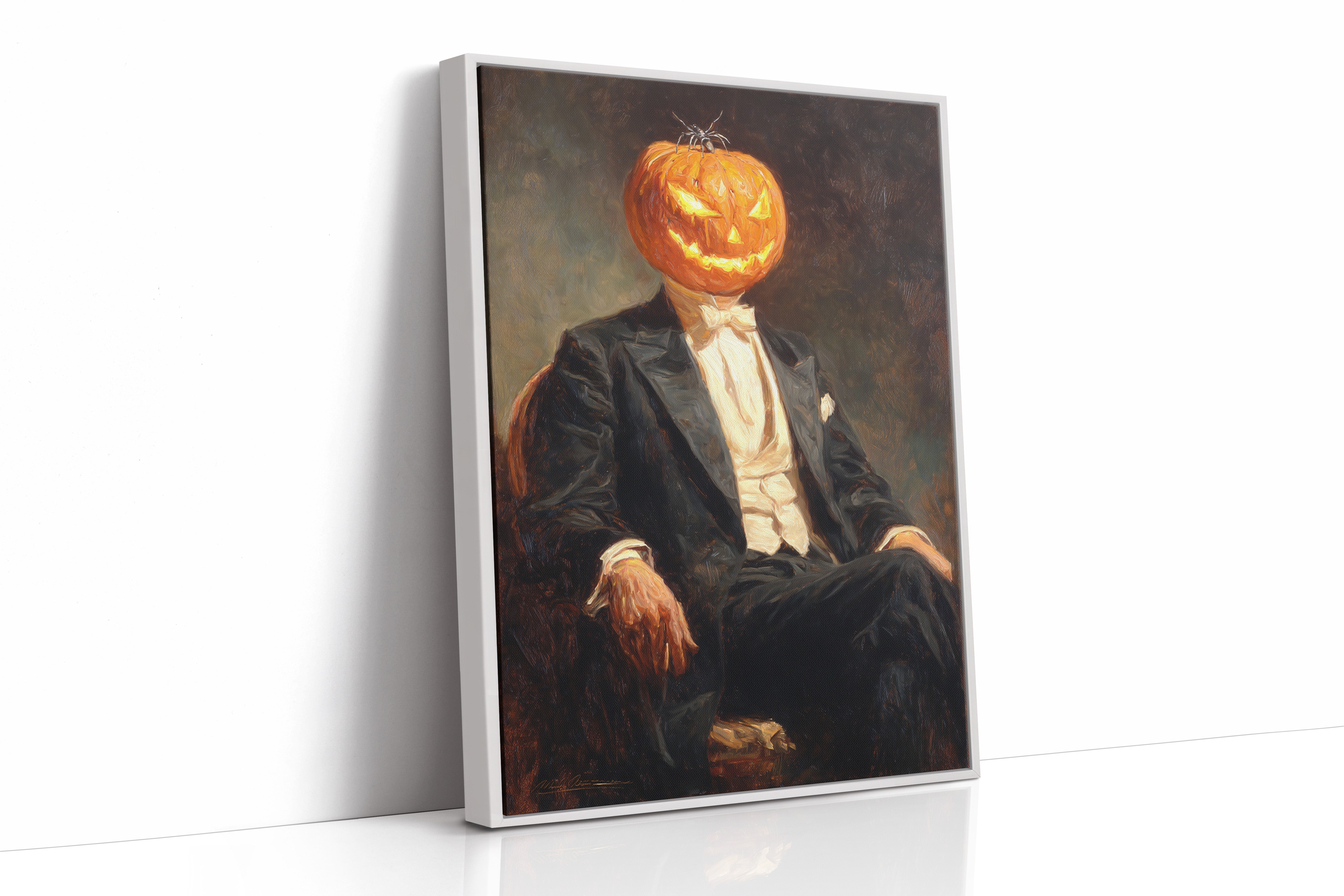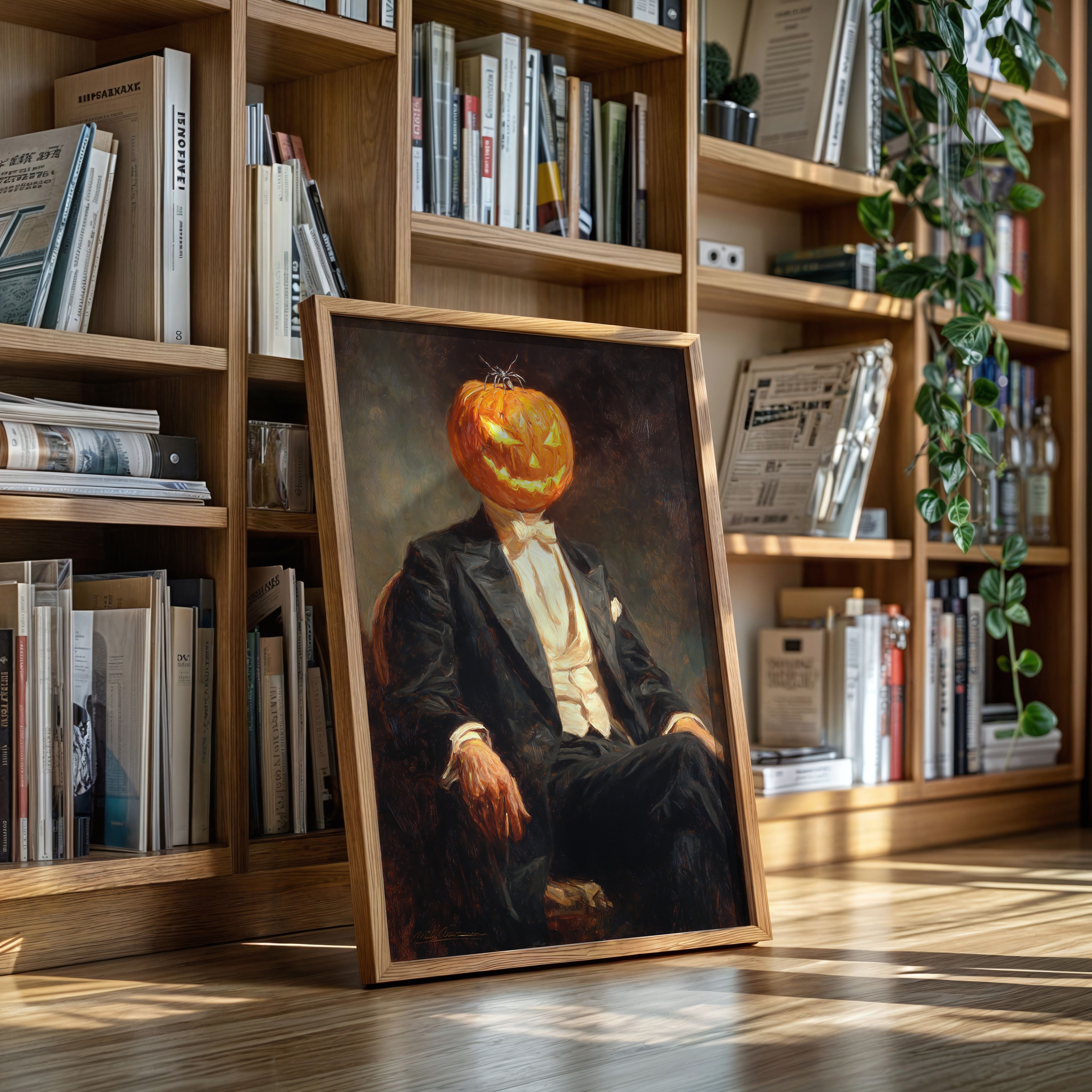 In a curious blend of elegance and whimsy, a figure sits, his head replaced by a carved pumpkin, radiating a glow that dances with mischief. This piece captures the contemporary spirit of reimagined identities, where tradition meets the playful essence of Halloween. The striking contrast of the formal suit against the vibrant orange of the pumpkin evokes a sense of both celebration and intrigue, inviting viewers to ponder the balance of sophistication and festivity. Ideal for a modern living room or a playful entryway, this piece sparks conversation and adds a touch of unique charm to your space.