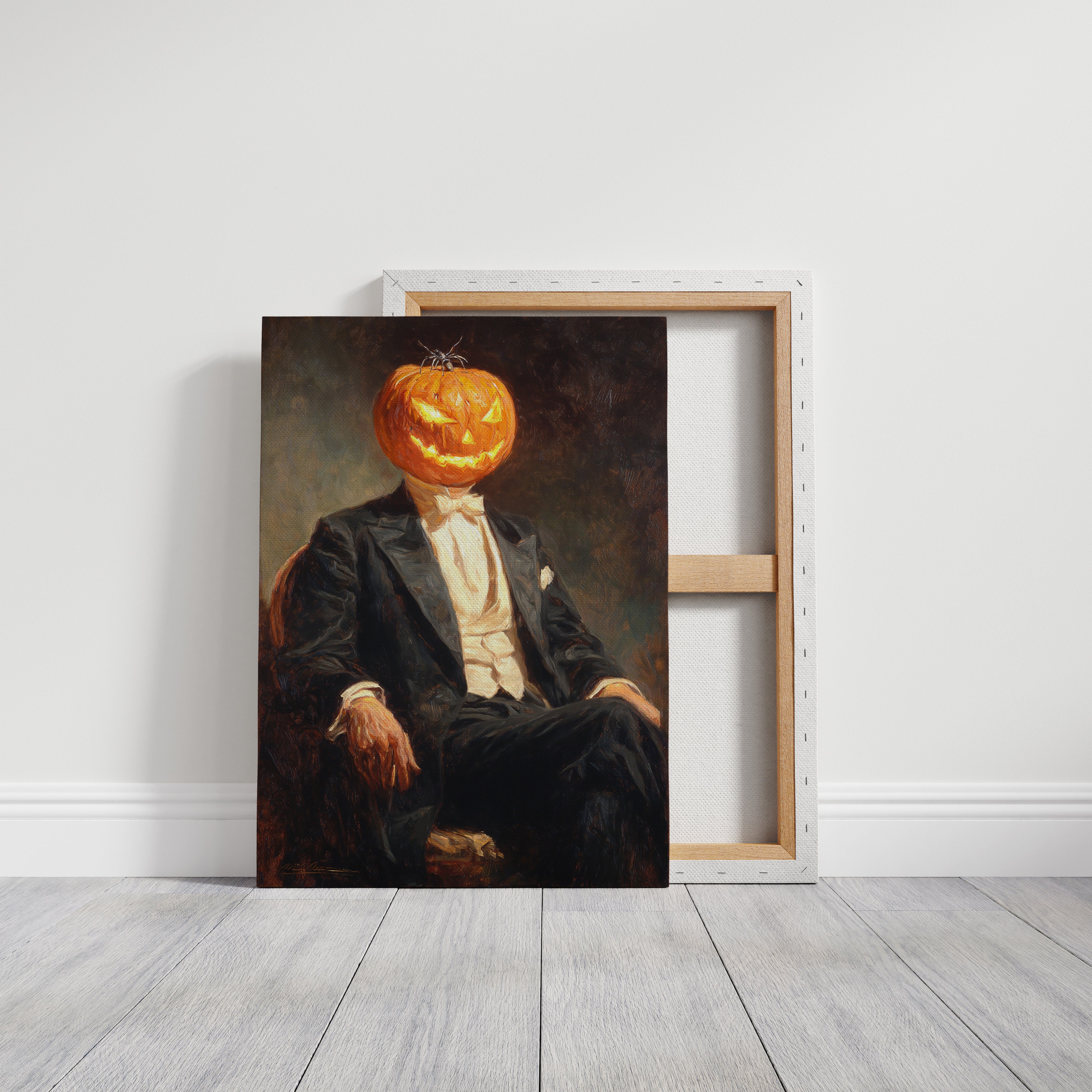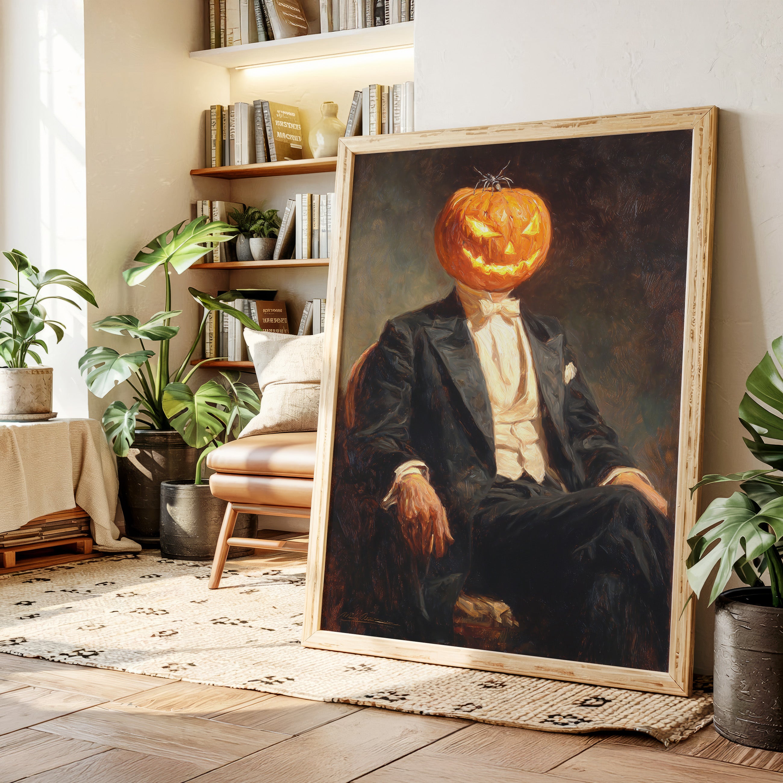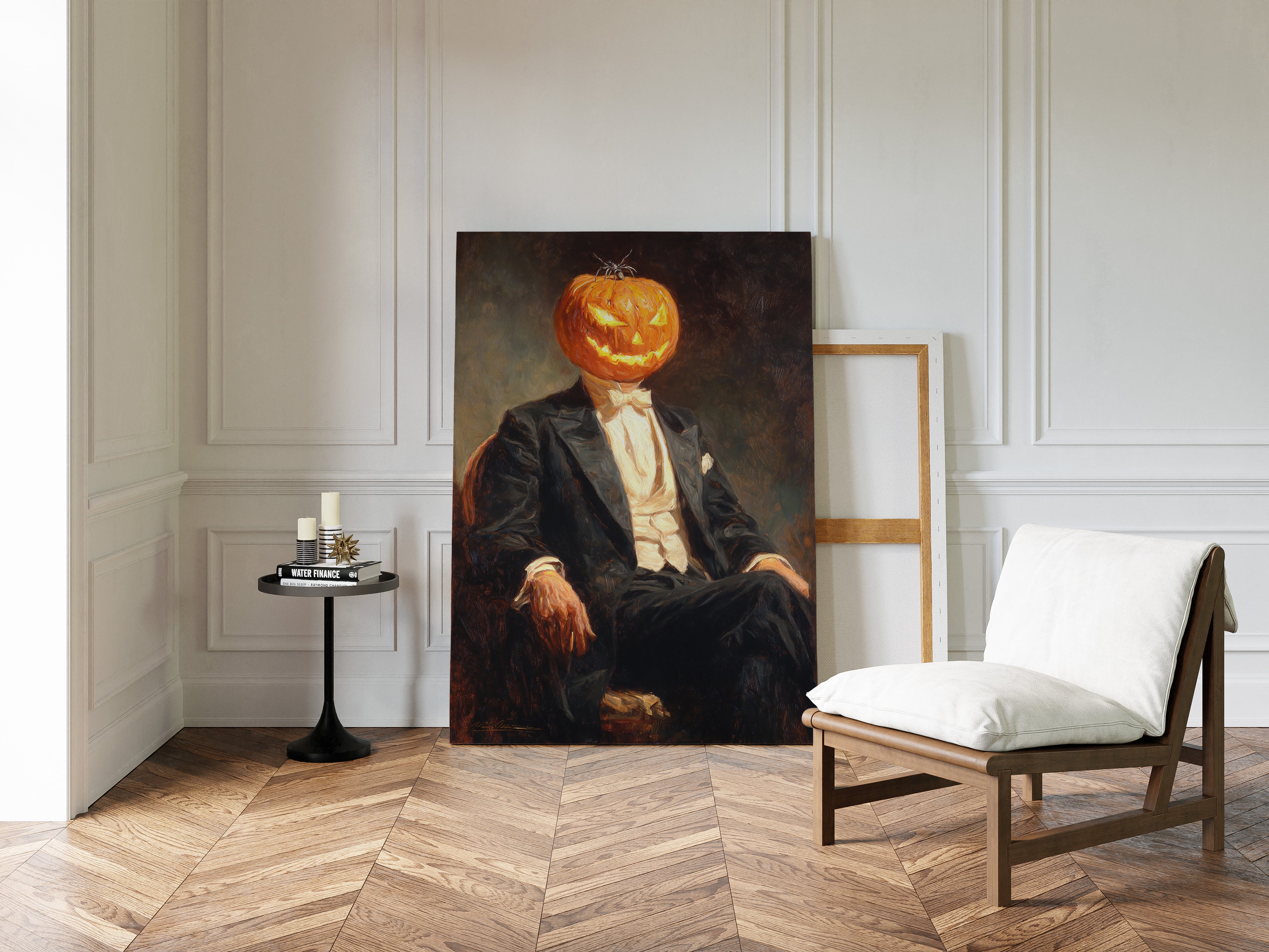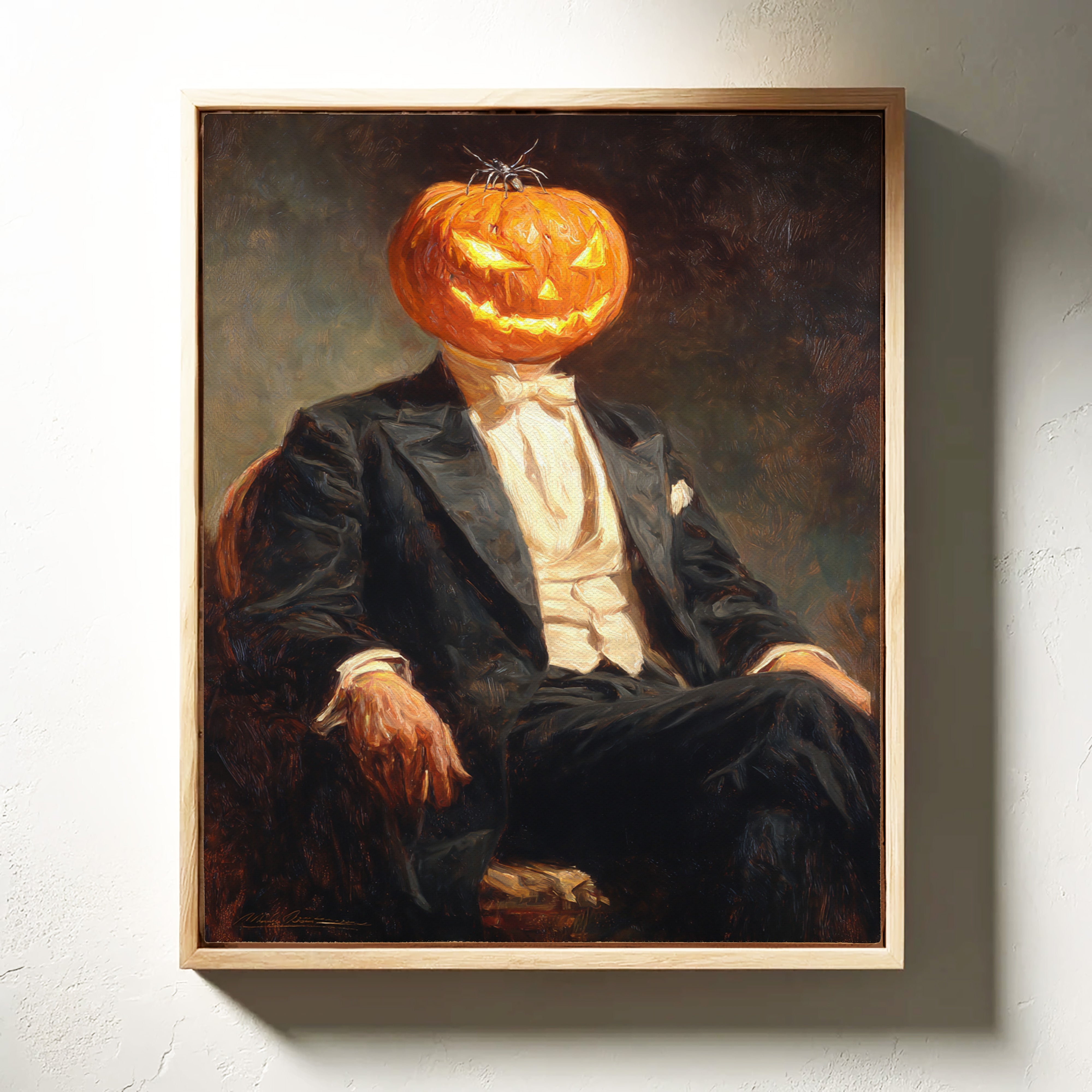 In a curious blend of elegance and whimsy, a figure sits, his head replaced by a carved pumpkin, radiating a glow that dances with mischief. This piece captures the contemporary spirit of reimagined identities, where tradition meets the playful essence of Halloween. The striking contrast of the formal suit against the vibrant orange of the pumpkin evokes a sense of both celebration and intrigue, inviting viewers to ponder the balance of sophistication and festivity. Ideal for a modern living room or a playful entryway, this piece sparks conversation and adds a touch of unique charm to your space.