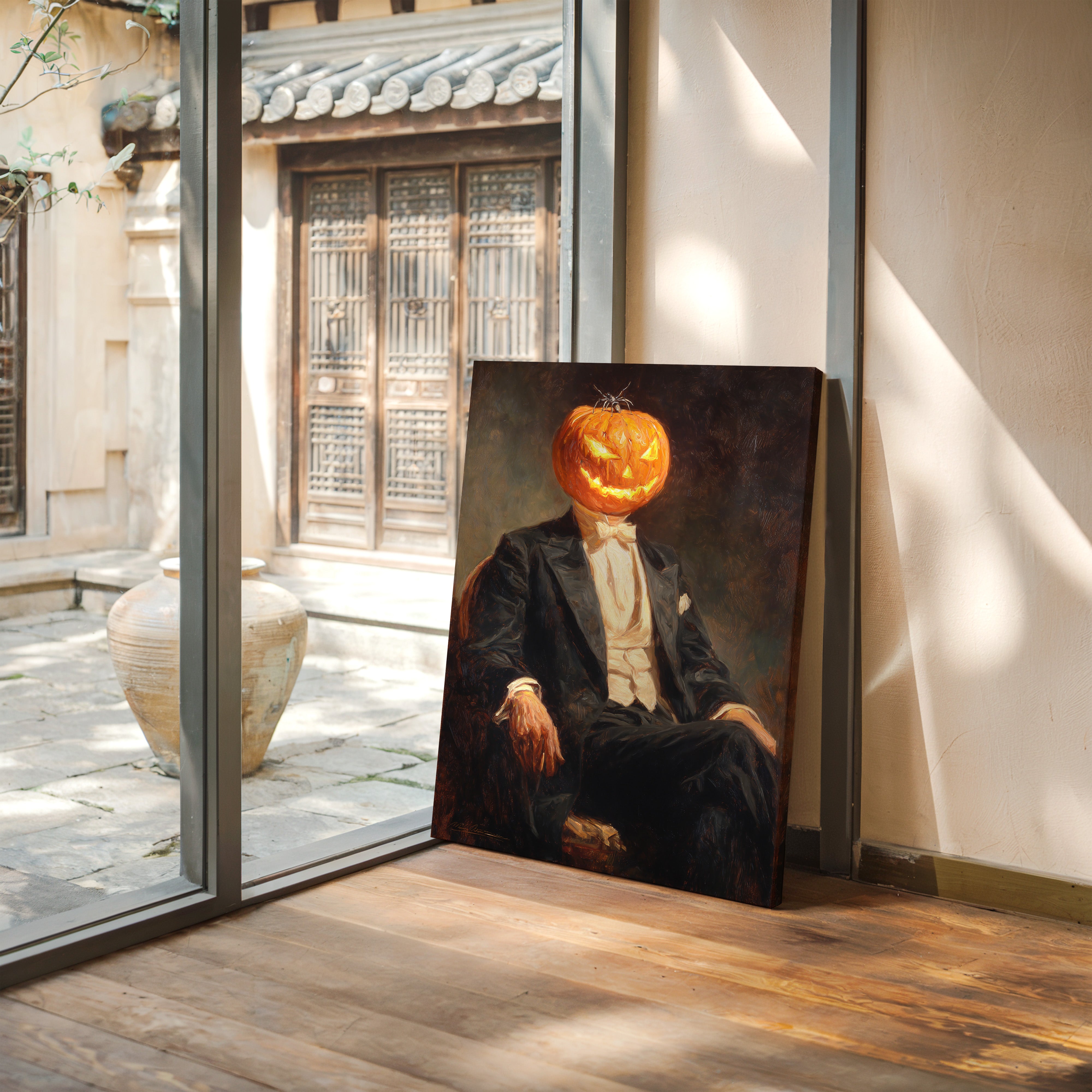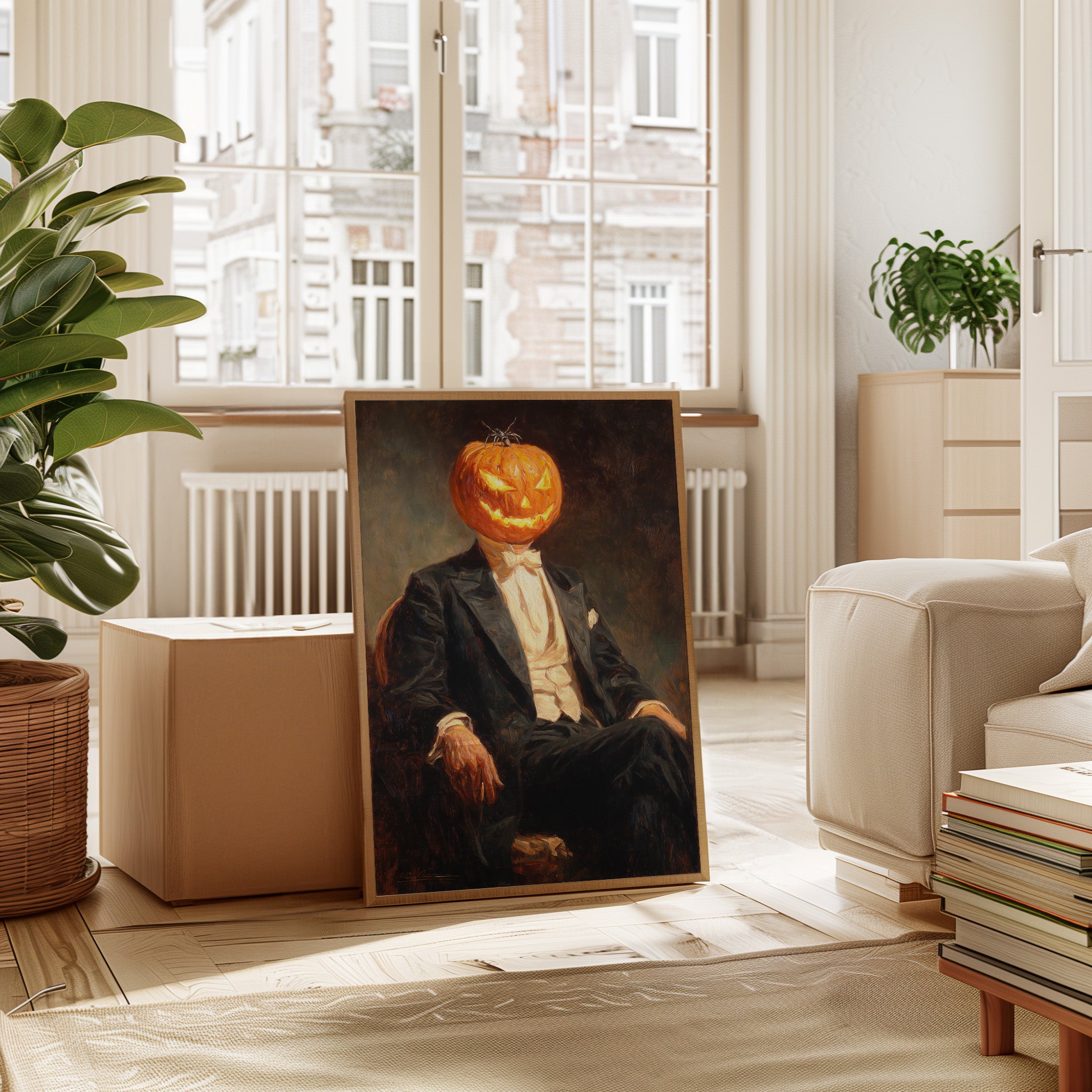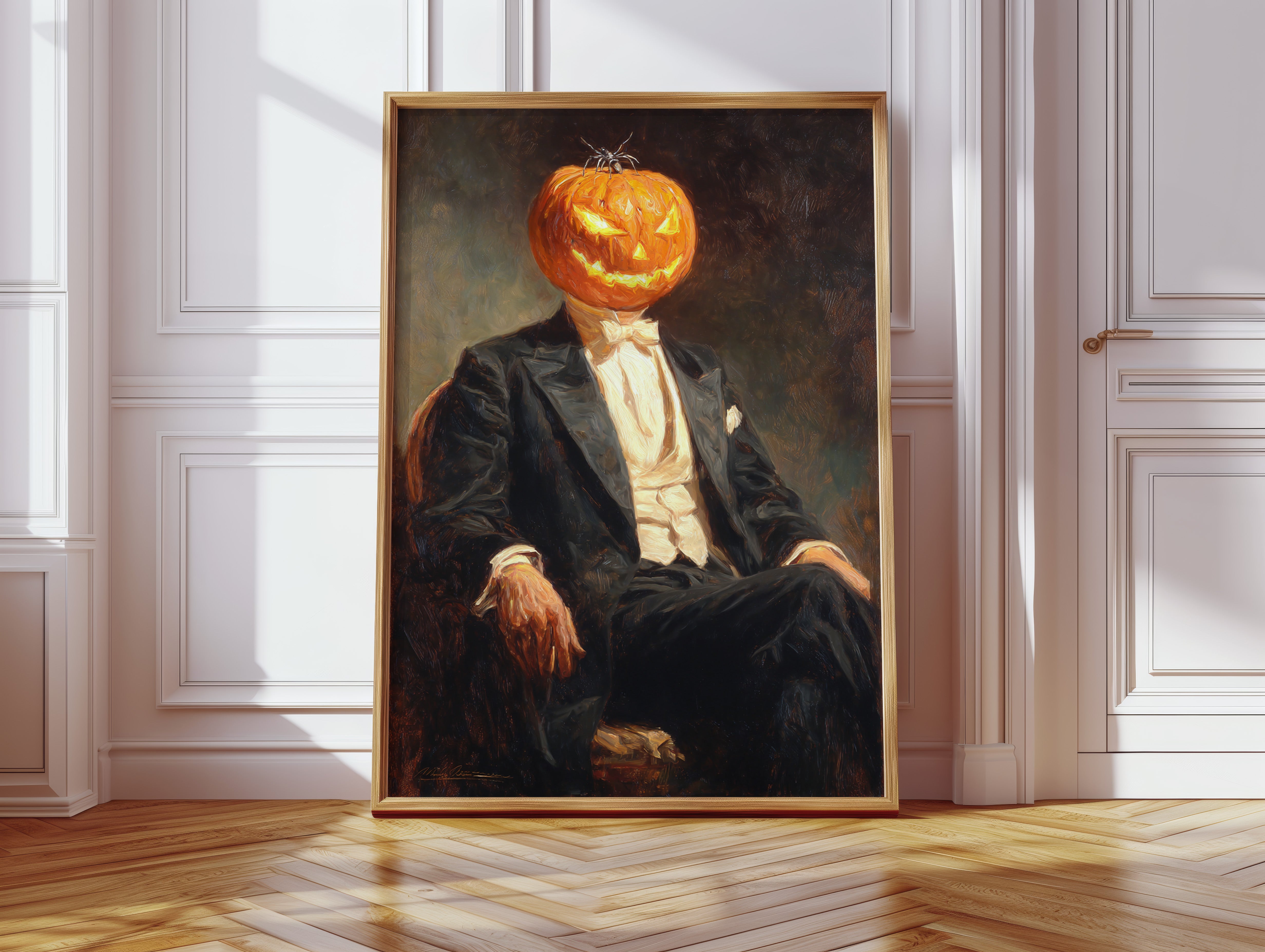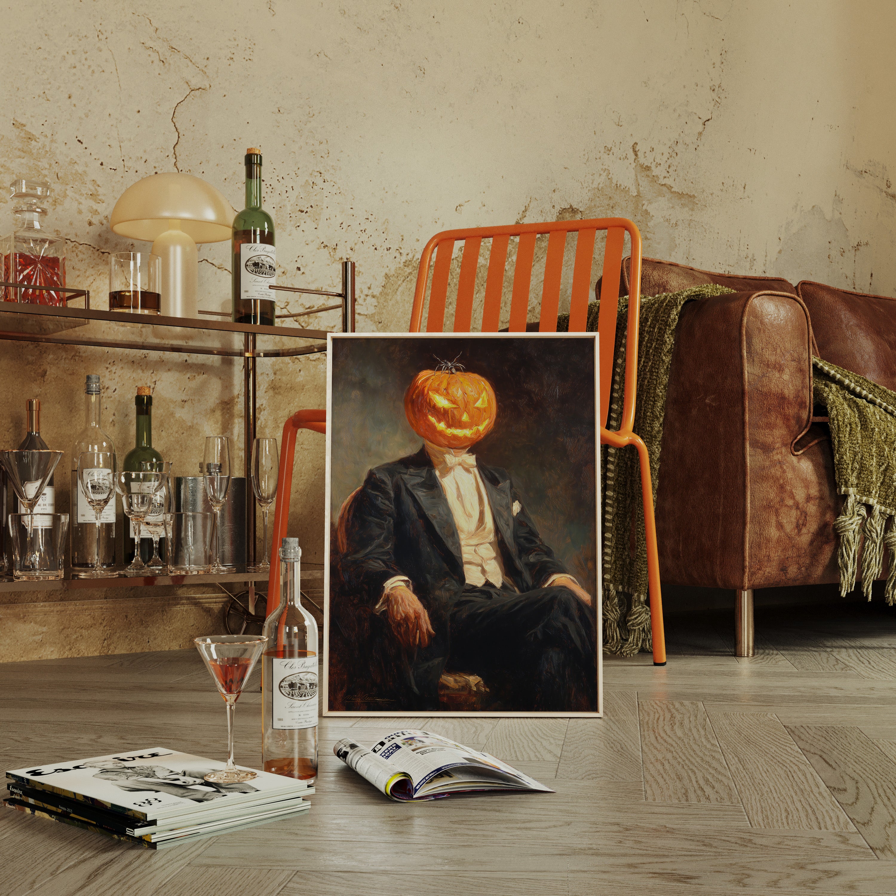In a curious blend of elegance and whimsy, a figure sits, his head replaced by a carved pumpkin, radiating a glow that dances with mischief. This piece captures the contemporary spirit of reimagined identities, where tradition meets the playful essence of Halloween. The striking contrast of the formal suit against the vibrant orange of the pumpkin evokes a sense of both celebration and intrigue, inviting viewers to ponder the balance of sophistication and festivity. Ideal for a modern living room or a playful entryway, this piece sparks conversation and adds a touch of unique charm to your space.