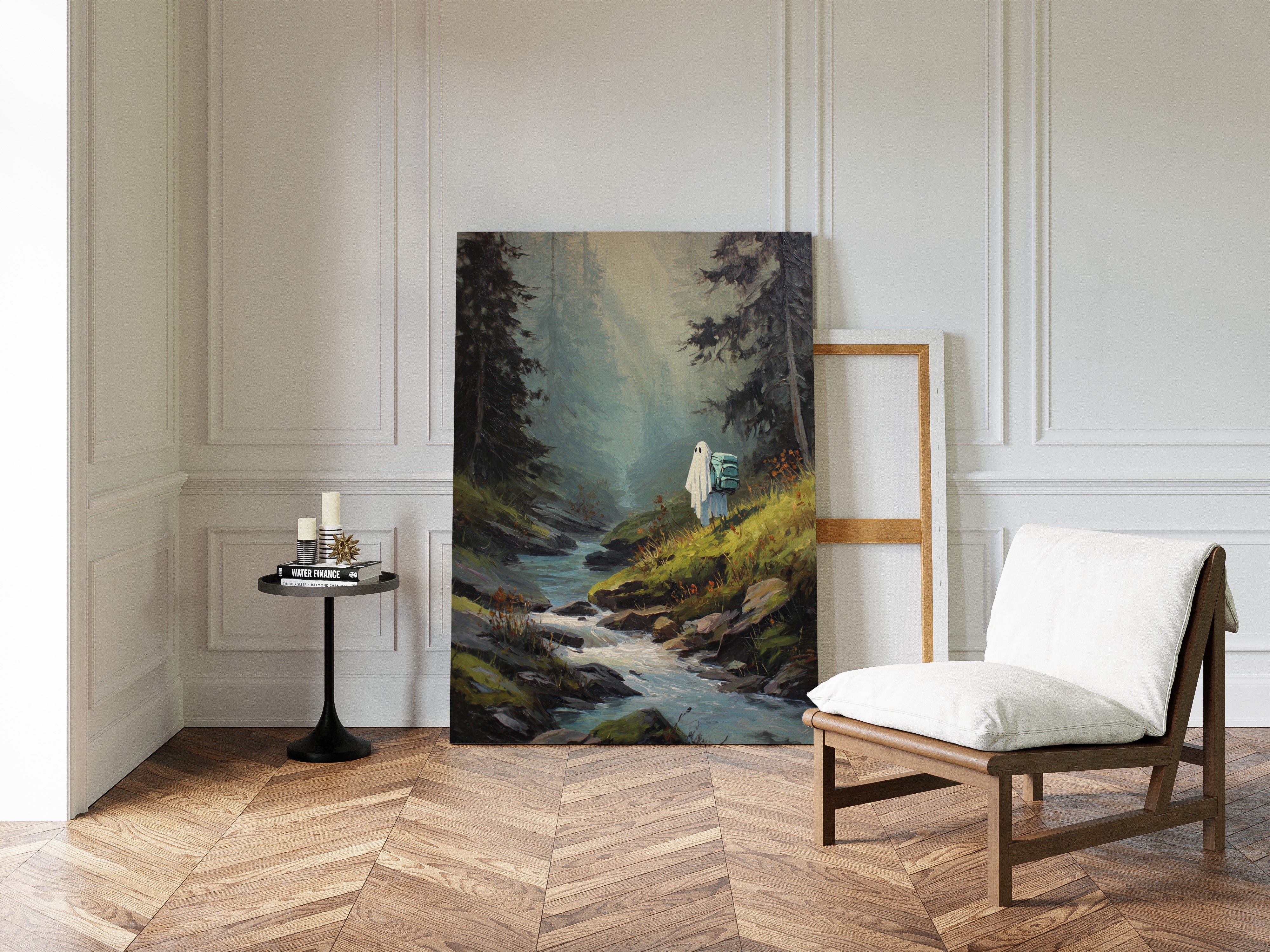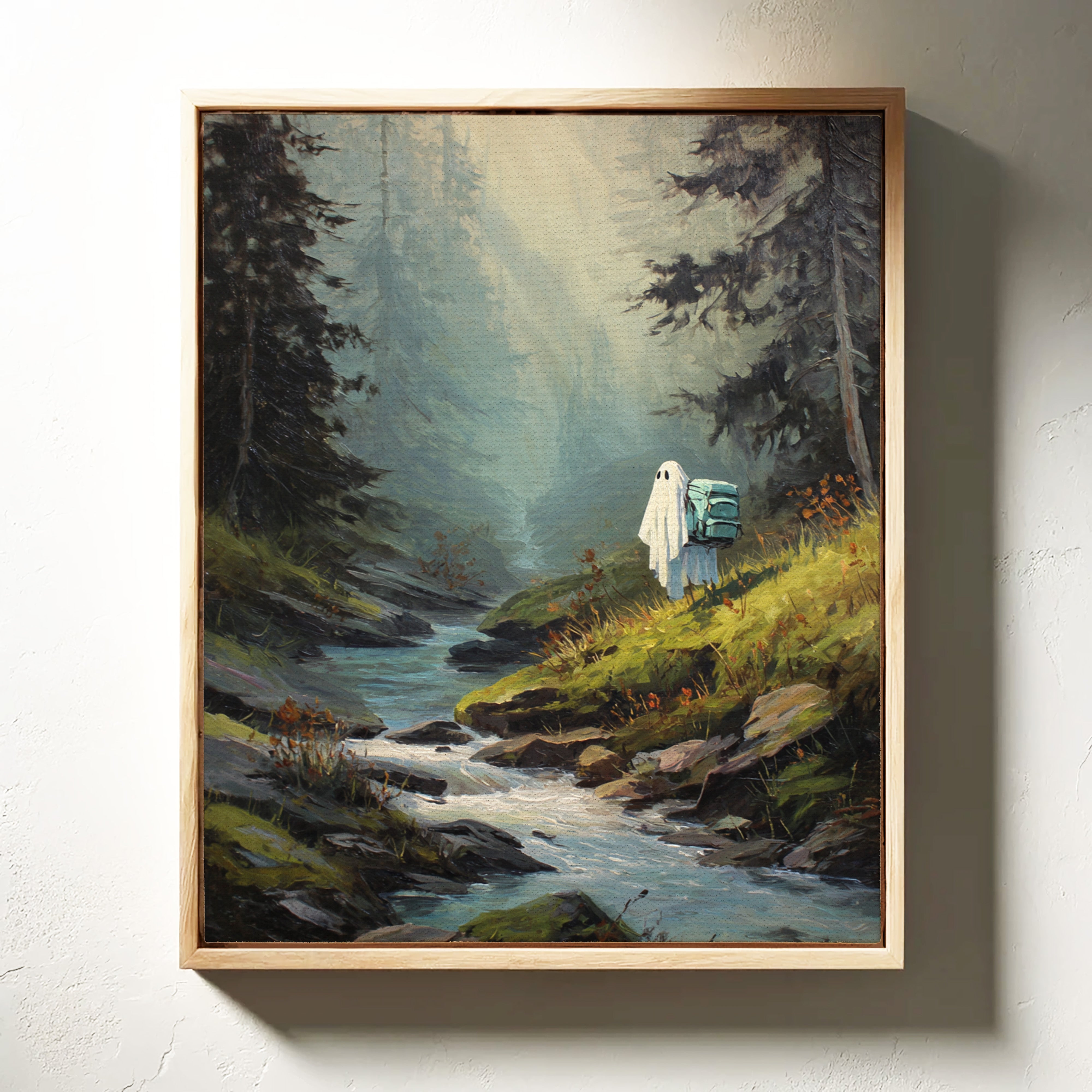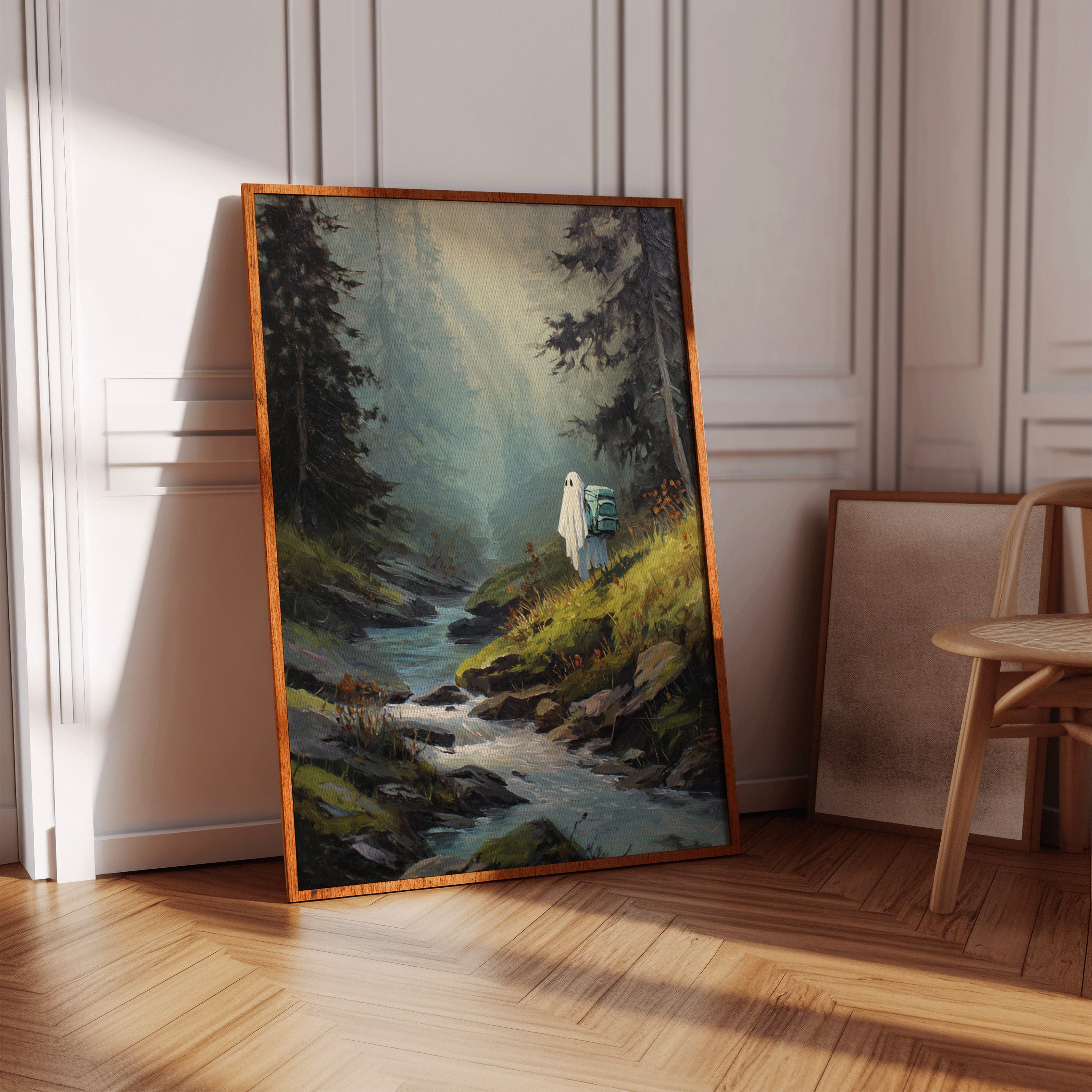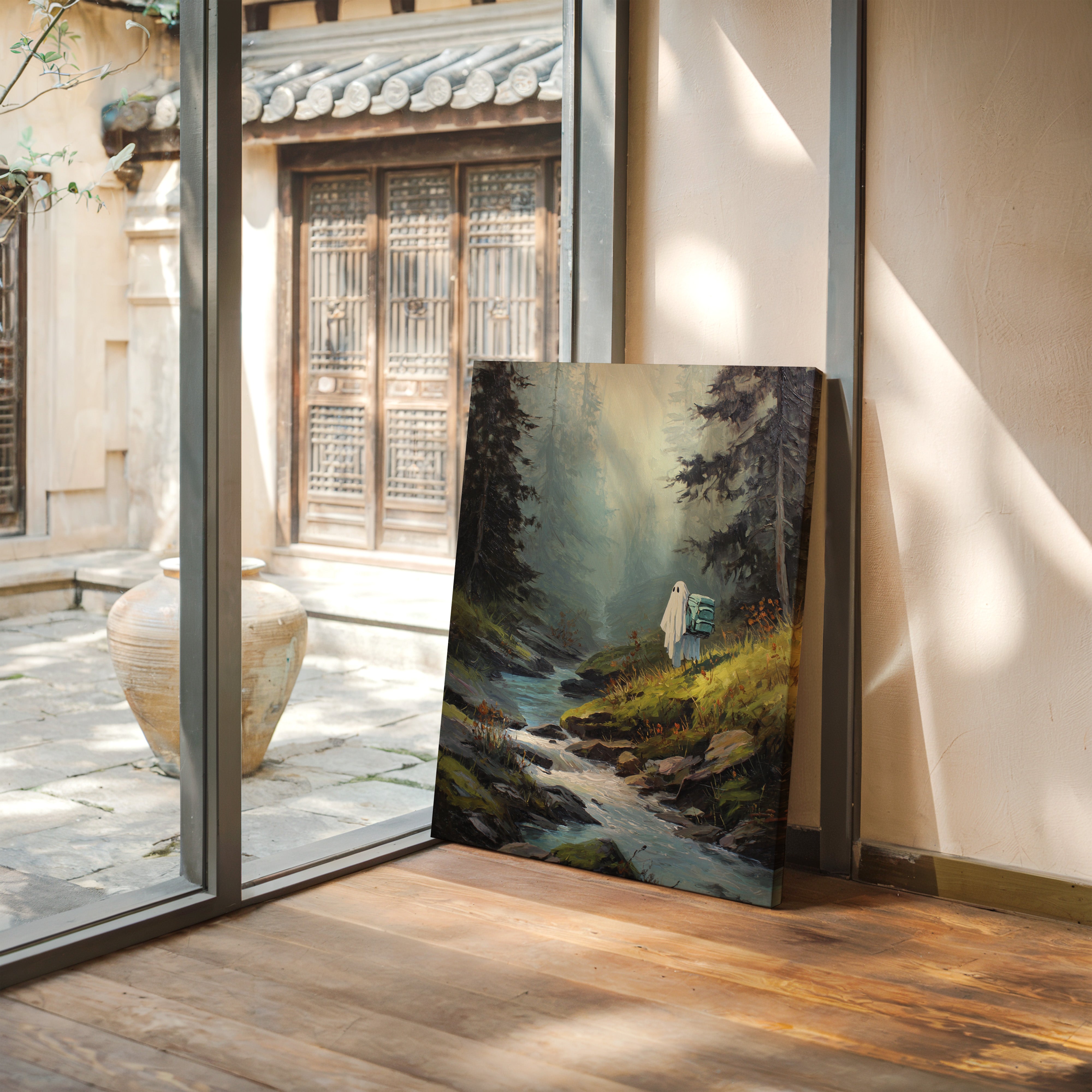 Amidst towering trees, a figure draped in white stands at the water's edge, heart heavy with stories untold. This piece captures the essence of exploration within the Artisanal collection. The soft hues of green and blue meld seamlessly, evoking a sense of solitude and connection to nature's embrace. Each brushstroke invites the viewer to wander along hidden paths, where every rock and ripple holds a memory waiting to be discovered. Perfect for a cozy reading nook or a serene corner of your home, this artwork inspires introspection and adventure.