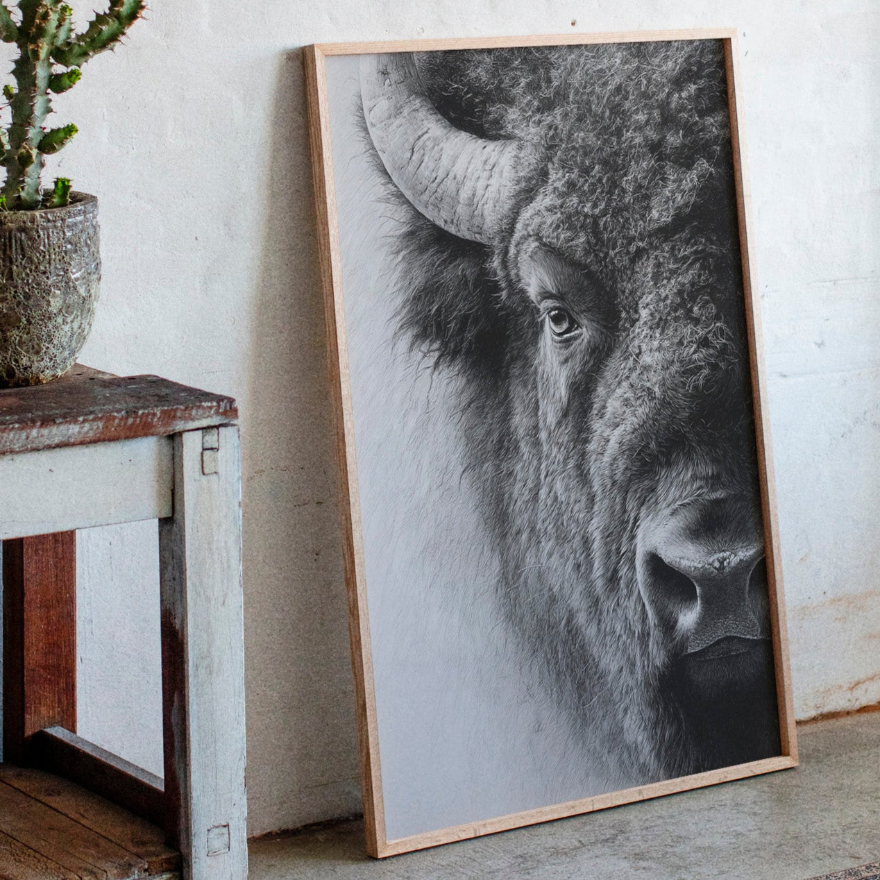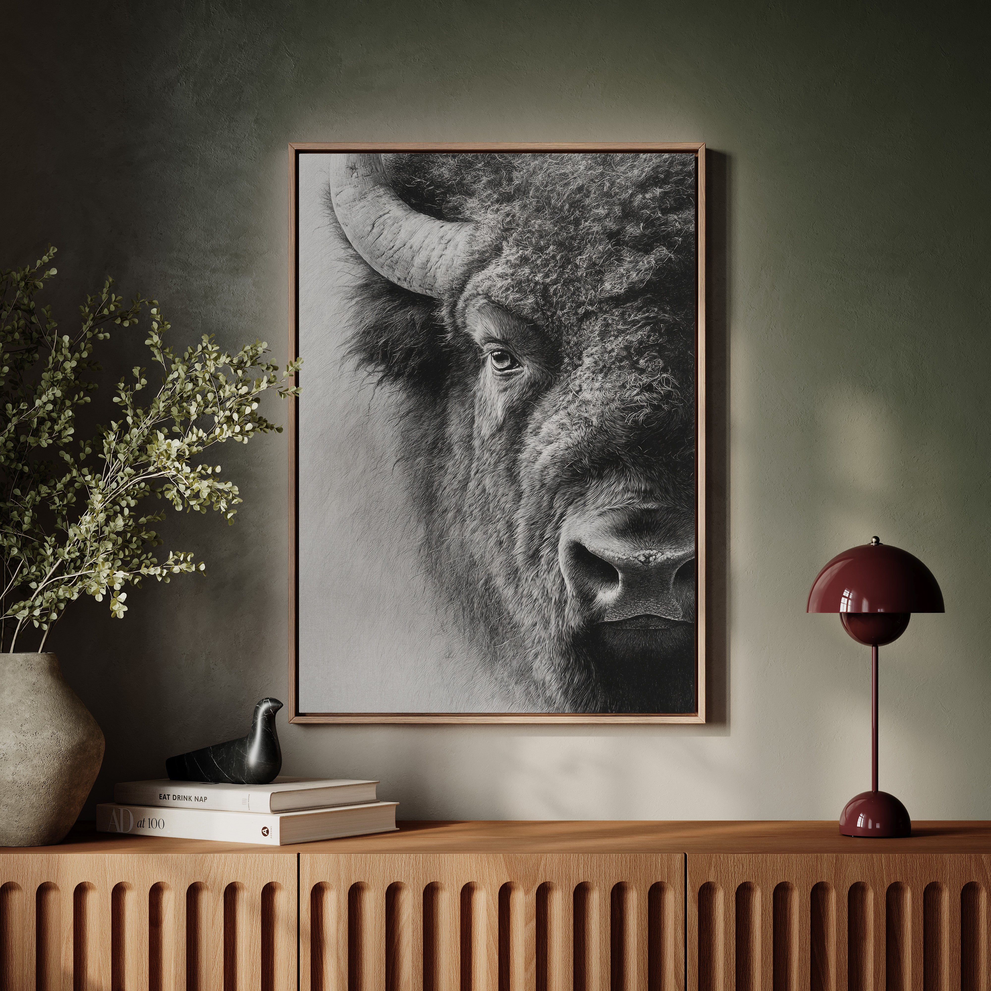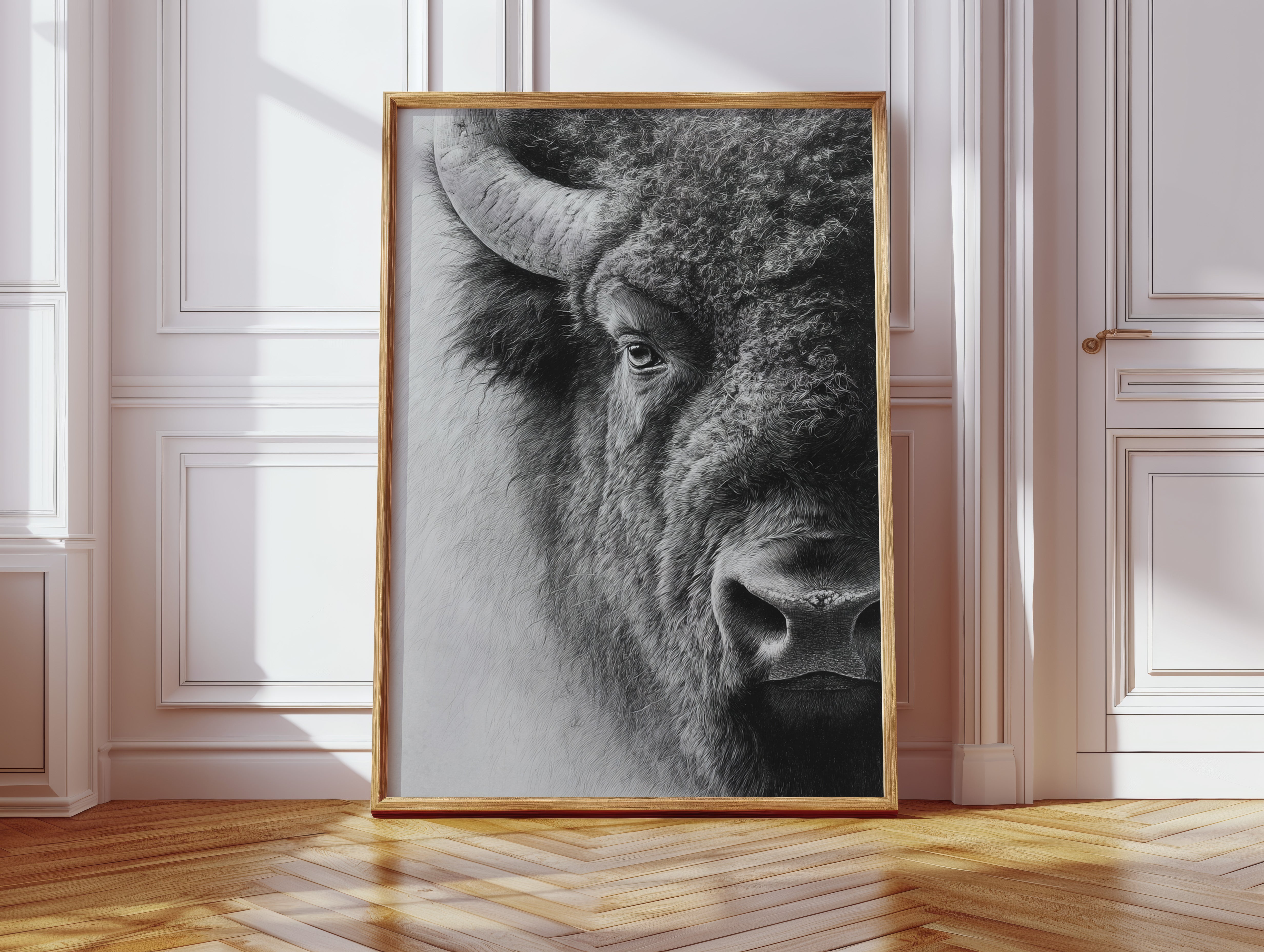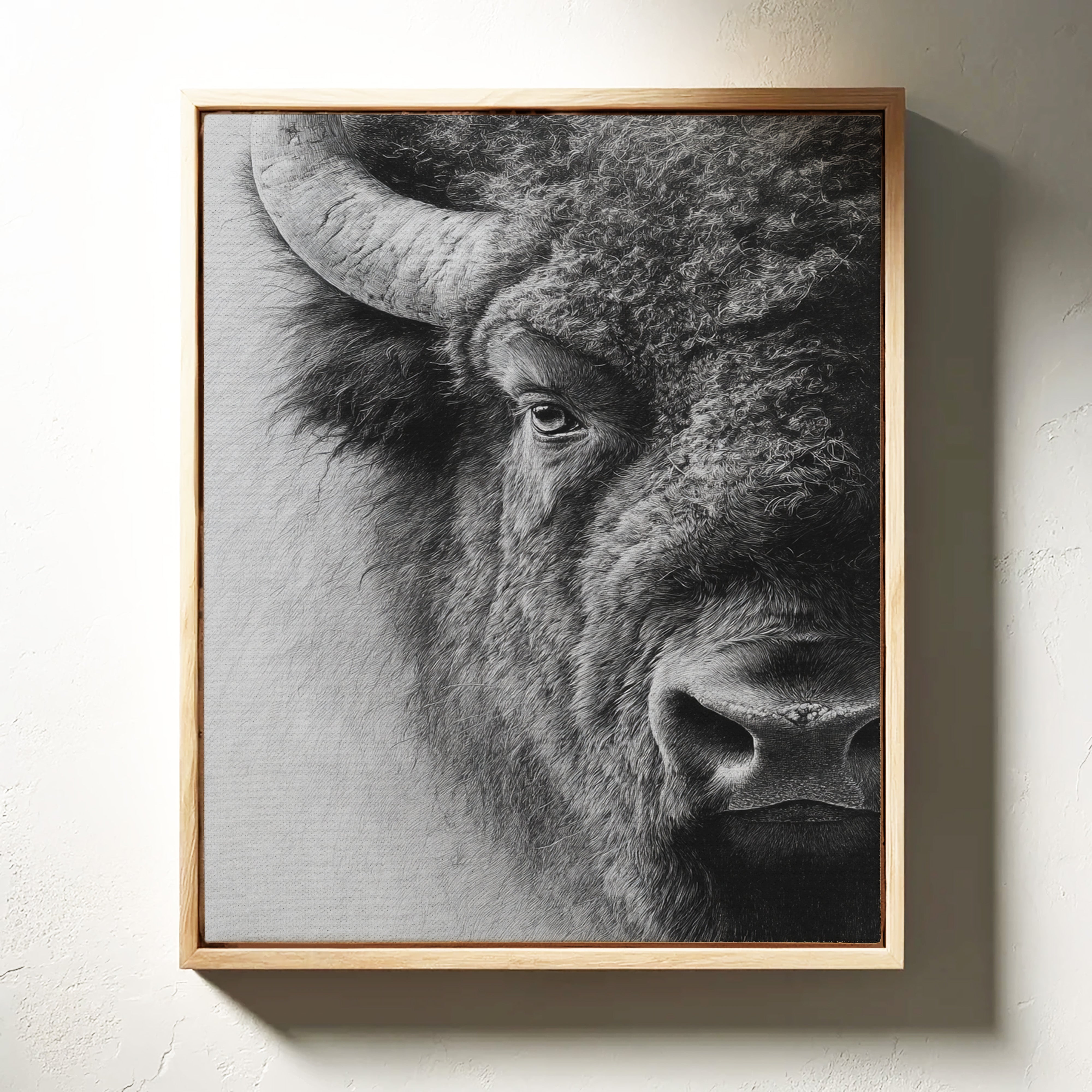 In the stillness of a moment, the gaze of a bison envelops you, a reminder of ancient wisdom and the rugged beauty of the wild. This piece embodies the artisanal spirit, intertwining nature's raw power with exquisite craftsmanship. Each stroke reveals the intricate textures of the bison's fur and the depth of its soulful eye, inviting viewers to connect with the spirit of the land and its guardians. Perfect for a study or living space that craves a touch of the wild and a sense of grounded elegance.