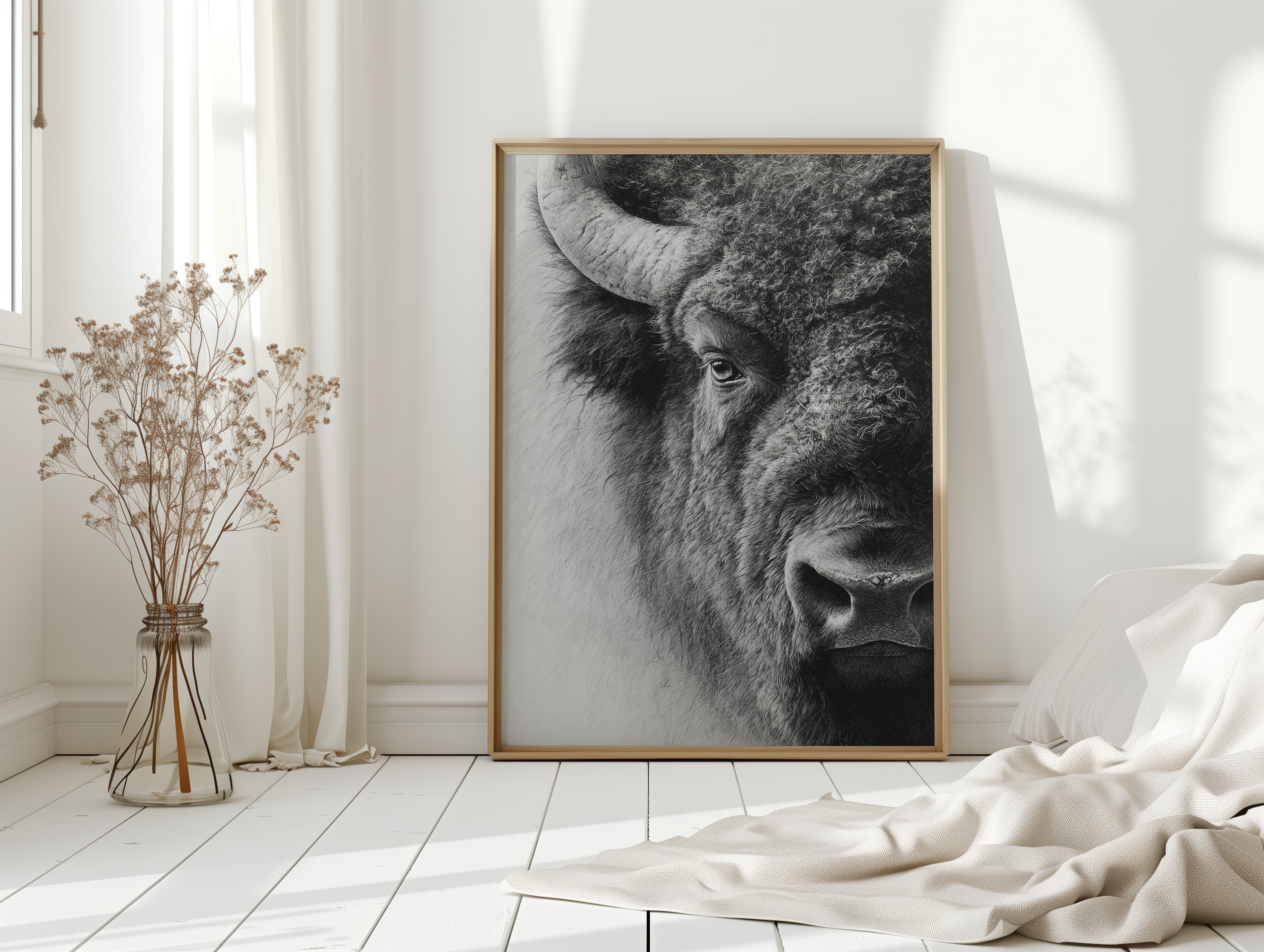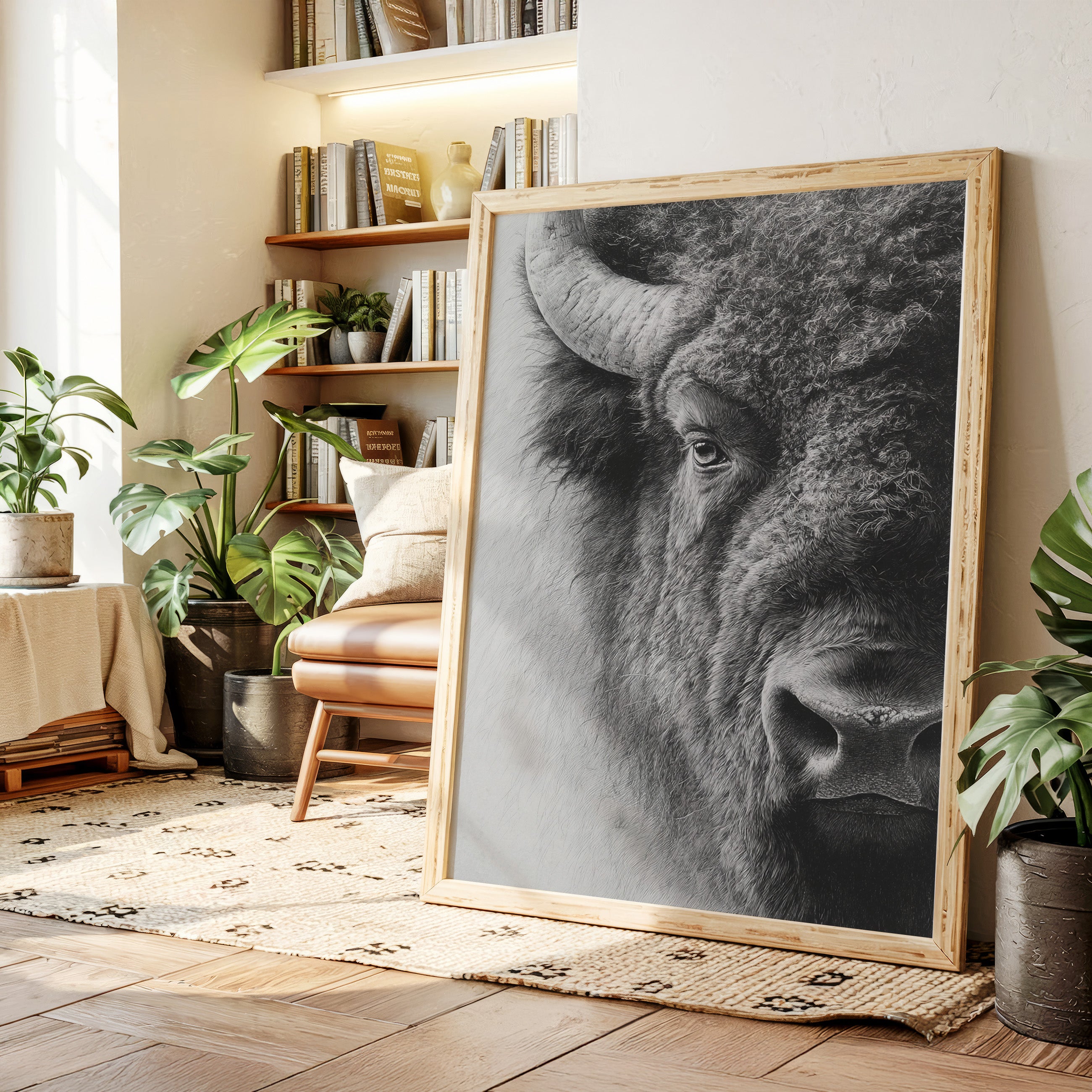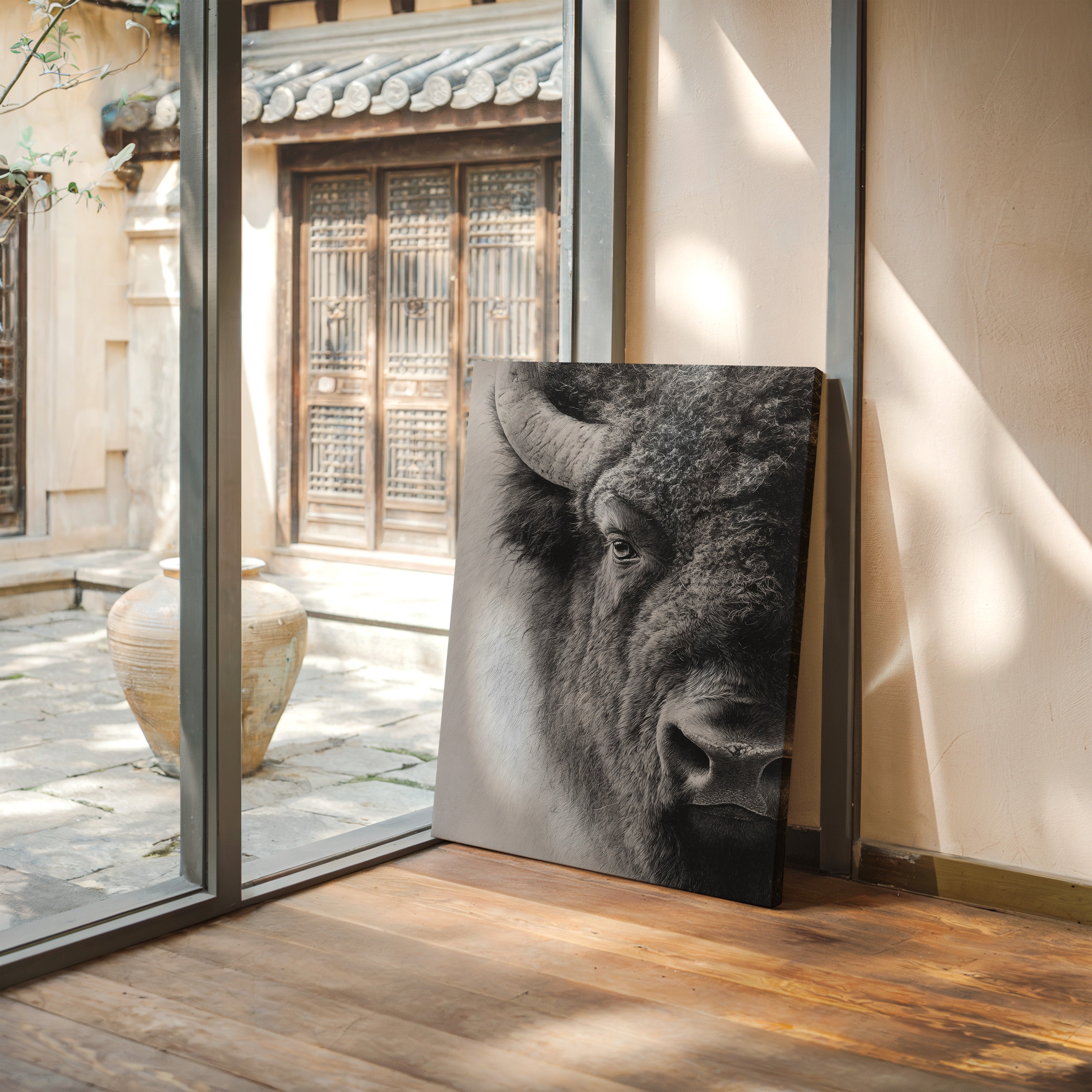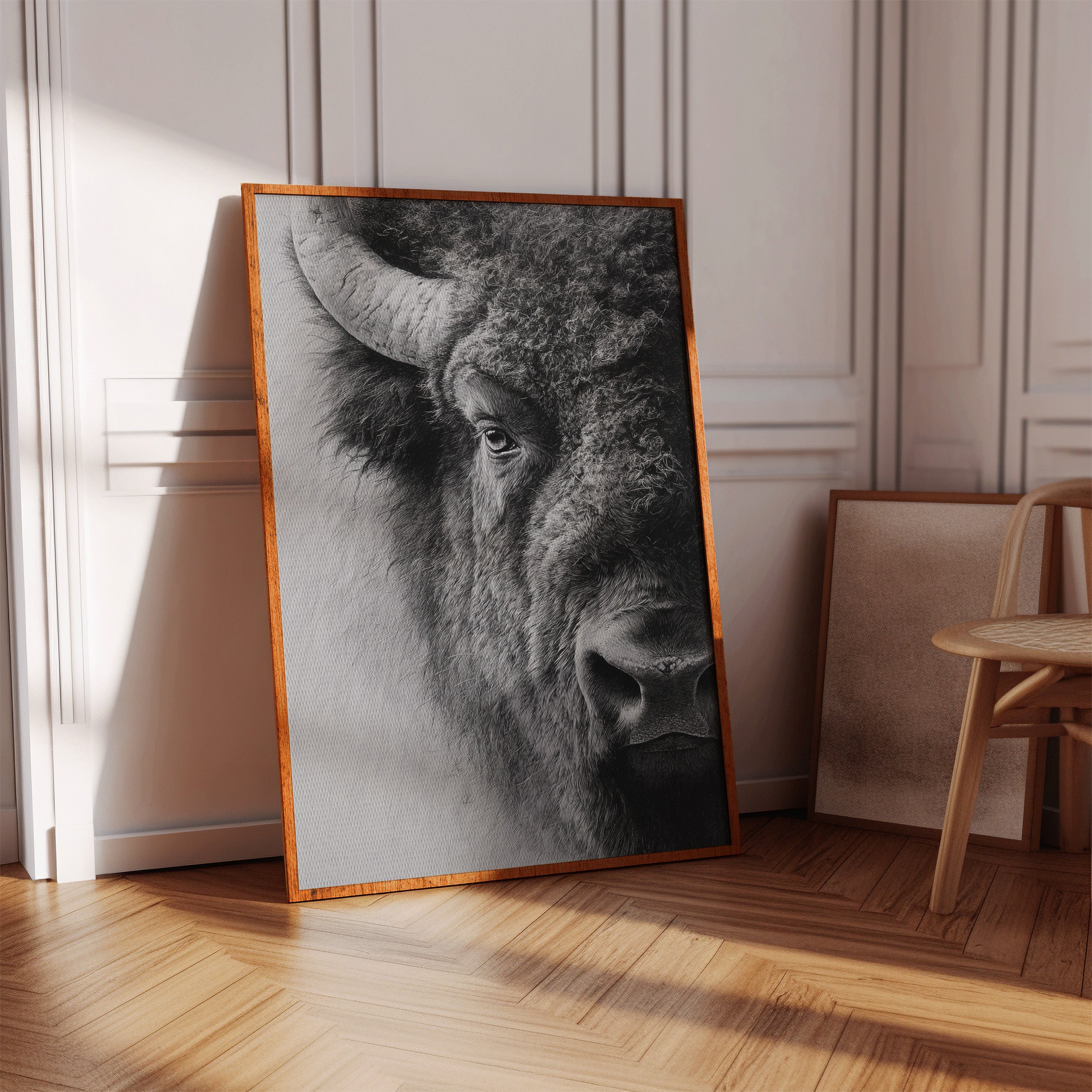 In the stillness of a moment, the gaze of a bison envelops you, a reminder of ancient wisdom and the rugged beauty of the wild. This piece embodies the artisanal spirit, intertwining nature's raw power with exquisite craftsmanship. Each stroke reveals the intricate textures of the bison's fur and the depth of its soulful eye, inviting viewers to connect with the spirit of the land and its guardians. Perfect for a study or living space that craves a touch of the wild and a sense of grounded elegance.