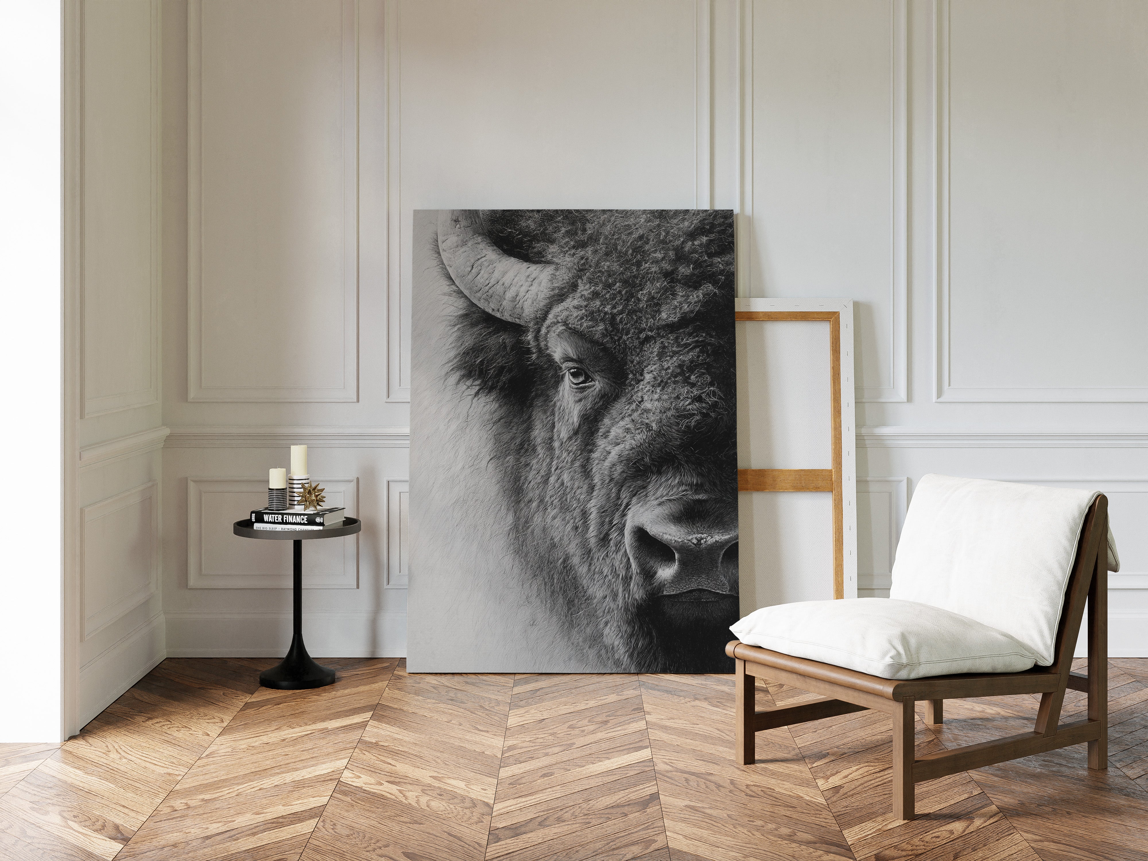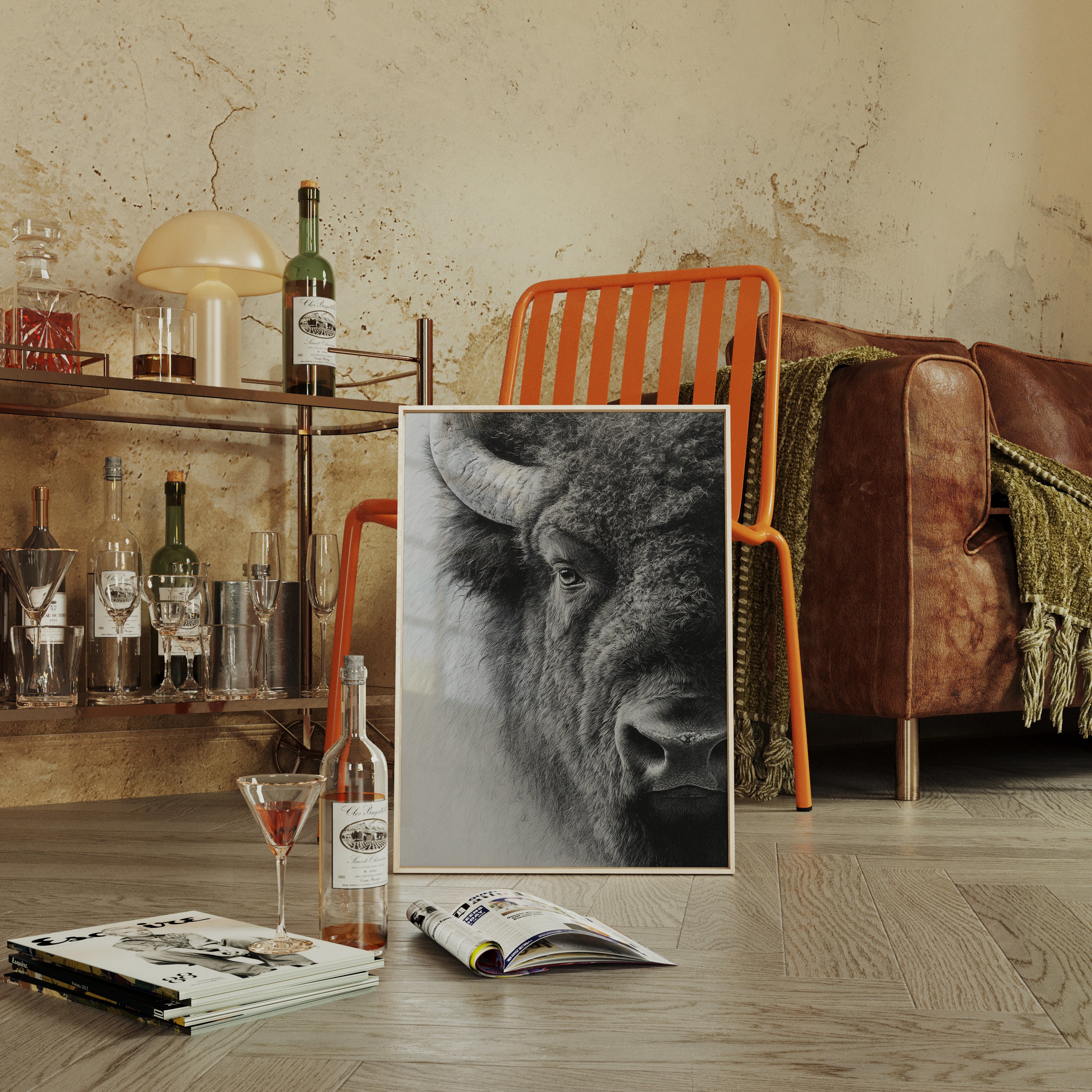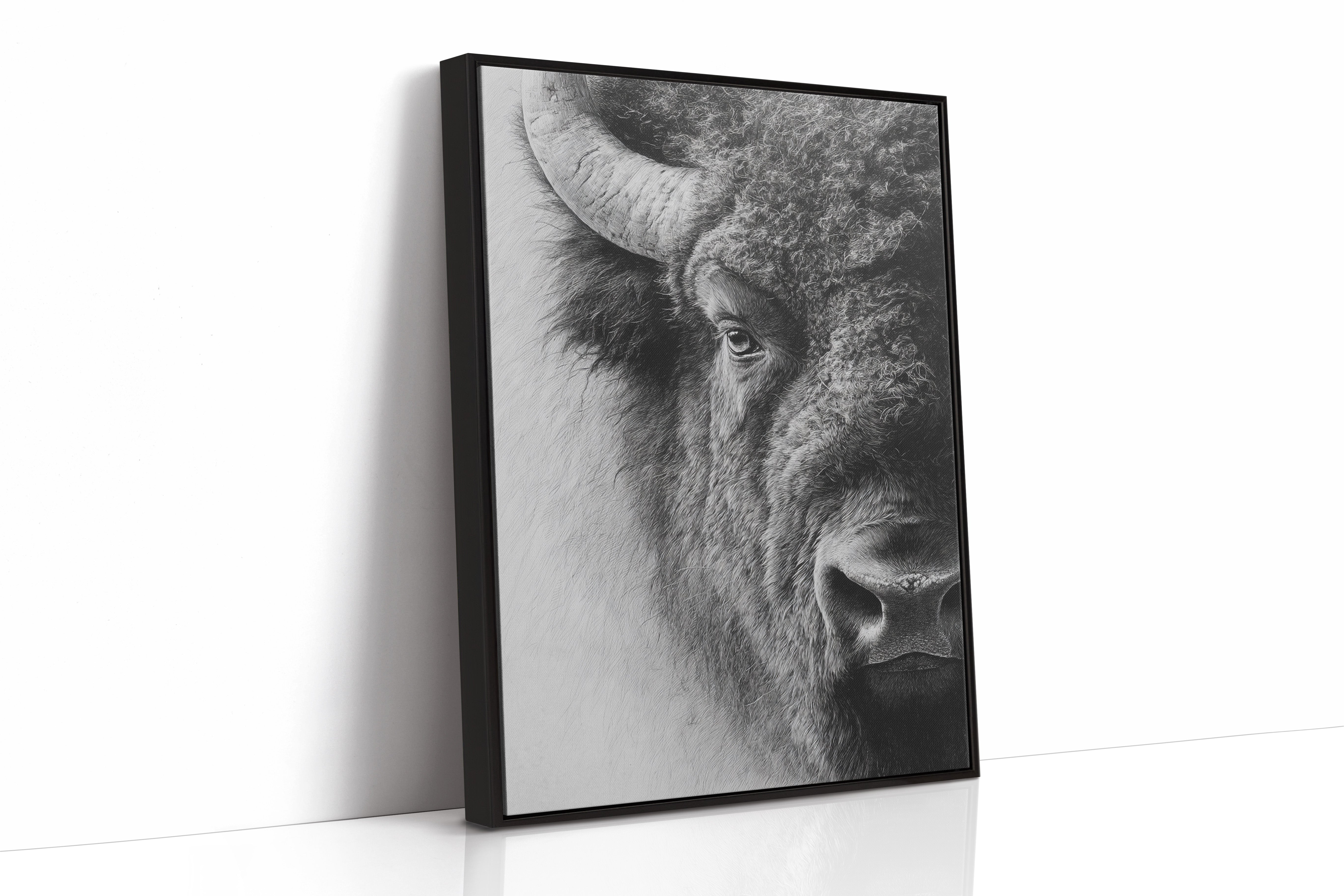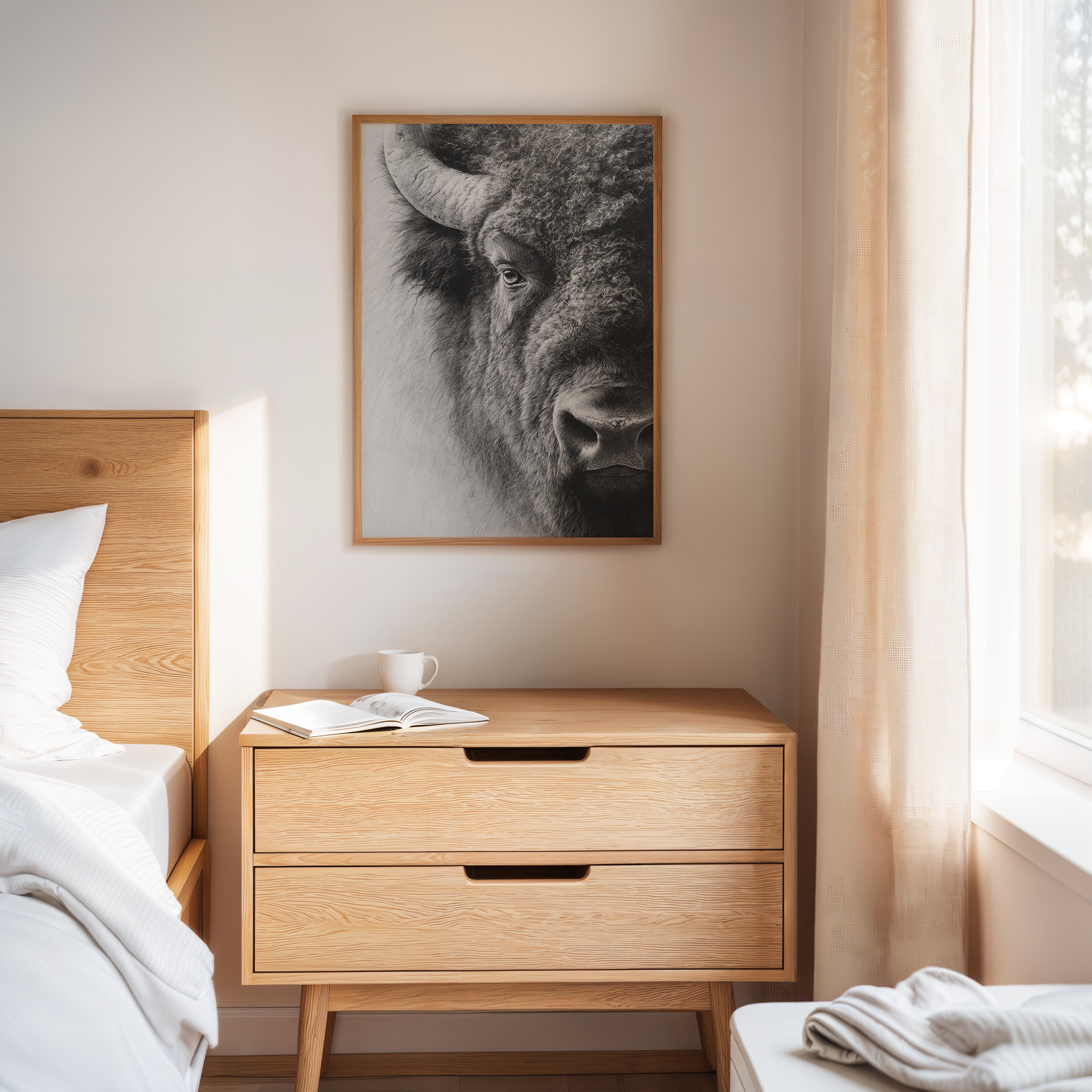 In the stillness of a moment, the gaze of a bison envelops you, a reminder of ancient wisdom and the rugged beauty of the wild. This piece embodies the artisanal spirit, intertwining nature's raw power with exquisite craftsmanship. Each stroke reveals the intricate textures of the bison's fur and the depth of its soulful eye, inviting viewers to connect with the spirit of the land and its guardians. Perfect for a study or living space that craves a touch of the wild and a sense of grounded elegance.