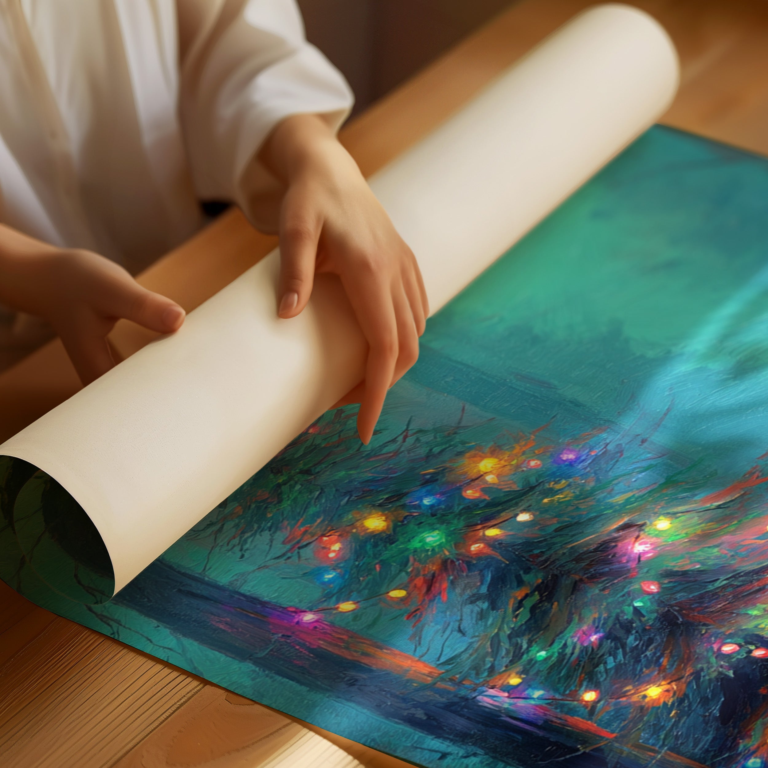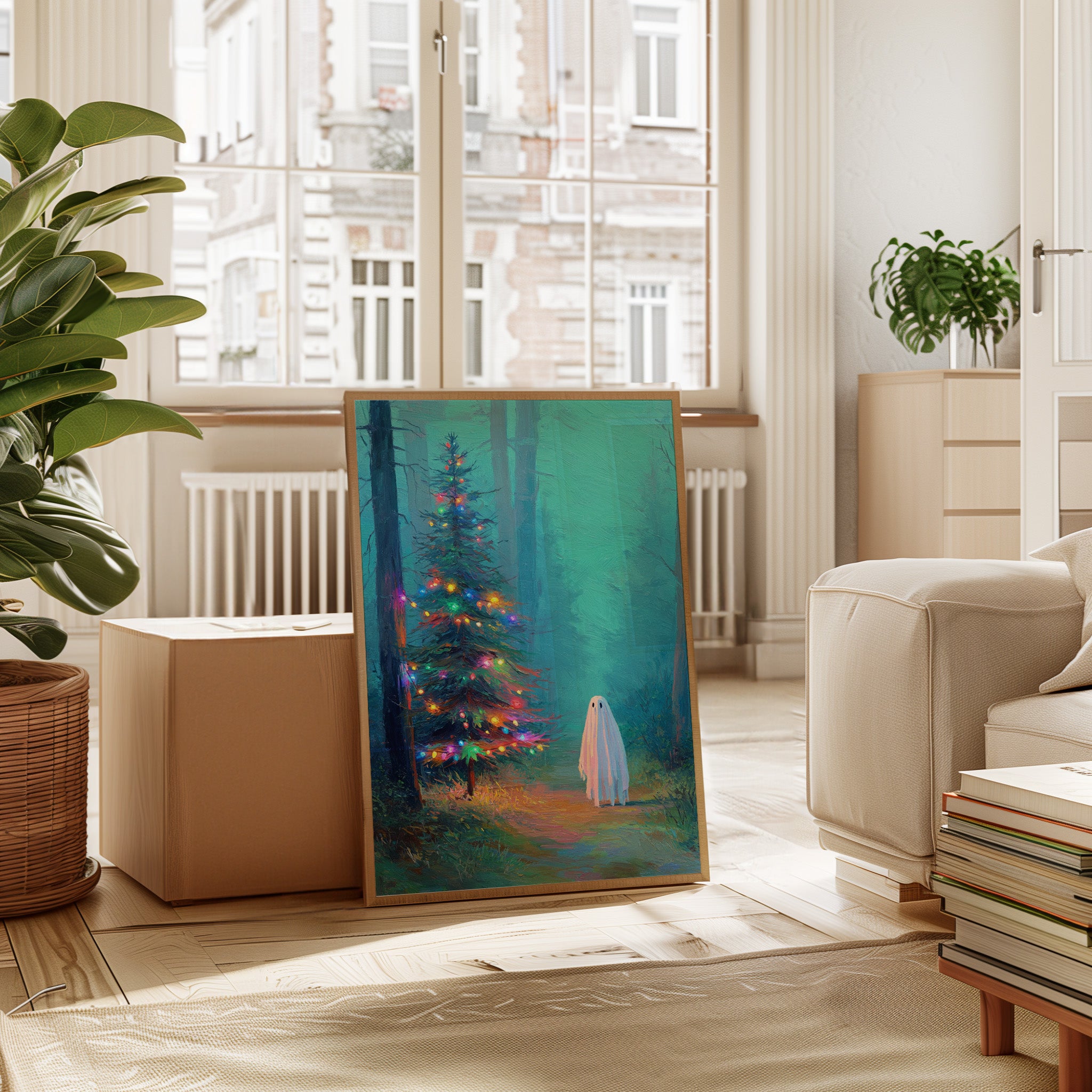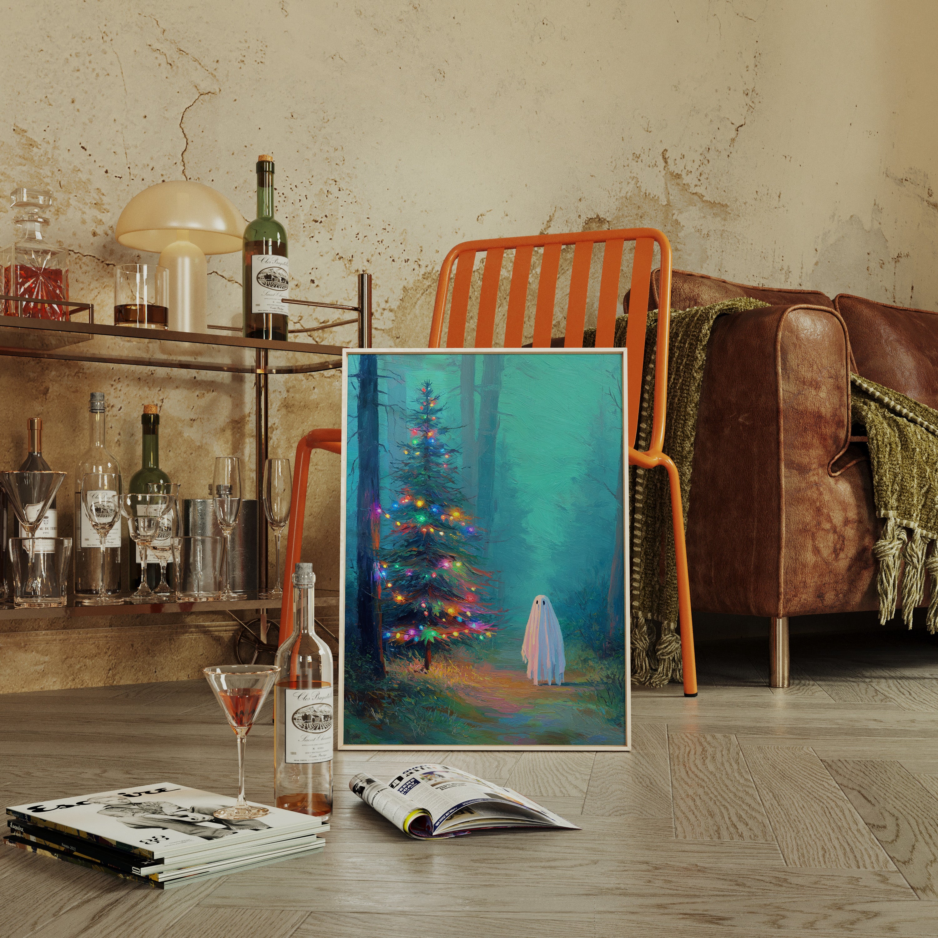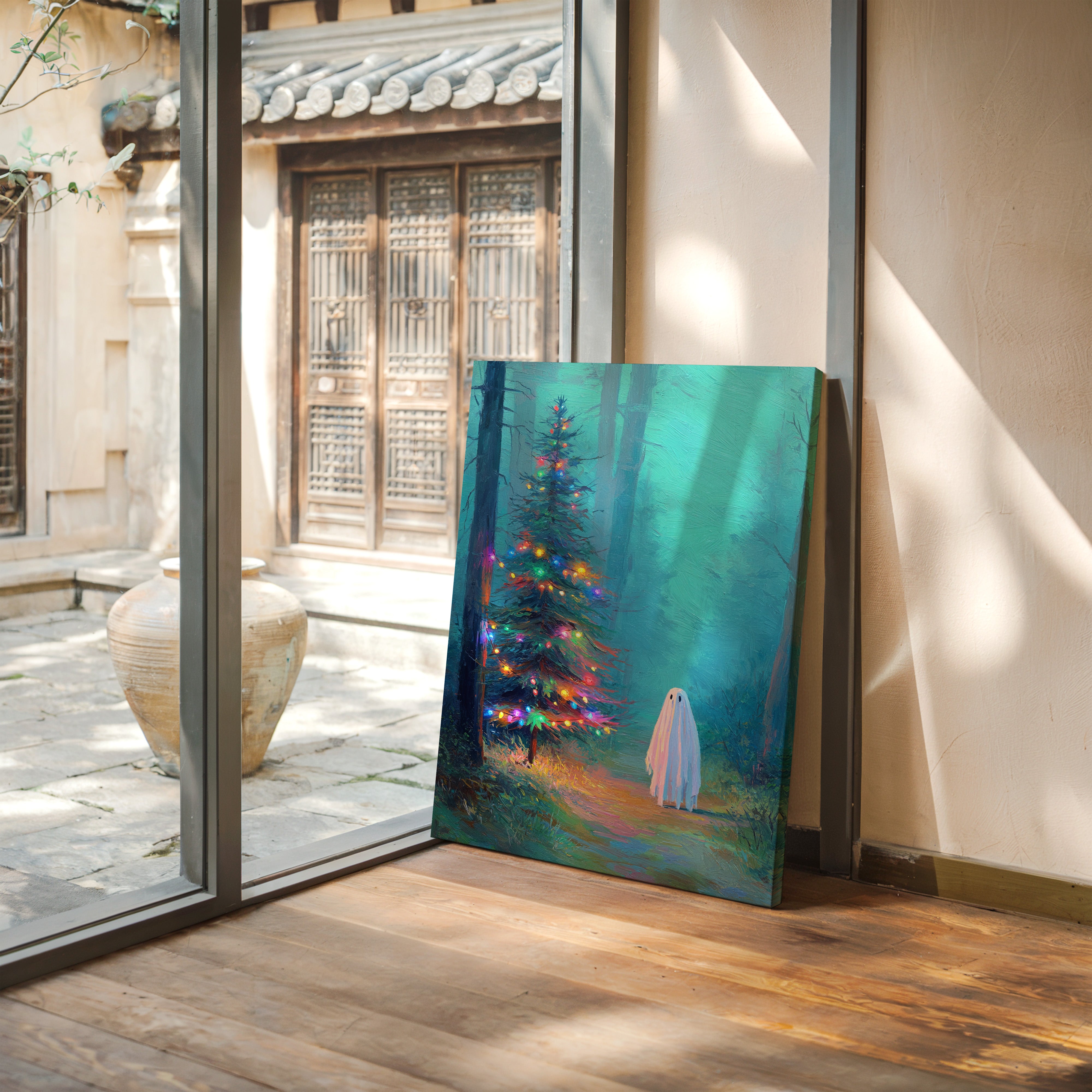 In a serene woodland, a gentle figure draped in white gazes at a brightly adorned tree, its lights flickering like distant stars. This piece captures the enchanting blend of whimsy and nostalgia inherent in the Artisanal collection. The cool hues of the forest contrast beautifully with the vibrant colors of the decorations, evoking a sense of wonder and warmth. Ideal for a cozy living room or a playful children's space, this scene invites viewers to embrace the magic of the season.