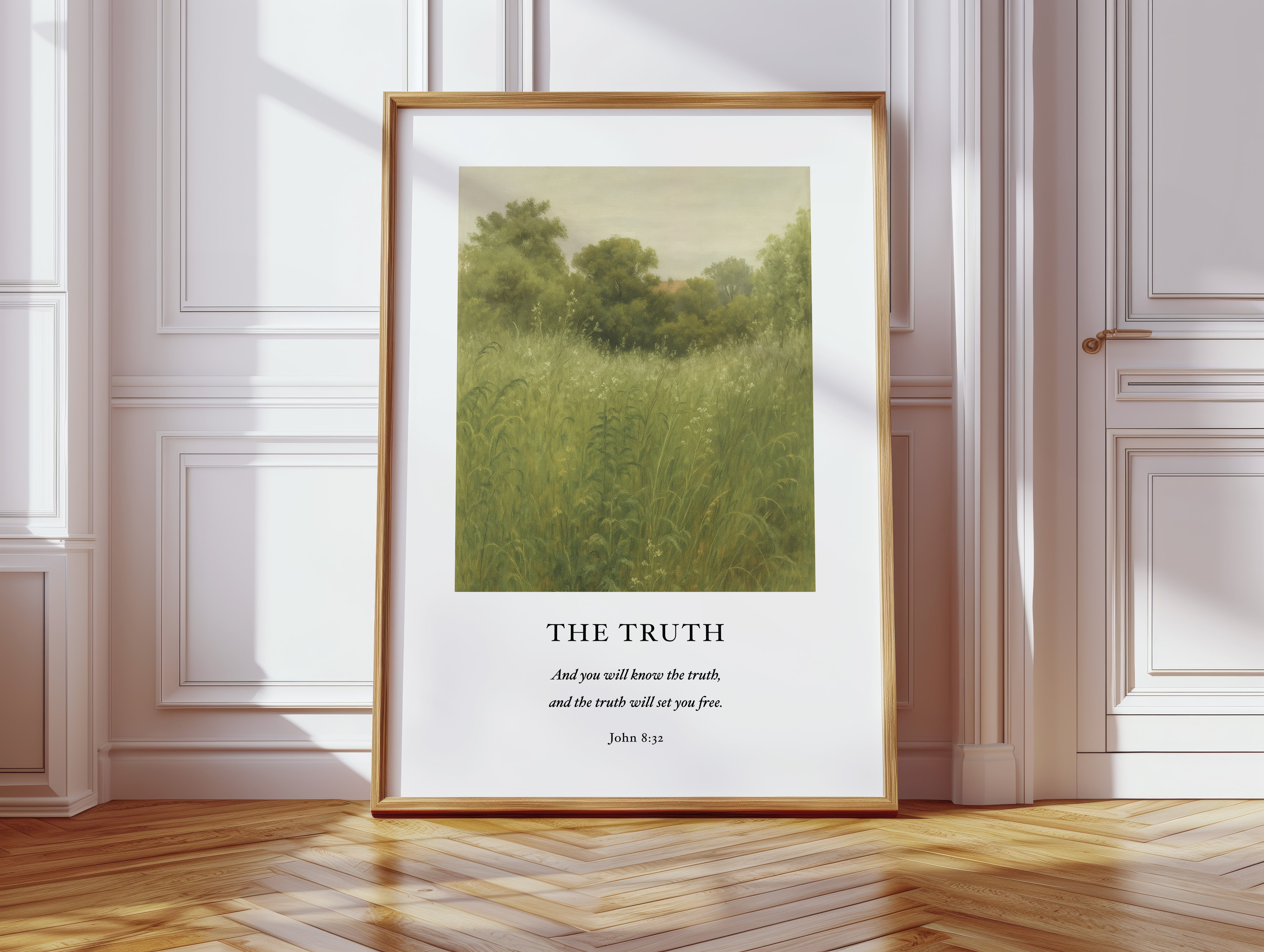 Soft morning light spills over a wild meadow in this serene painting inspired by John 8:32—inviting reflection on freedom, truth, and peace through divine revelation.