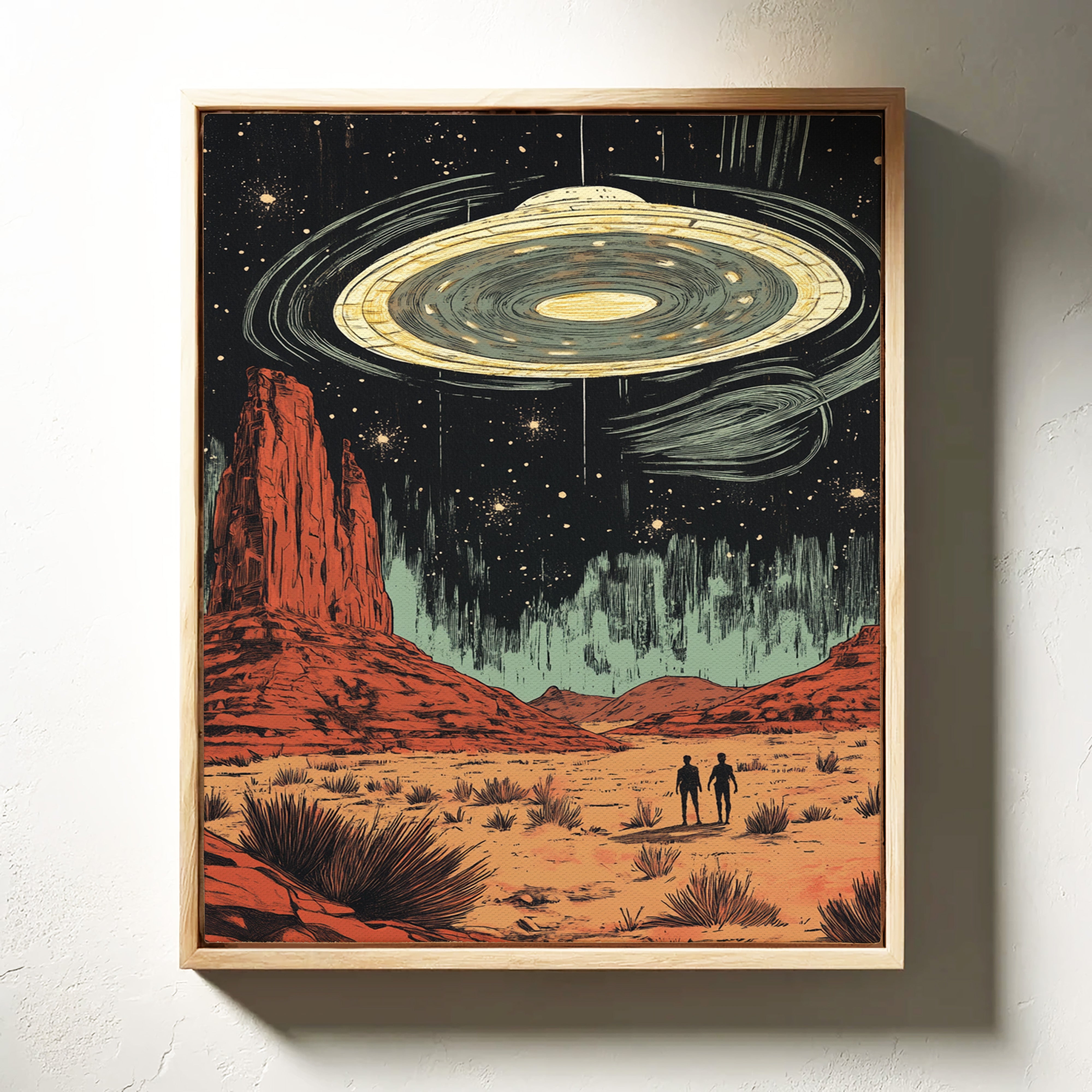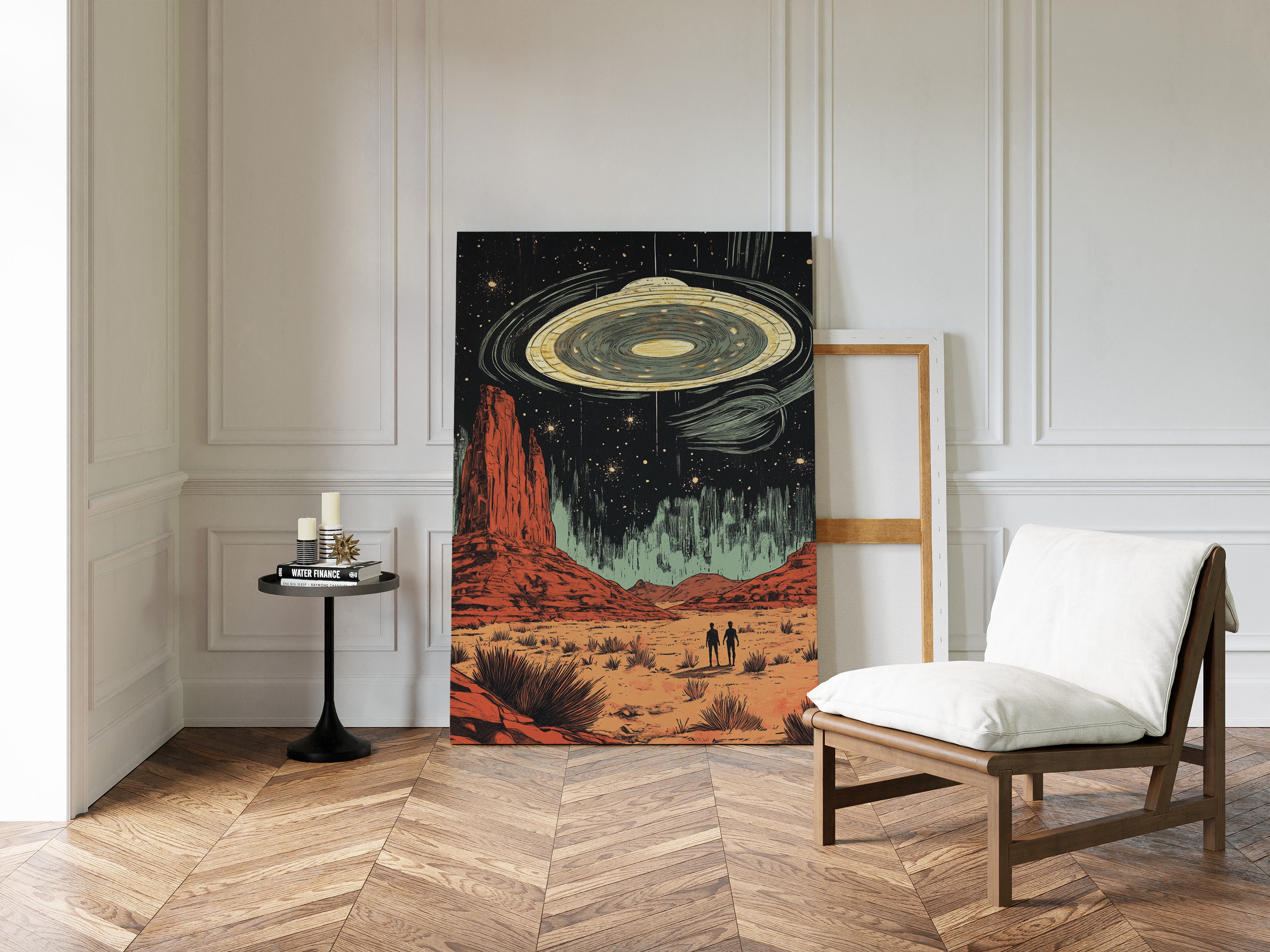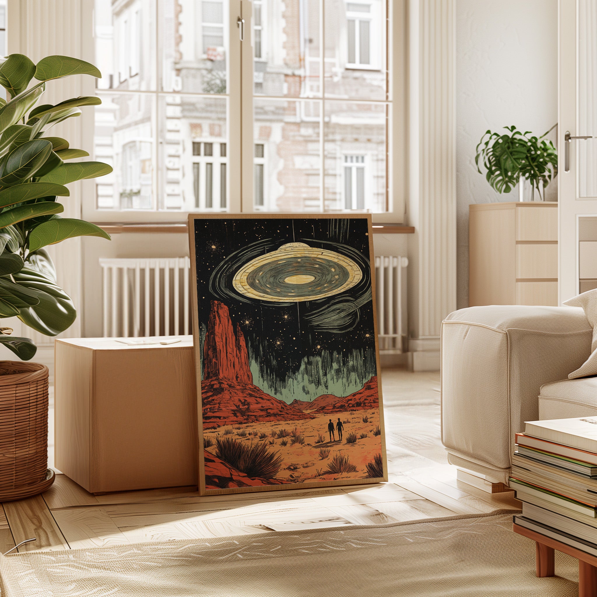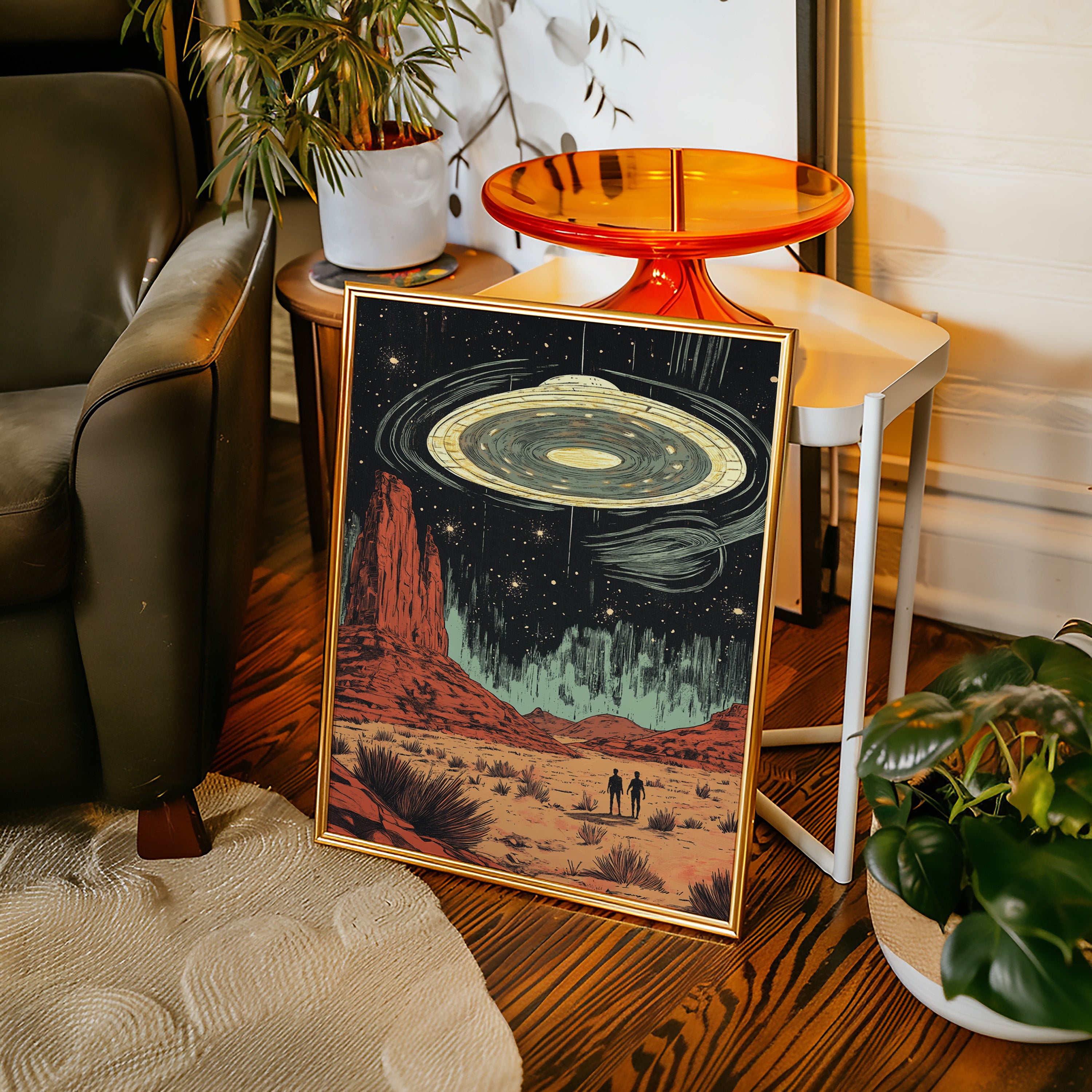 Two figures cross a desolate red canyon as a massive UFO hovers above, distorting the night sky in a swirl of stars and mystery. Retro sci-fi meets desert surrealism.
