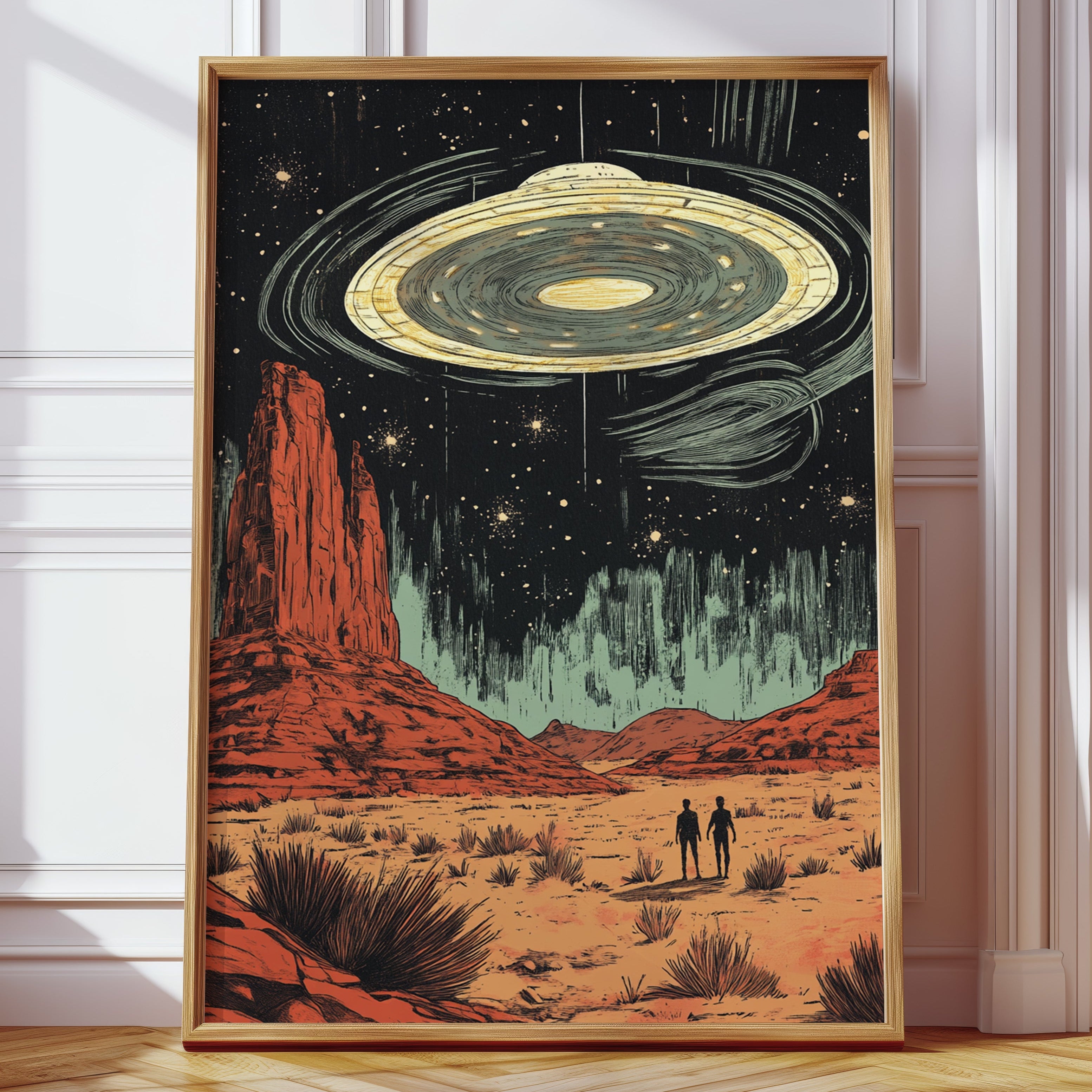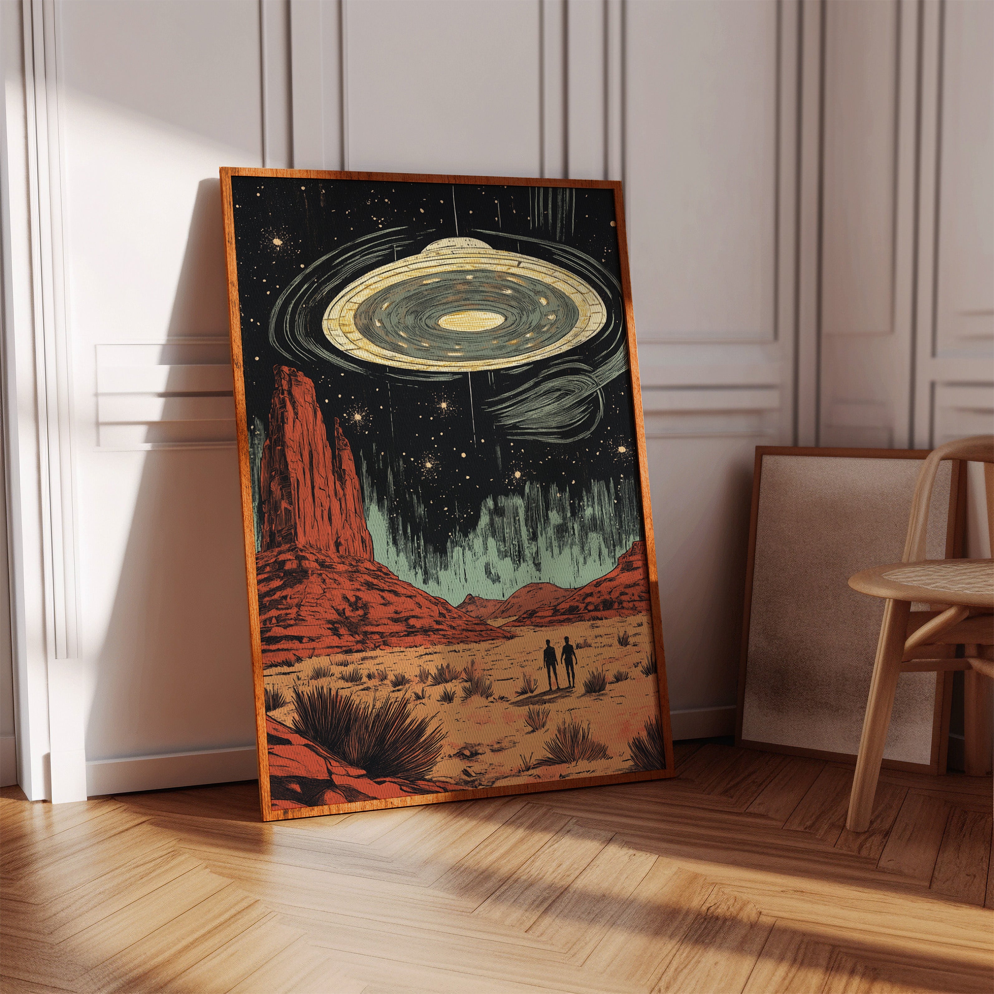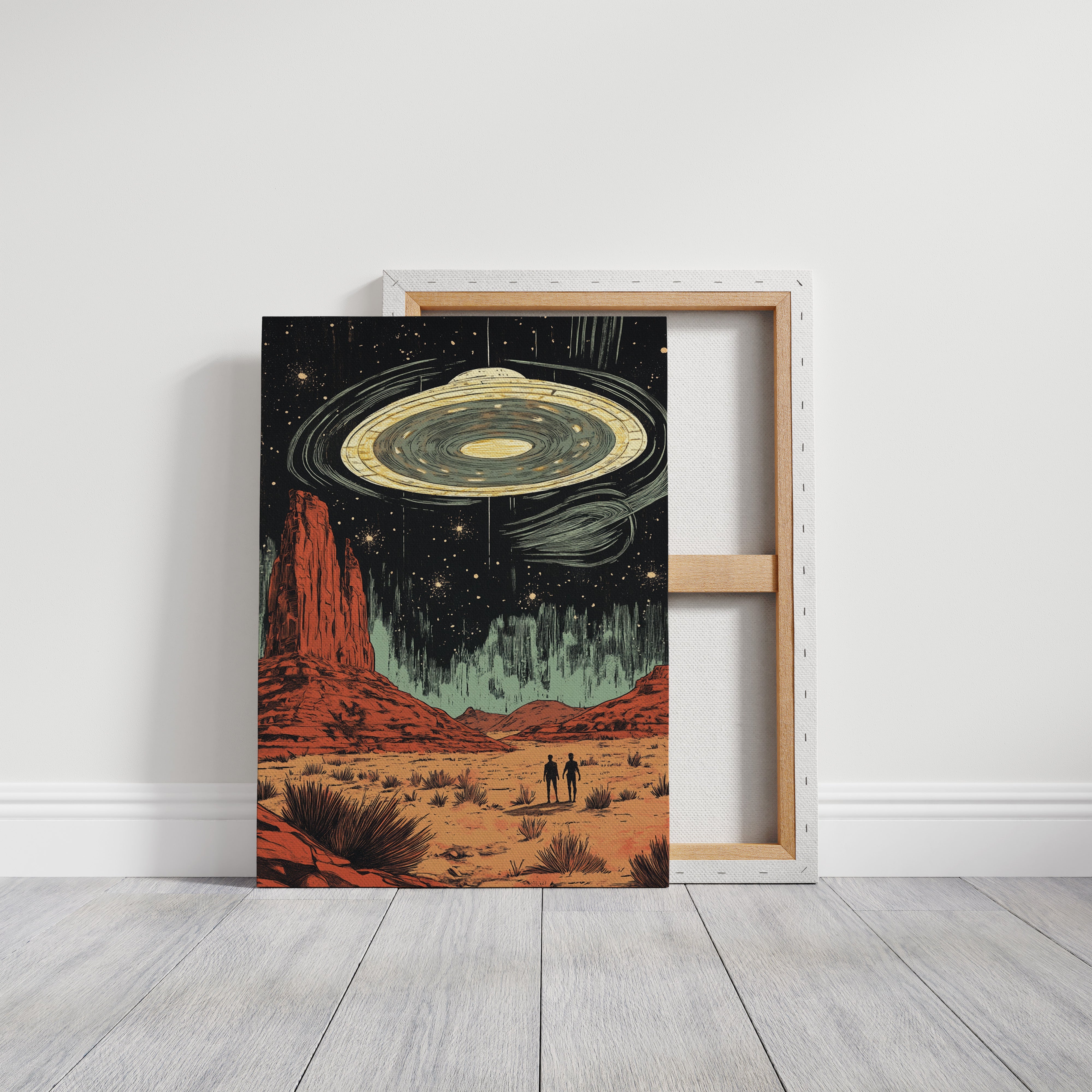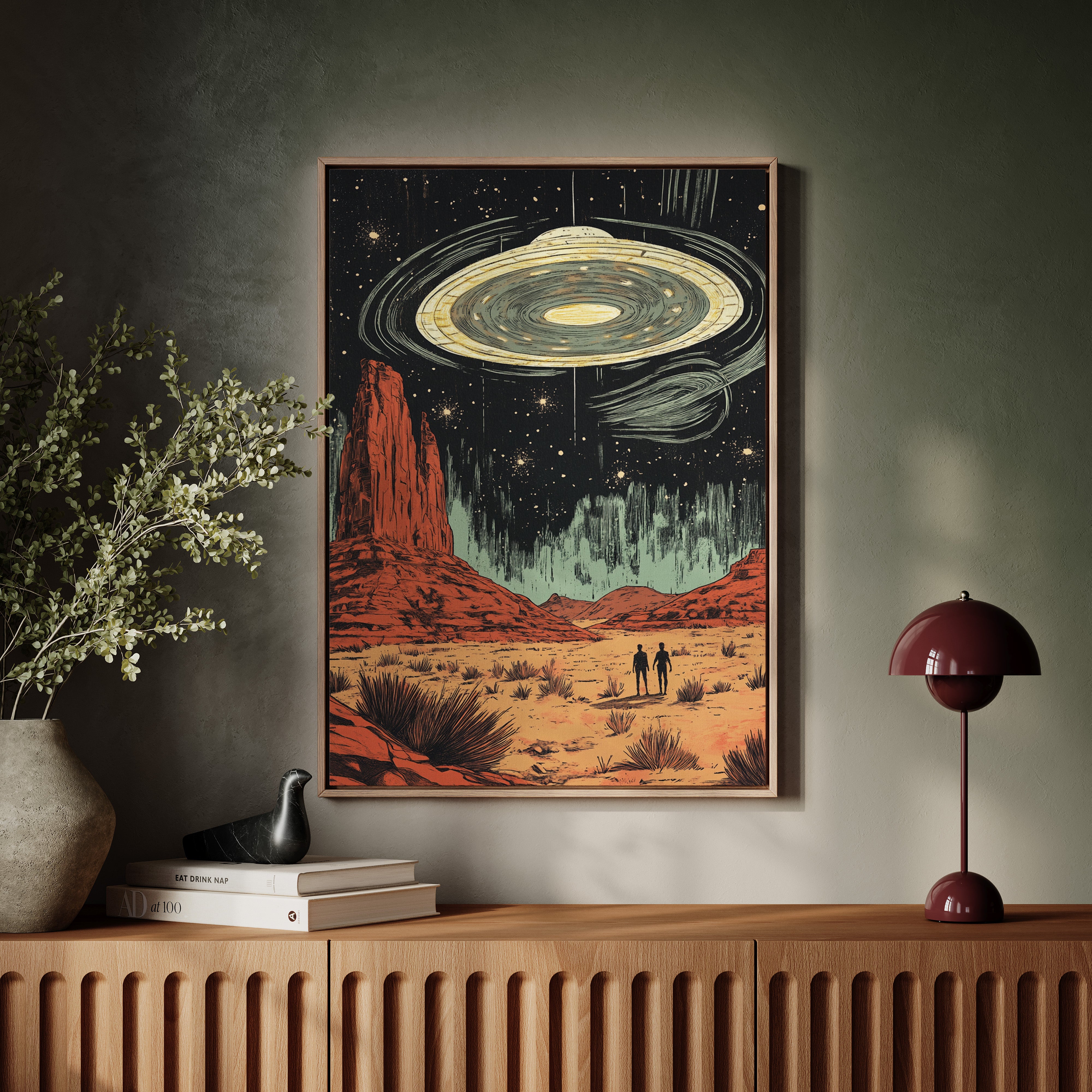 Two figures cross a desolate red canyon as a massive UFO hovers above, distorting the night sky in a swirl of stars and mystery. Retro sci-fi meets desert surrealism.