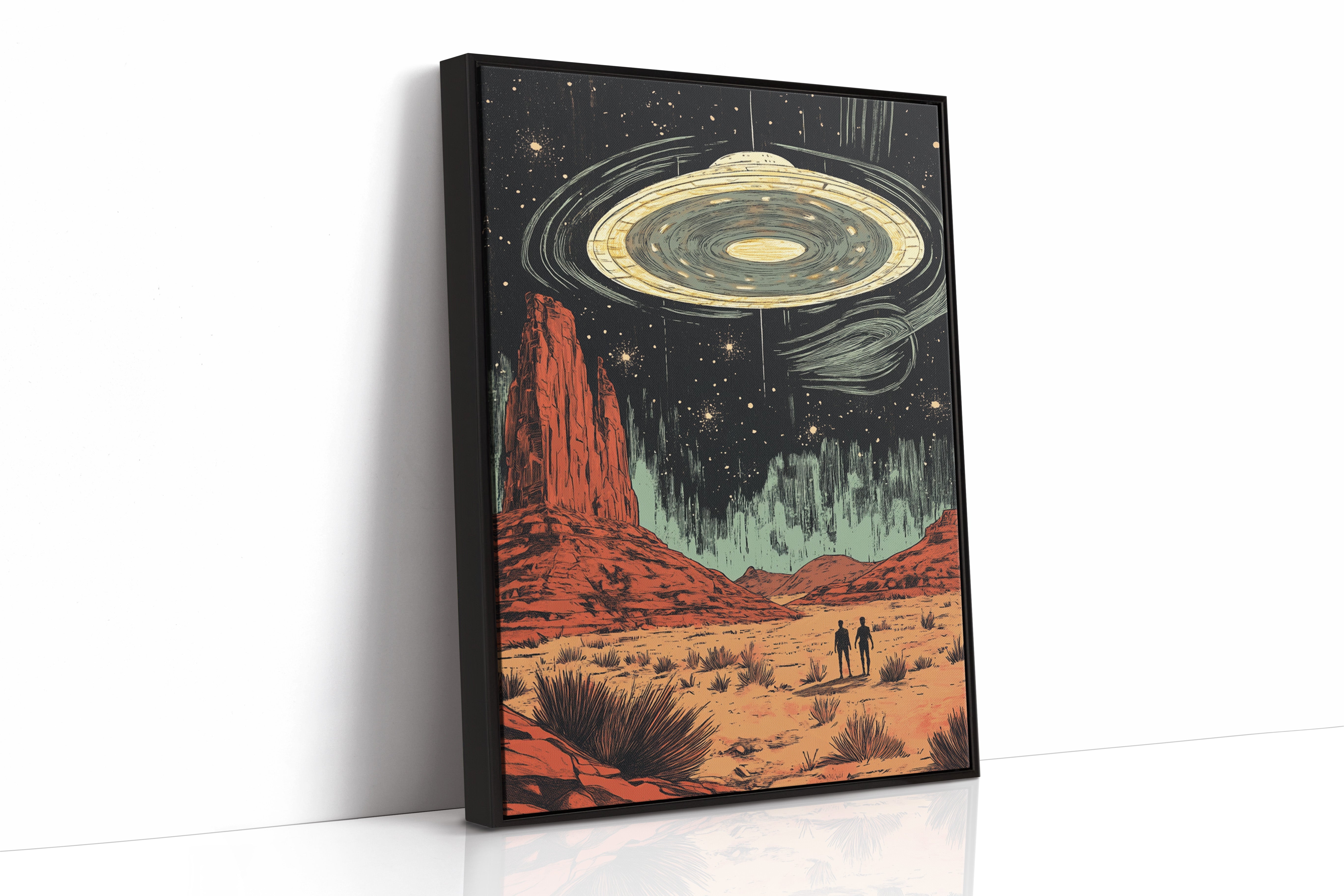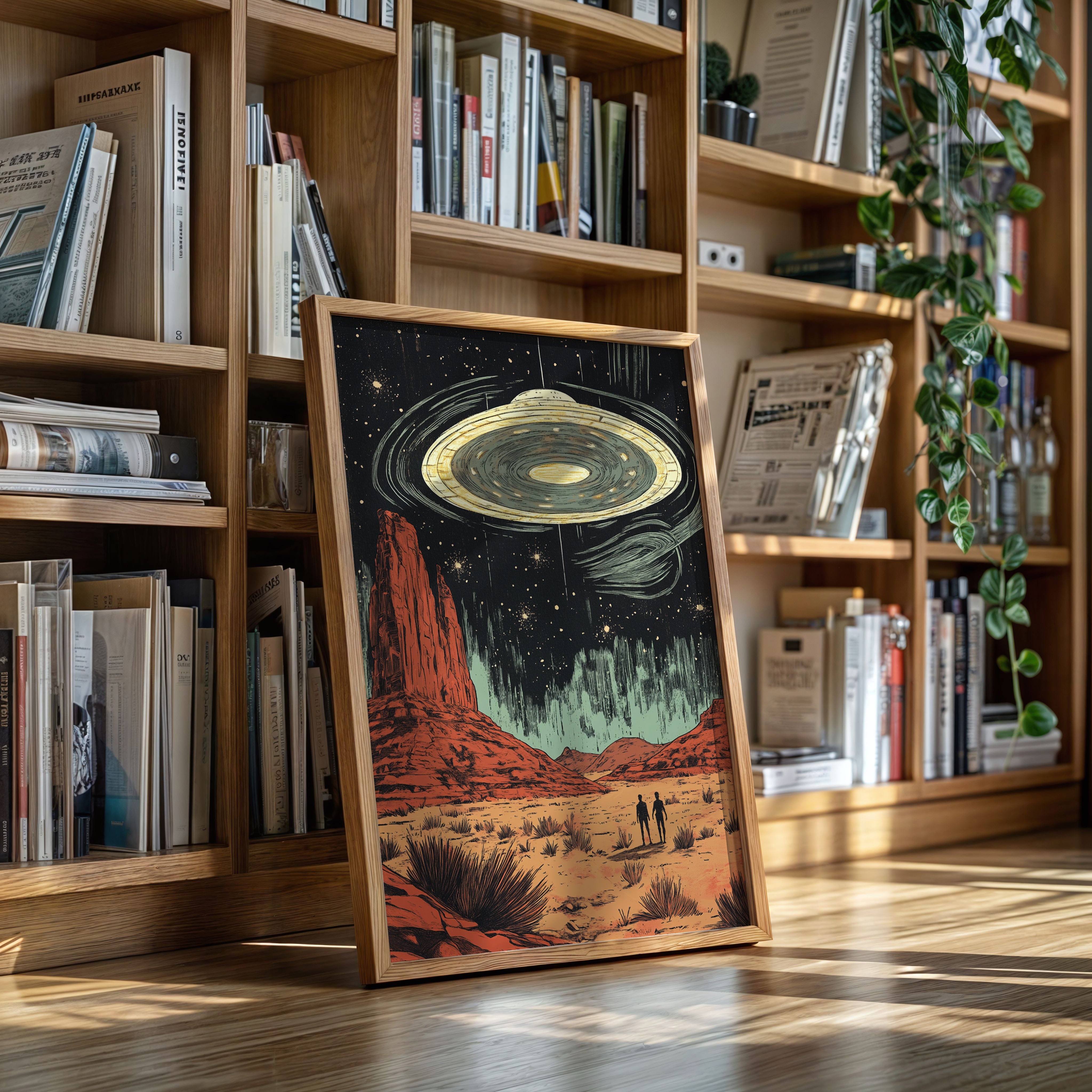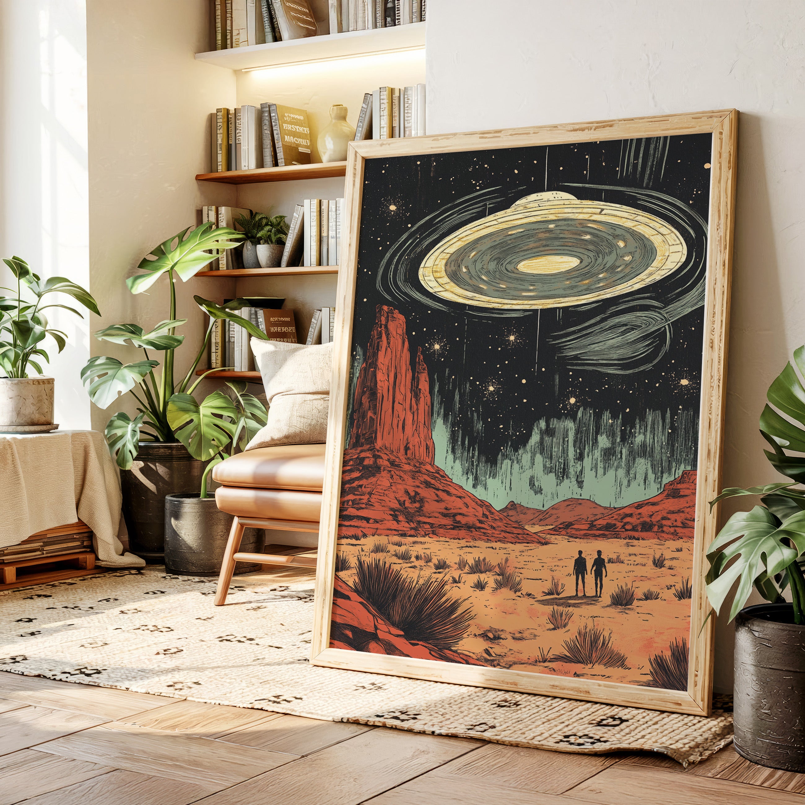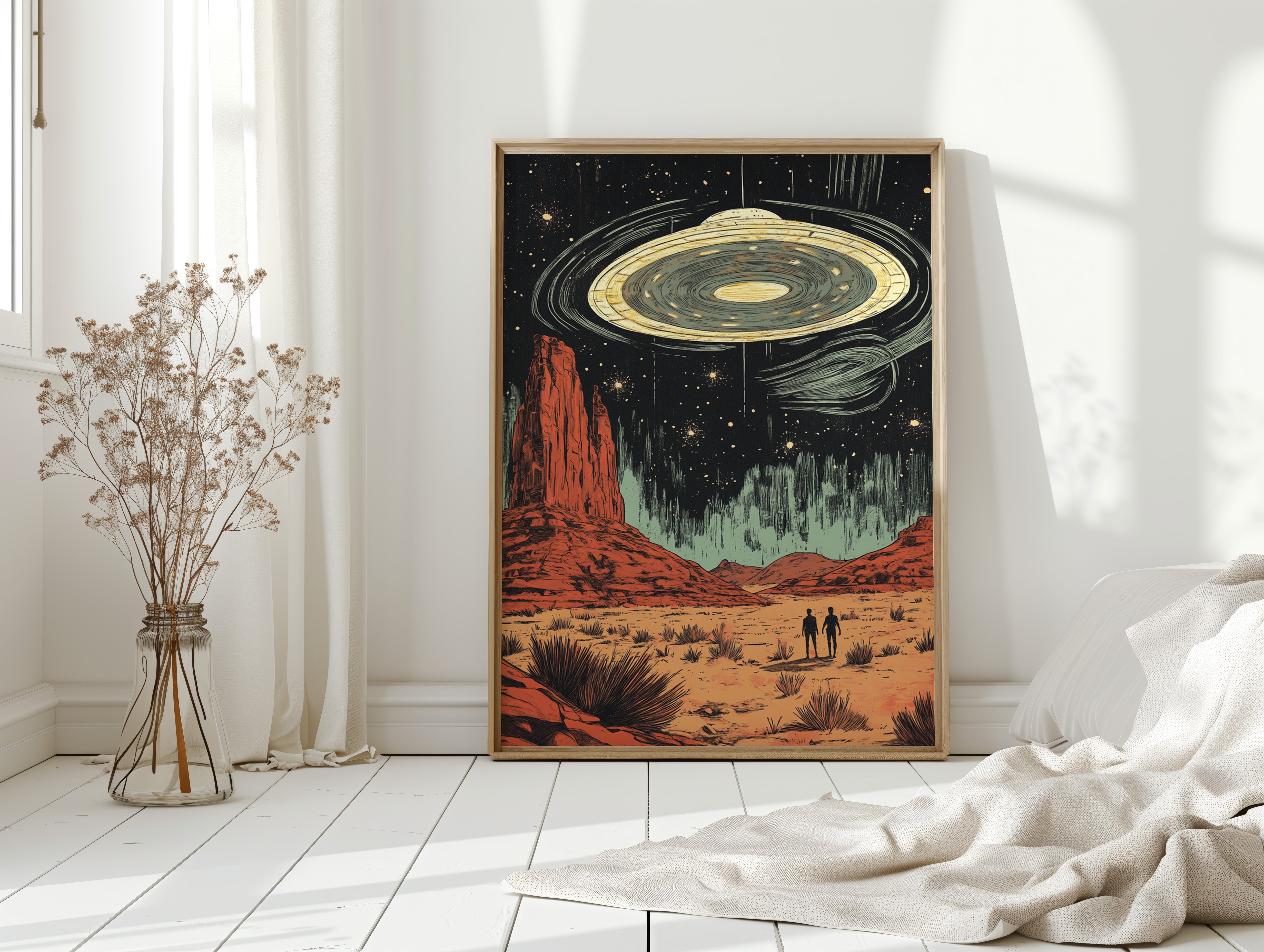 Two figures cross a desolate red canyon as a massive UFO hovers above, distorting the night sky in a swirl of stars and mystery. Retro sci-fi meets desert surrealism.