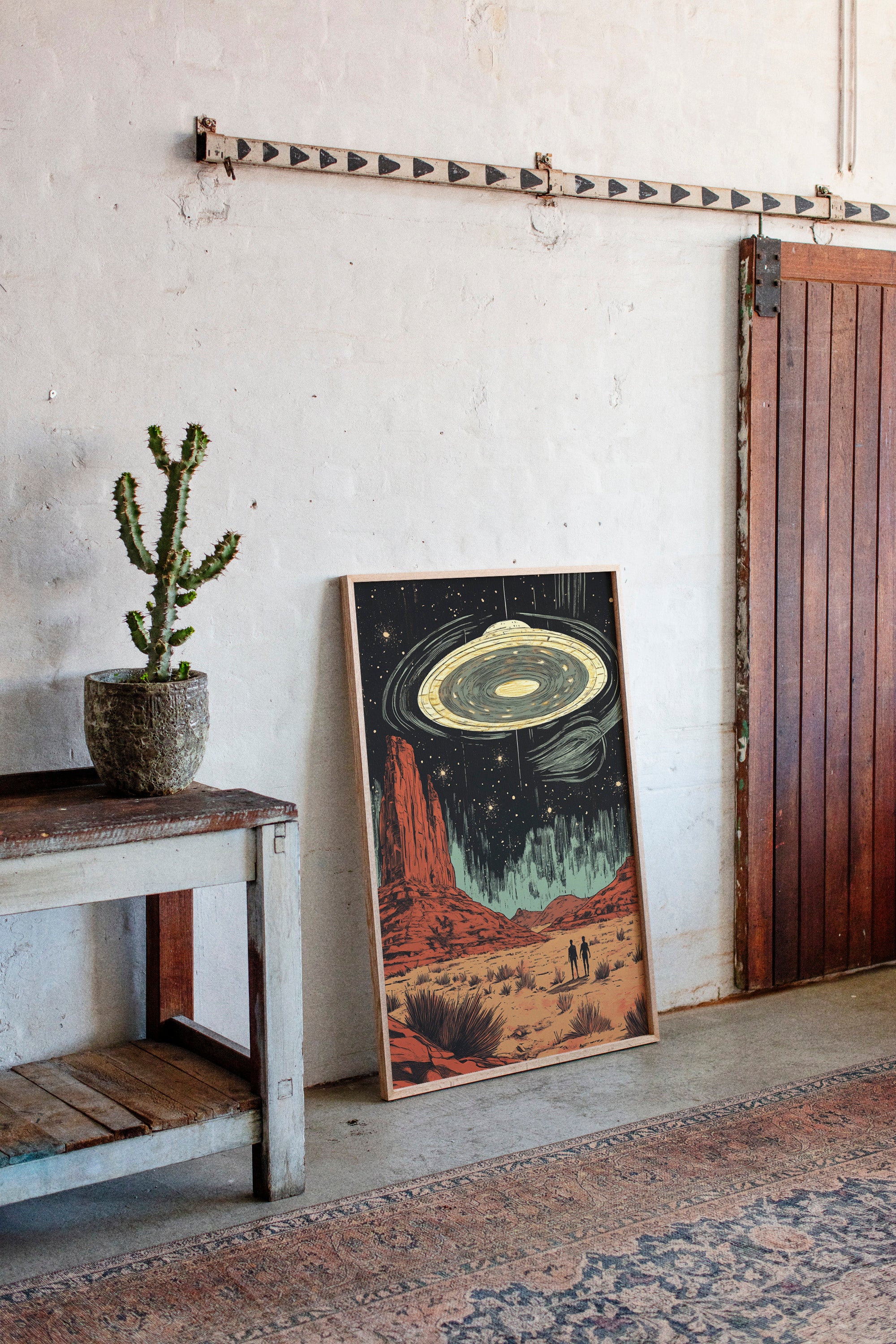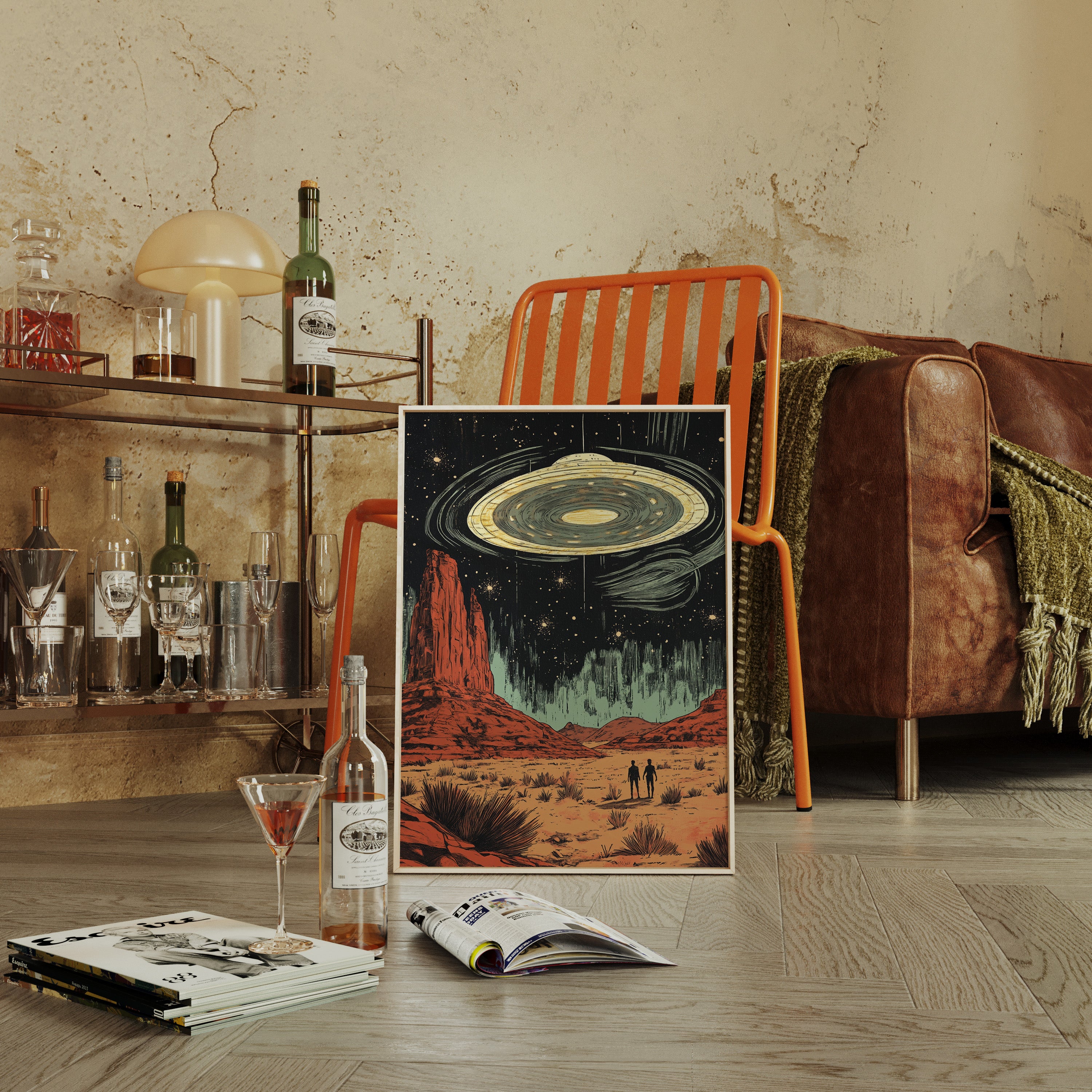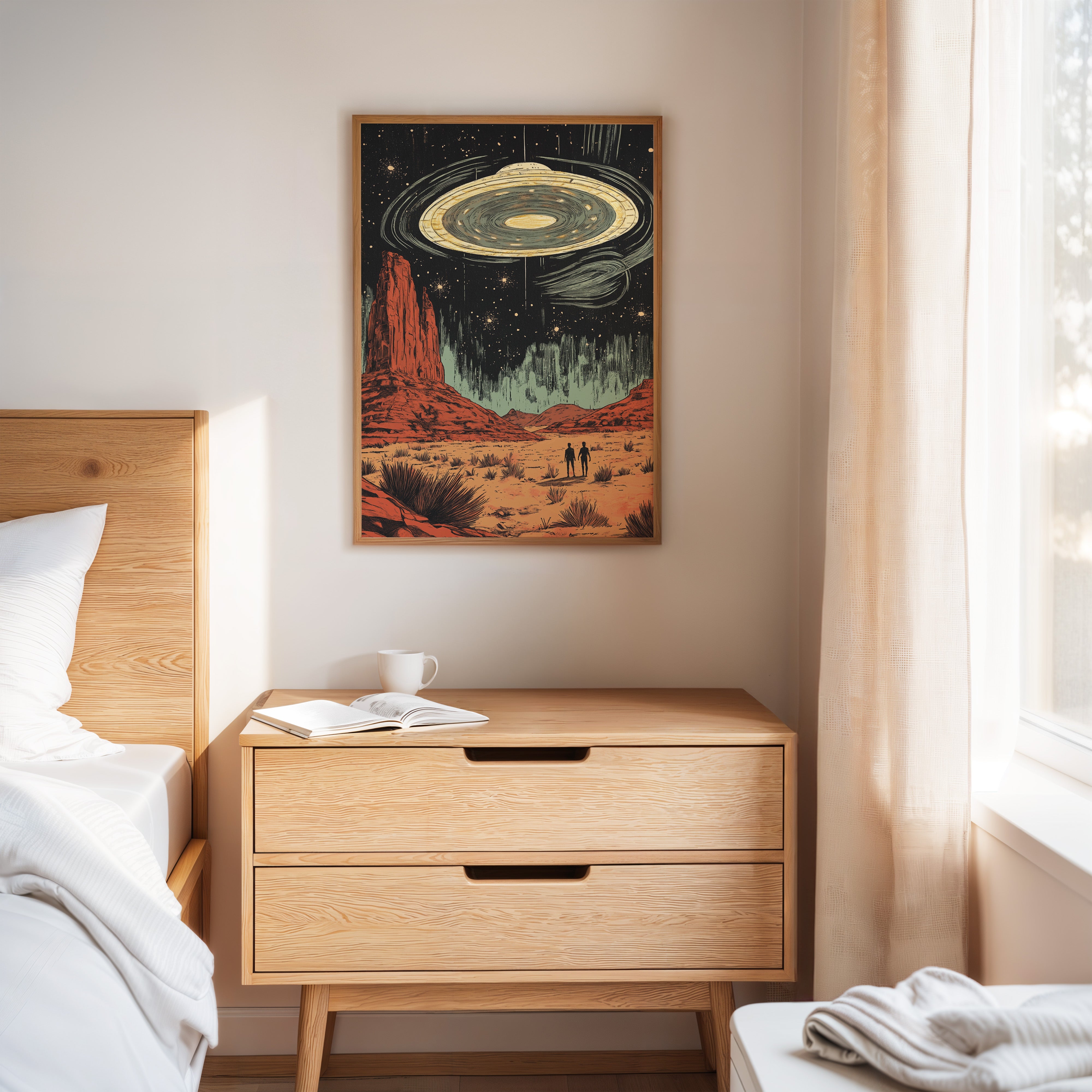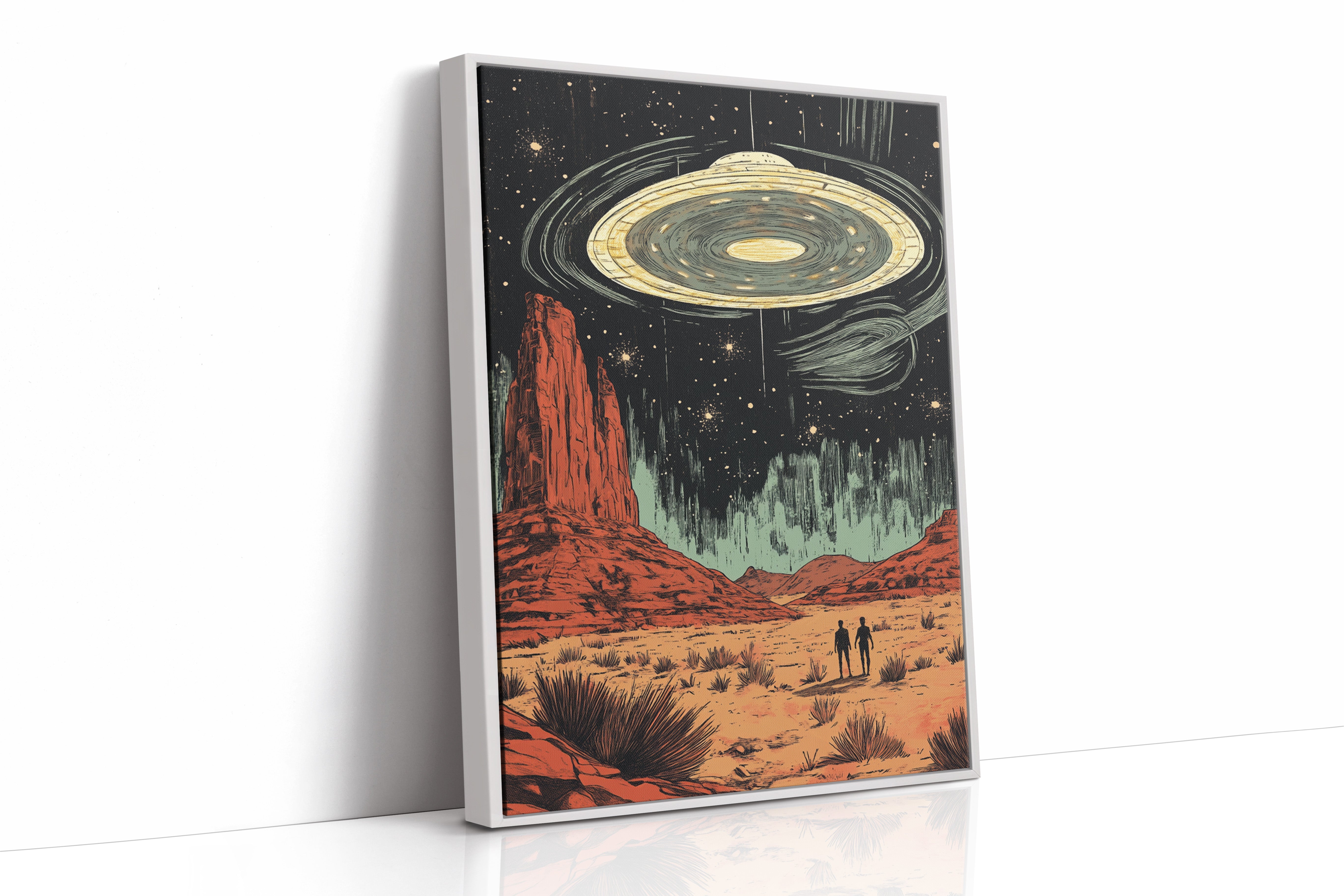 Two figures cross a desolate red canyon as a massive UFO hovers above, distorting the night sky in a swirl of stars and mystery. Retro sci-fi meets desert surrealism.