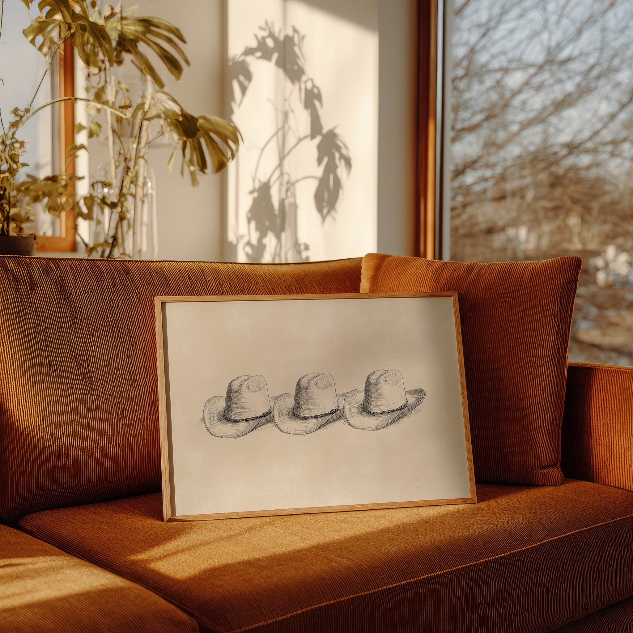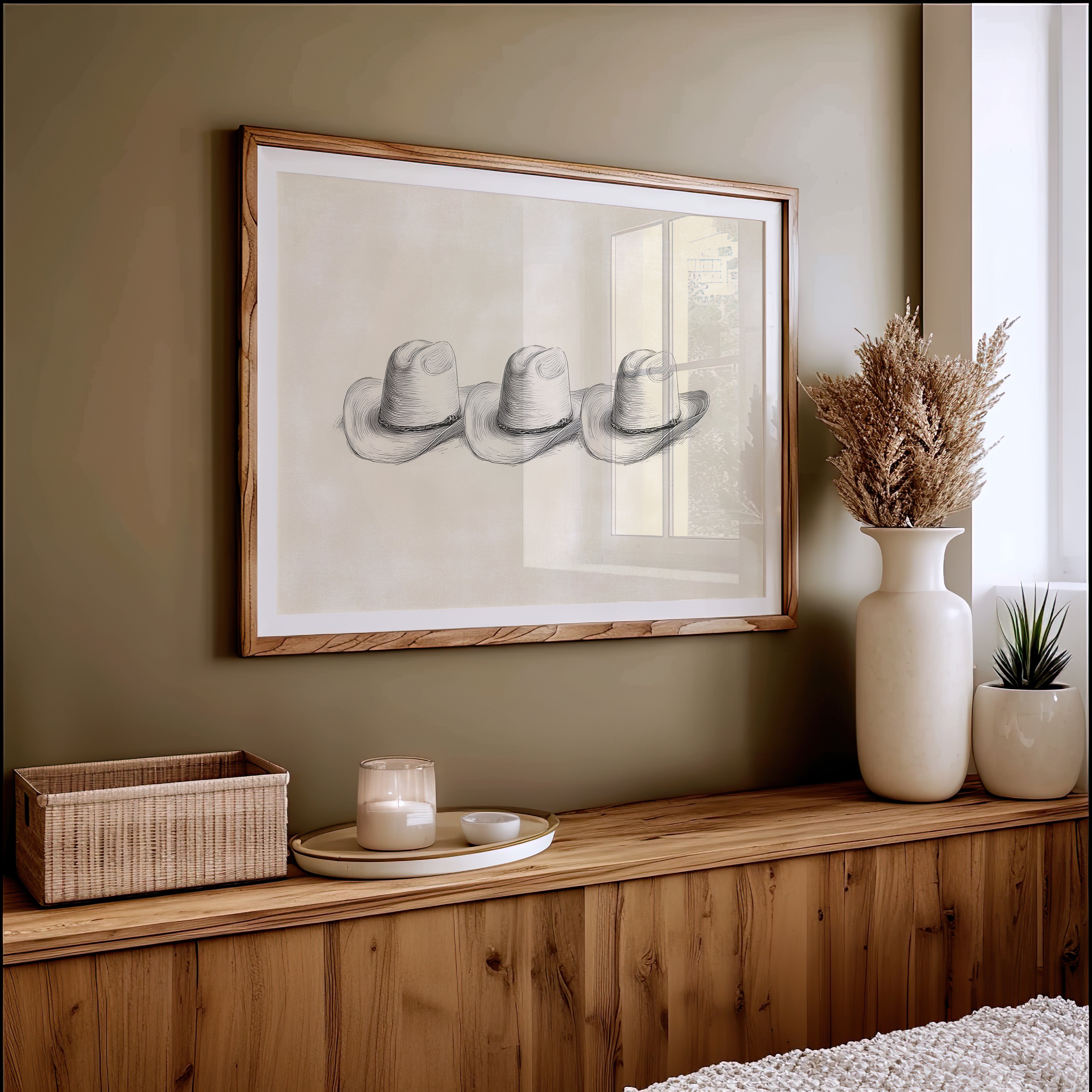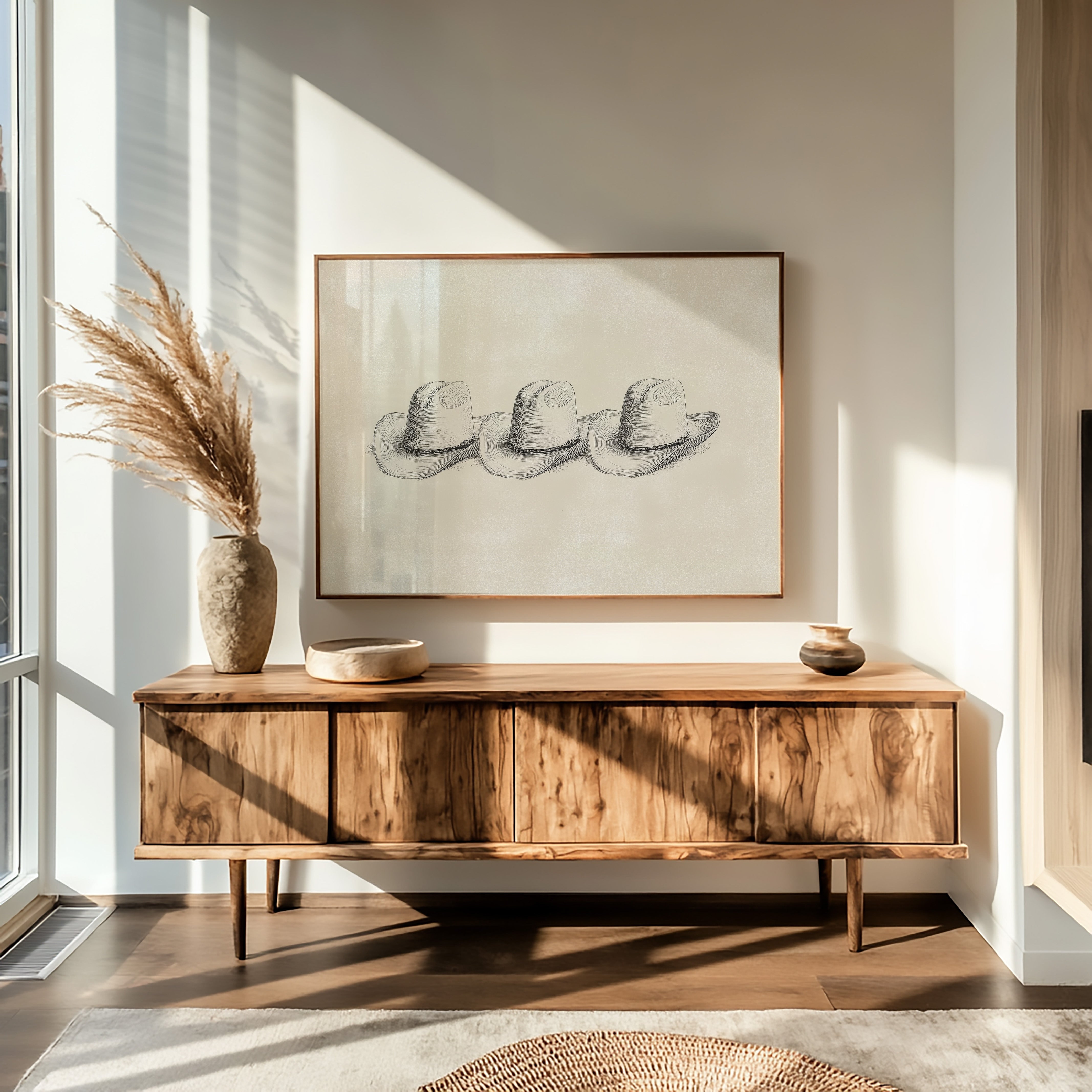 Gentle curves and delicate lines trace the story of well-worn cowboy hats, each one holding untold adventures. This minimalist sketch captures the essence of contemporary Western artistry, where simplicity meets storytelling. The careful hatching creates depth and dimension, while the subtle shadows suggest character and history in each identical crown. The clean composition invites viewers to imagine the stories behind these silent sentinels of the American West. Perfect for adding a refined rustic touch to a modern study, home office, or anywhere you want to blend Western charm with contemporary sophistication. Each hat seems to wait patiently for its next chapter to unfold.