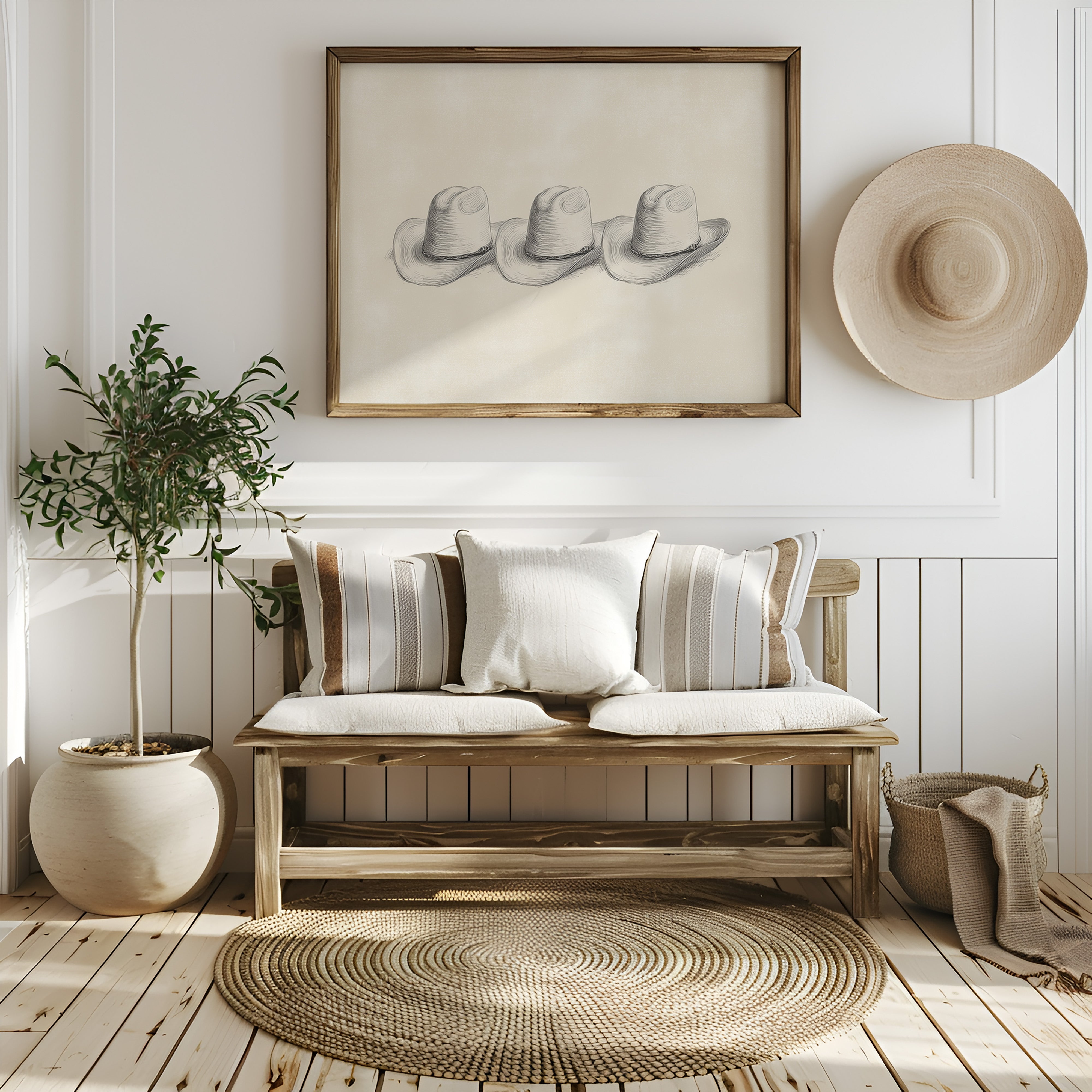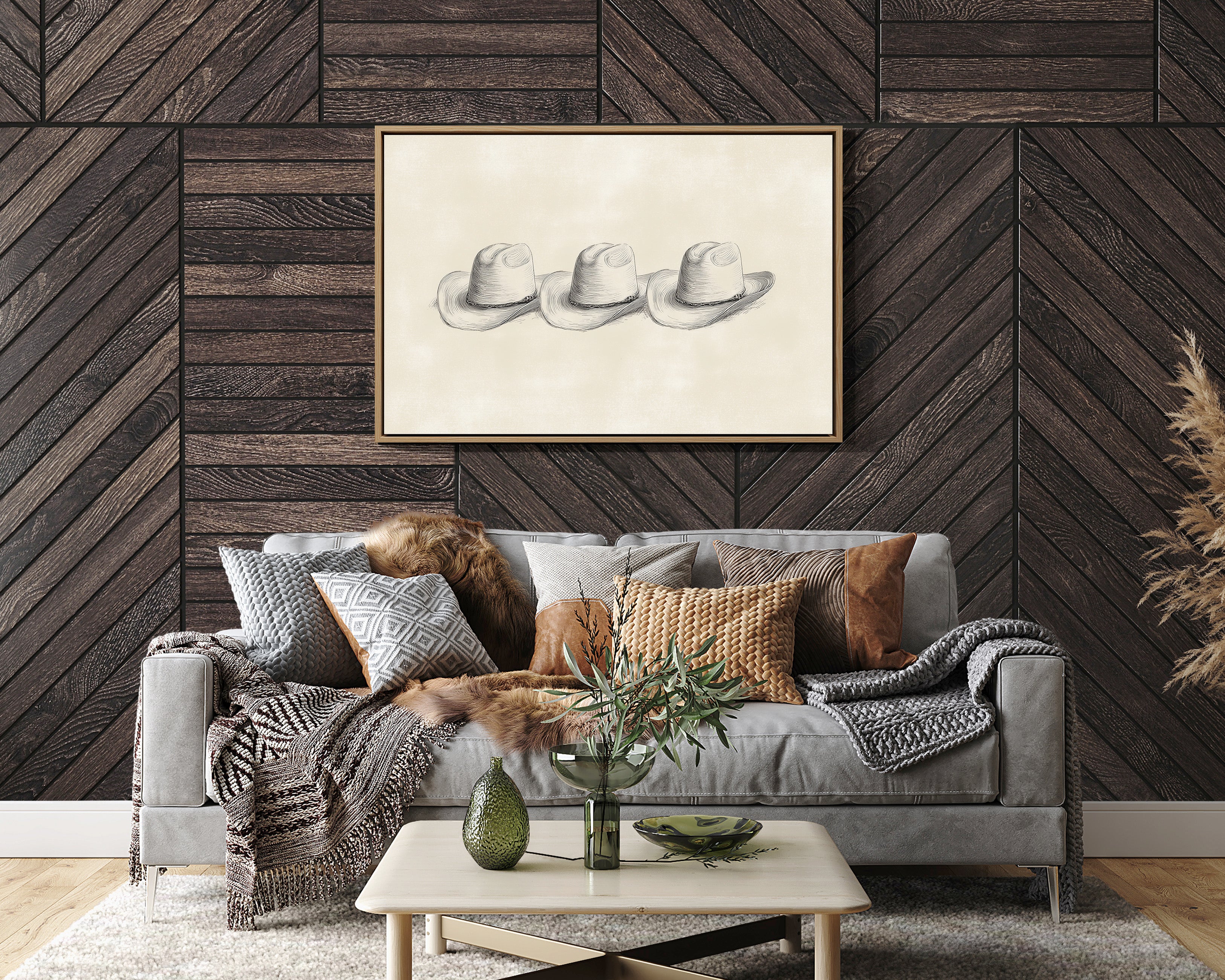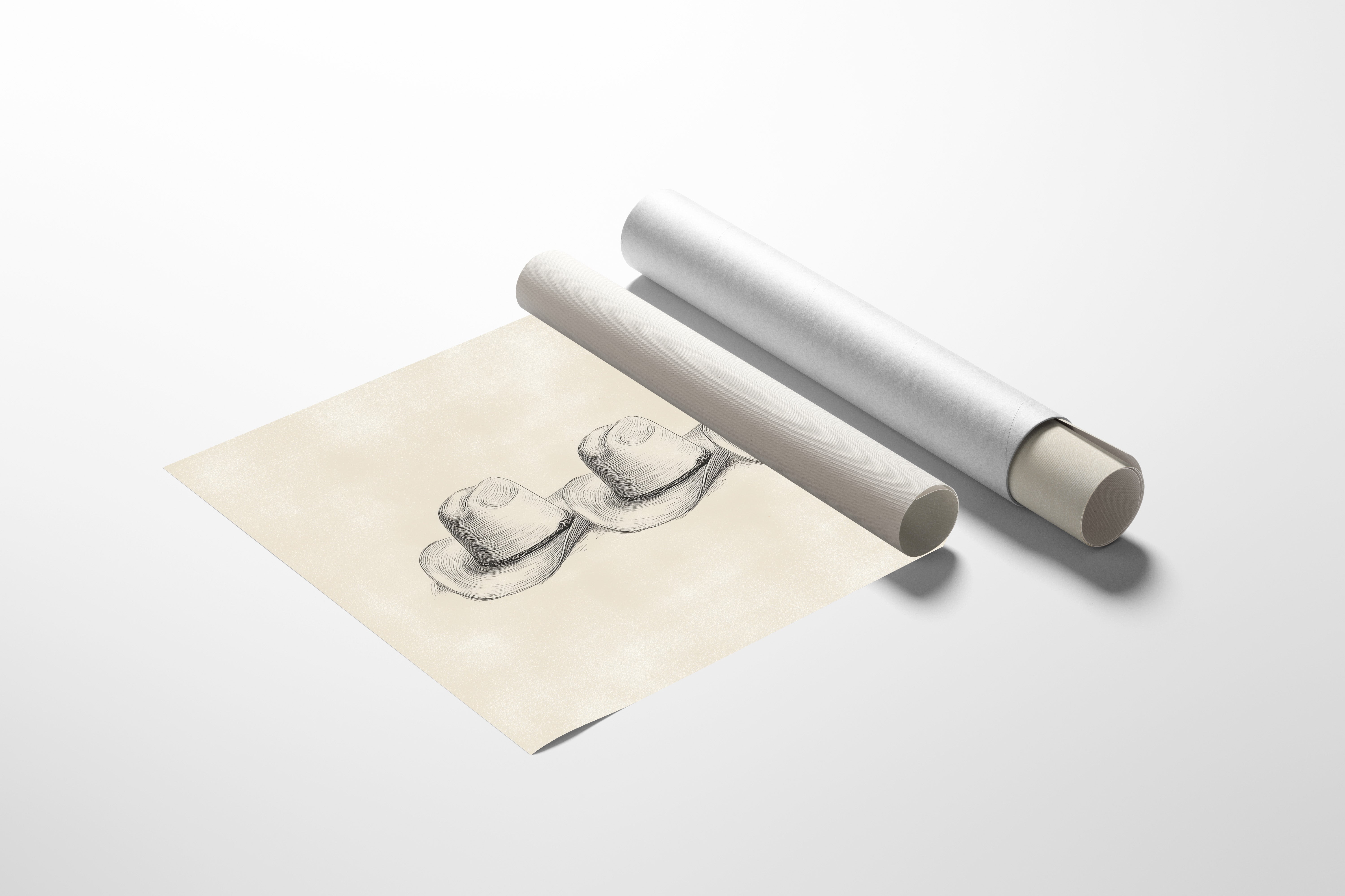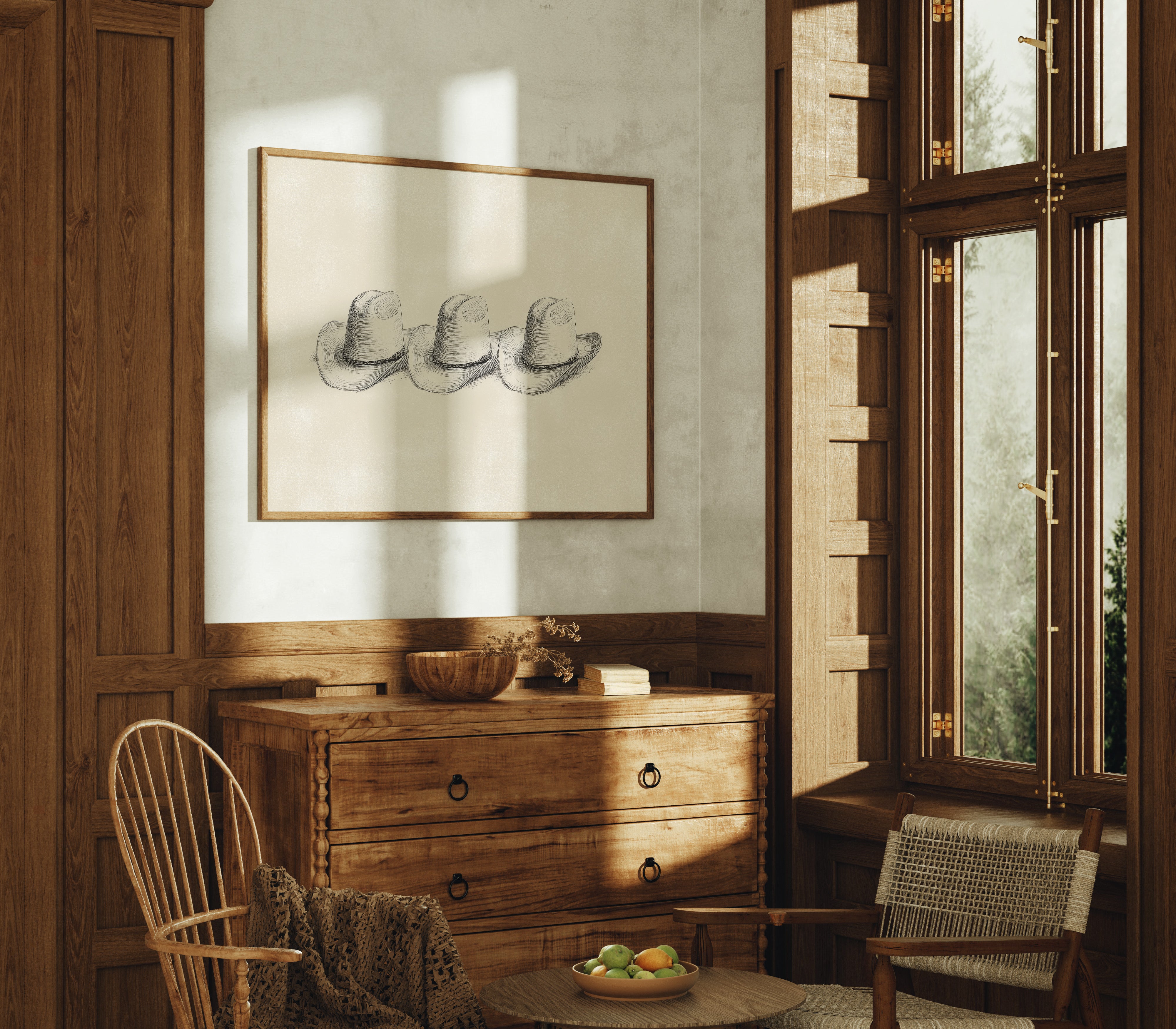 Gentle curves and delicate lines trace the story of well-worn cowboy hats, each one holding untold adventures. This minimalist sketch captures the essence of contemporary Western artistry, where simplicity meets storytelling. The careful hatching creates depth and dimension, while the subtle shadows suggest character and history in each identical crown. The clean composition invites viewers to imagine the stories behind these silent sentinels of the American West. Perfect for adding a refined rustic touch to a modern study, home office, or anywhere you want to blend Western charm with contemporary sophistication. Each hat seems to wait patiently for its next chapter to unfold.