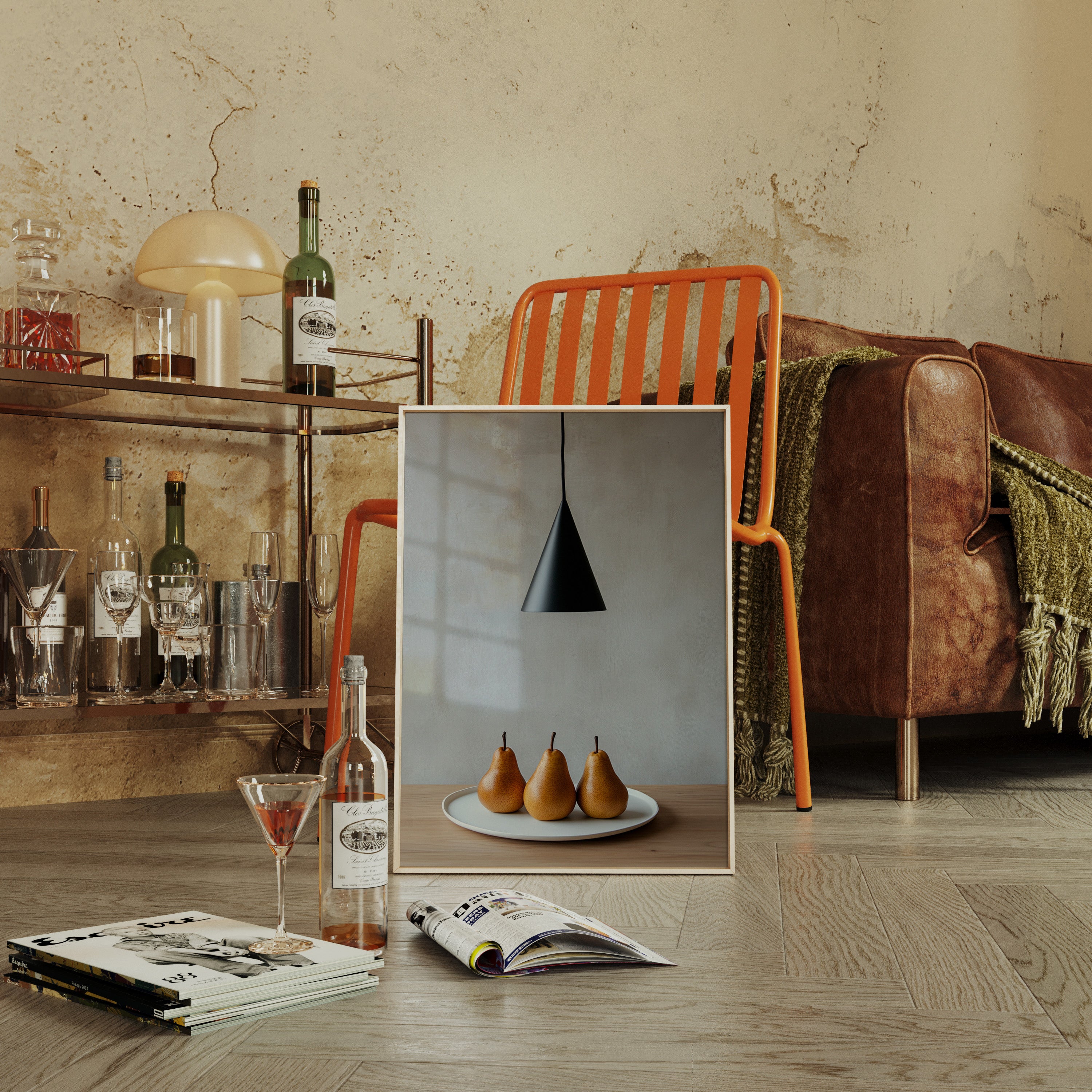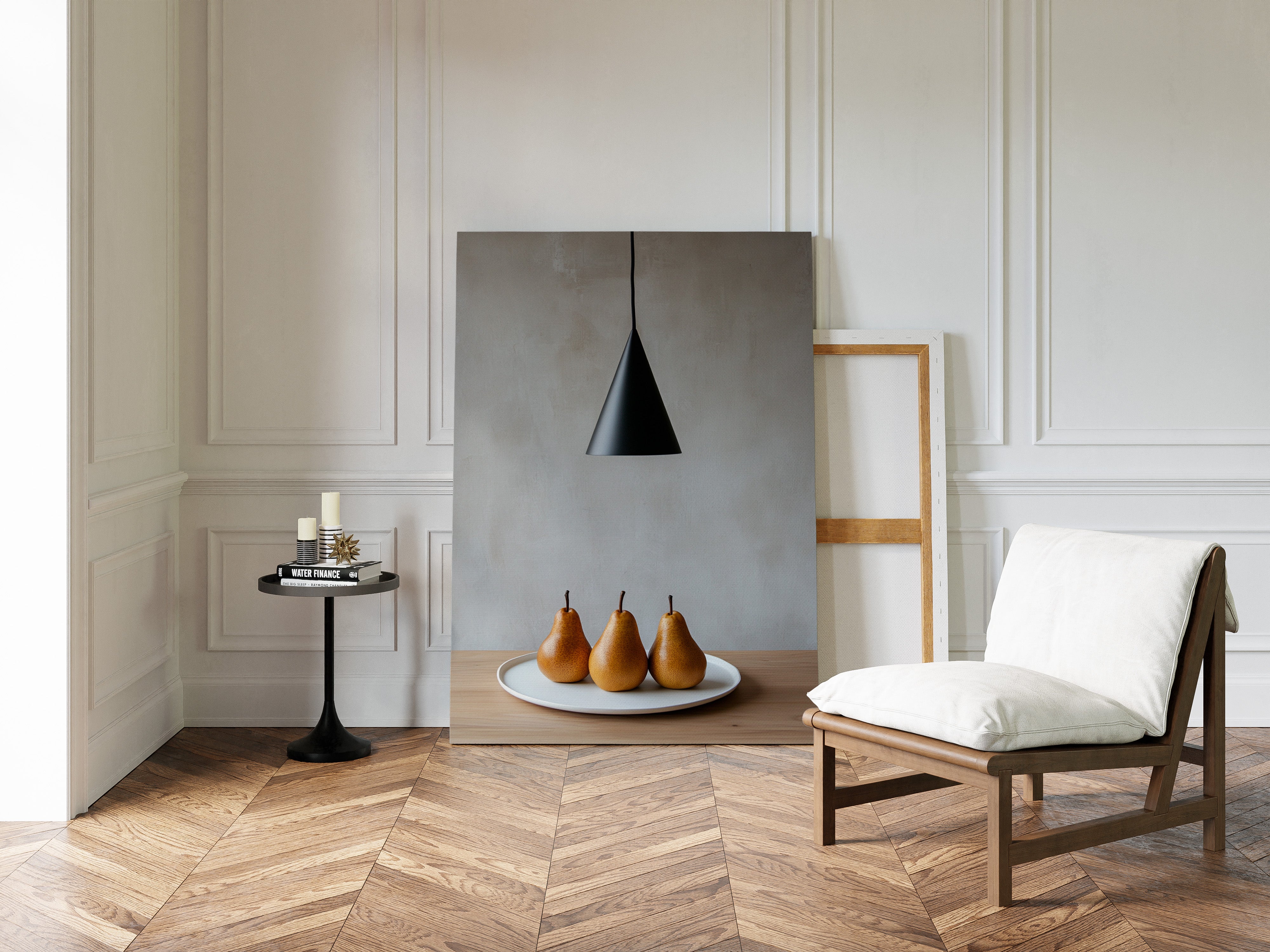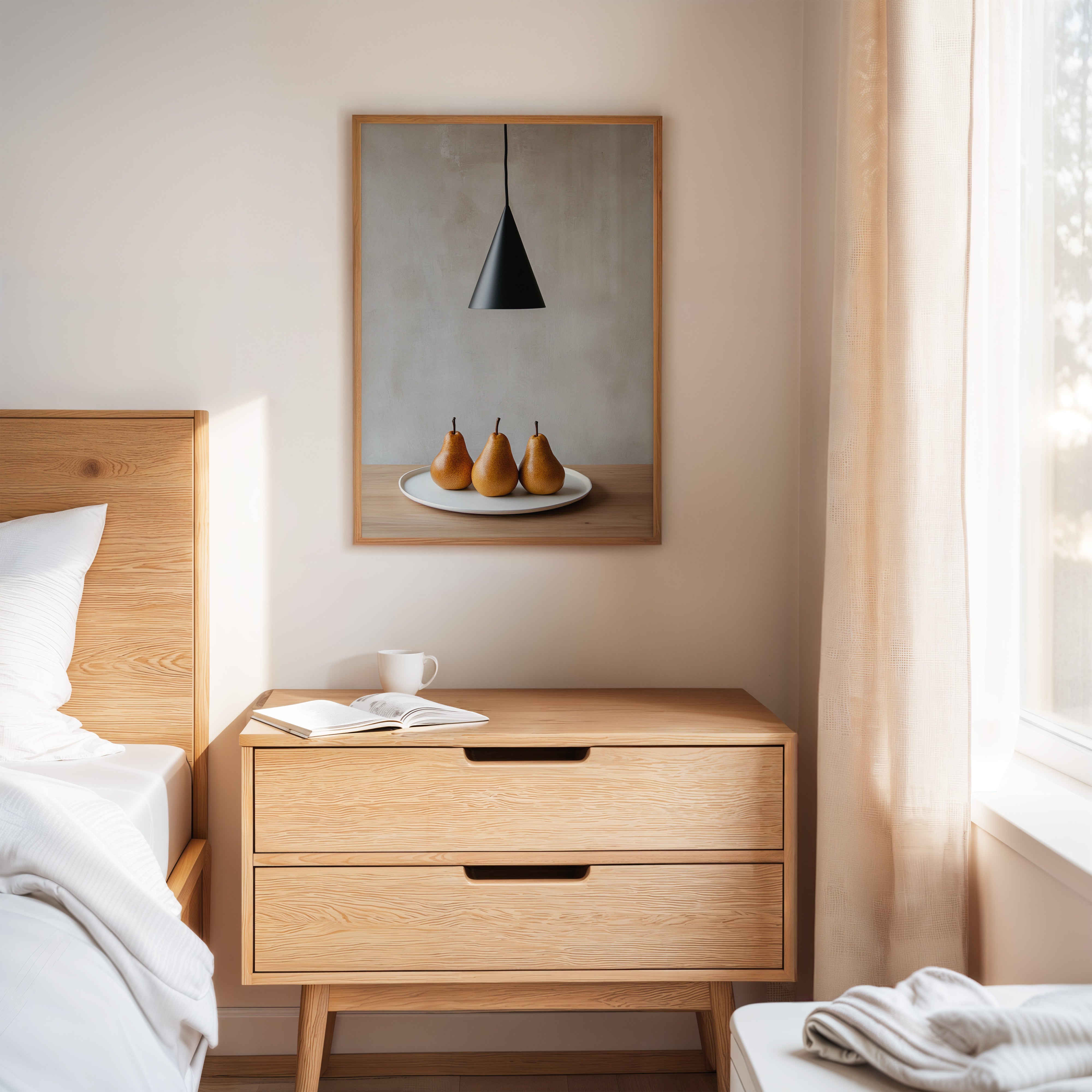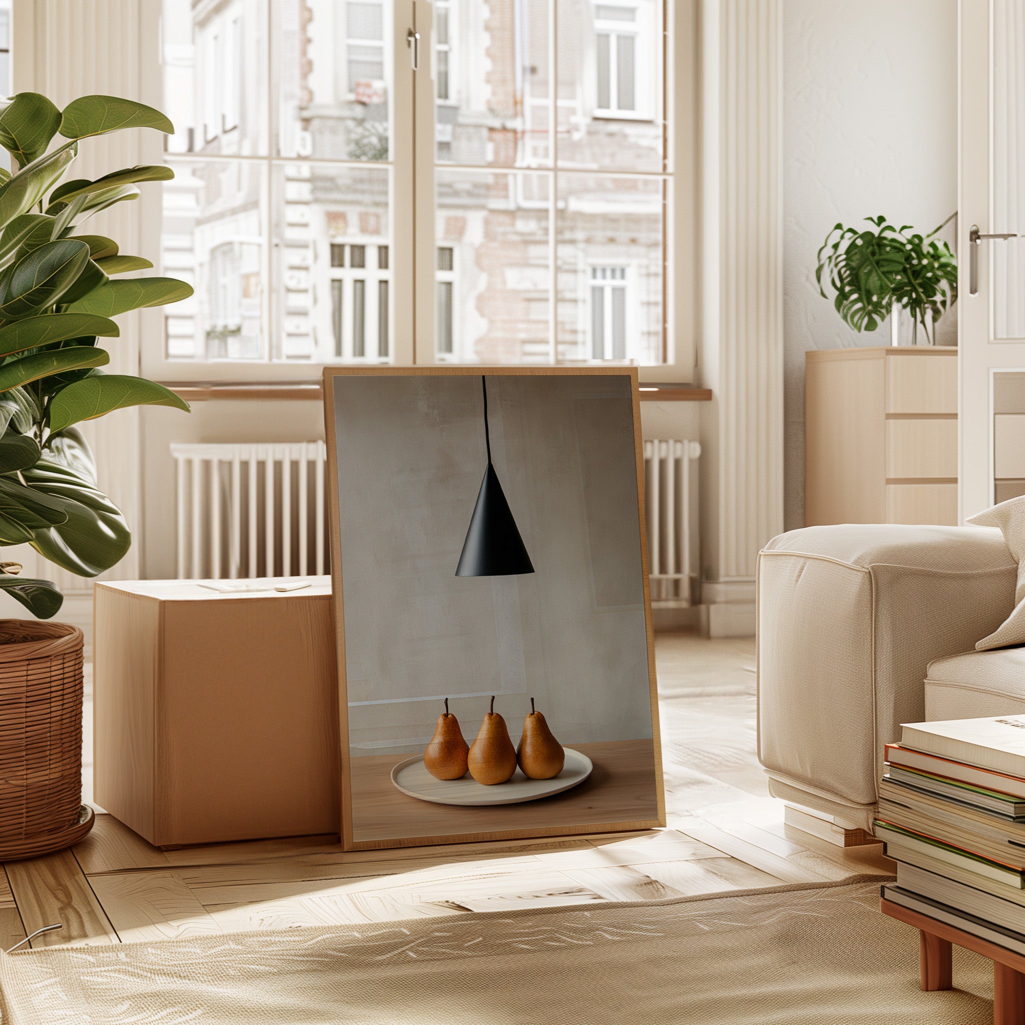 In the quiet of a minimalist setting, golden pears stand sentinel beneath a striking black pendant lamp. The smooth, textured skin of the fruit catches subtle highlights, their forms perfectly aligned like notes in a visual symphony. Against a serene concrete wall, the composition speaks of balance and intention - where modern design meets organic form. The crisp white plate and wooden surface ground the scene in warmth and simplicity. Perfect for a modern dining room or kitchen where clean lines and natural elements create a sophisticated dialogue.