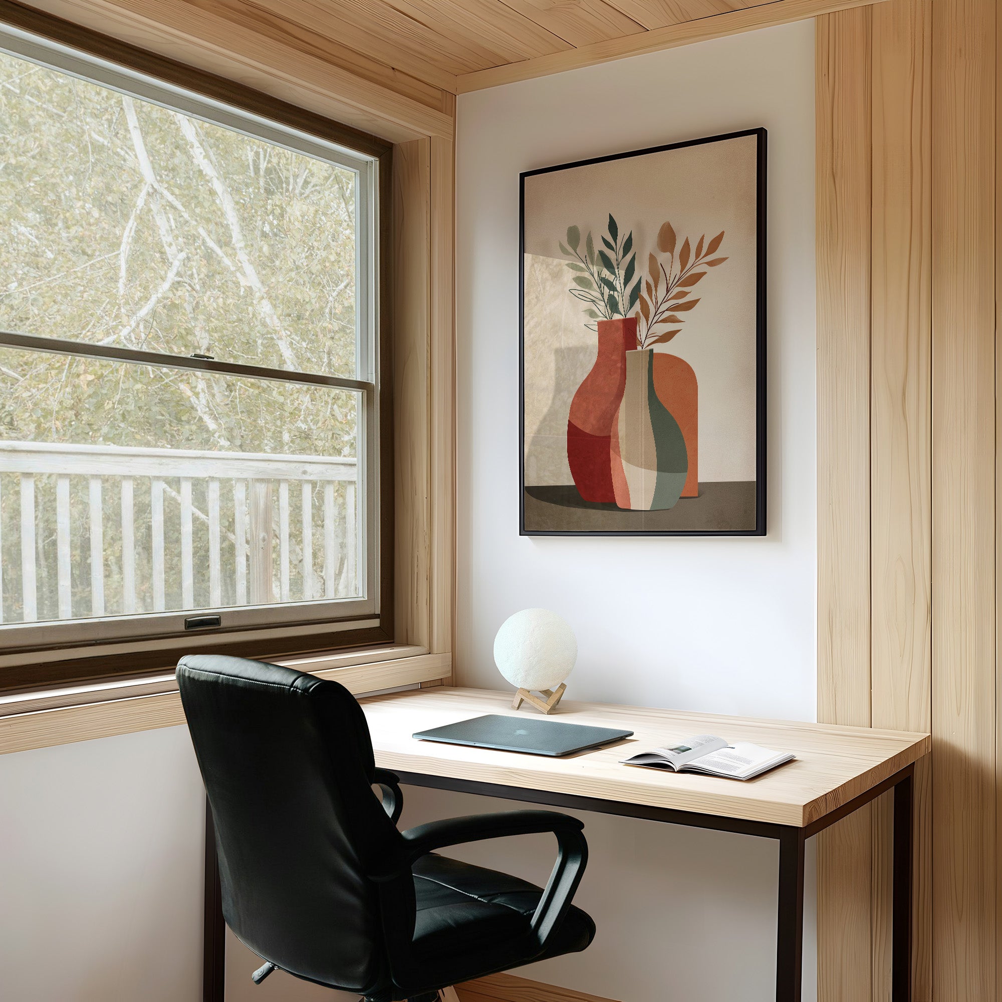 Geometric vases in terracotta, sage, and cream stand together, each cradling delicate sprigs of olive and amber foliage that reach toward soft afternoon light. The composition balances clean lines with organic forms, casting gentle shadows across a neutral wall that amplifies the warmth of the earth-toned palette. This minimalist still life captures the quiet elegance of mid-century modern design with a contemporary botanical sensibility. Perfect for a dining room or entryway where understated sophistication meets natural beauty.