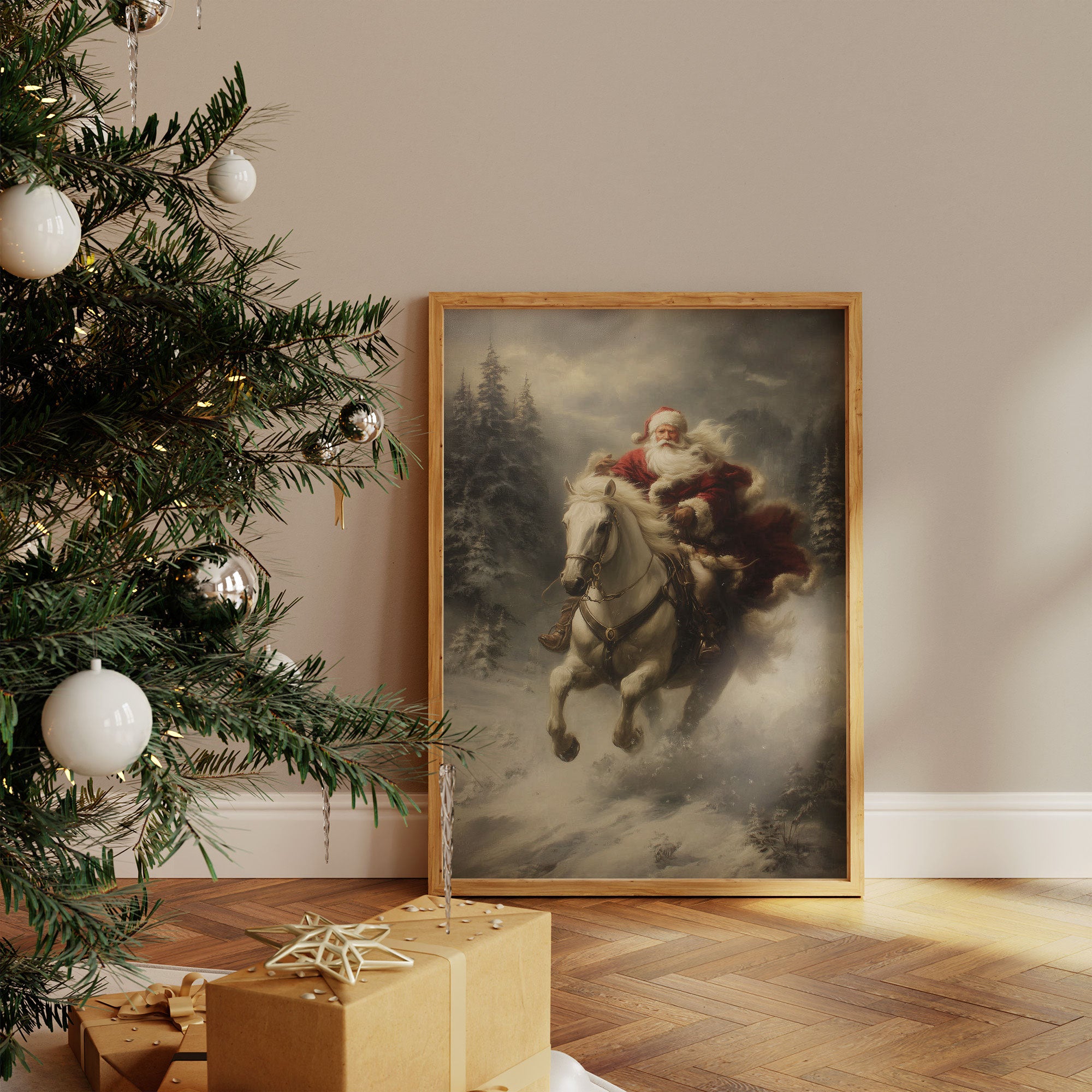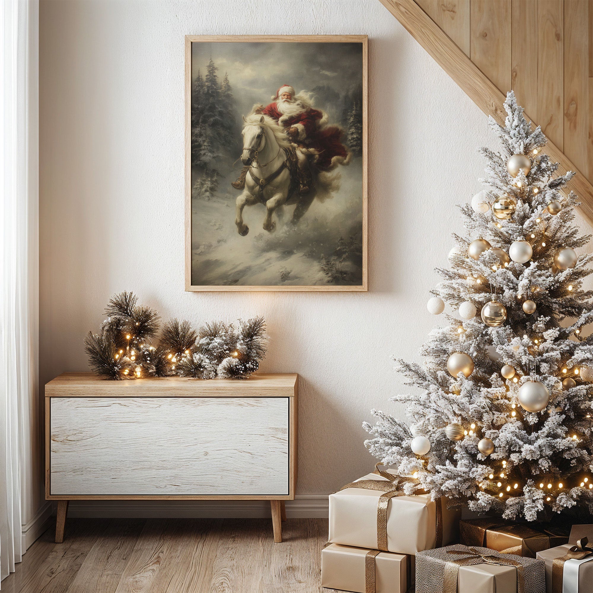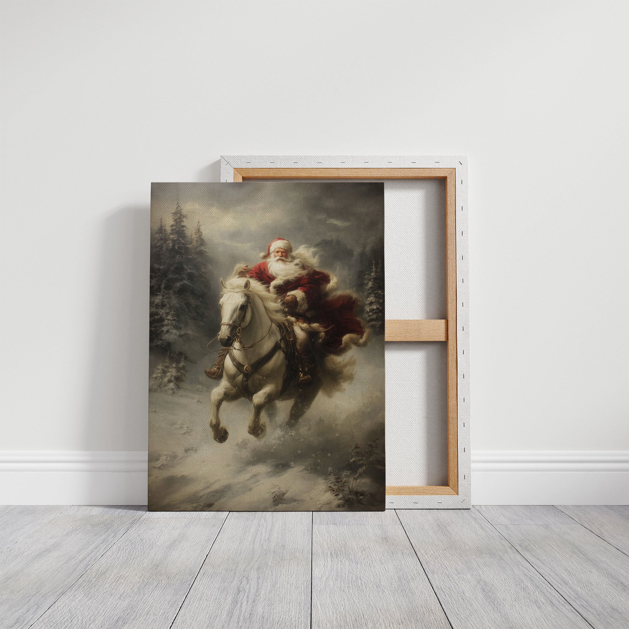 Amidst swirling snow and misty evergreens, a dramatic scene unfolds as a white horse leaps through the winter night. The atmospheric painting captures a moment of pure holiday magic, where the impossible seems real against a moody, ethereal backdrop. Rich crimson fabric billows dramatically against the stark winter landscape, while pine trees stand sentinel in the gathering storm. This nostalgic piece brings traditional holiday enchantment to contemporary spaces, perfect for creating a focal point in living rooms or entryways during the festive season.
