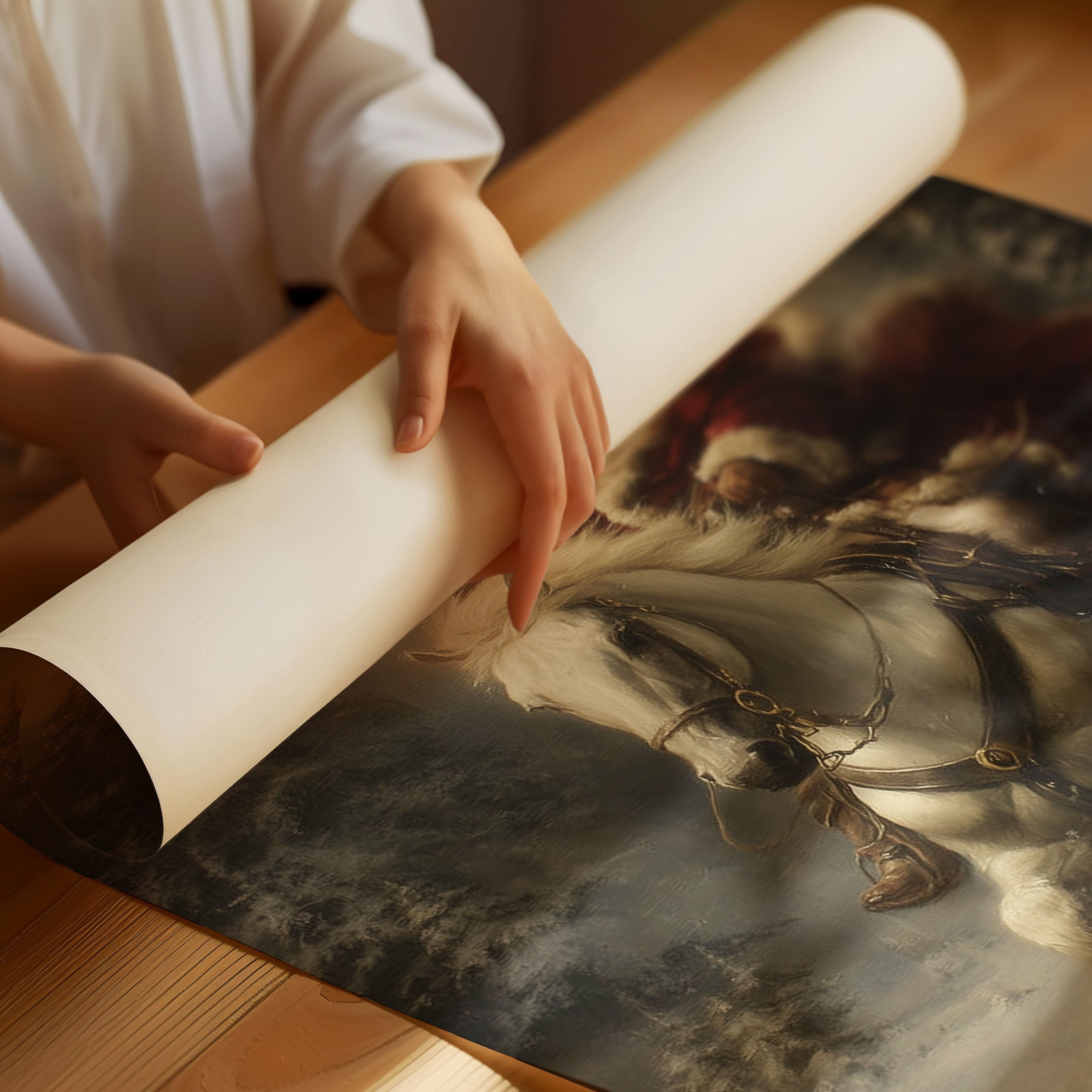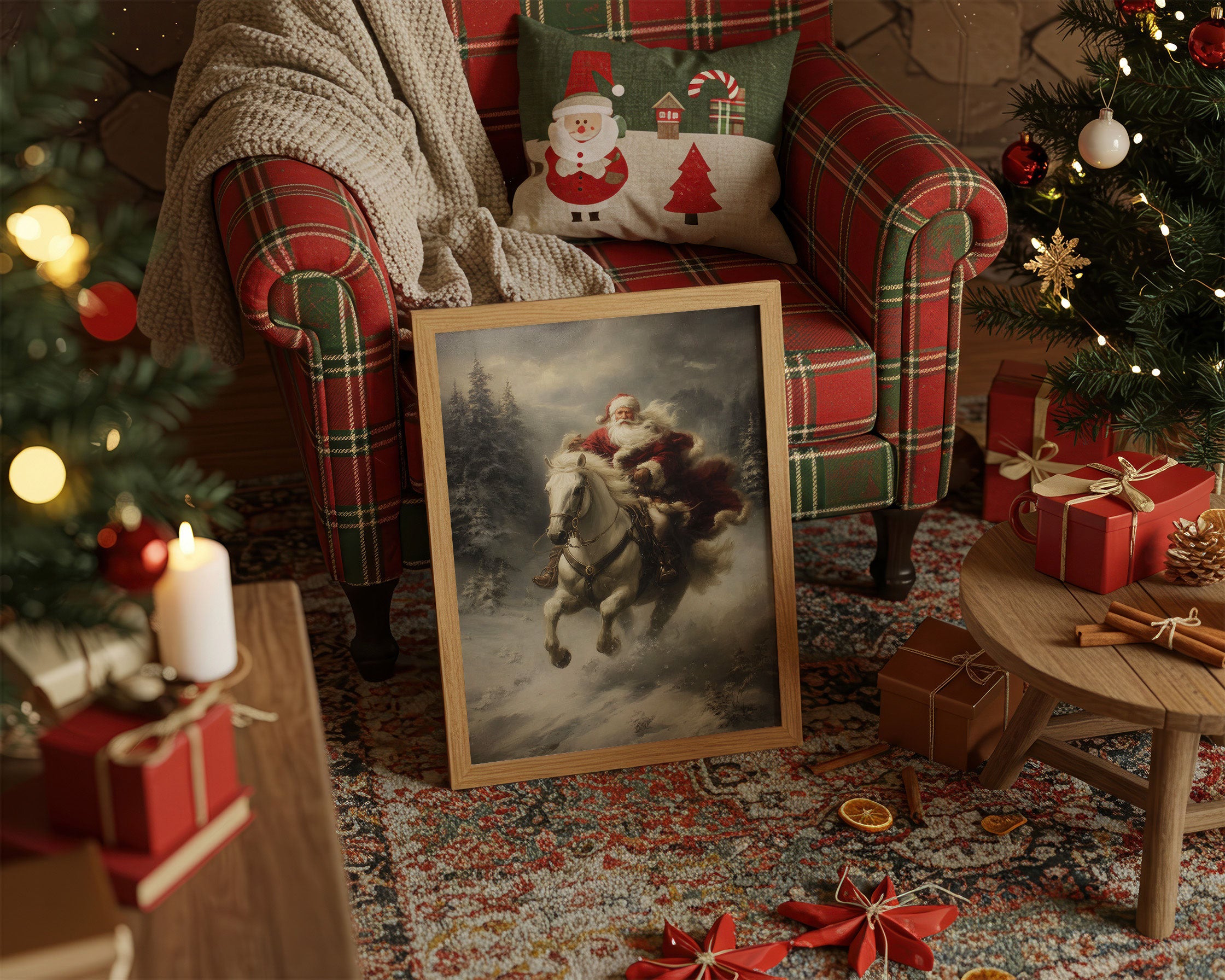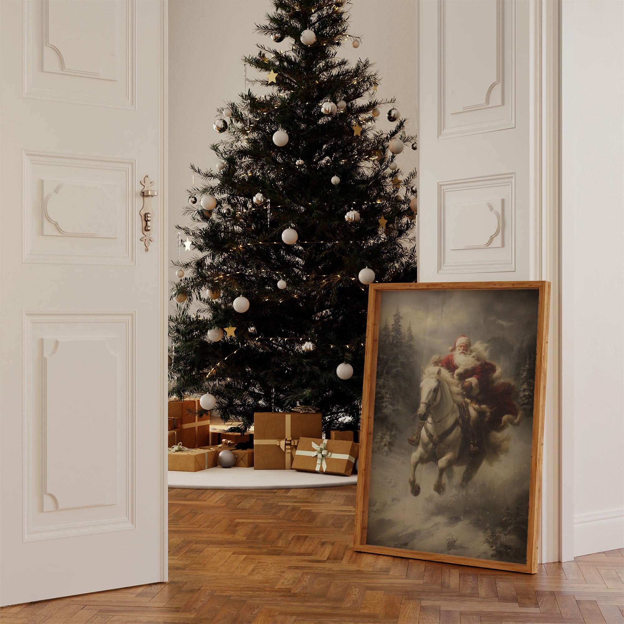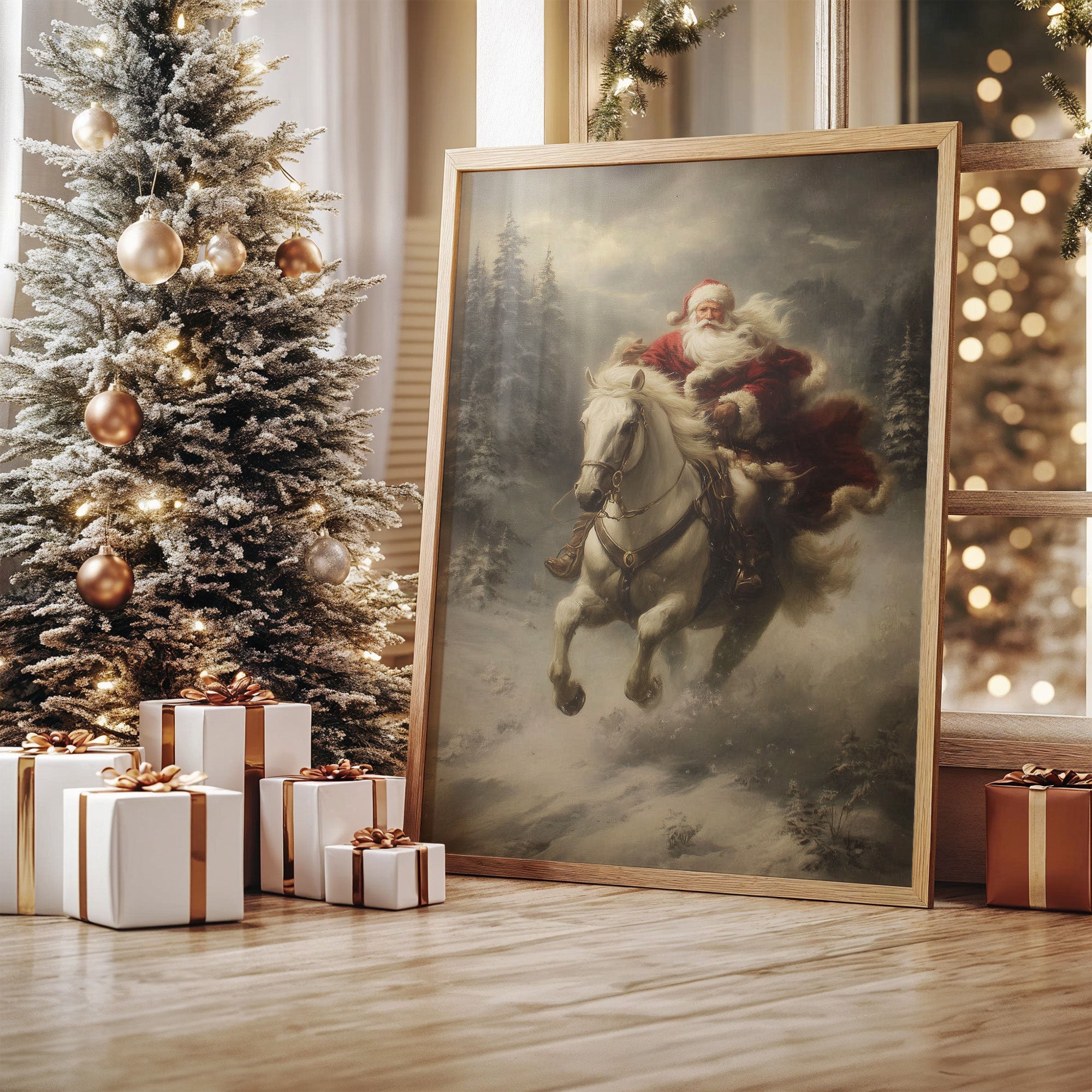 Amidst swirling snow and misty evergreens, a dramatic scene unfolds as a white horse leaps through the winter night. The atmospheric painting captures a moment of pure holiday magic, where the impossible seems real against a moody, ethereal backdrop. Rich crimson fabric billows dramatically against the stark winter landscape, while pine trees stand sentinel in the gathering storm. This nostalgic piece brings traditional holiday enchantment to contemporary spaces, perfect for creating a focal point in living rooms or entryways during the festive season.