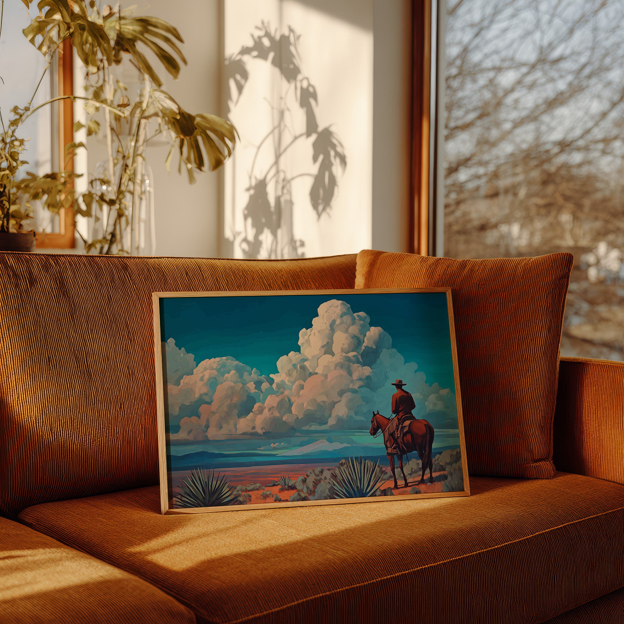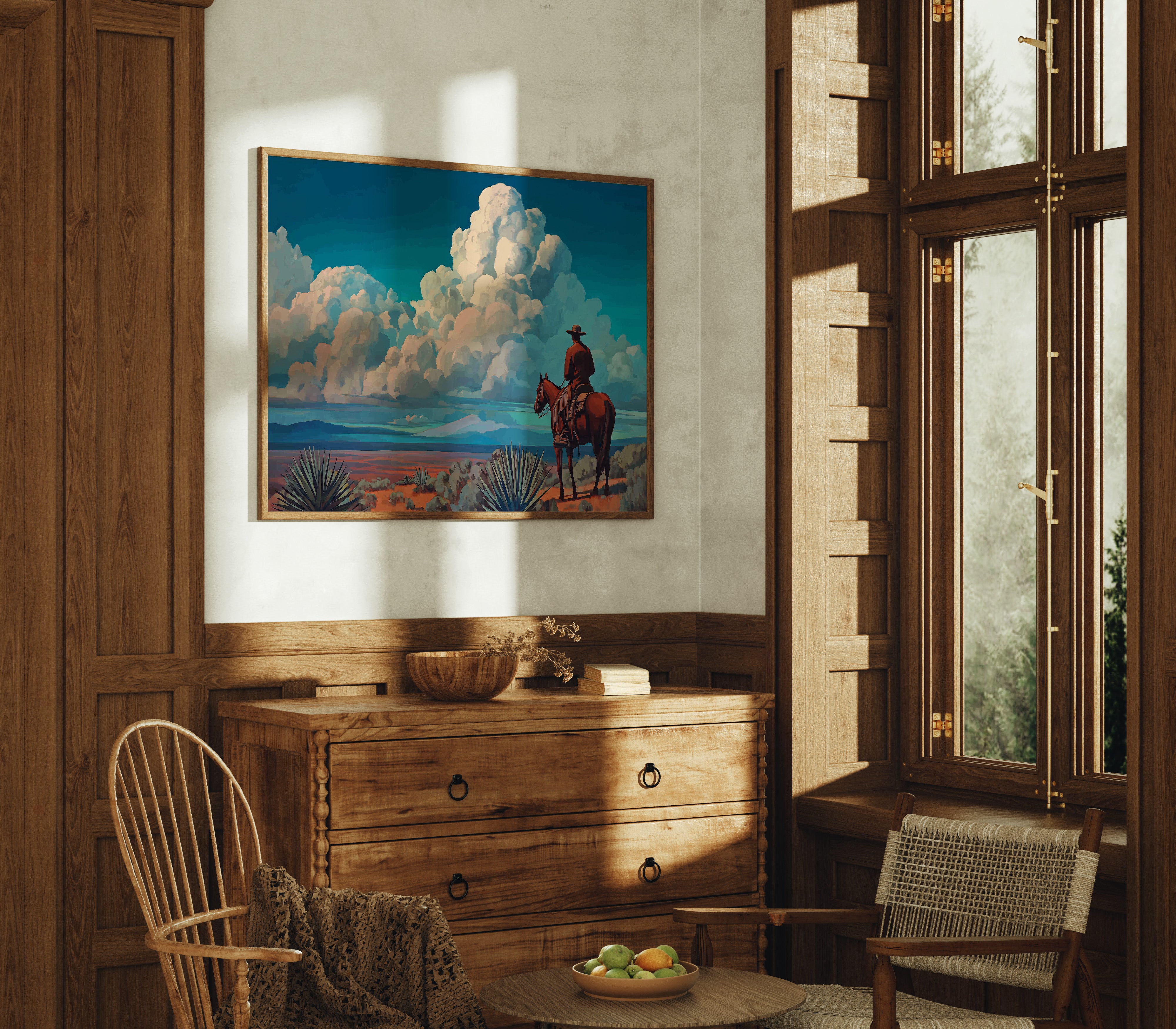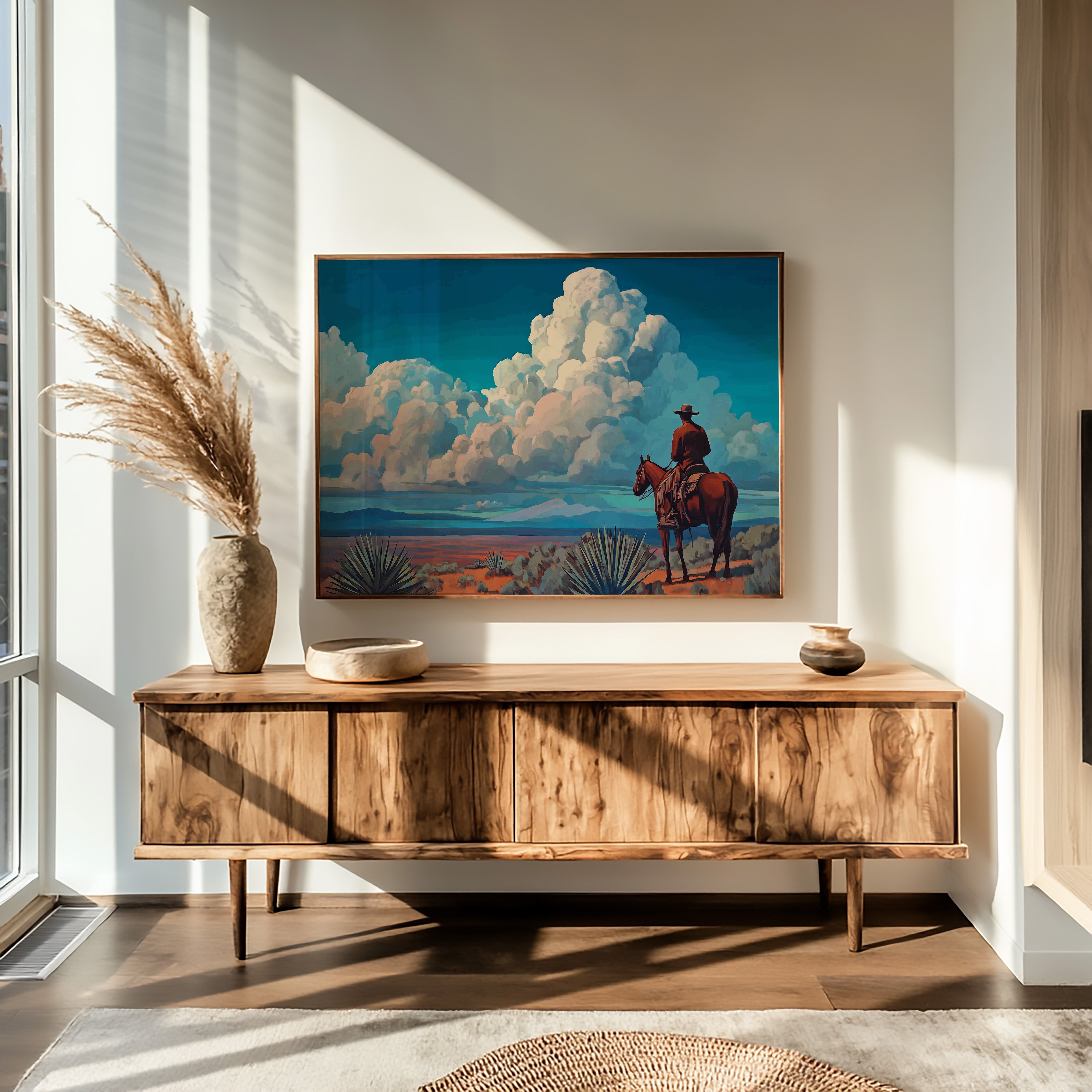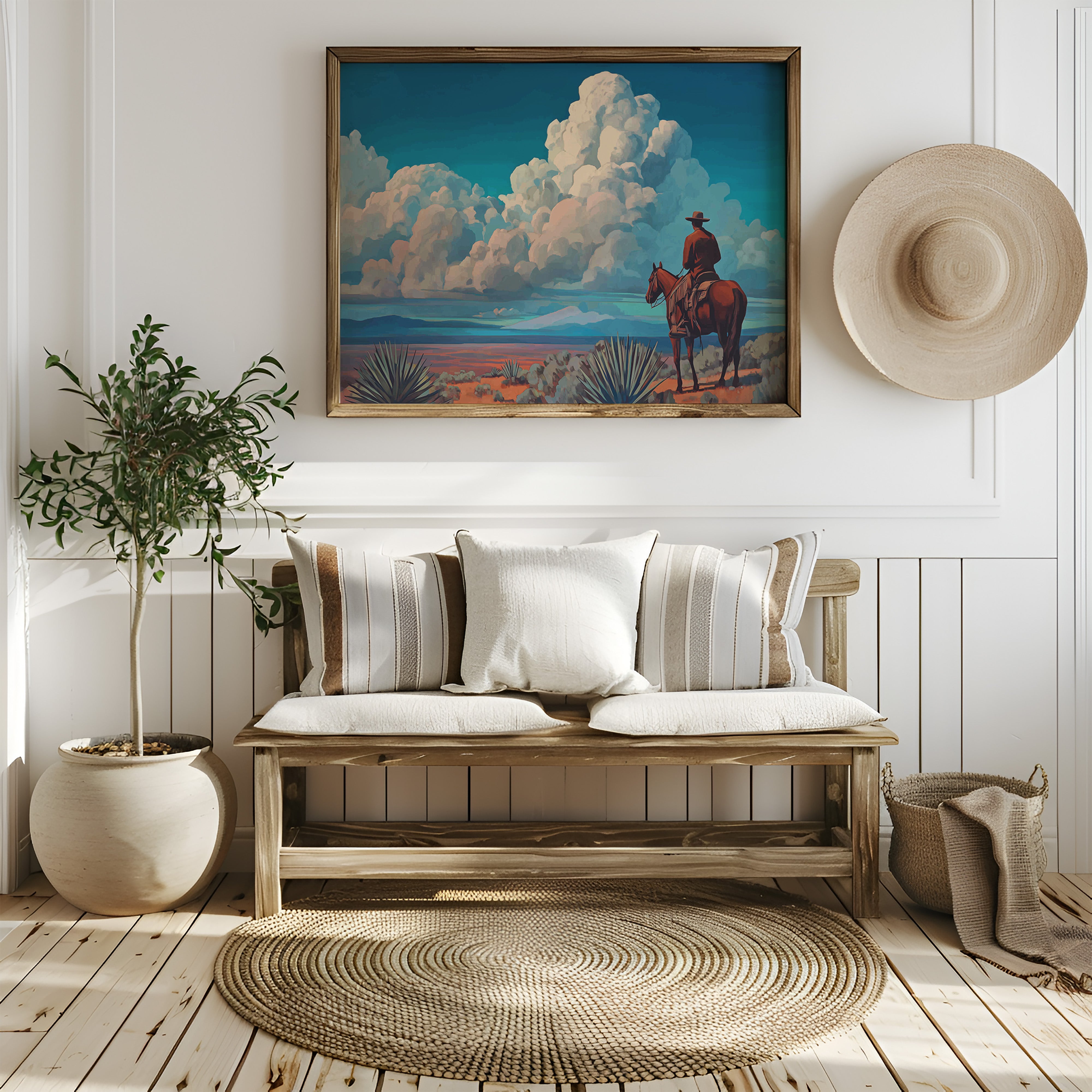 A lone rider pauses atop sun-baked hills, his silhouette stark against towering cumulus clouds that billow like celestial mountains in a turquoise sky. This piece from our Contemporary collection reimagines the classic American West through a bold, modern lens. Rich terra cotta earth tones dance with deep teals and soft coral highlights, while agave plants stand sentinel in the foreground like ancient desert guardians. The composition captures that breathless moment when nature's majesty demands stillness, even from the most restless soul. Perfect for adding a sense of adventure and contemplative beauty to a living room or study, where its dramatic sky and peaceful solitude can inspire daily moments of reflection.
