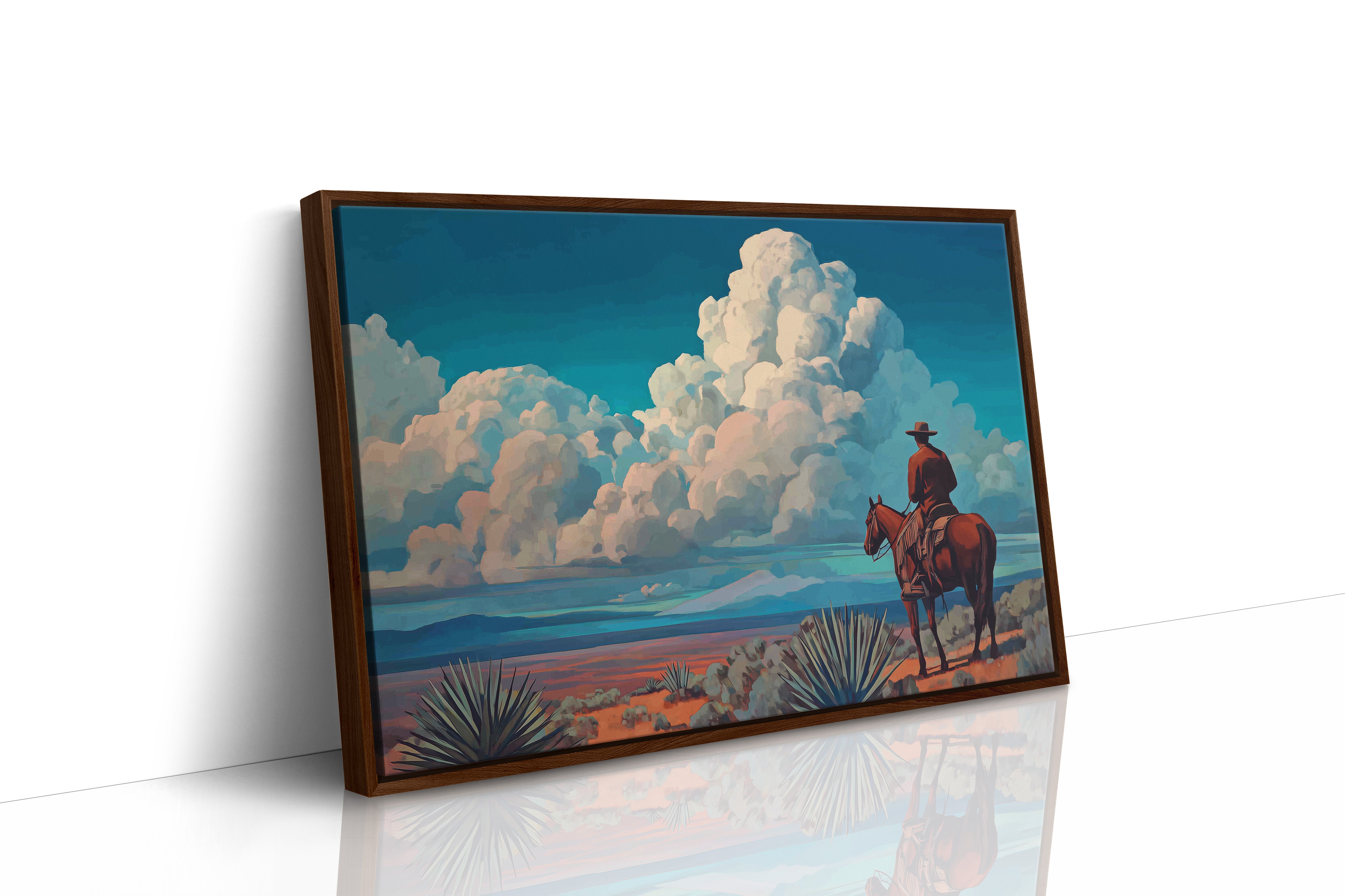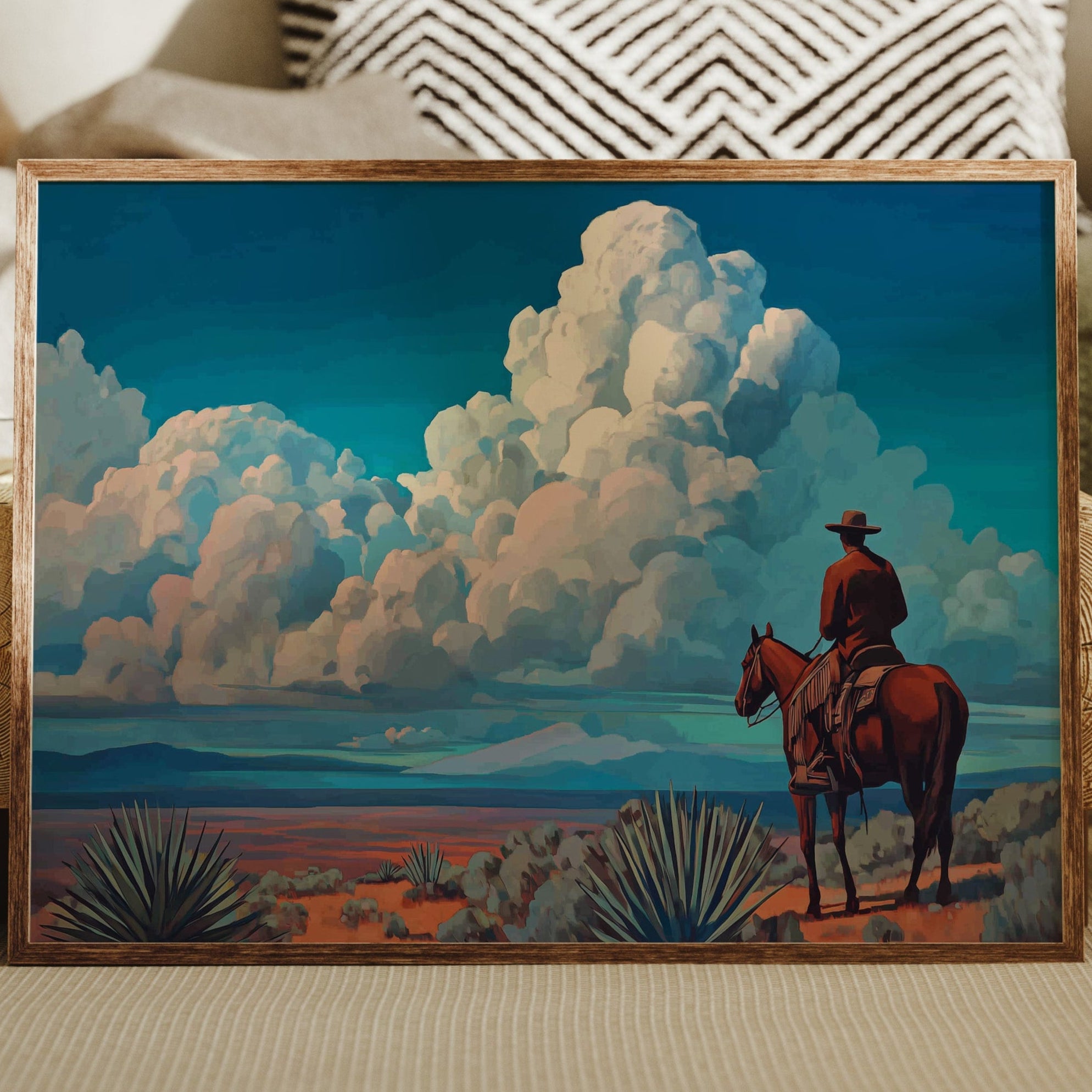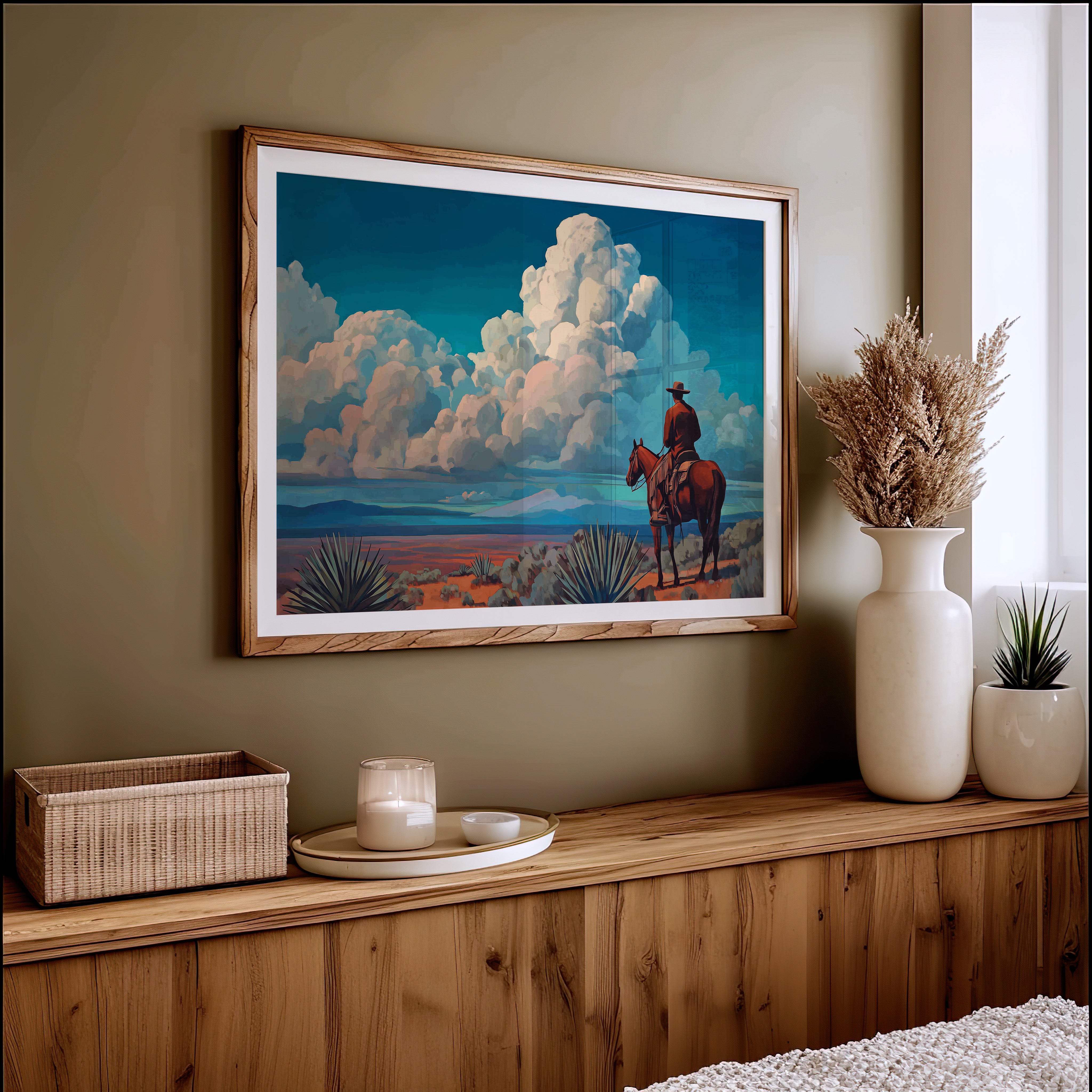 A lone rider pauses atop sun-baked hills, his silhouette stark against towering cumulus clouds that billow like celestial mountains in a turquoise sky. This piece from our Contemporary collection reimagines the classic American West through a bold, modern lens. Rich terra cotta earth tones dance with deep teals and soft coral highlights, while agave plants stand sentinel in the foreground like ancient desert guardians. The composition captures that breathless moment when nature's majesty demands stillness, even from the most restless soul. Perfect for adding a sense of adventure and contemplative beauty to a living room or study, where its dramatic sky and peaceful solitude can inspire daily moments of reflection.