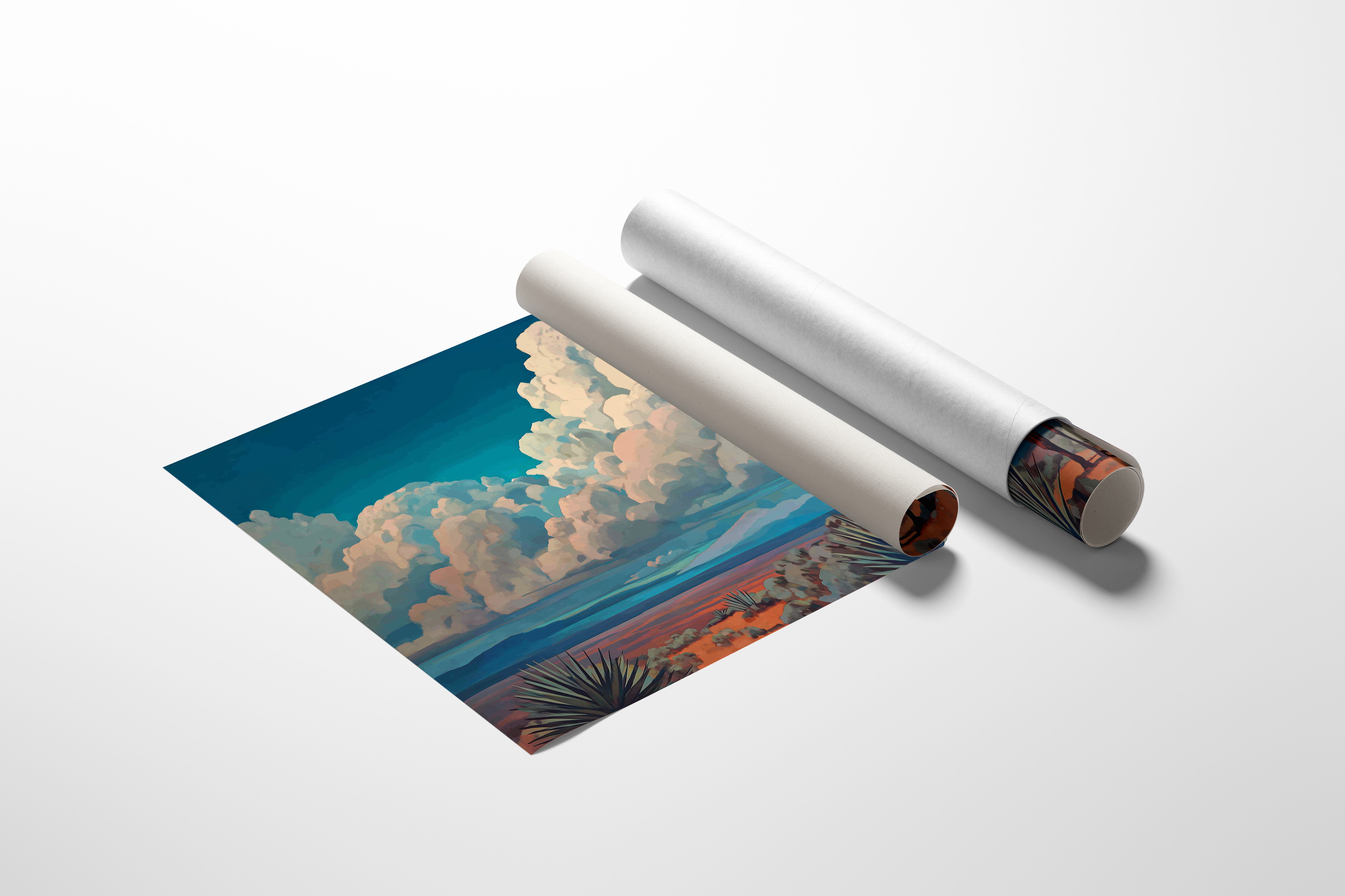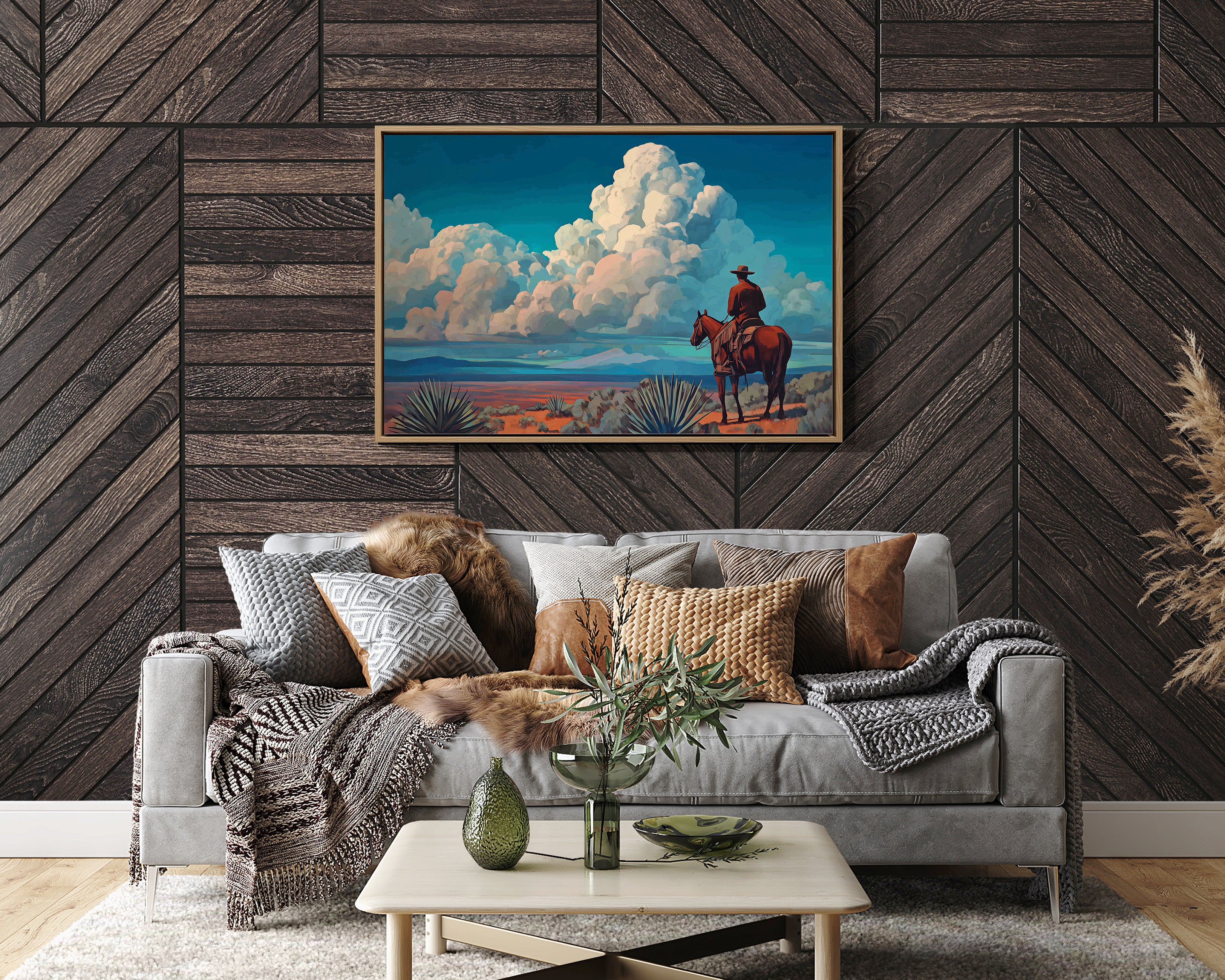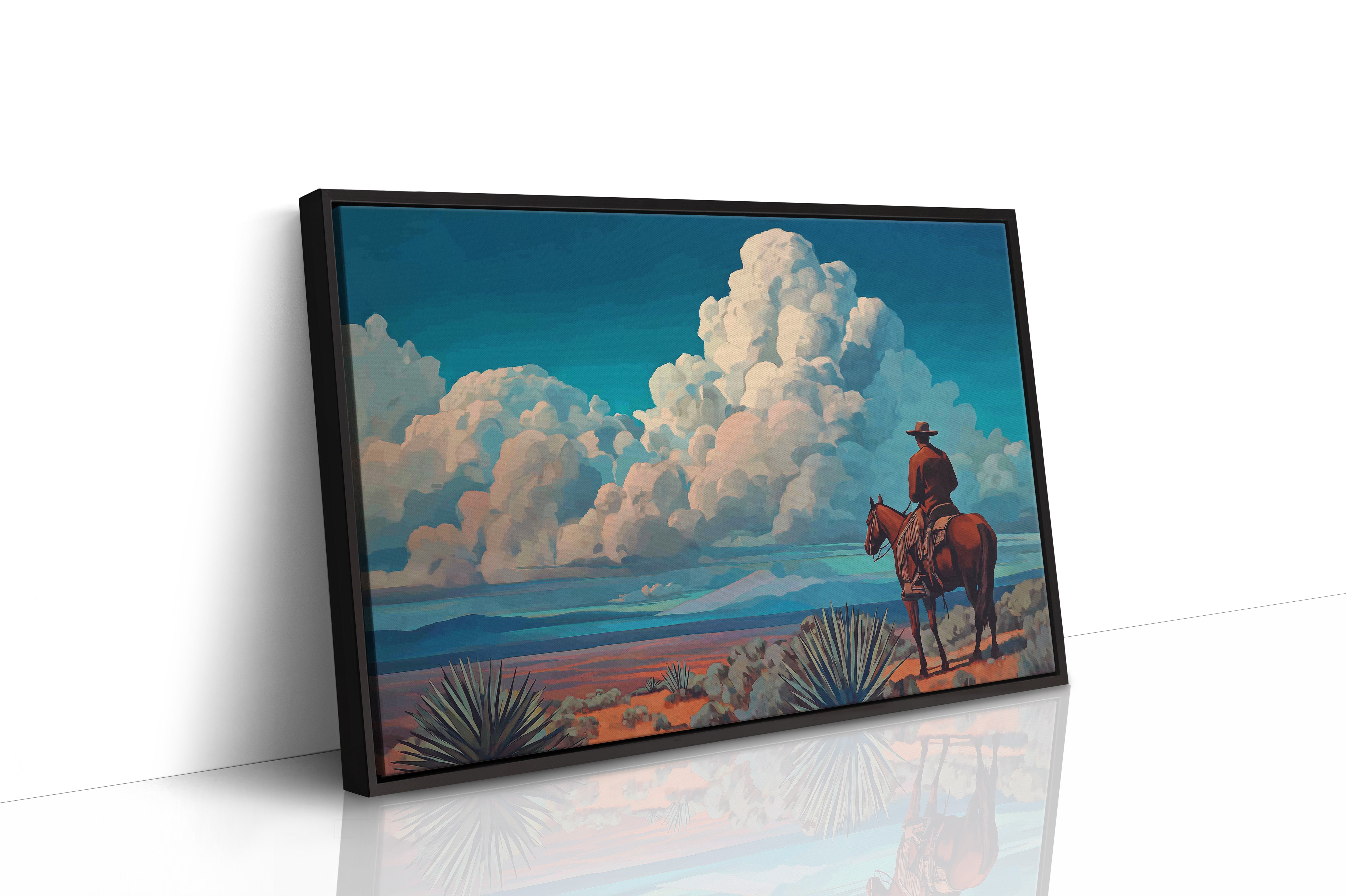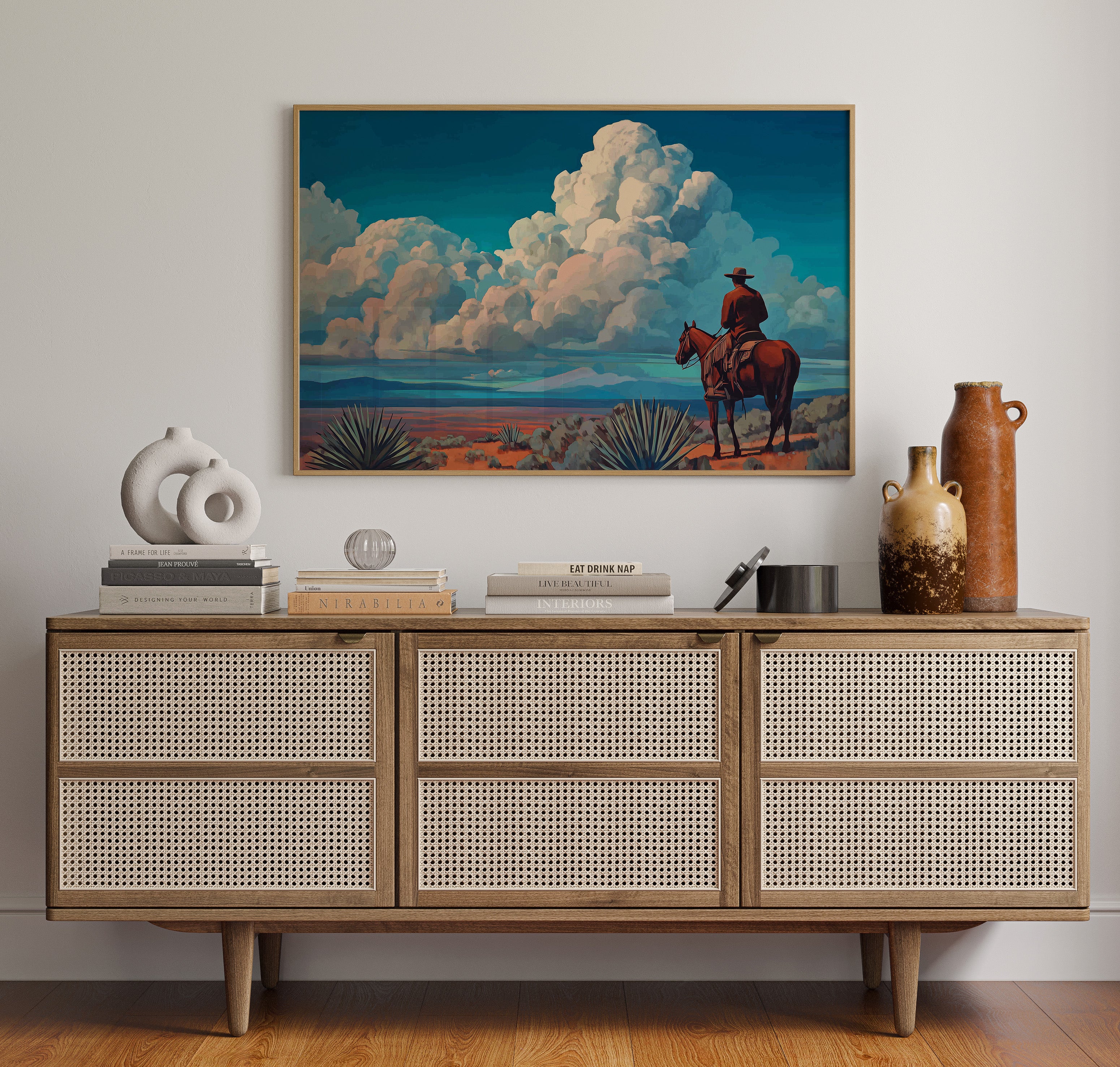 A lone rider pauses atop sun-baked hills, his silhouette stark against towering cumulus clouds that billow like celestial mountains in a turquoise sky. This piece from our Contemporary collection reimagines the classic American West through a bold, modern lens. Rich terra cotta earth tones dance with deep teals and soft coral highlights, while agave plants stand sentinel in the foreground like ancient desert guardians. The composition captures that breathless moment when nature's majesty demands stillness, even from the most restless soul. Perfect for adding a sense of adventure and contemplative beauty to a living room or study, where its dramatic sky and peaceful solitude can inspire daily moments of reflection.