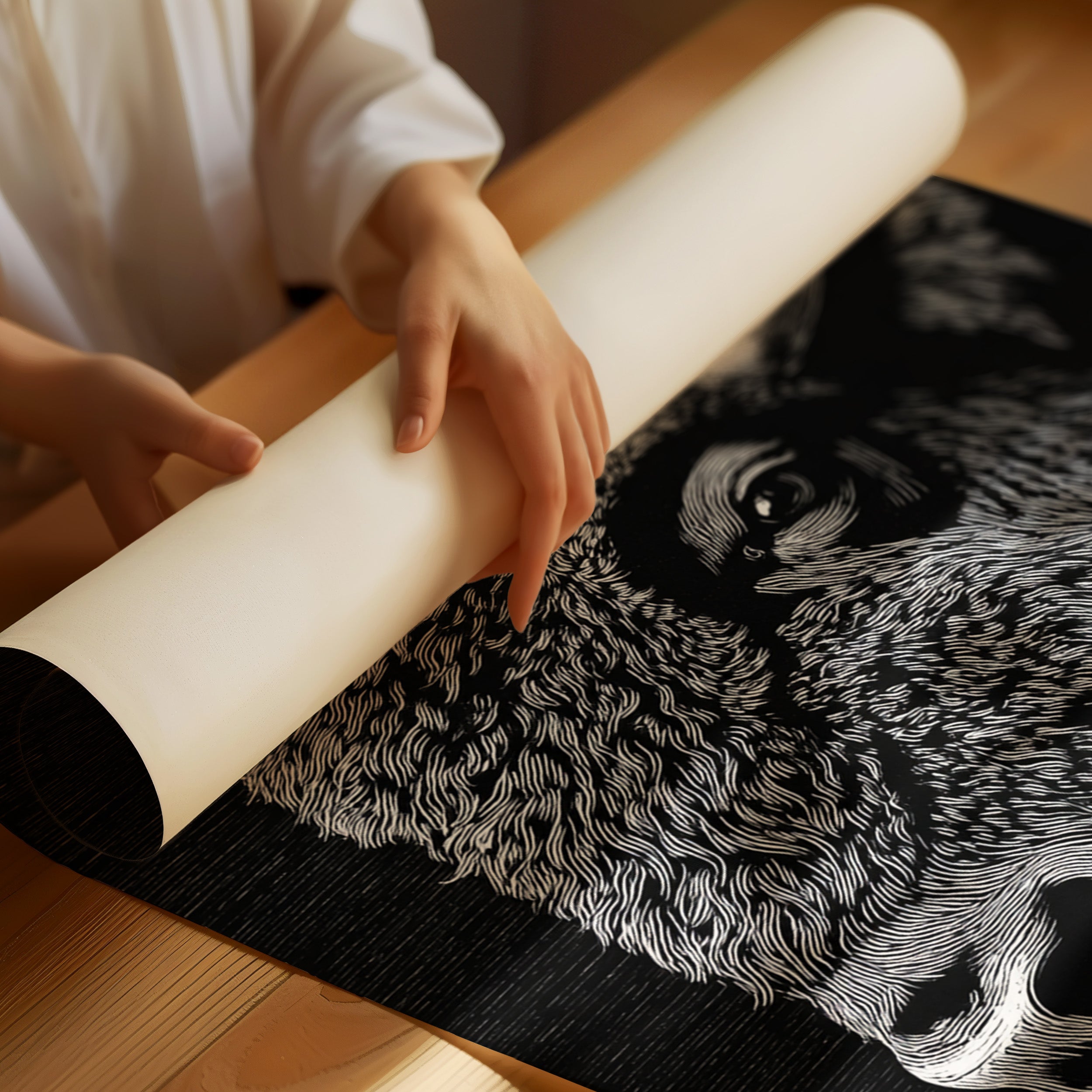 Part of our Master Printmaker collection, this stunning black and white piece honors the classical techniques of woodcut and engraving that defined American artistic heritage. The intricate line work and dramatic contrast create a sense of timeless majesty that transforms this iconic creature into a work of enduring art.