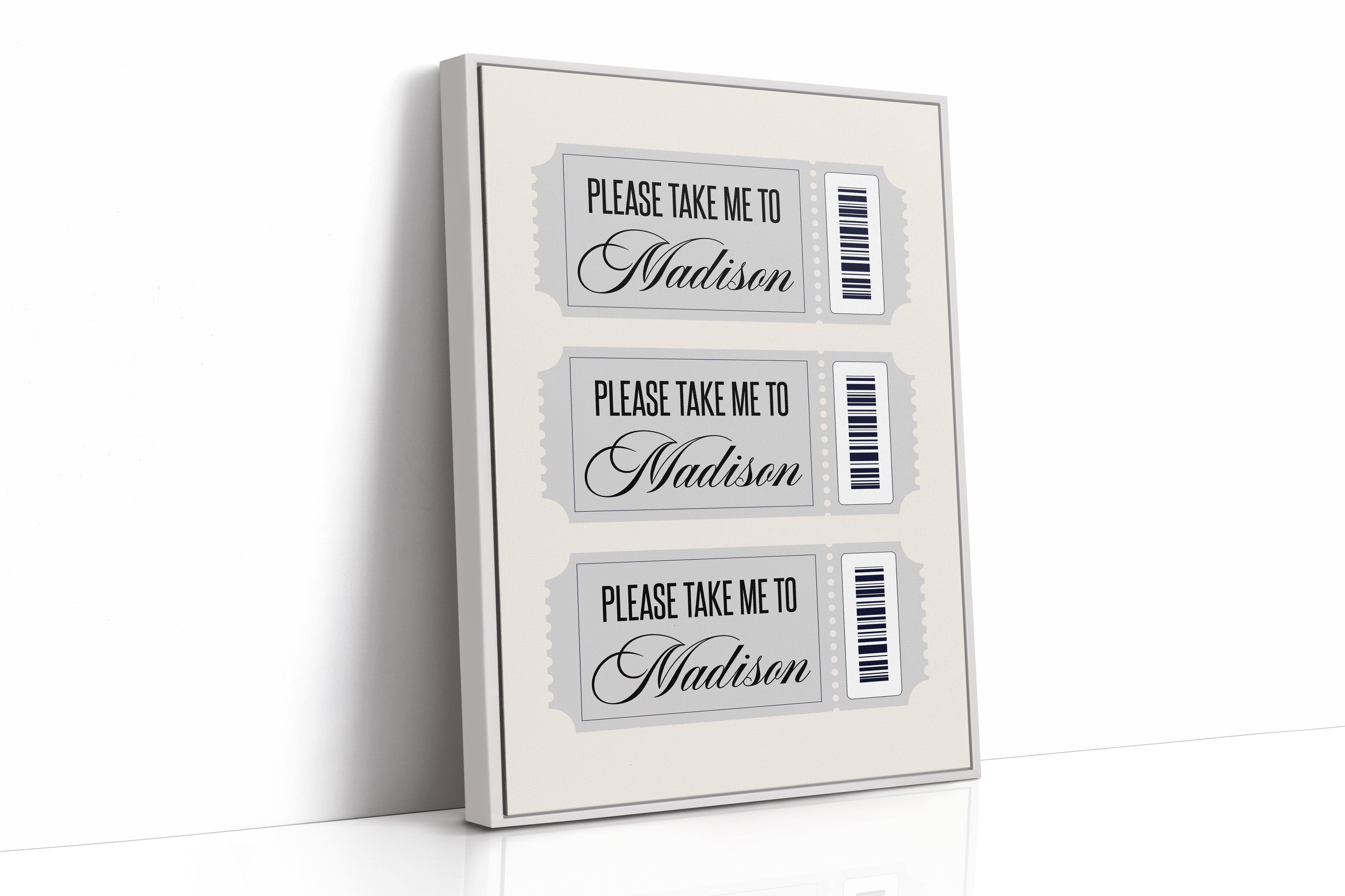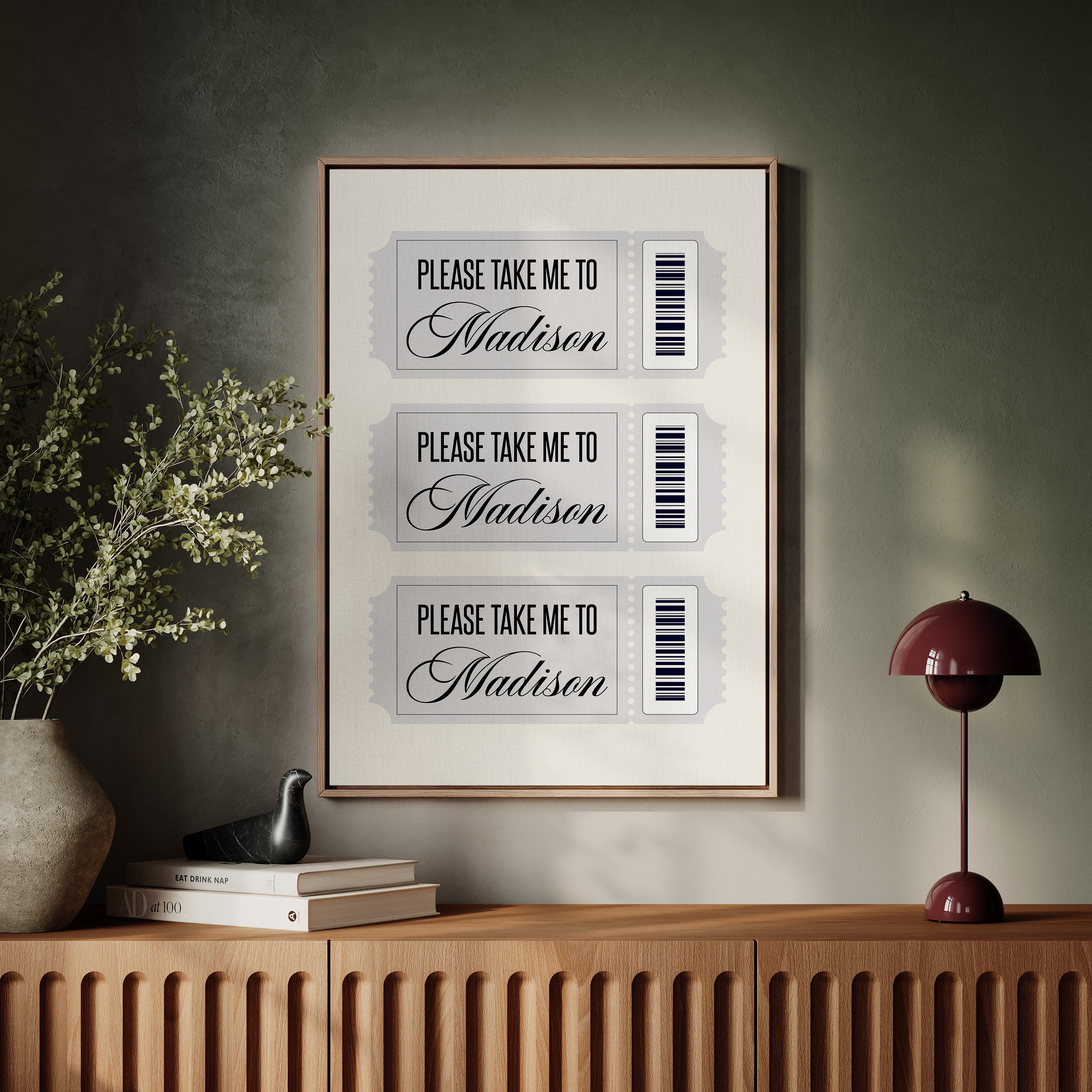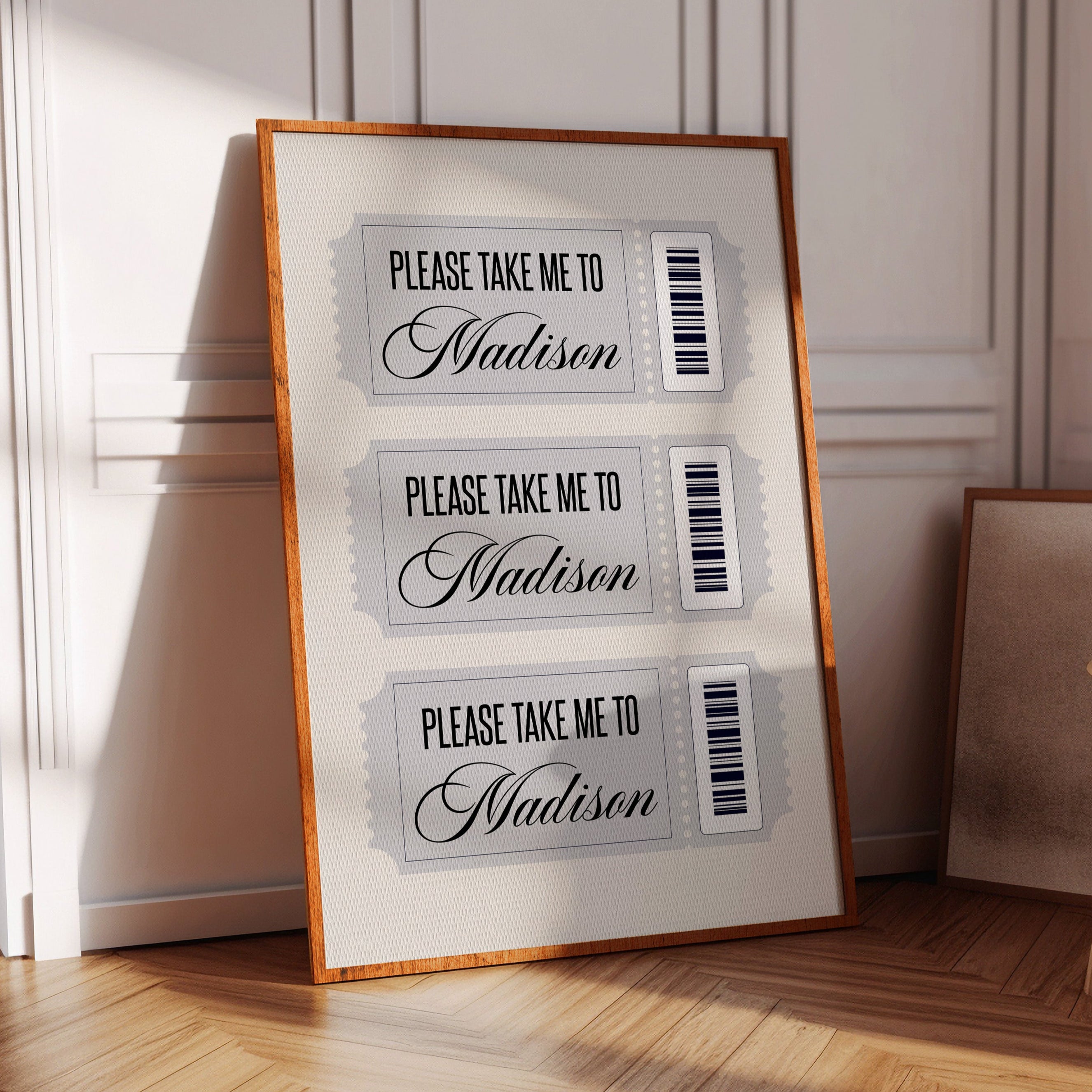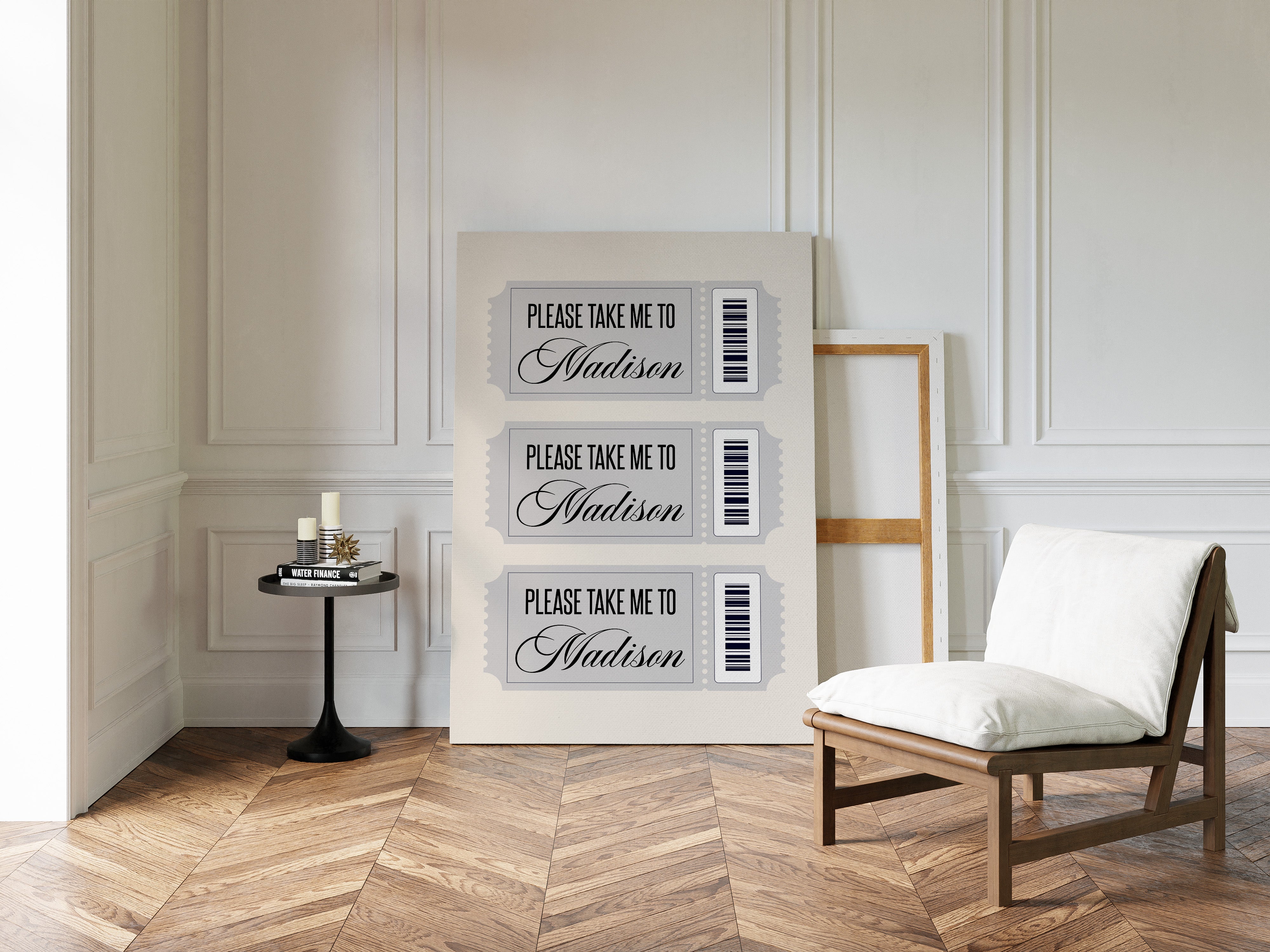 Three silver admission tickets hold the promise of adventure, each bearing an elegant invitation to Madison. The clean, minimalist design combines bold sans-serif typography with flowing script, creating a striking contrast against the pale gray background. The perforated edges and barcodes add authentic detail, while the repeated phrase ""Please Take Me To"" speaks to wanderlust and possibility. Perfect for a modern home office or travel-themed gallery wall, these tickets symbolize the anticipation of journeys yet to come.