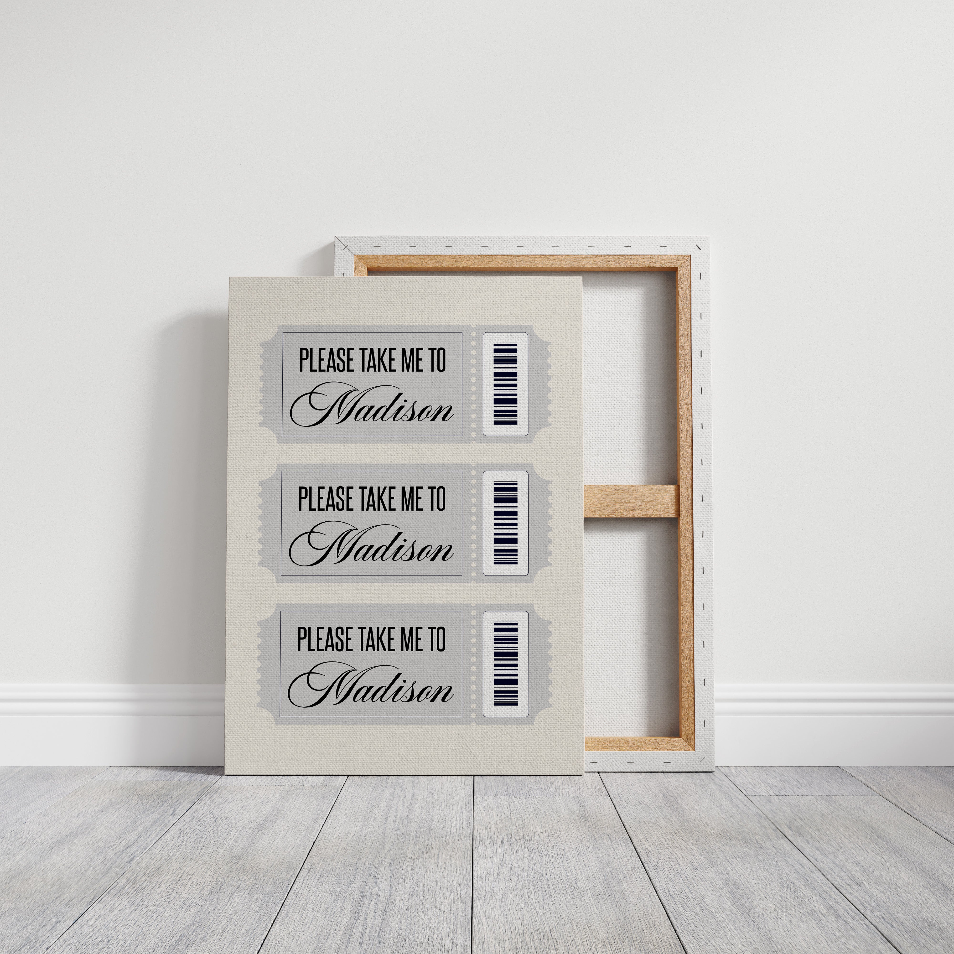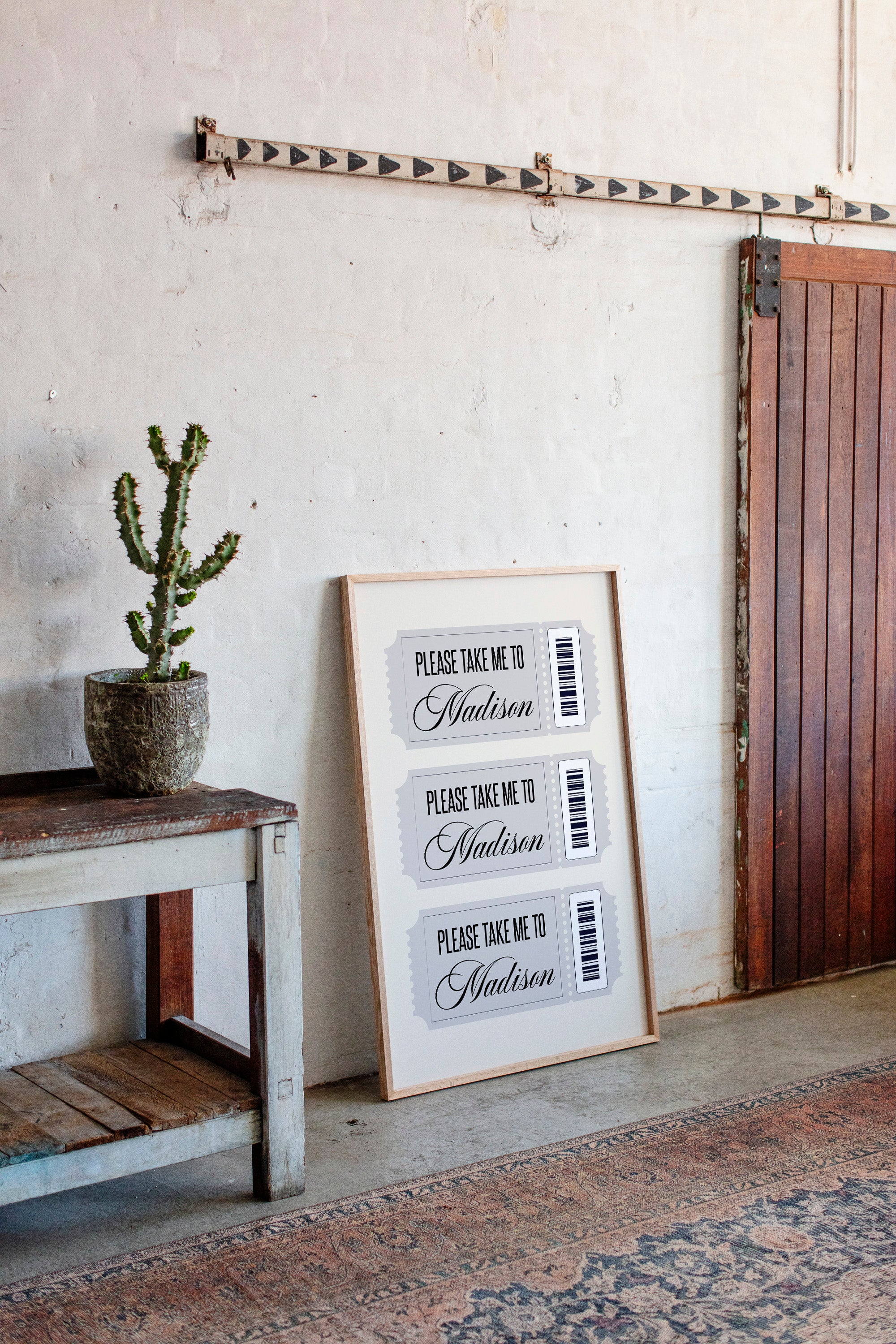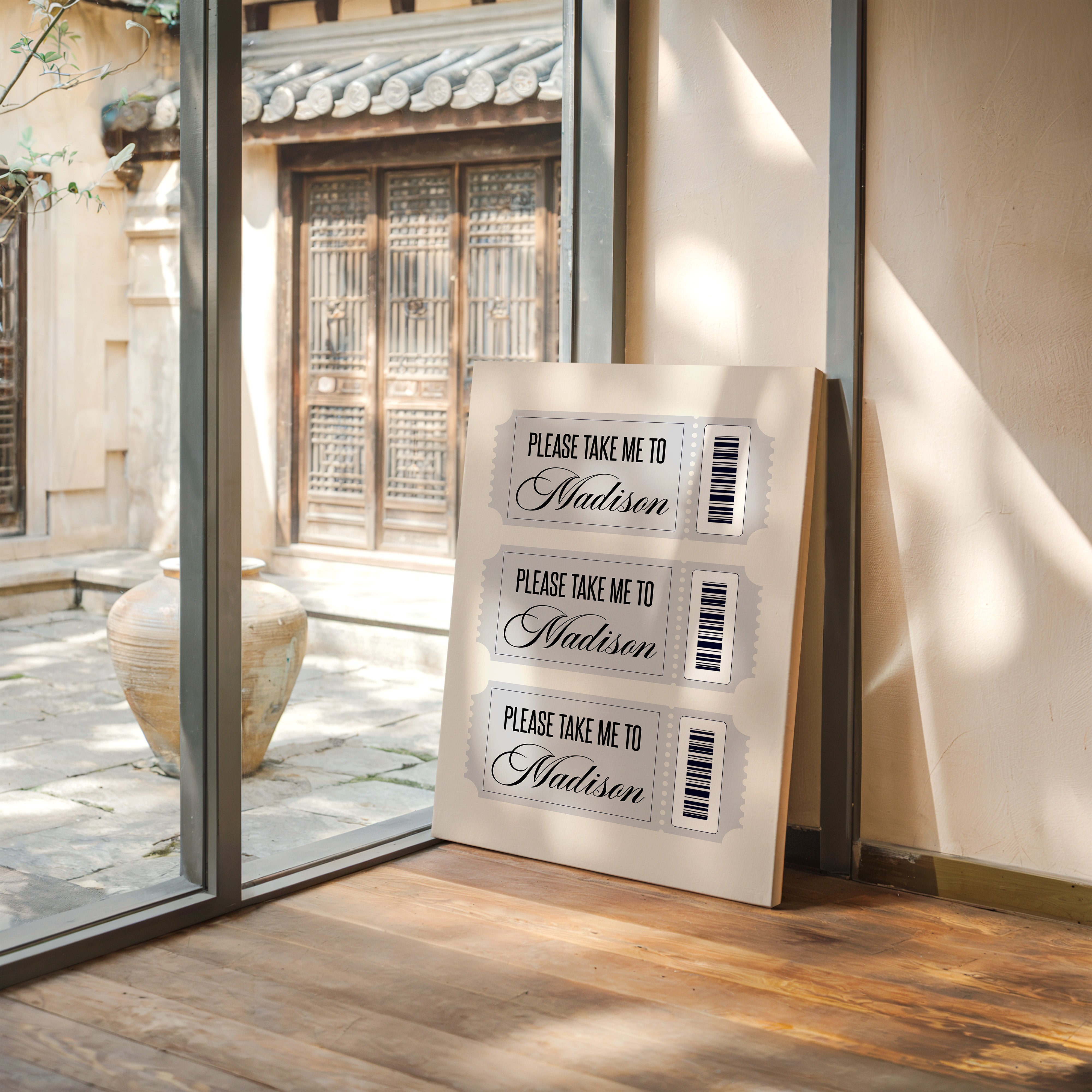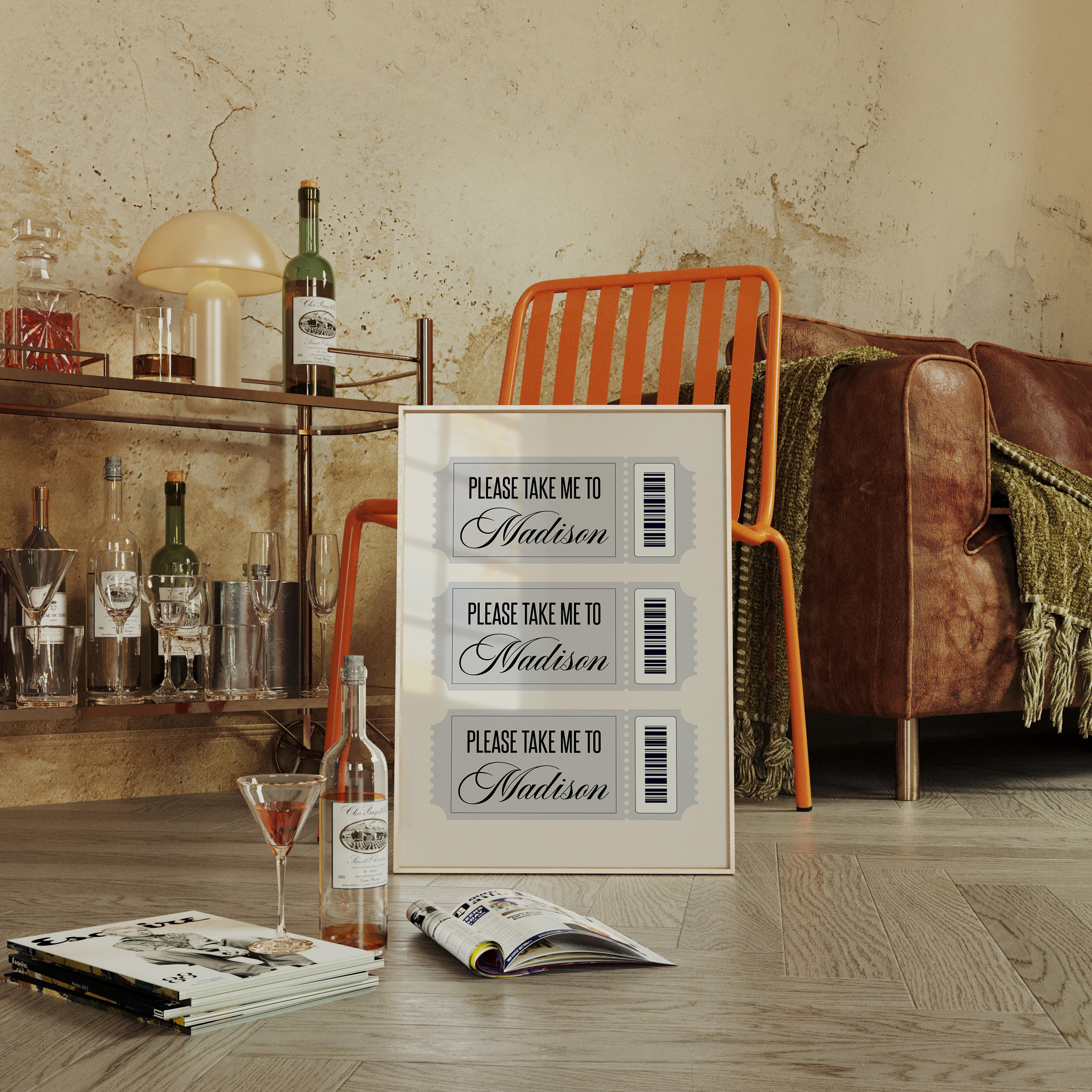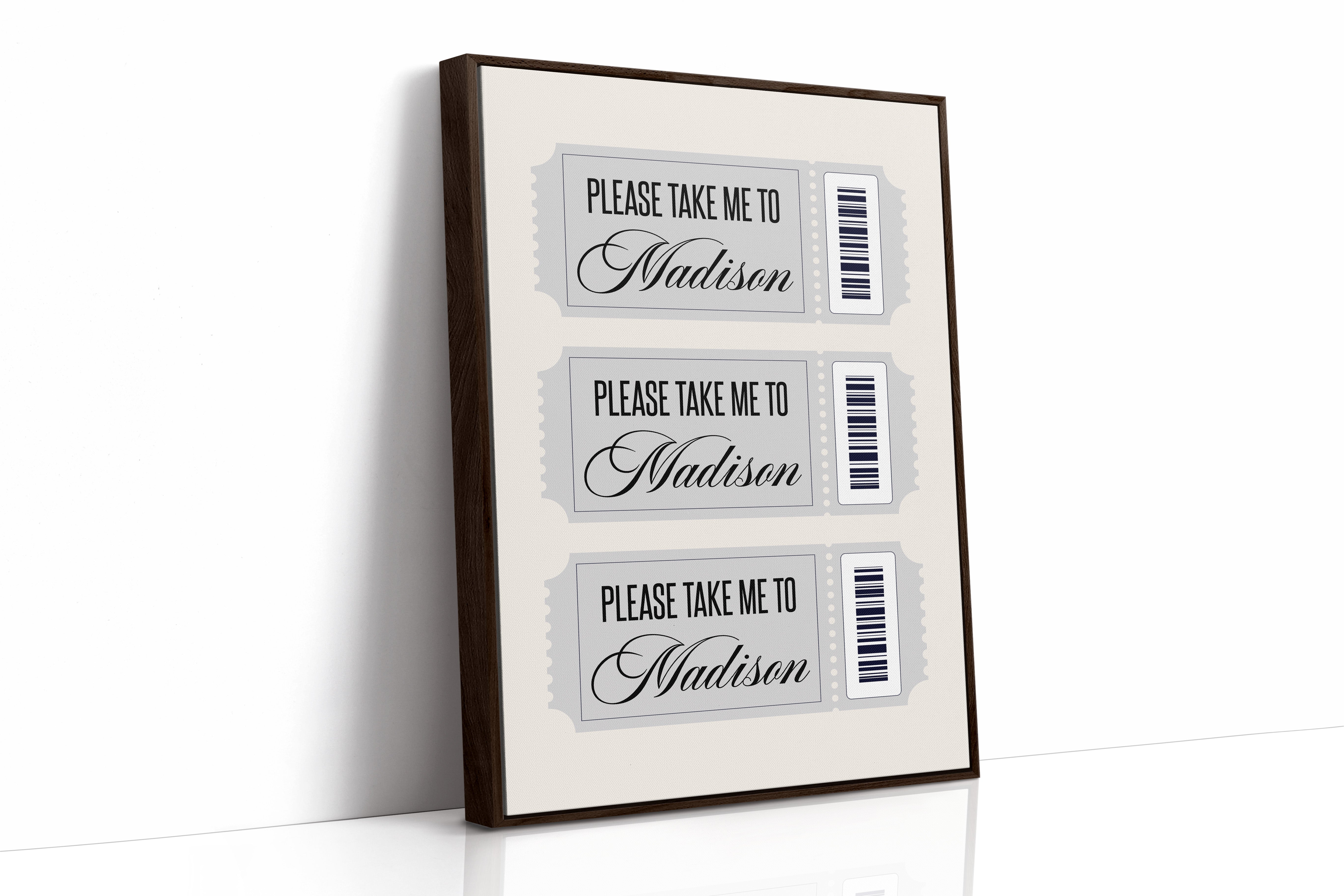 Three silver admission tickets hold the promise of adventure, each bearing an elegant invitation to Madison. The clean, minimalist design combines bold sans-serif typography with flowing script, creating a striking contrast against the pale gray background. The perforated edges and barcodes add authentic detail, while the repeated phrase ""Please Take Me To"" speaks to wanderlust and possibility. Perfect for a modern home office or travel-themed gallery wall, these tickets symbolize the anticipation of journeys yet to come.