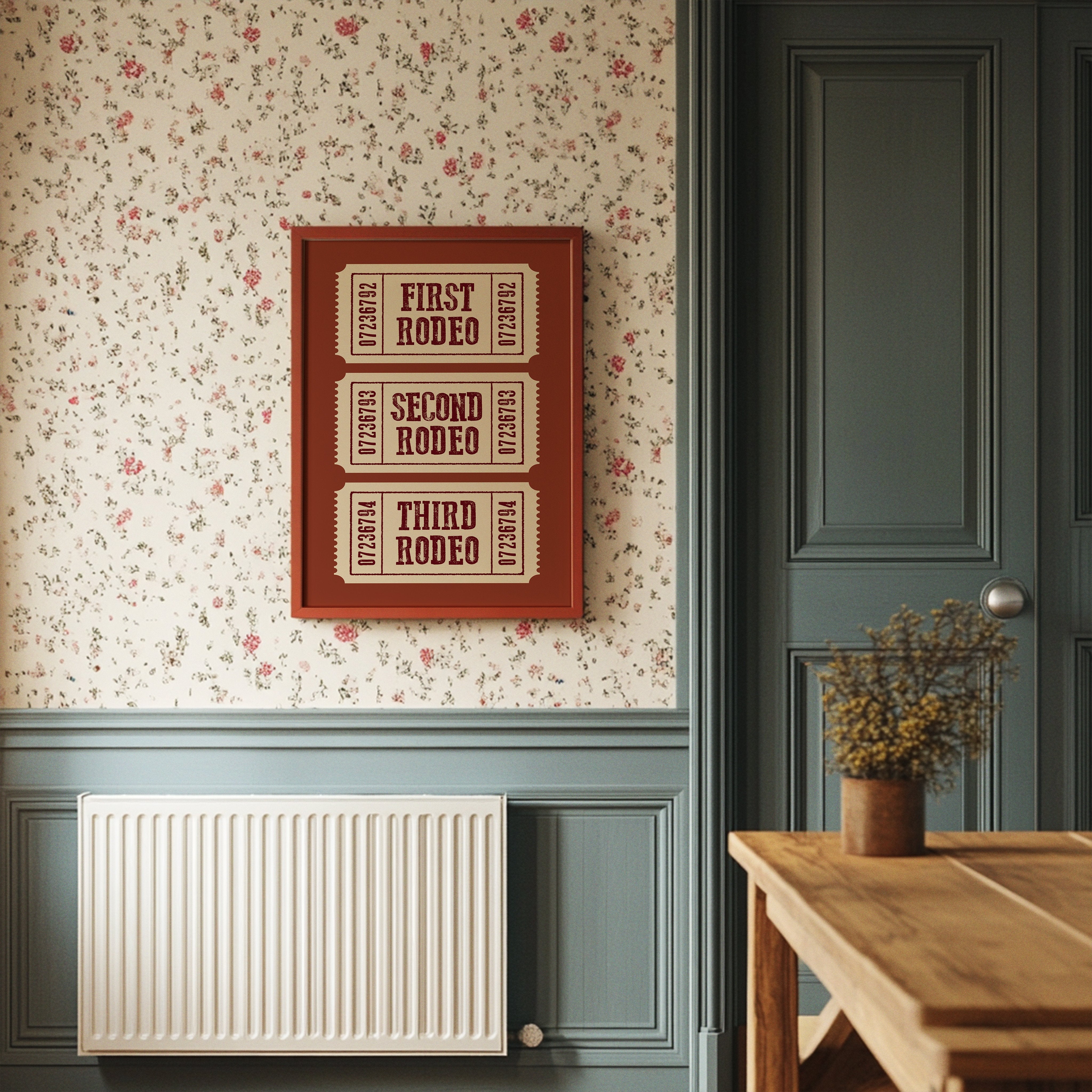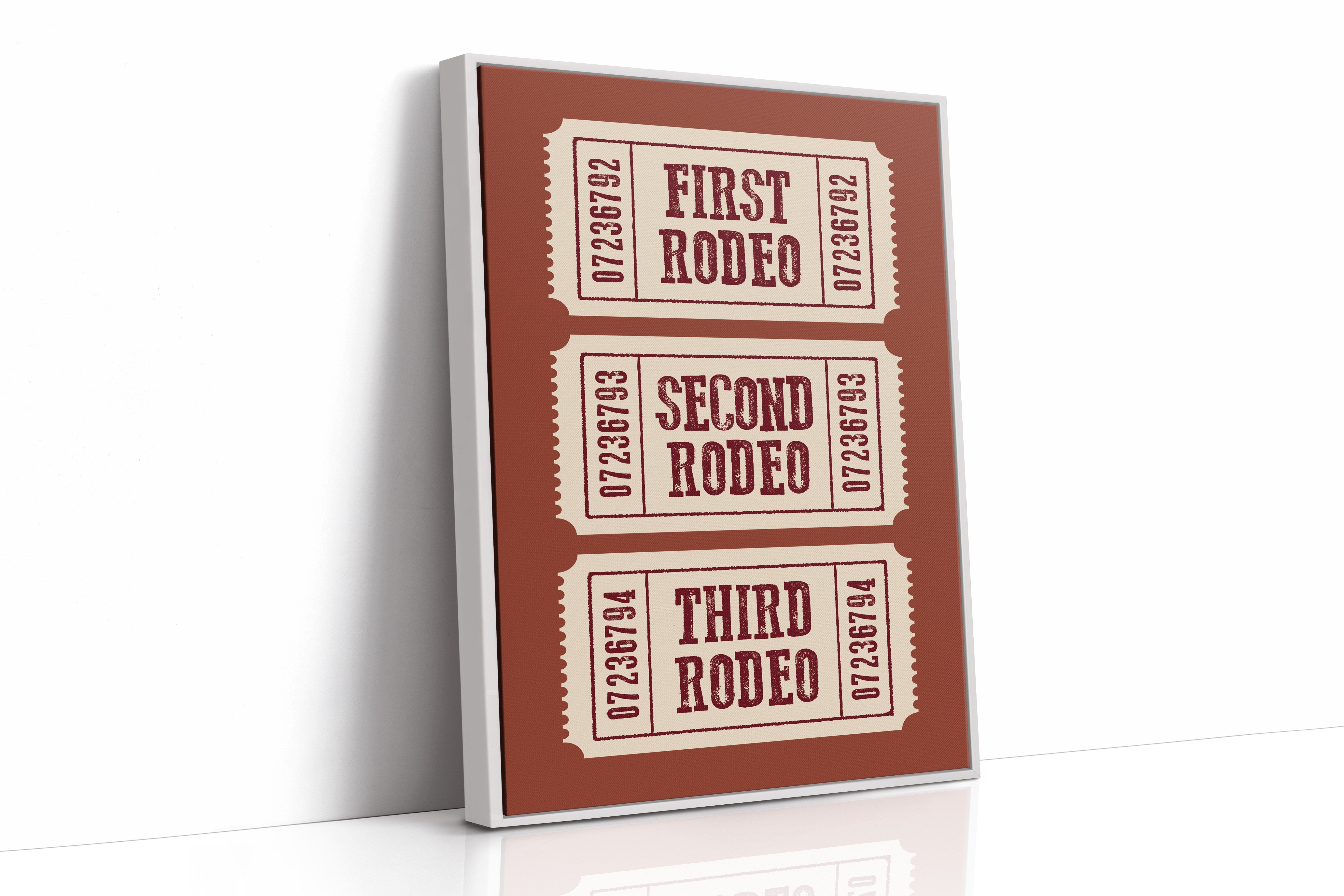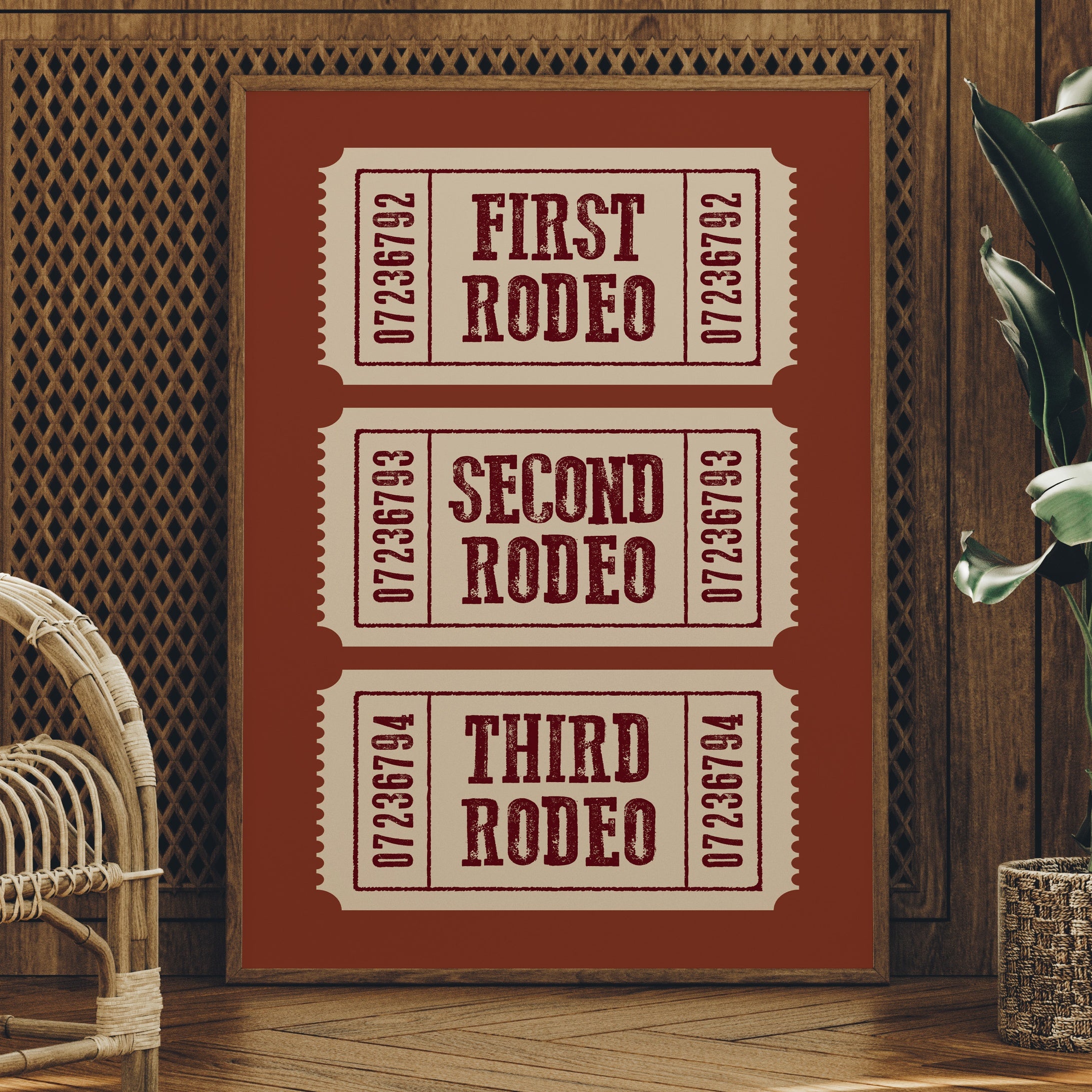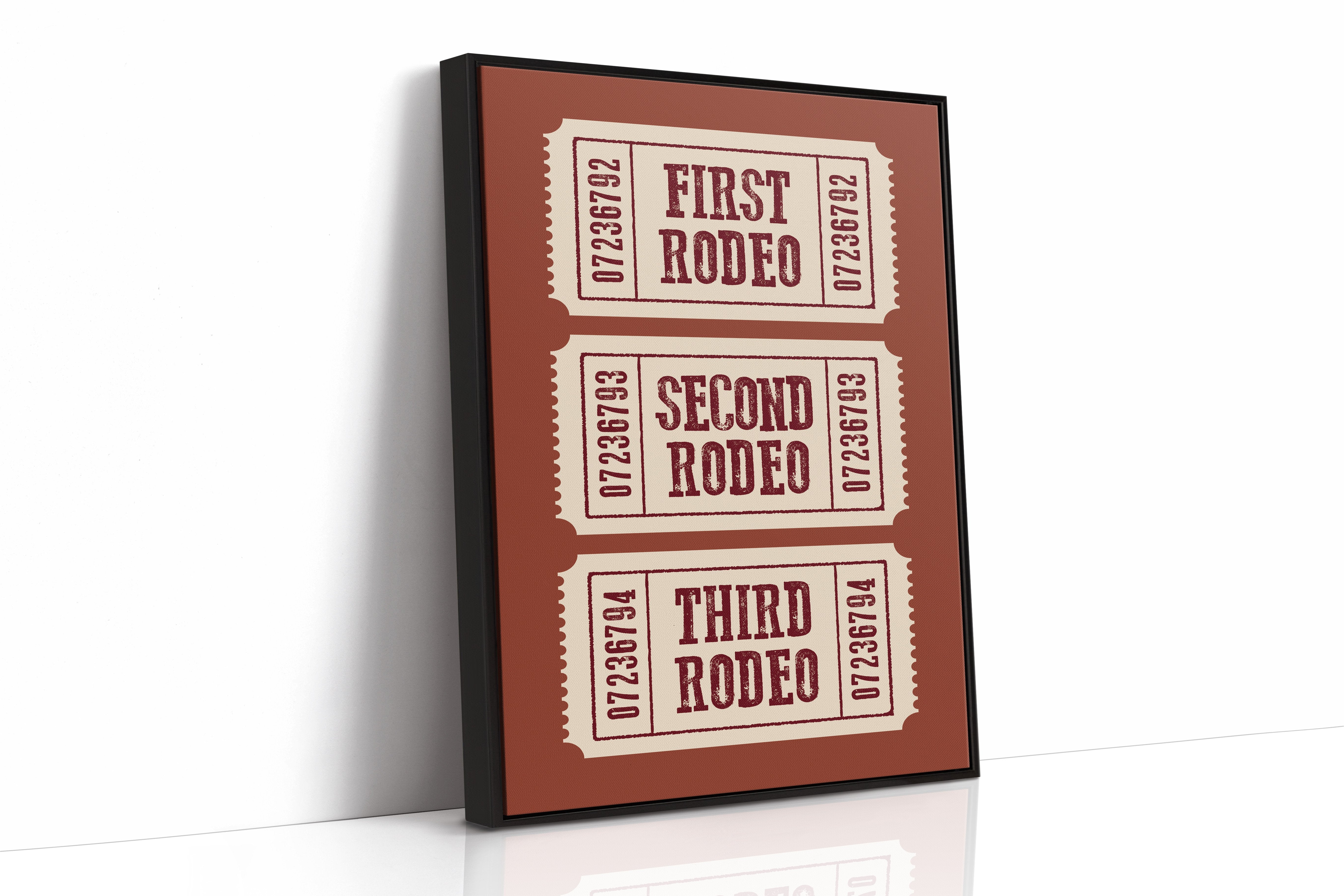The rich terracotta backdrop frames three vintage admission tickets, each promising entry to a world of bucking broncos and cheering crowds. The weathered typography in deep burgundy against cream paper carries the nostalgic weight of American tradition, complete with the textured imperfections of hand-pressed printing. These numbered stubs tell stories of hat-tipping cowboys, thundering hooves, and the raw excitement of western heritage preserved in time. This piece brings rustic charm to home offices, ranch-style living rooms, or any space celebrating Americana and western culture. A perfect conversation starter for those who appreciate the rugged romance of rodeo history.