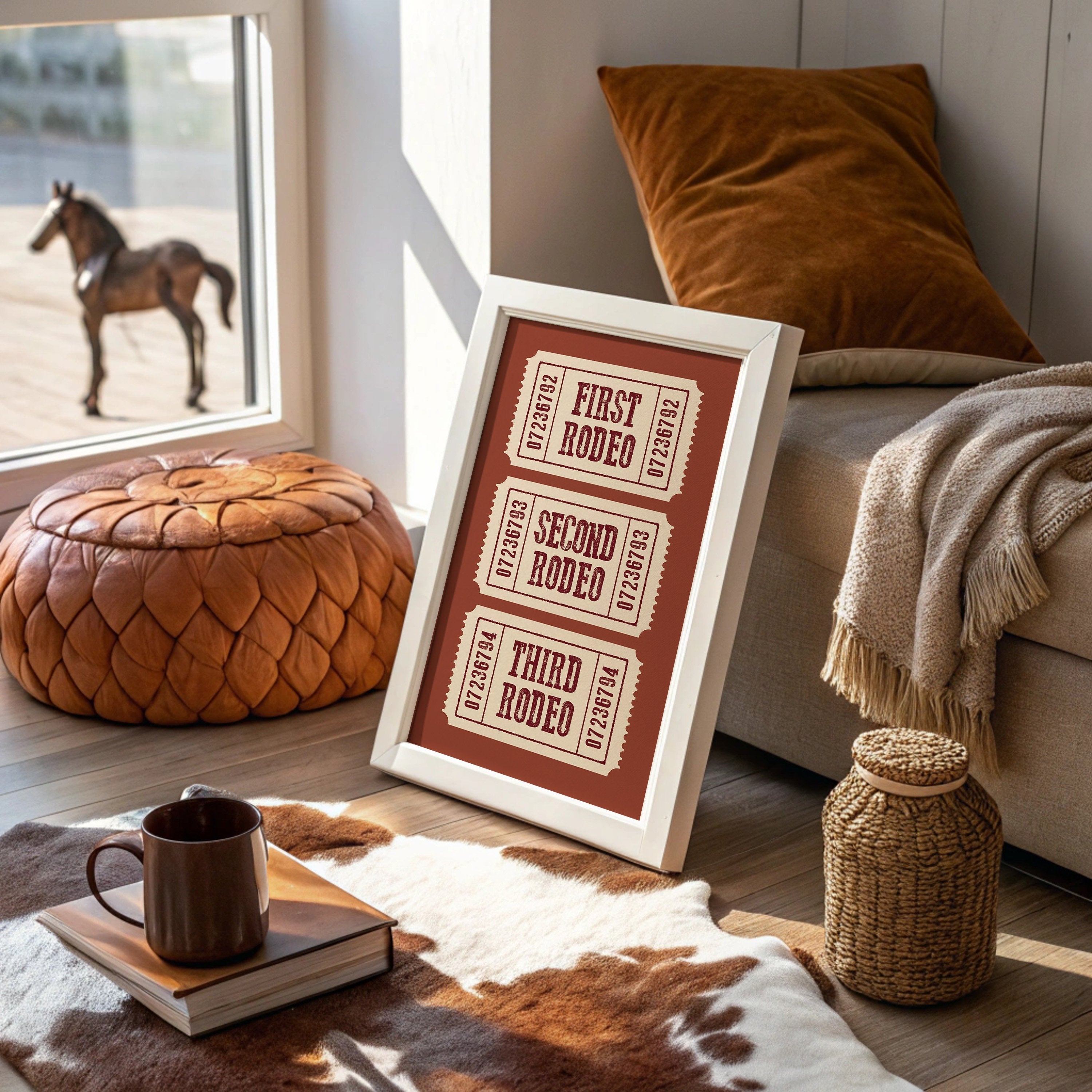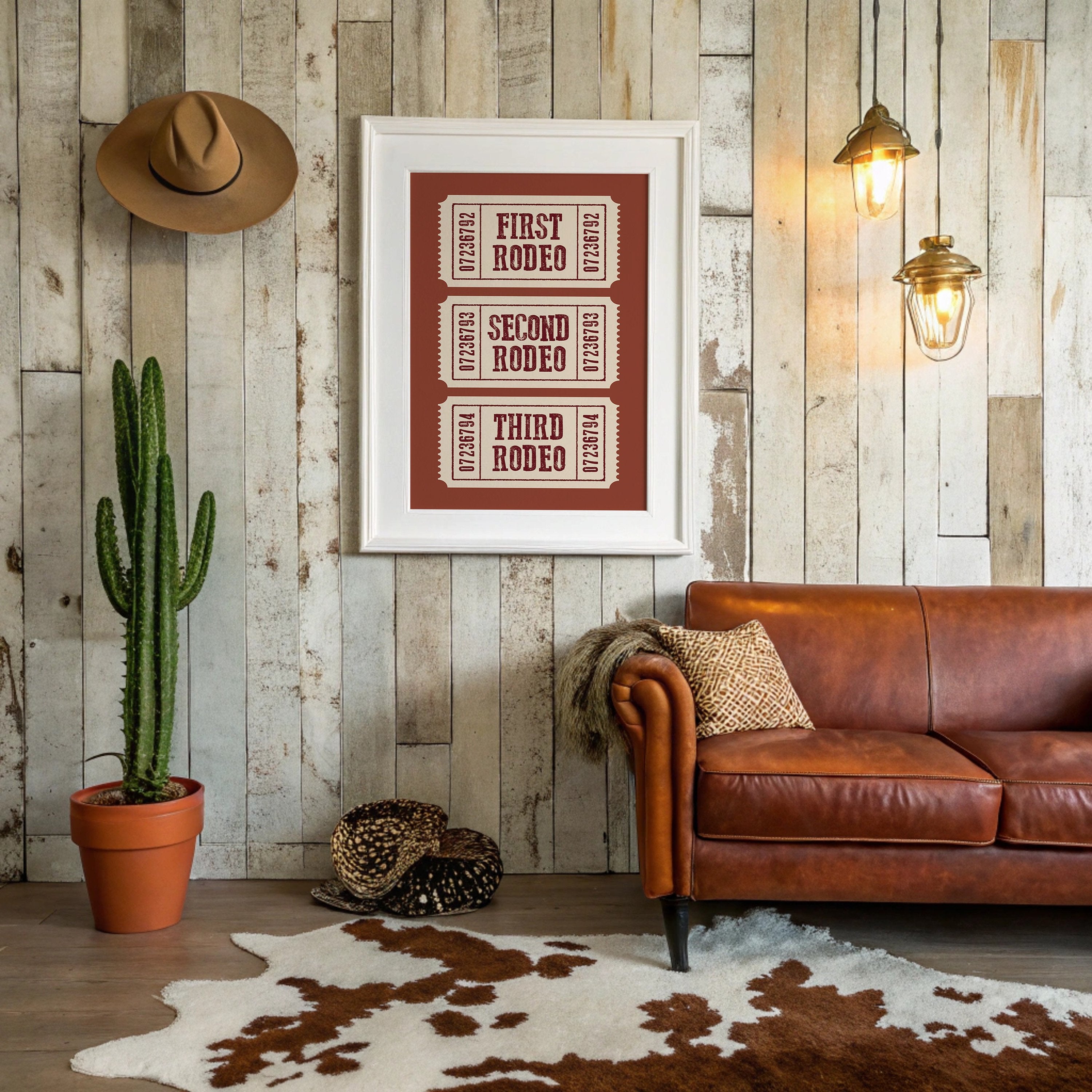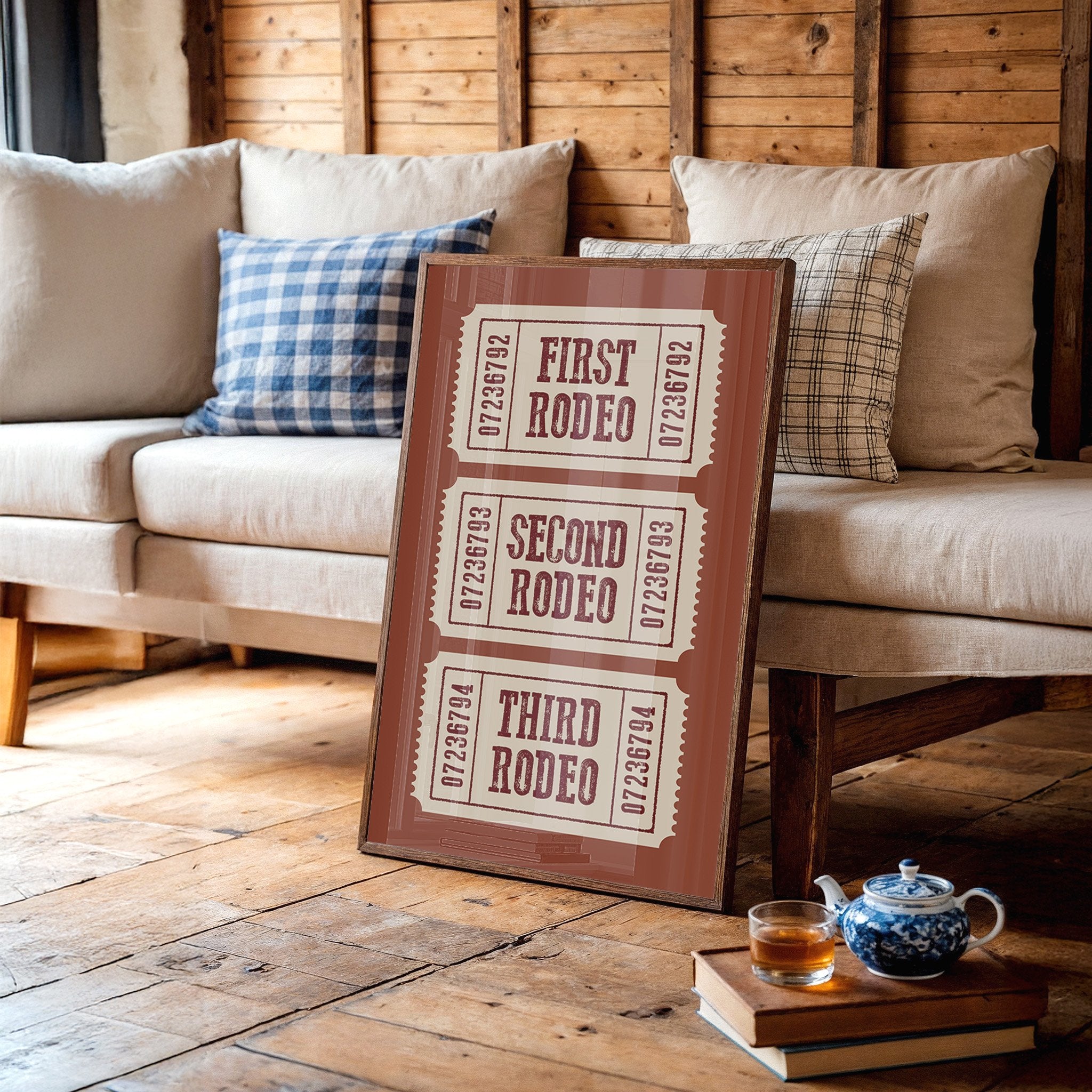 The rich terracotta backdrop frames three vintage admission tickets, each promising entry to a world of bucking broncos and cheering crowds. The weathered typography in deep burgundy against cream paper carries the nostalgic weight of American tradition, complete with the textured imperfections of hand-pressed printing. These numbered stubs tell stories of hat-tipping cowboys, thundering hooves, and the raw excitement of western heritage preserved in time. This piece brings rustic charm to home offices, ranch-style living rooms, or any space celebrating Americana and western culture. A perfect conversation starter for those who appreciate the rugged romance of rodeo history.
