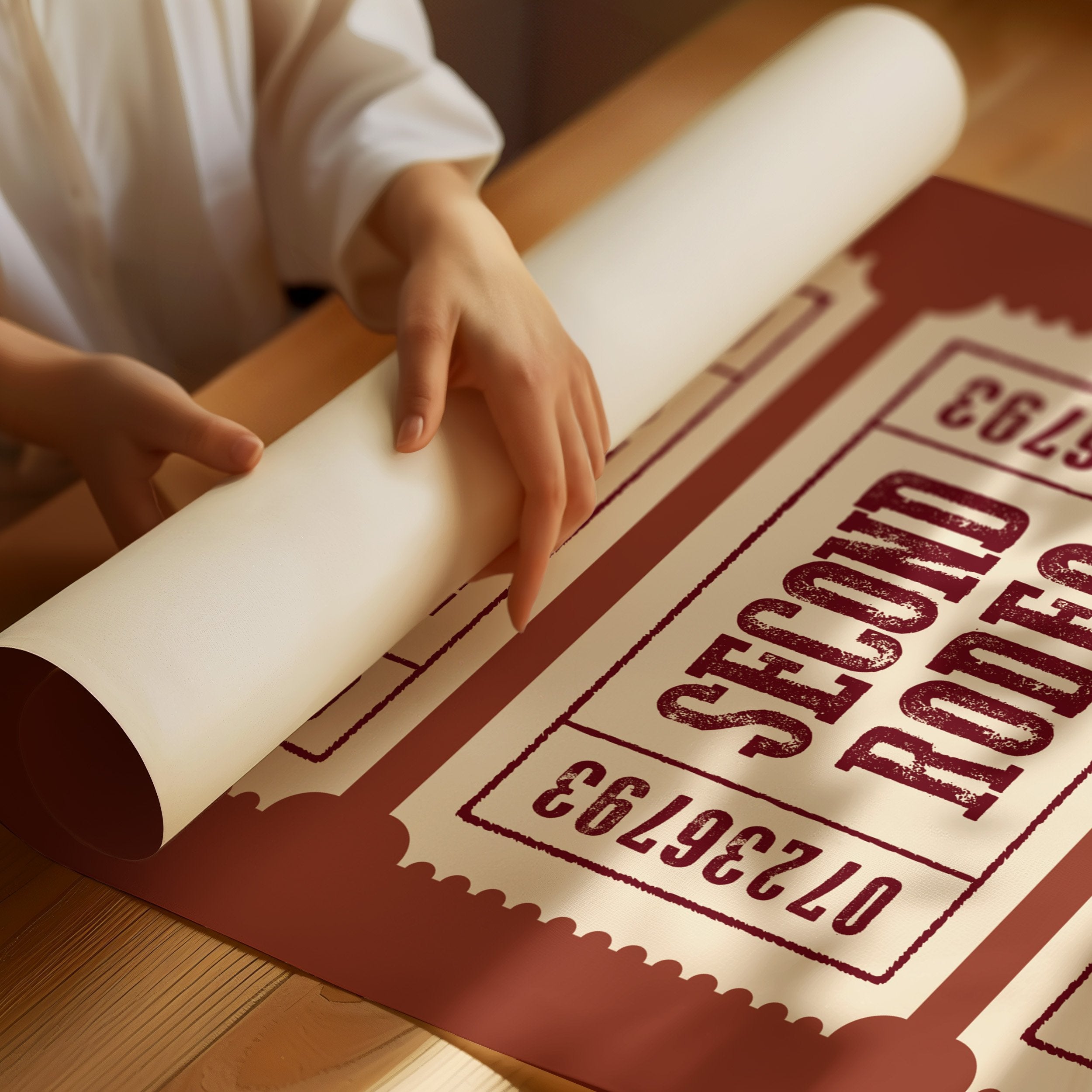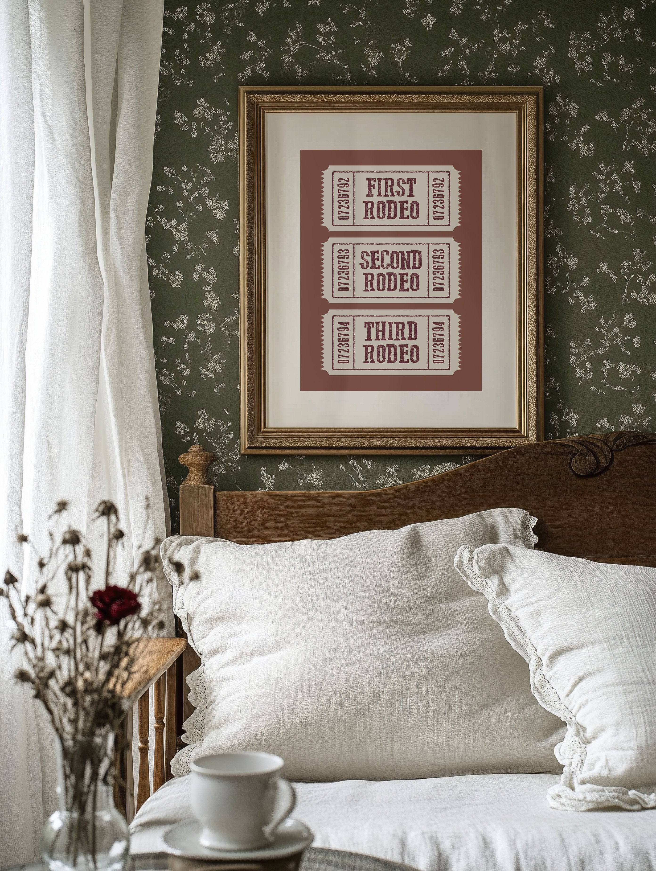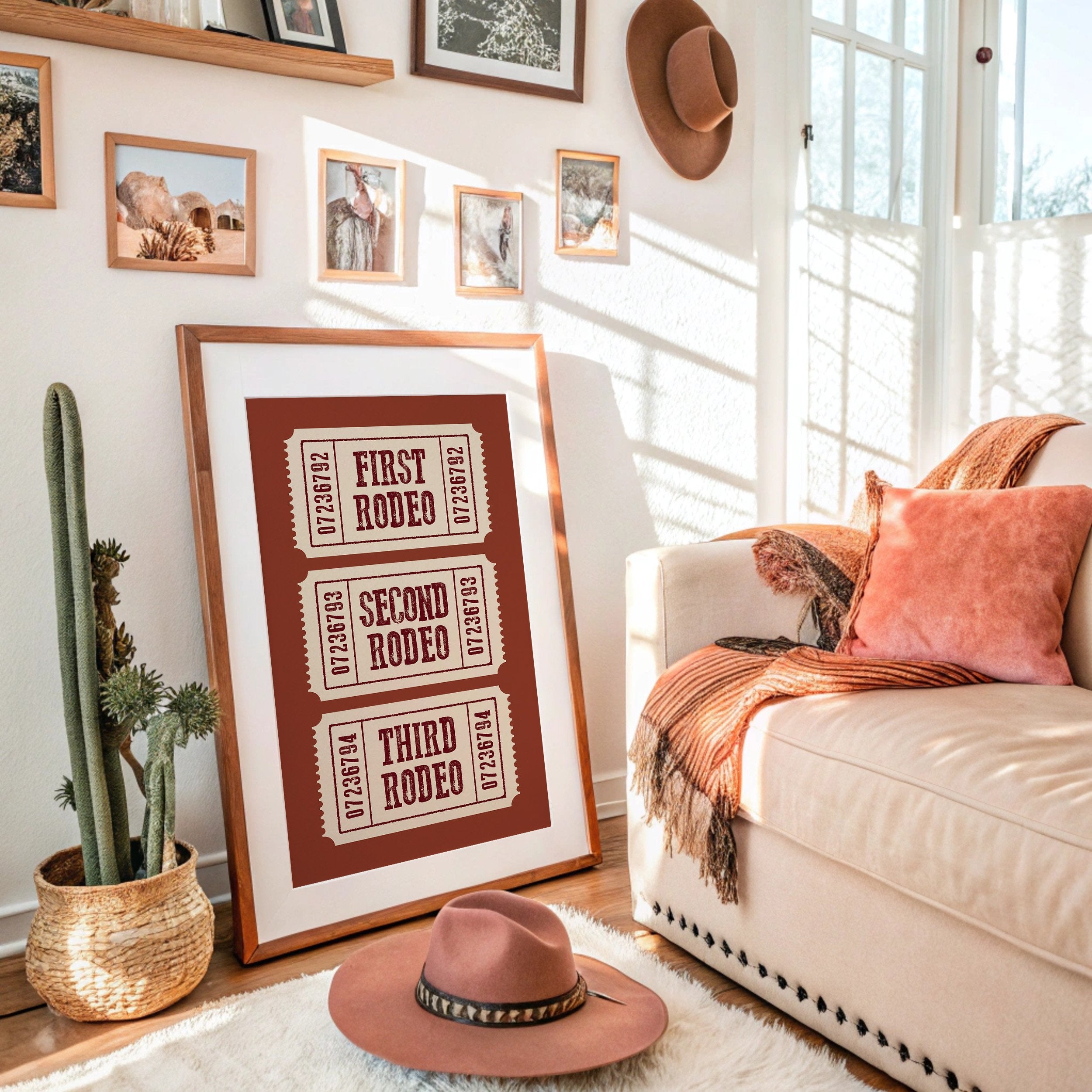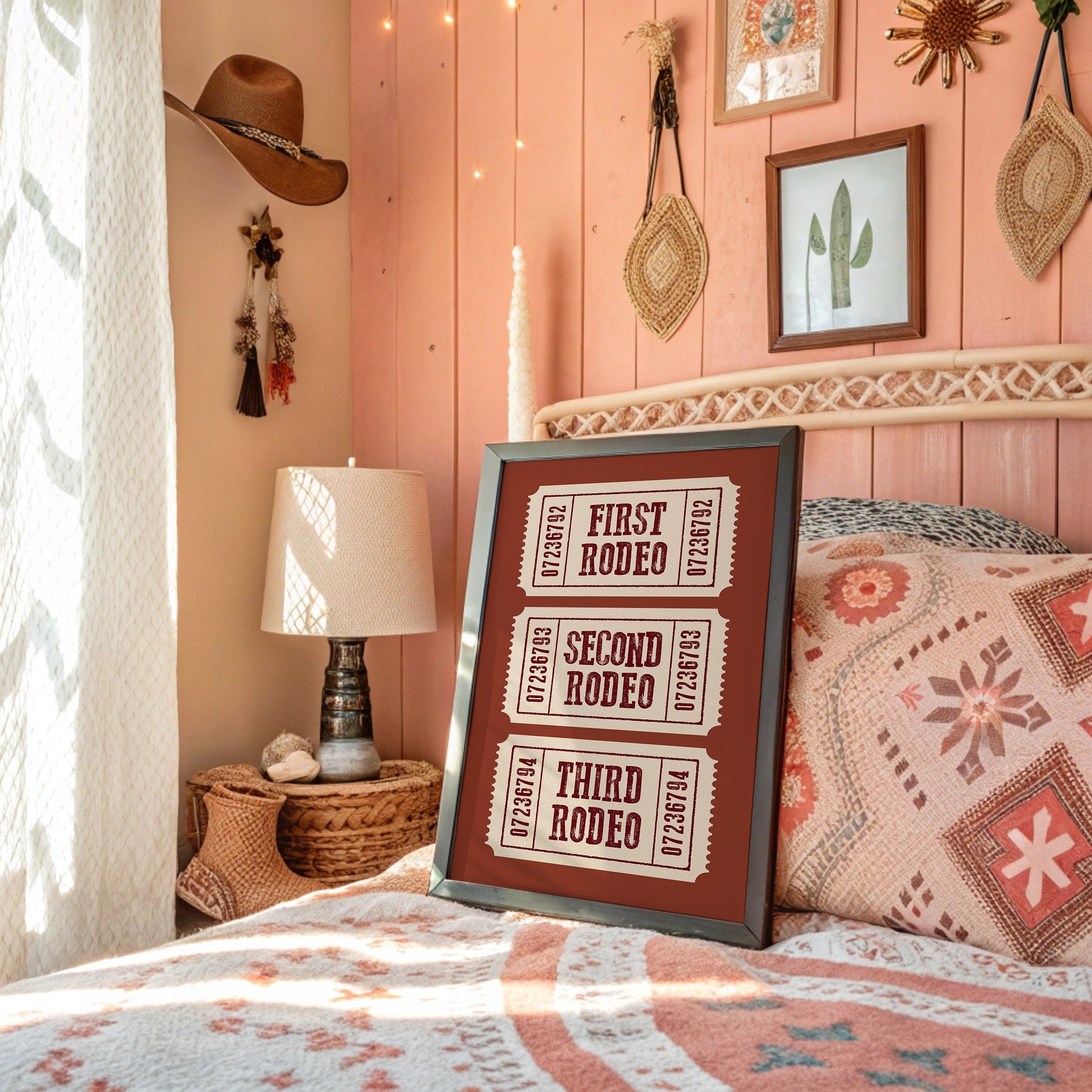 The rich terracotta backdrop frames three vintage admission tickets, each promising entry to a world of bucking broncos and cheering crowds. The weathered typography in deep burgundy against cream paper carries the nostalgic weight of American tradition, complete with the textured imperfections of hand-pressed printing. These numbered stubs tell stories of hat-tipping cowboys, thundering hooves, and the raw excitement of western heritage preserved in time. This piece brings rustic charm to home offices, ranch-style living rooms, or any space celebrating Americana and western culture. A perfect conversation starter for those who appreciate the rugged romance of rodeo history.