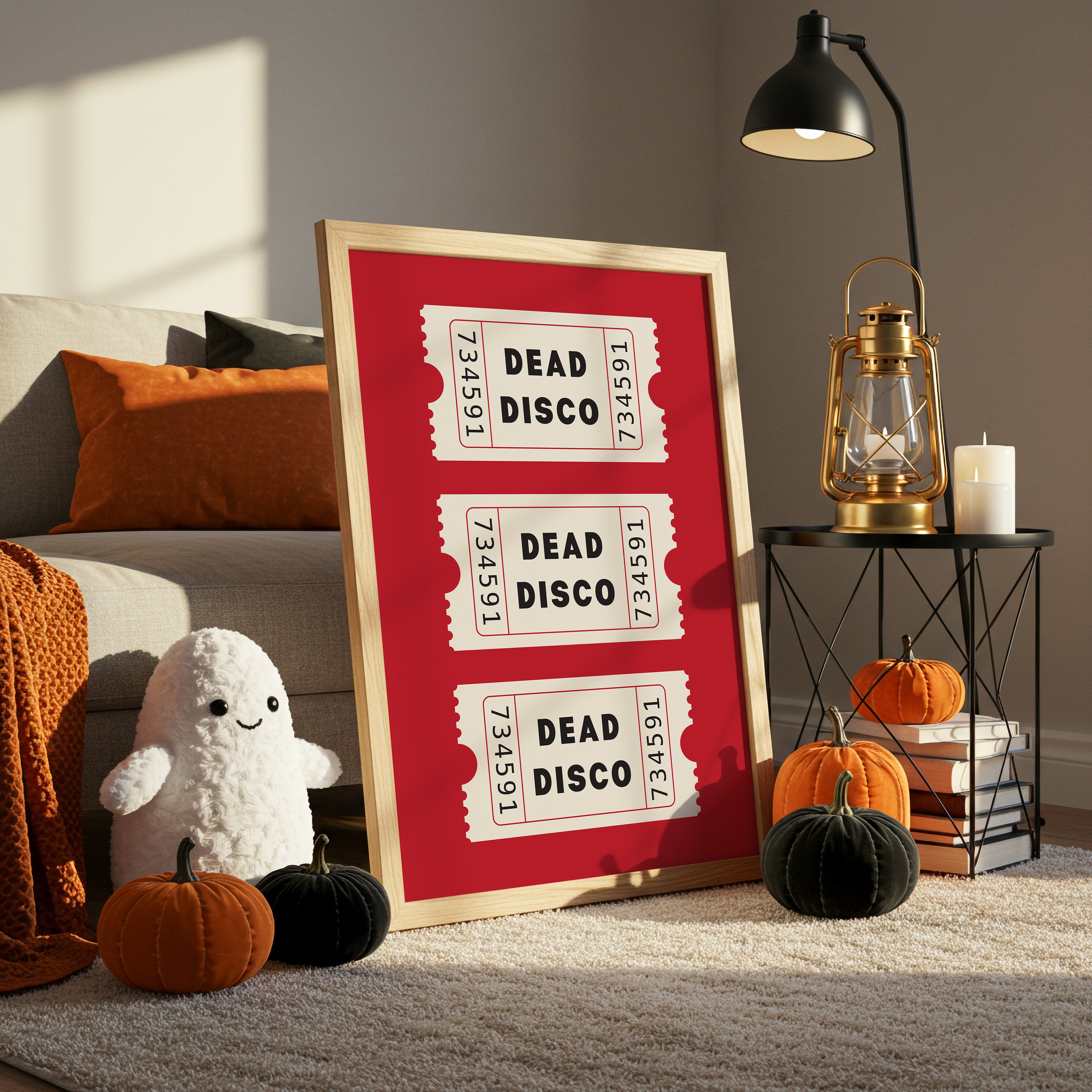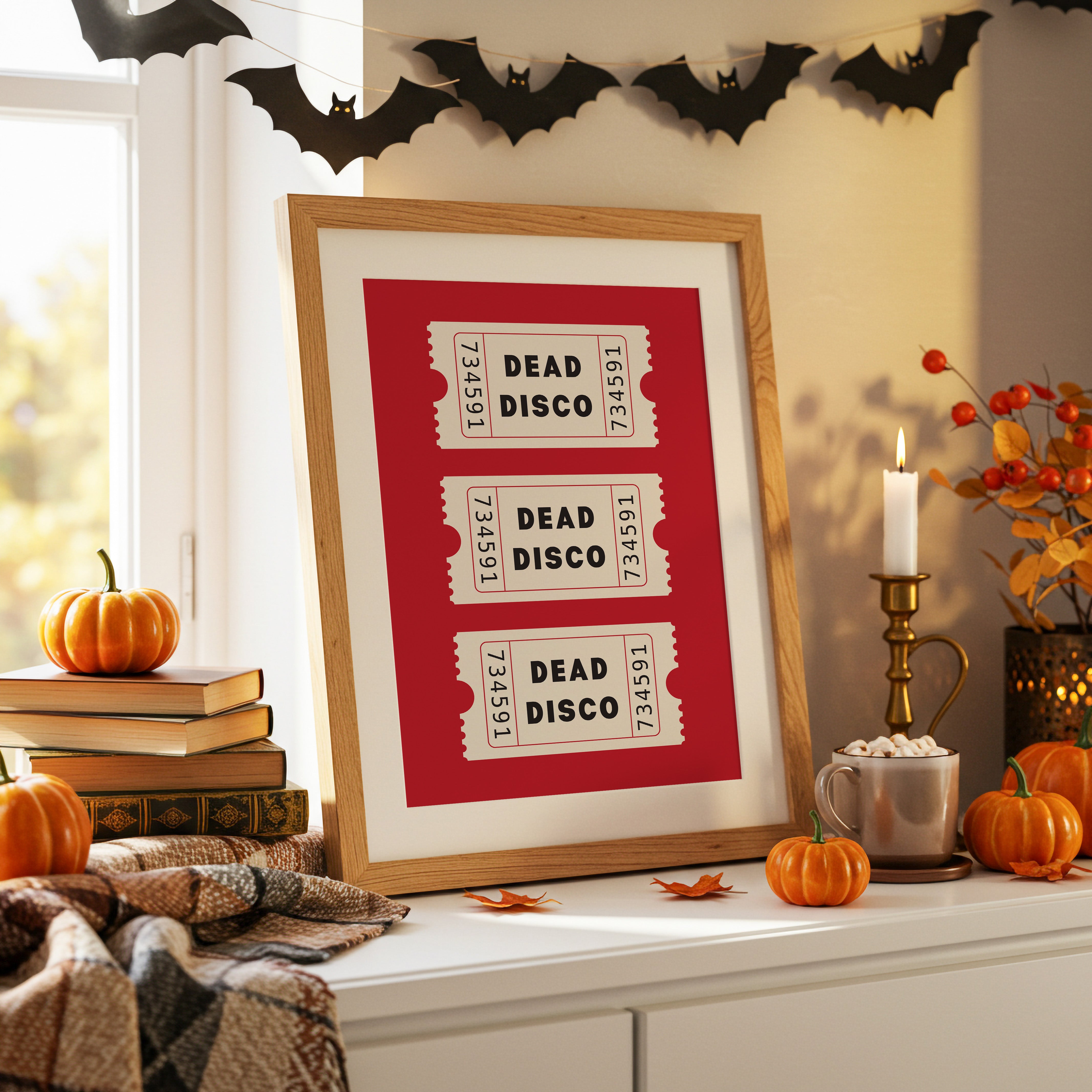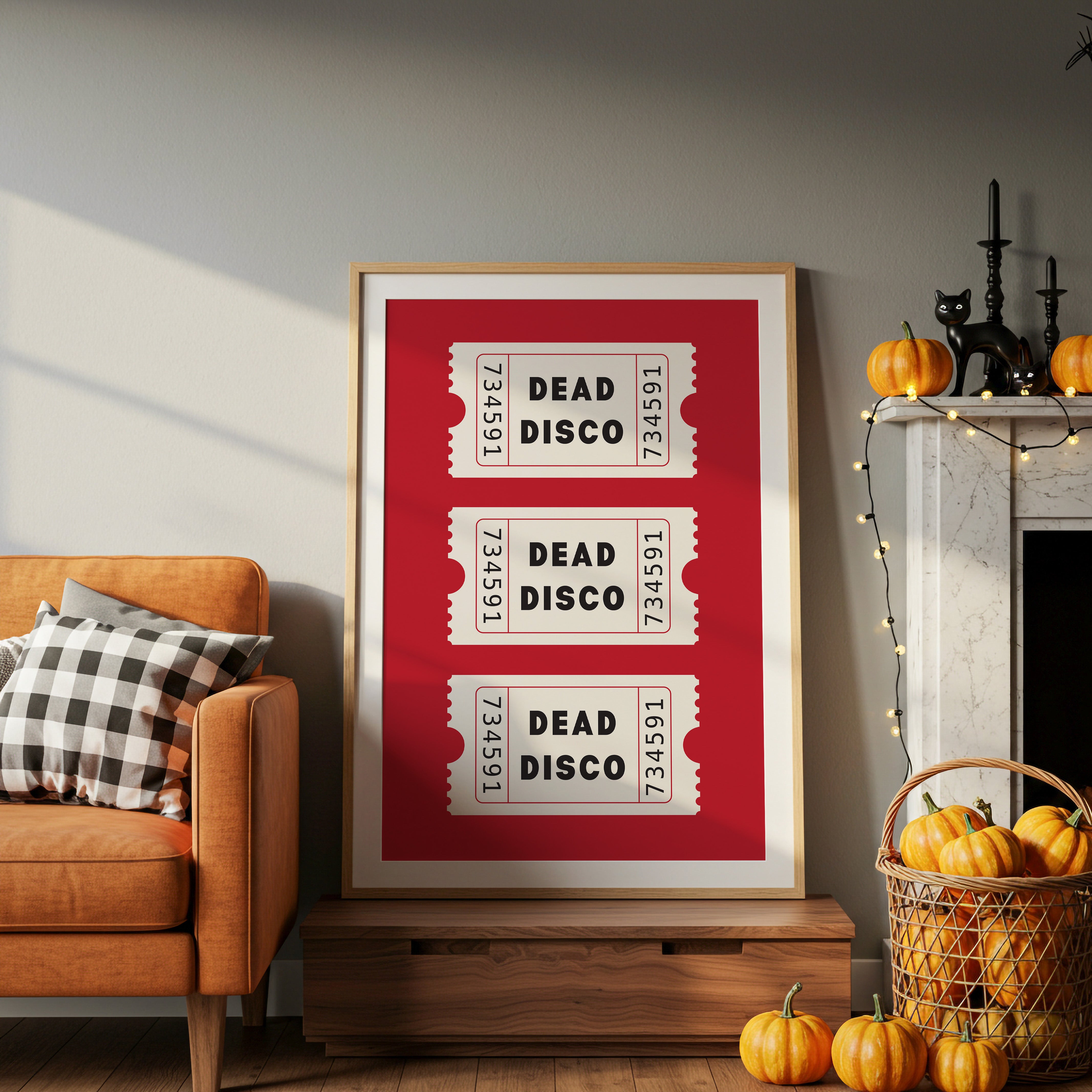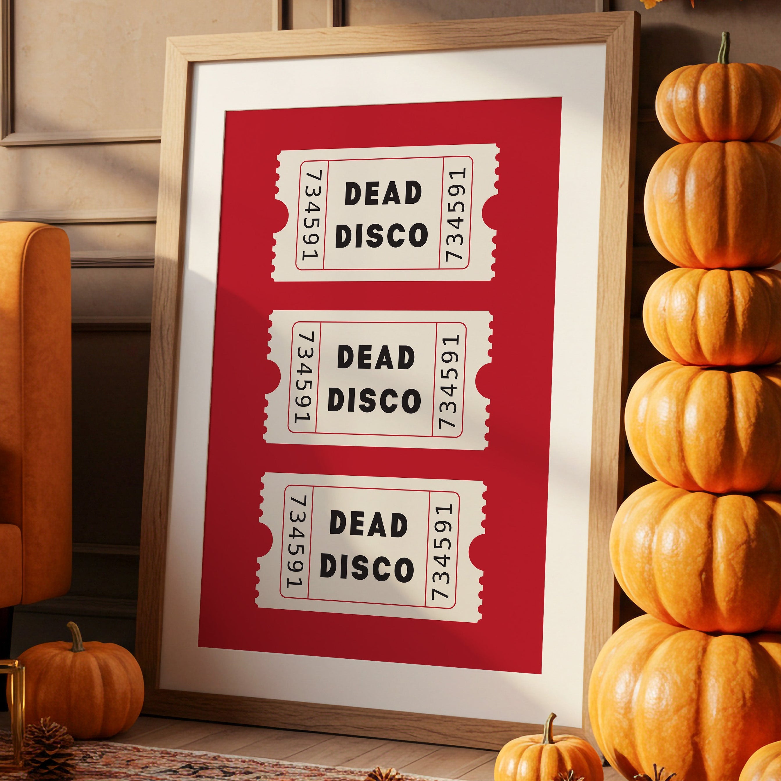 Three stark white admission tickets stand boldly against a rich crimson background, each promising entry to a ""DEAD DISCO"" that exists only in memory. The minimalist design speaks of an era when nightlife was accessed through paper in hand, not pixels on screens. Bold typography and numbered edges create a striking visual rhythm, evoking nostalgia for underground music scenes and ephemeral nightlife experiences. This piece would add a perfect touch of retro cool to a music room, home bar, or any space that celebrates cultural nostalgia.