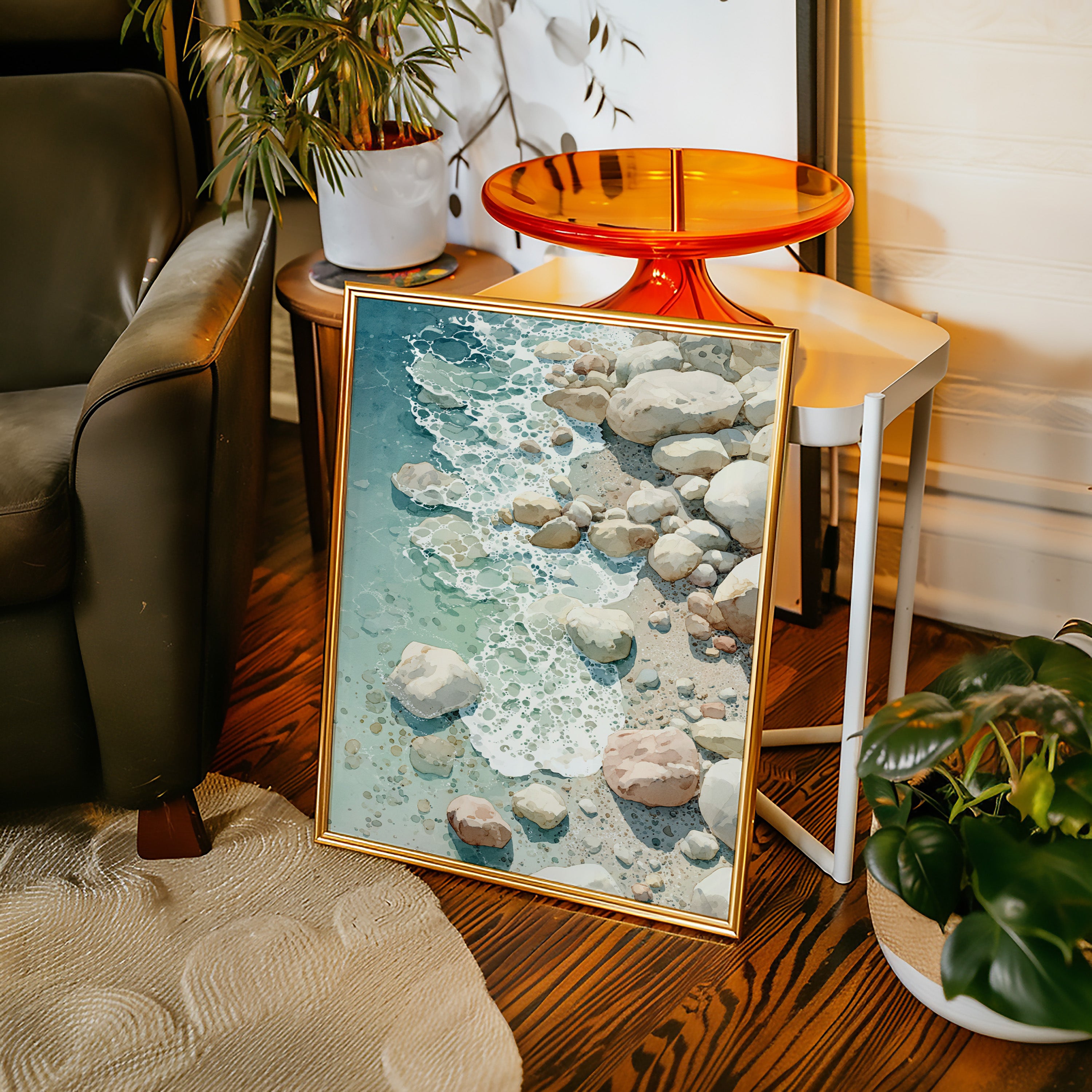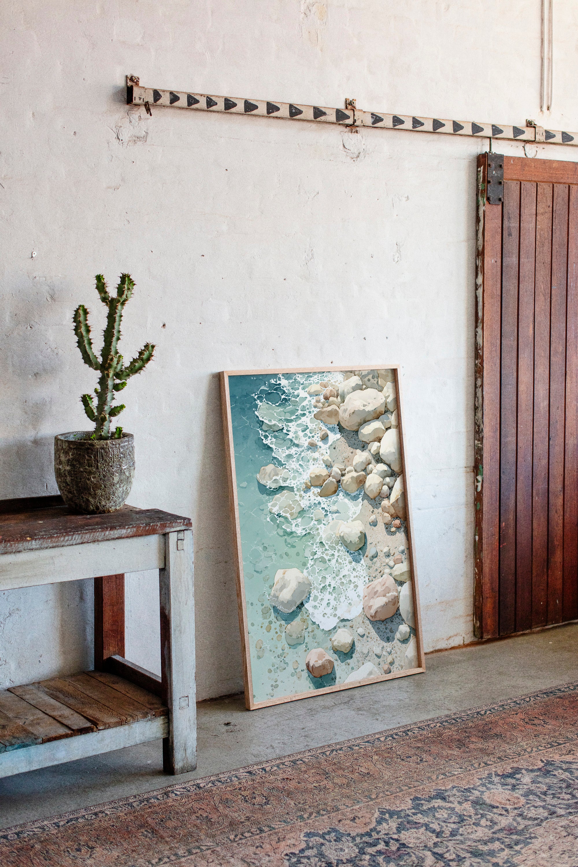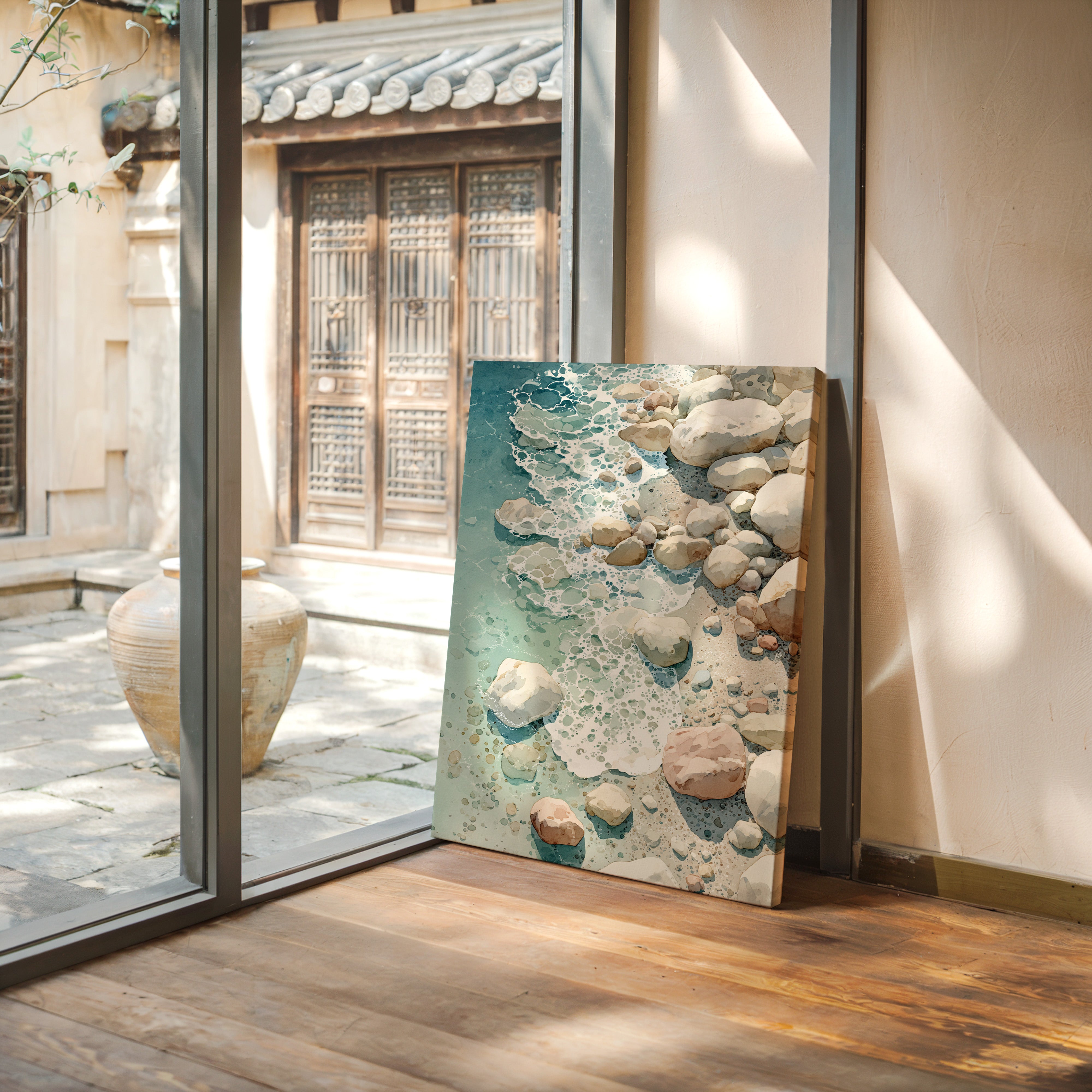 As waves gently unfurl across the worn stones, a serene dance unfolds, inviting the soul to linger in nature's embrace. This piece captures the essence of coastal artistry, blending tranquility with the raw beauty of the shore. Each rock, kissed by the tide, tells a story of resilience, with soft hues of sand and sea creating a harmonious palette that evokes calm and contemplation. Perfectly suited for a coastal retreat or a tranquil reading nook, its presence invites moments of reflection and peace.