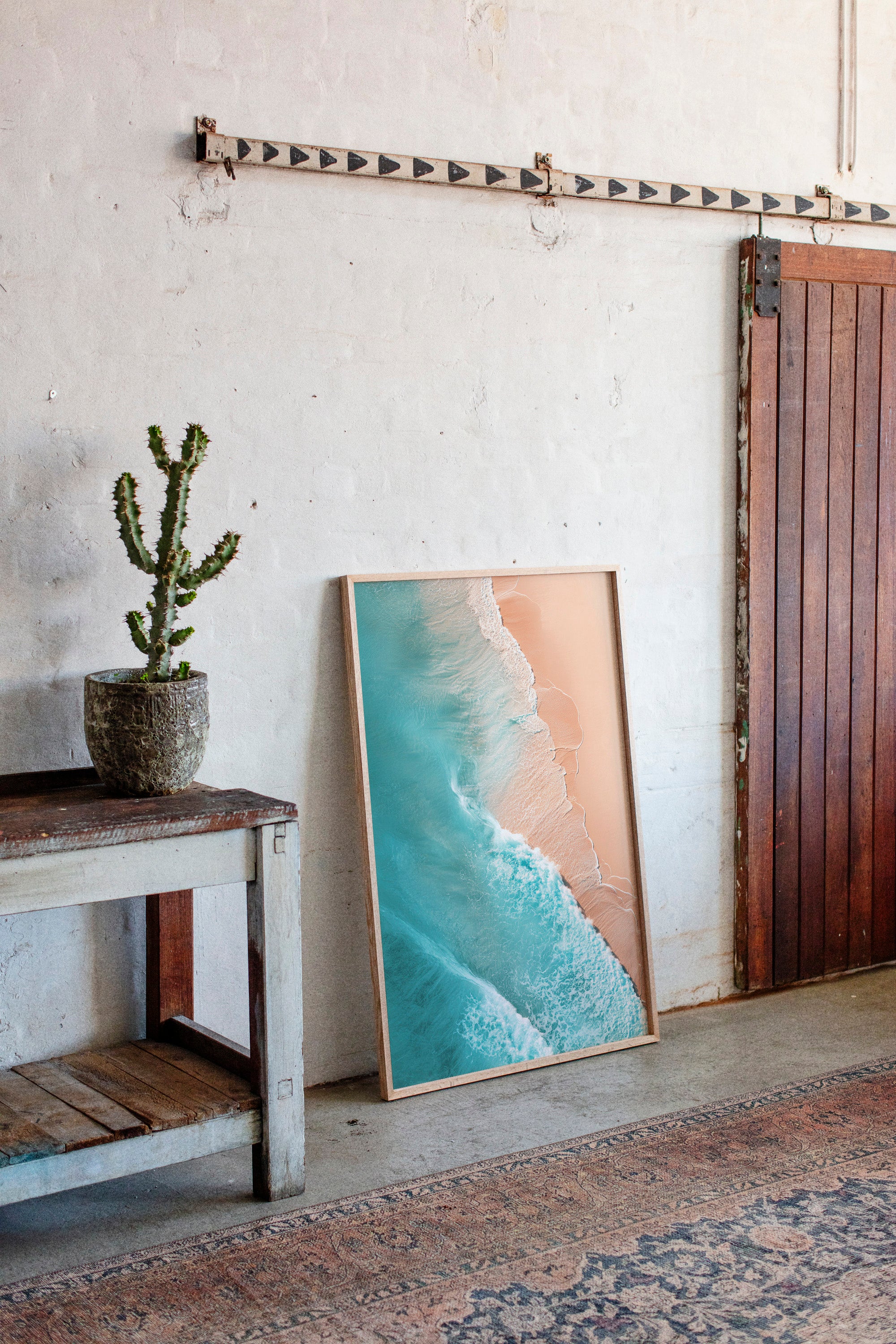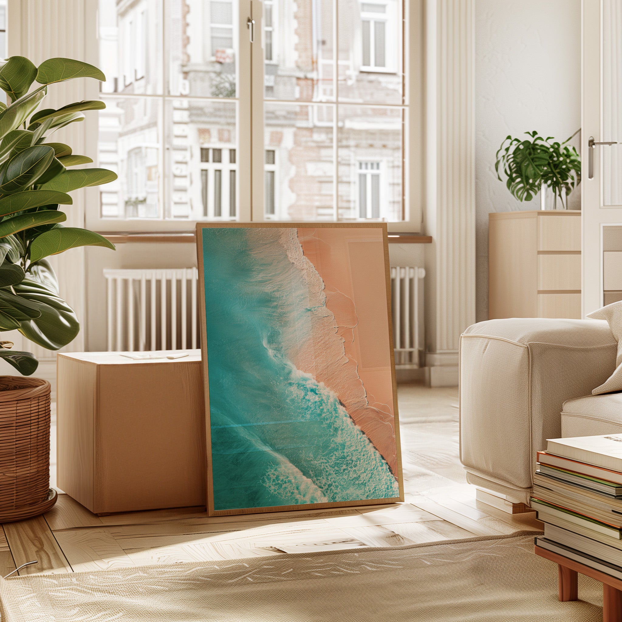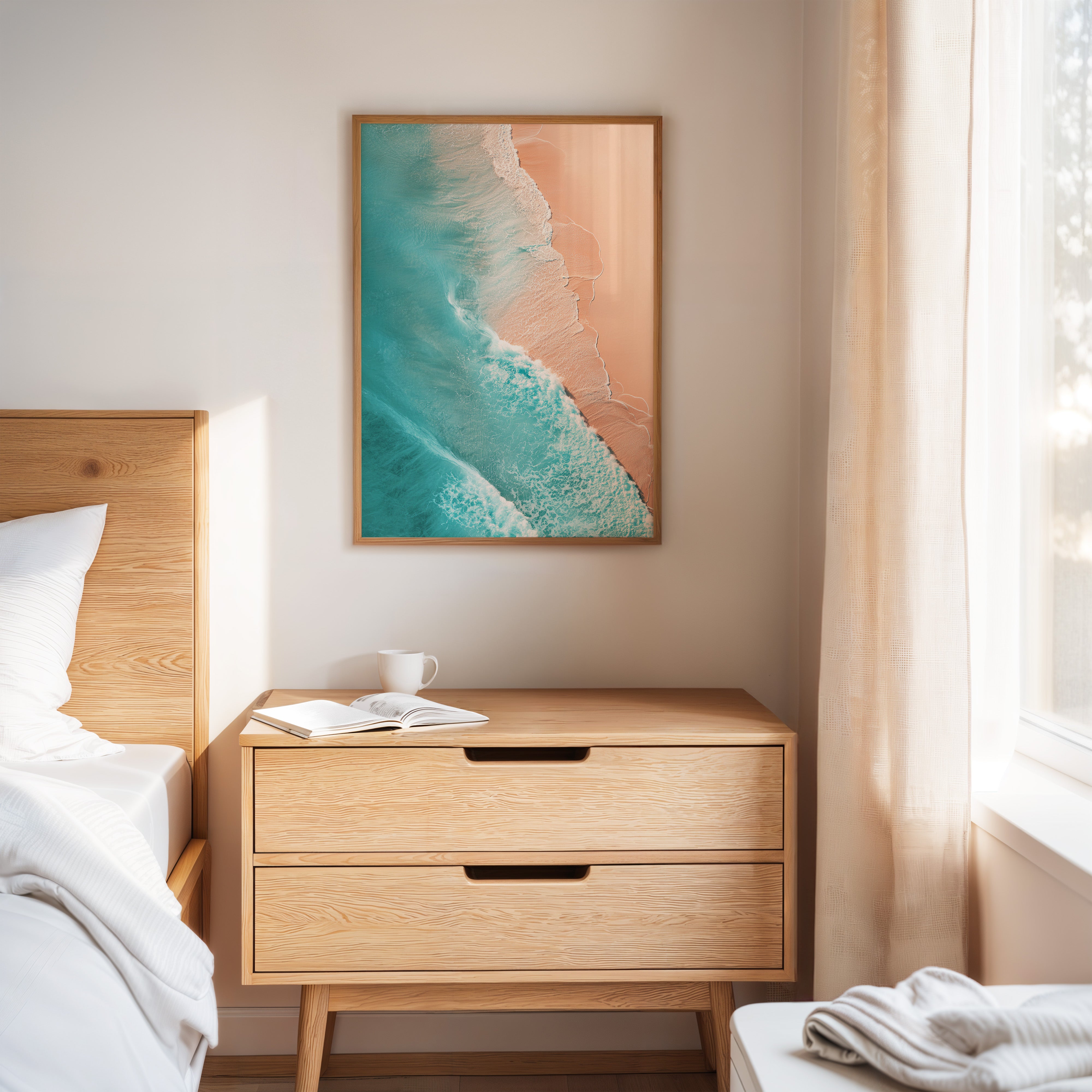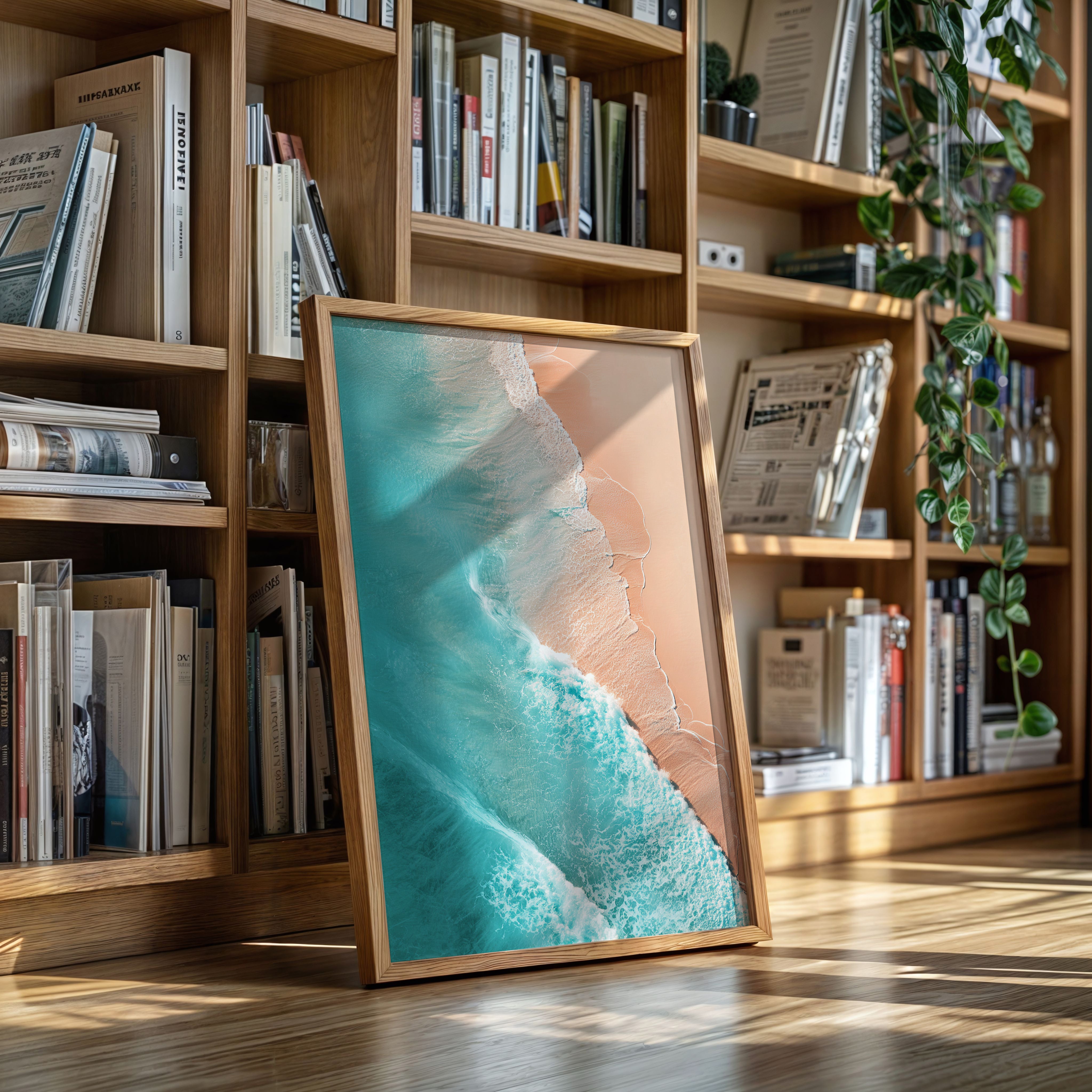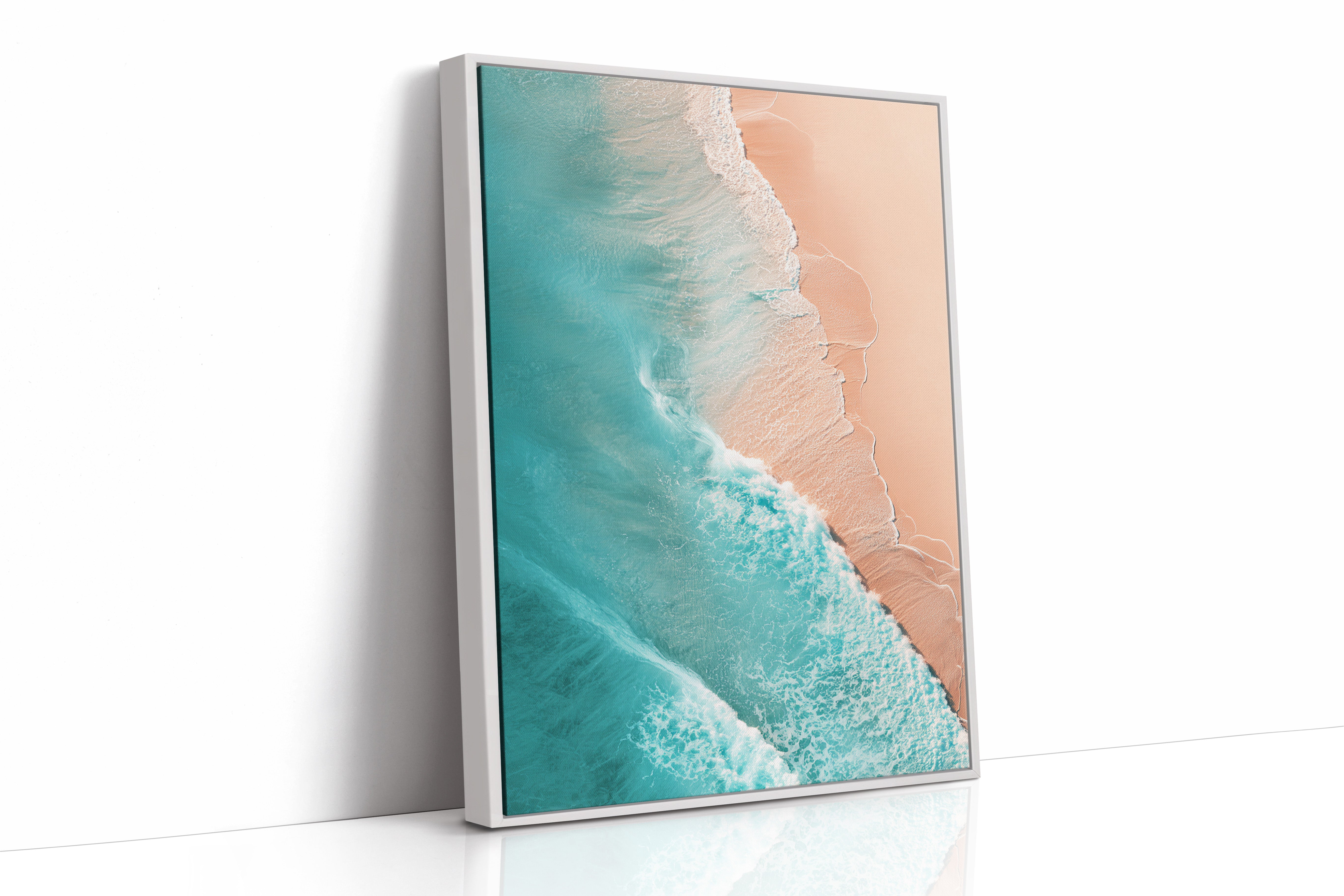 As the sun dips low, waves gently kiss the shore, their rhythm a lullaby of nature's embrace. This piece captures the serene beauty found in coastal escapes, a perfect addition to the Artisanal collection. The vibrant aqua meets soft blush, creating a harmonious dance of color and texture, inviting the viewer into a moment of tranquility and reflection. Ideal for a beach-themed sanctuary or a serene reading nook, it brings the essence of seaside serenity indoors.