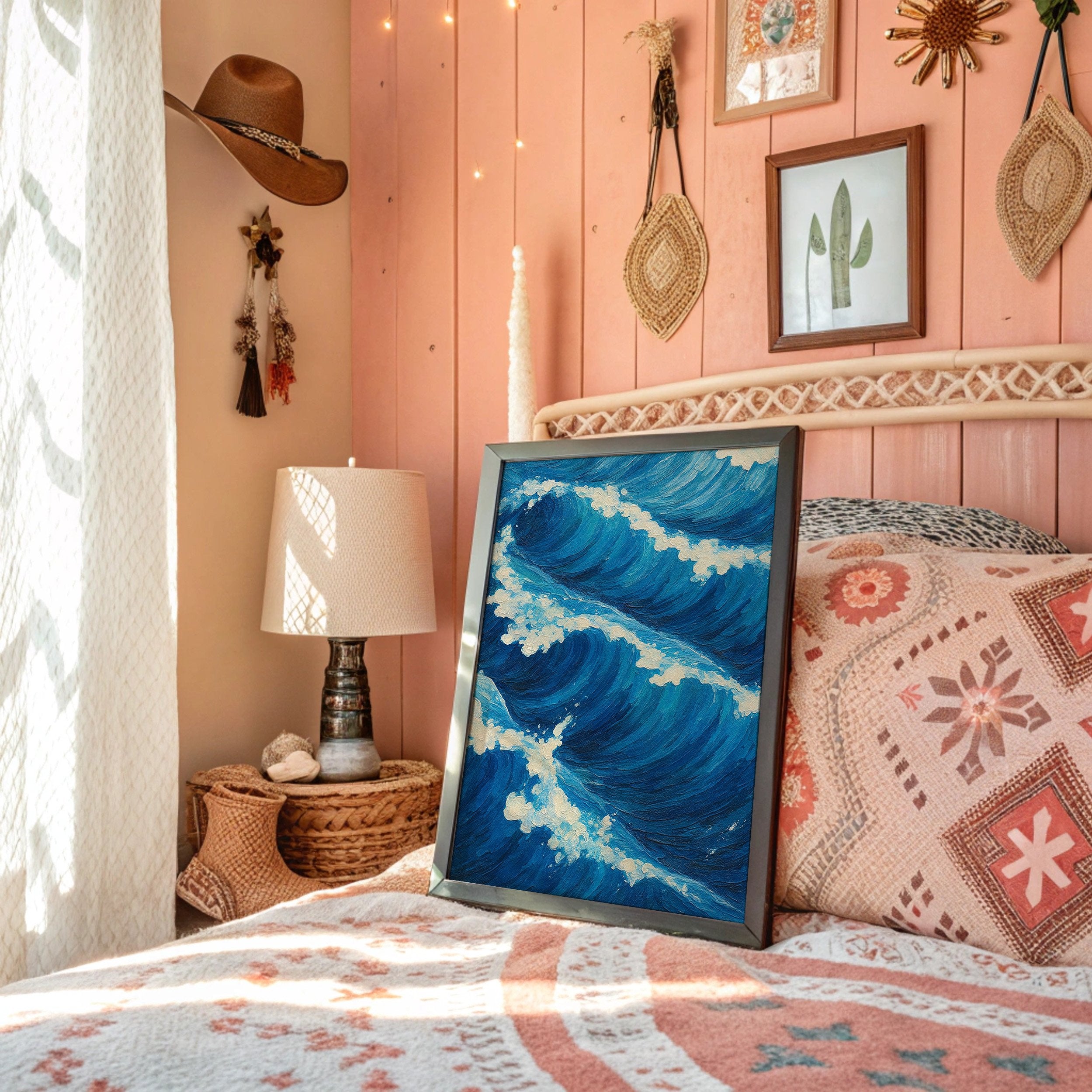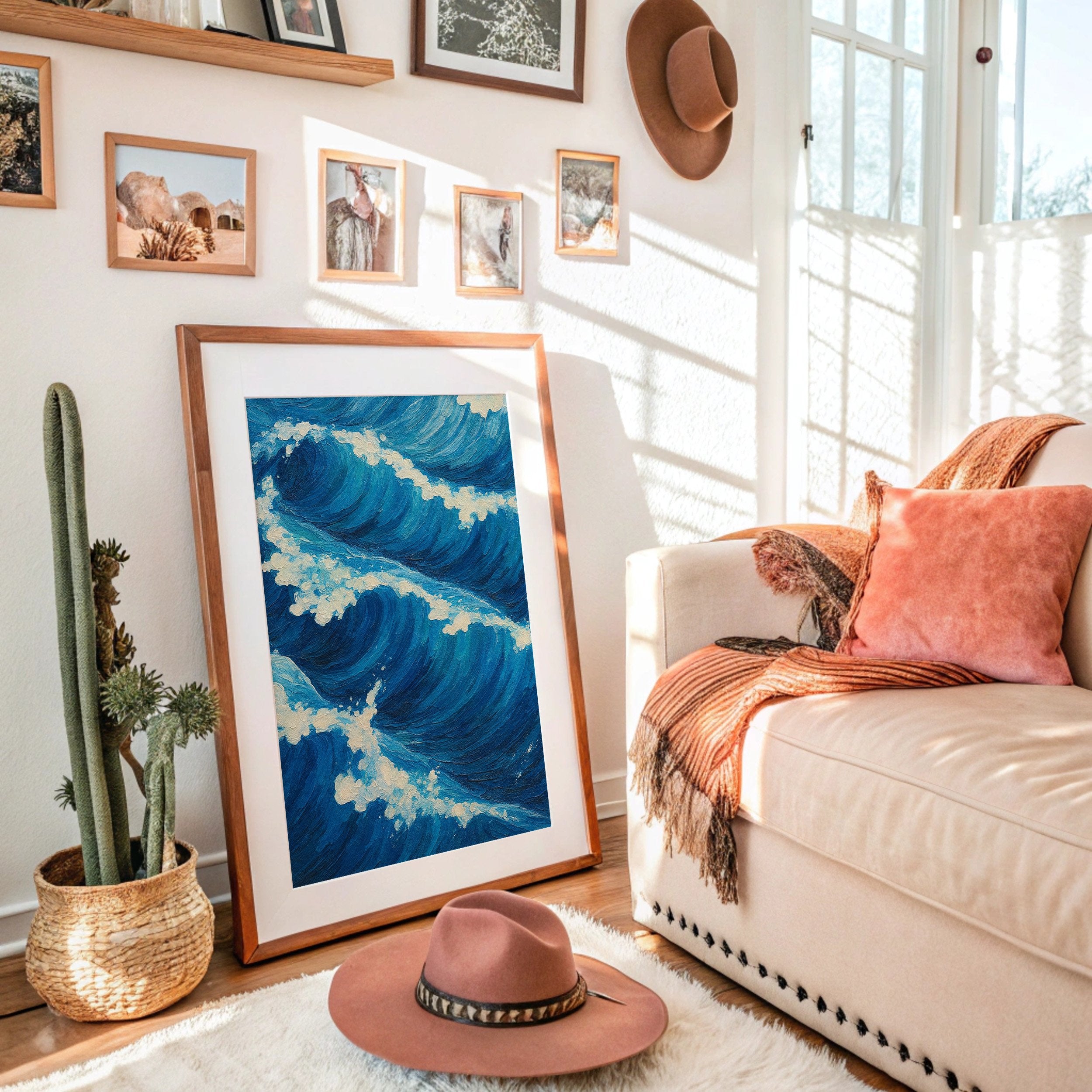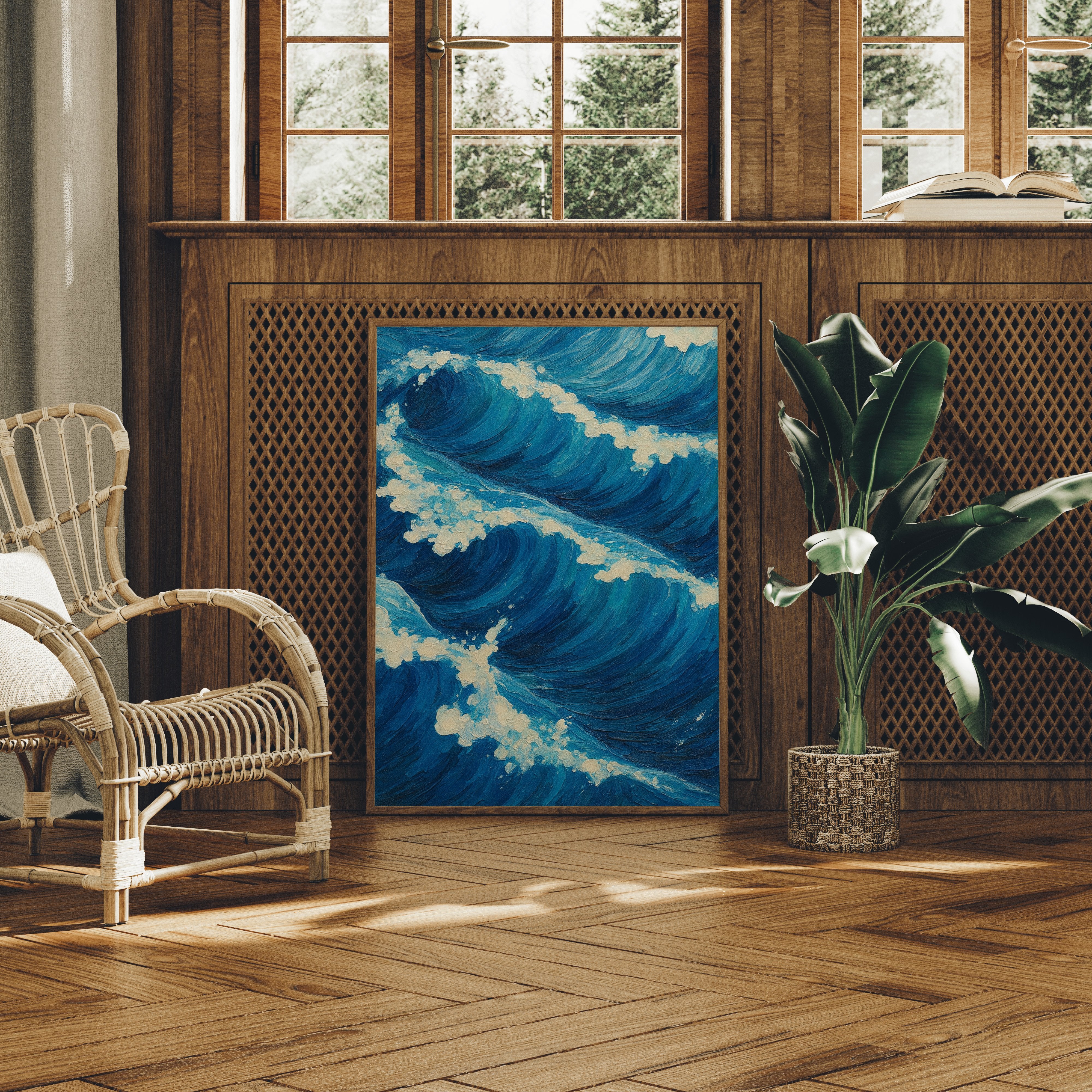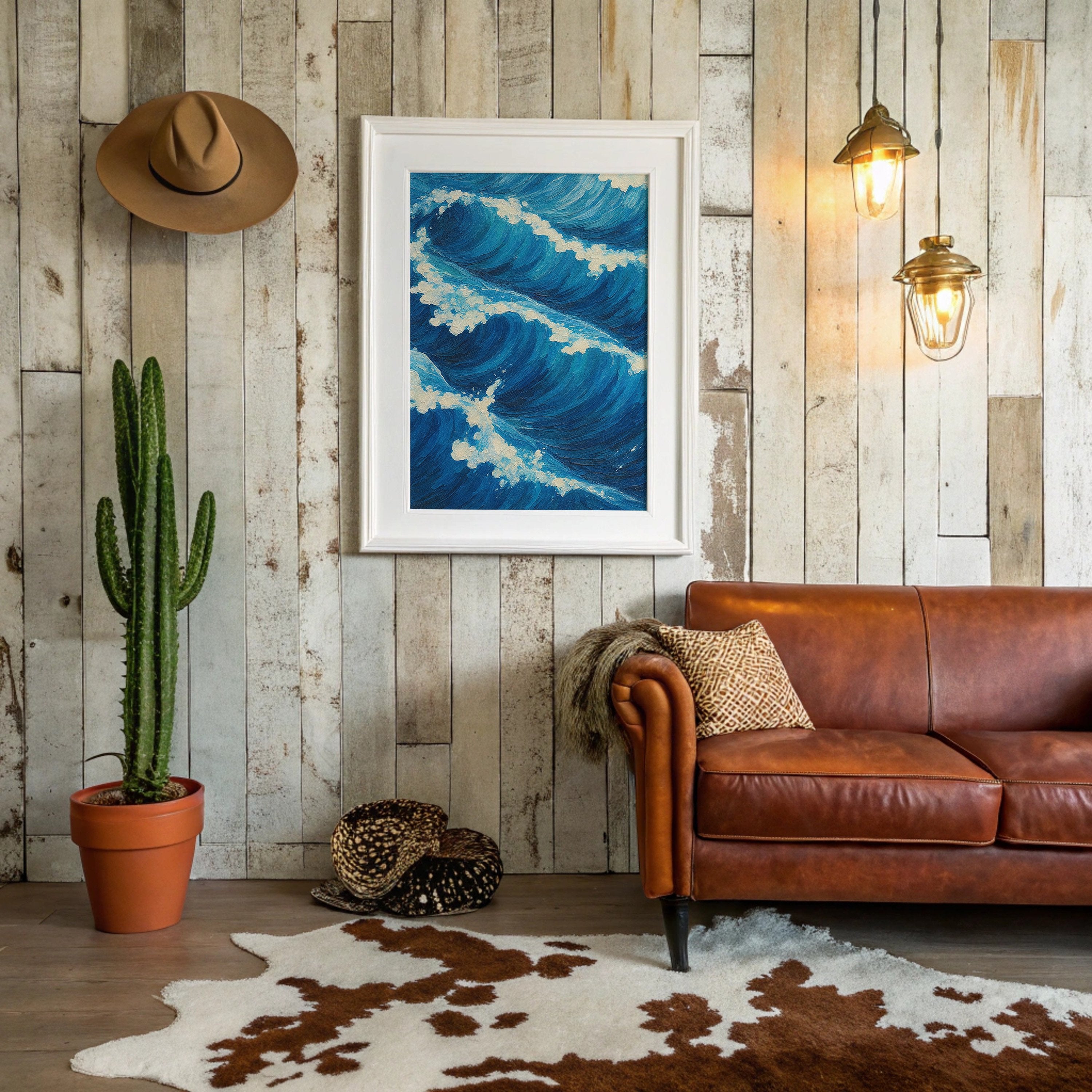 Deep cerulean waves crash and fold with rhythmic precision, capturing that fleeting moment when water becomes sculpture. The textured brushstrokes reveal layers of cobalt and azure, creating a sense of perpetual movement that feels both powerful and meditative. This oceanic scene brings the untamed energy of the coast into a rustic-modern setting.