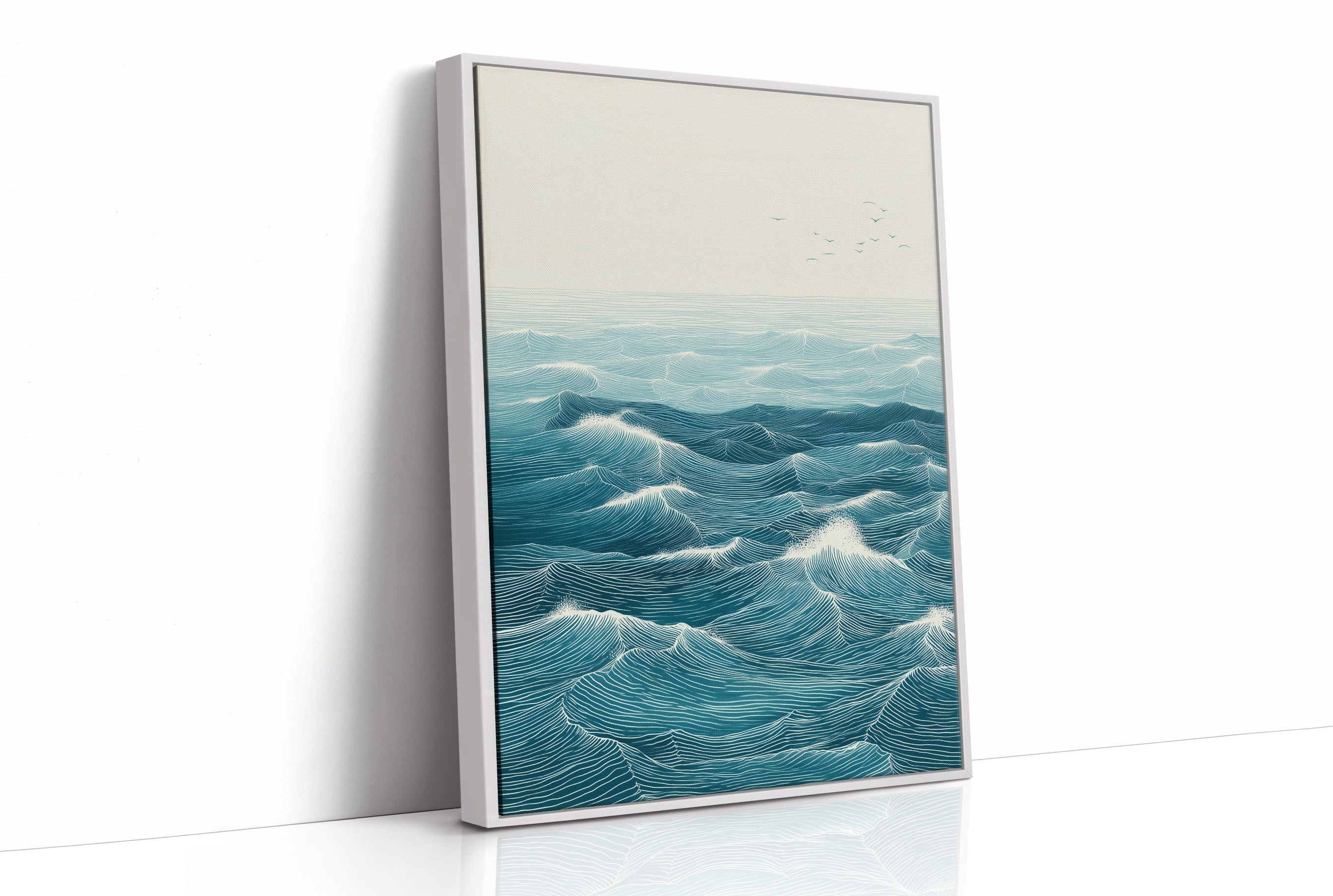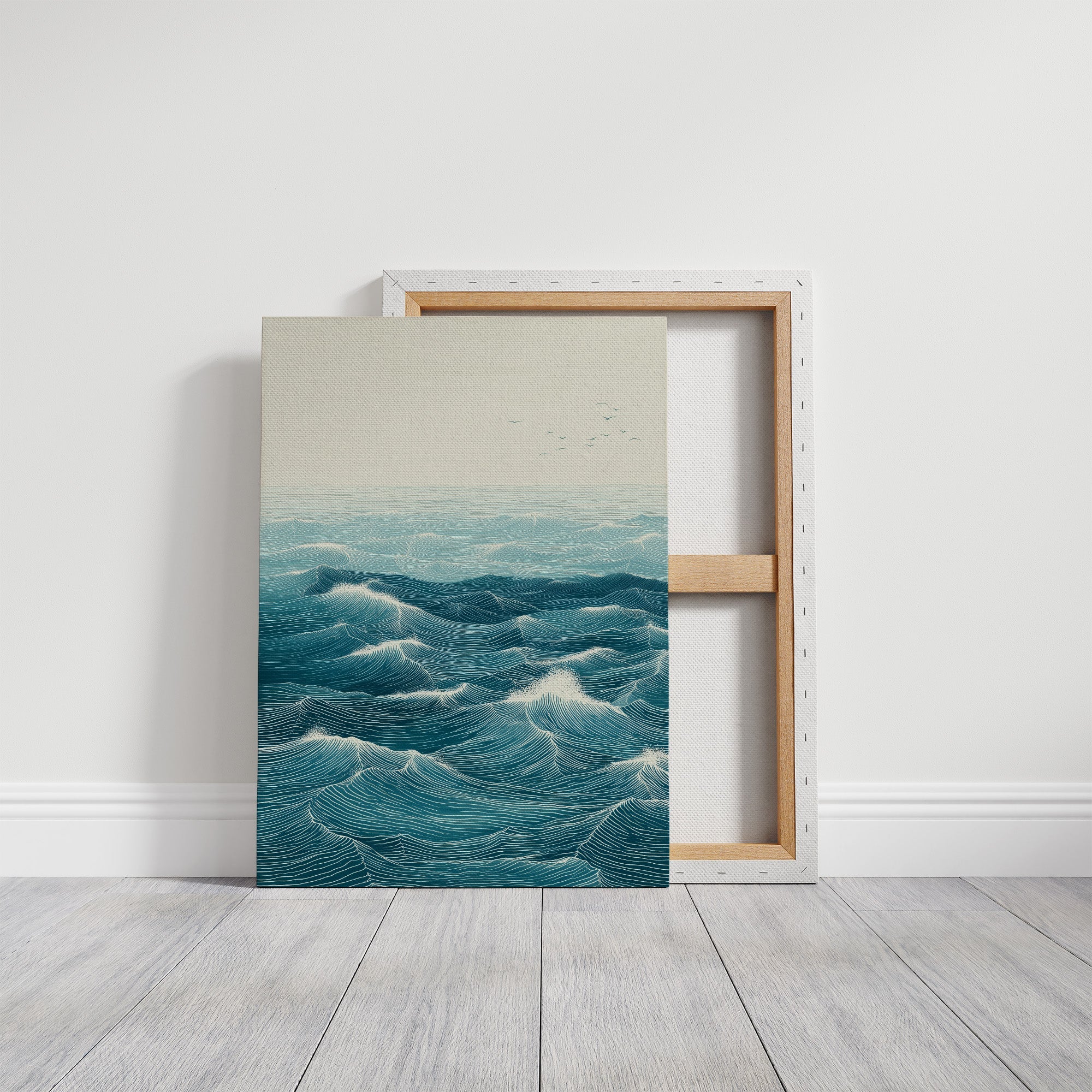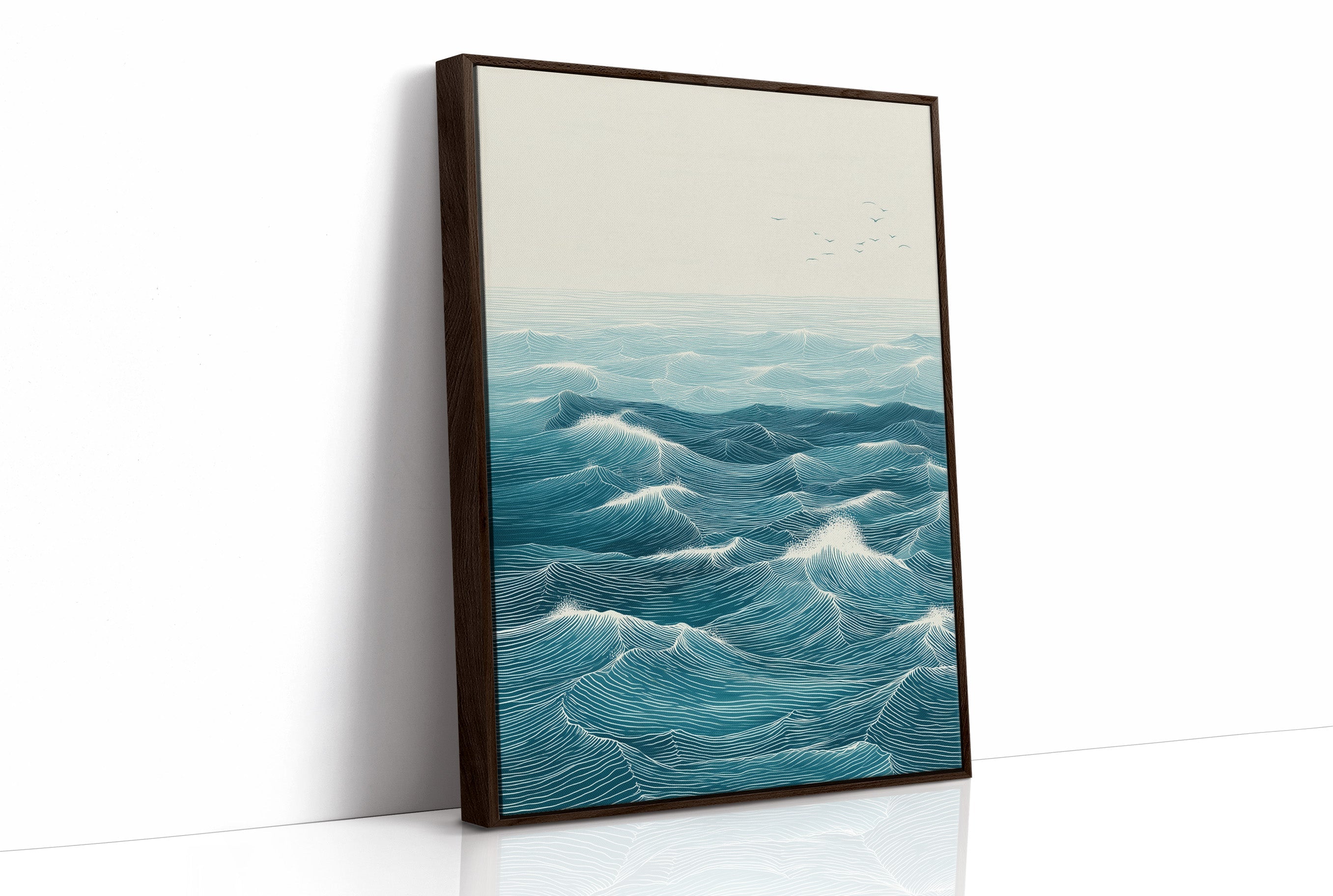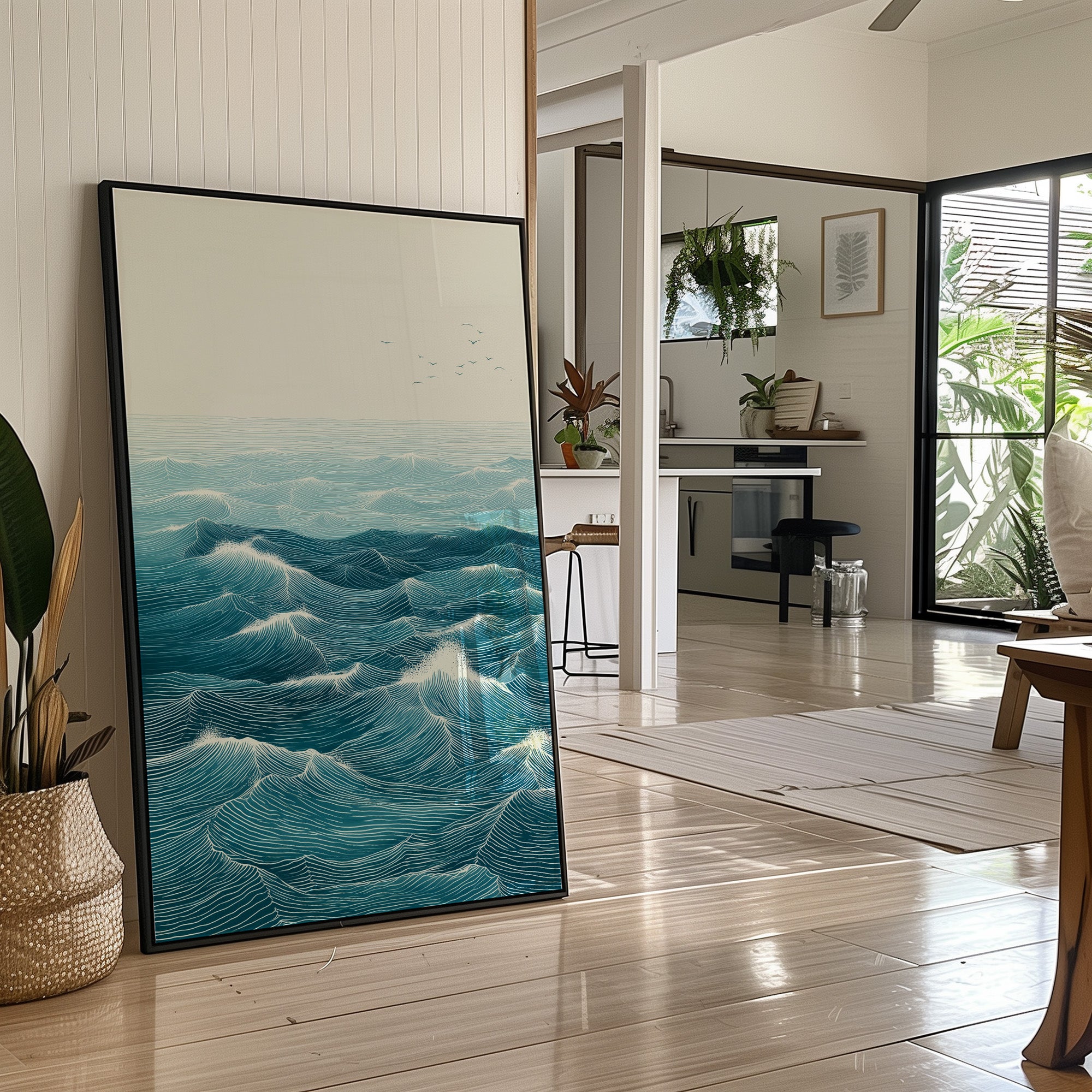 Rhythmic waves pulse across a vast seascape, their turquoise depths catching hints of morning light. Each carefully rendered line creates a hypnotic pattern of rolling swells, suggesting both motion and timeless stability in their endless dance. The minimalist composition draws focus to the intricate details of the ocean's surface, where distant birds soar above the maritime expanse. This statement piece brings coastal serenity to modern interiors, creating a window to the ocean in contemporary homes and spaces. Perfect for brightening a minimal living room or adding depth to a bright, plant-filled sunroom.