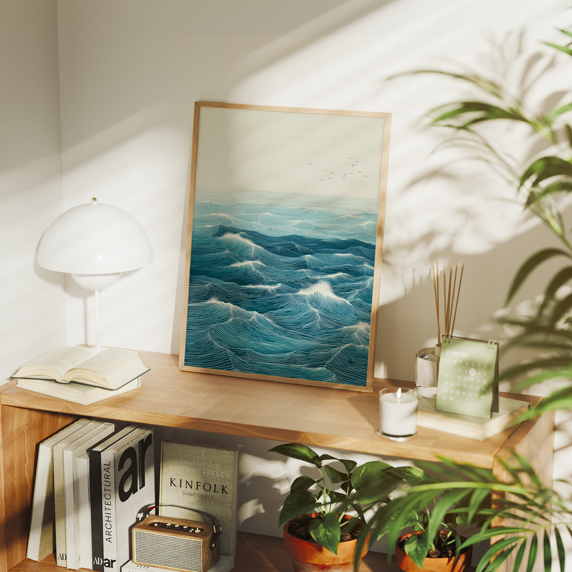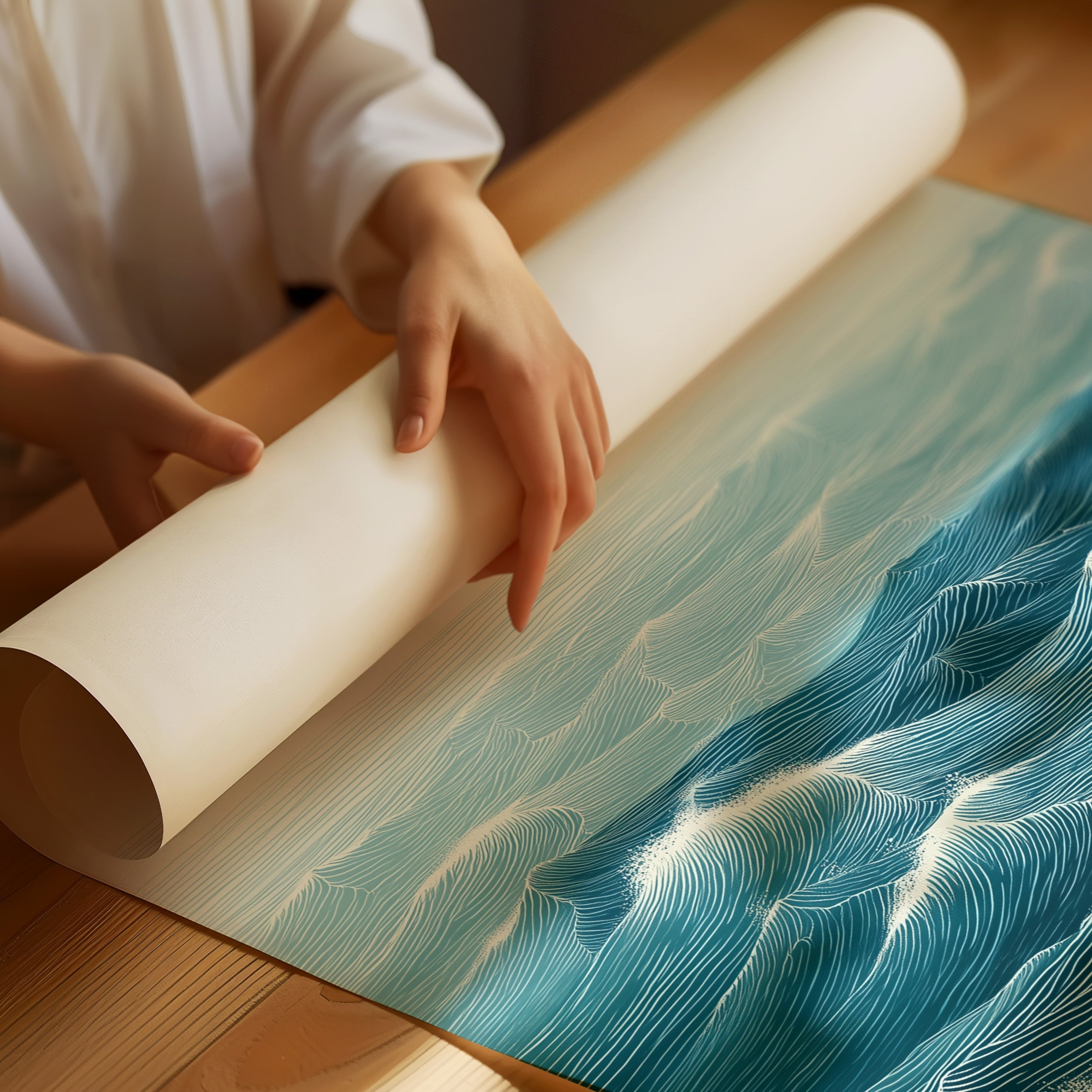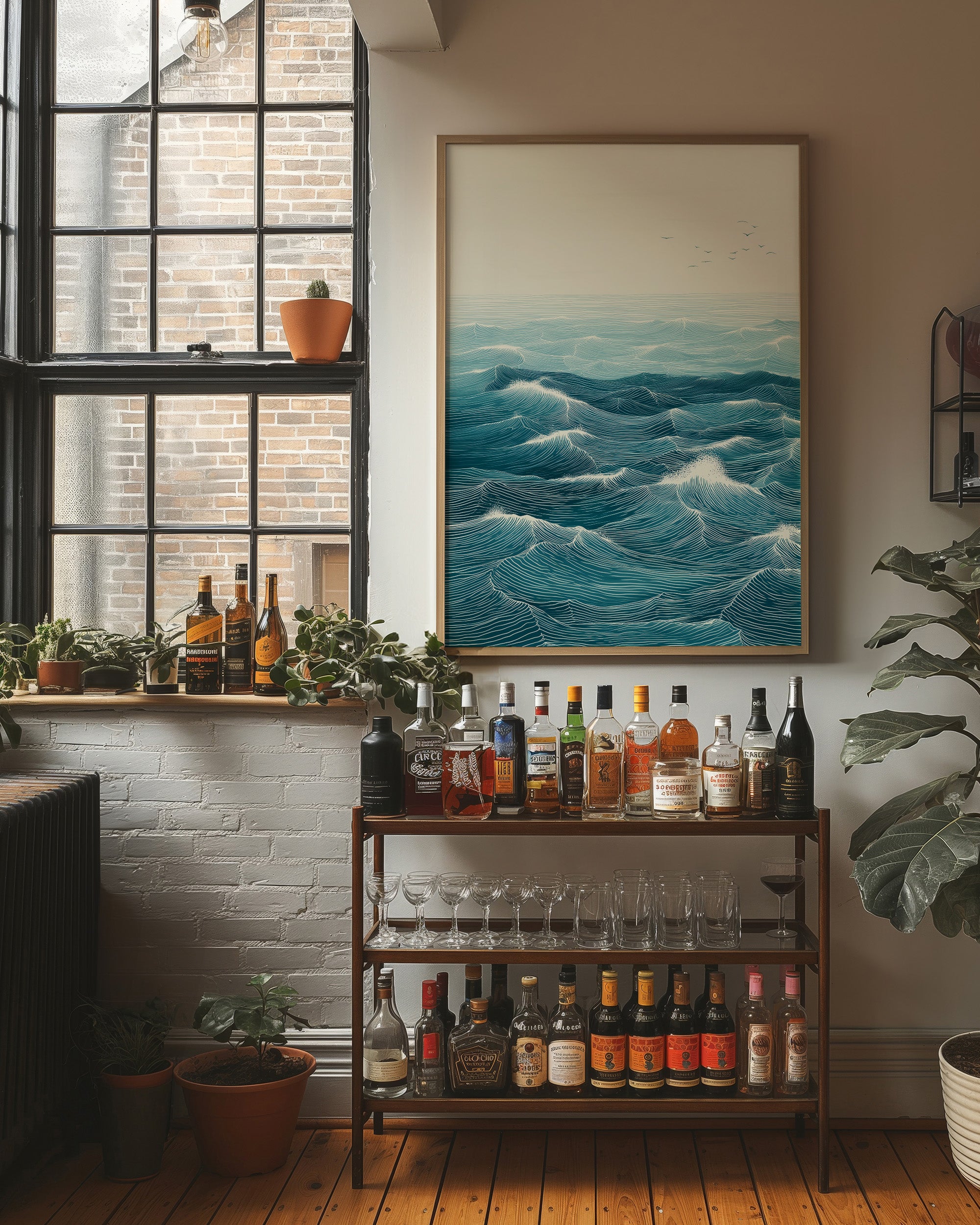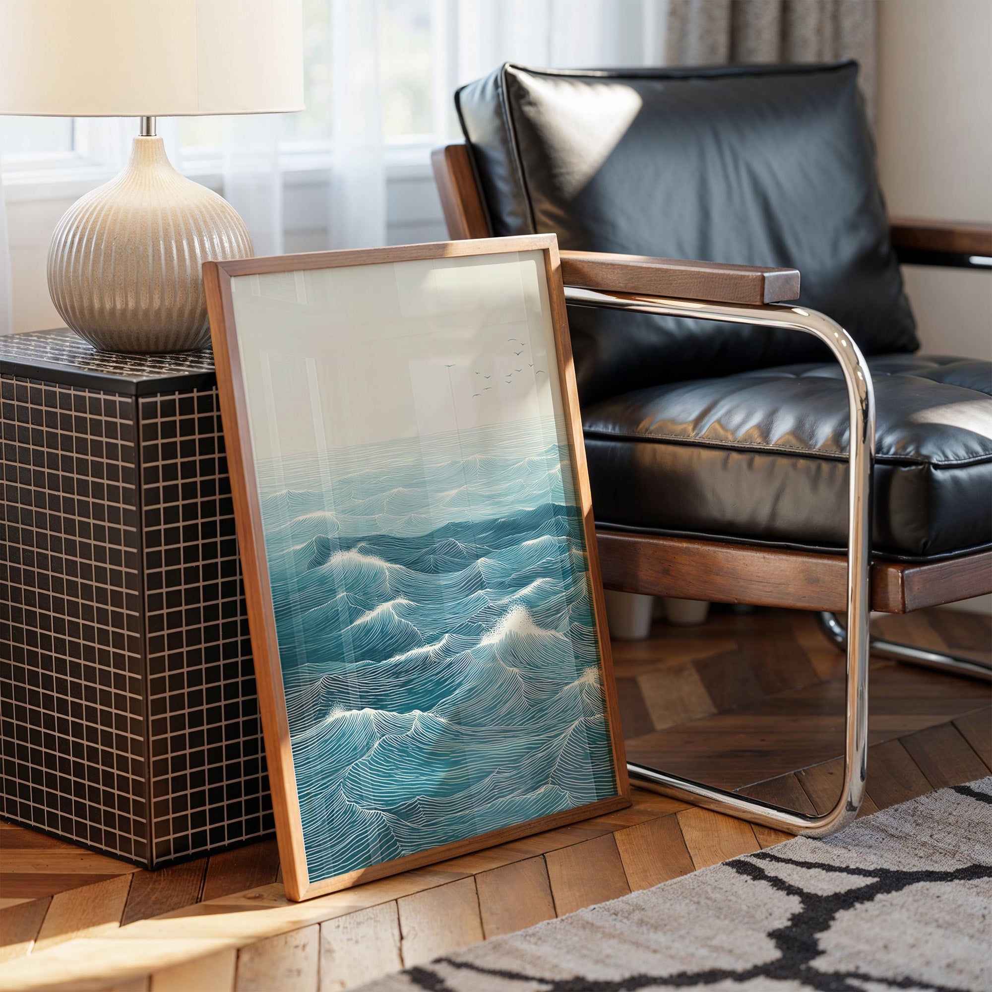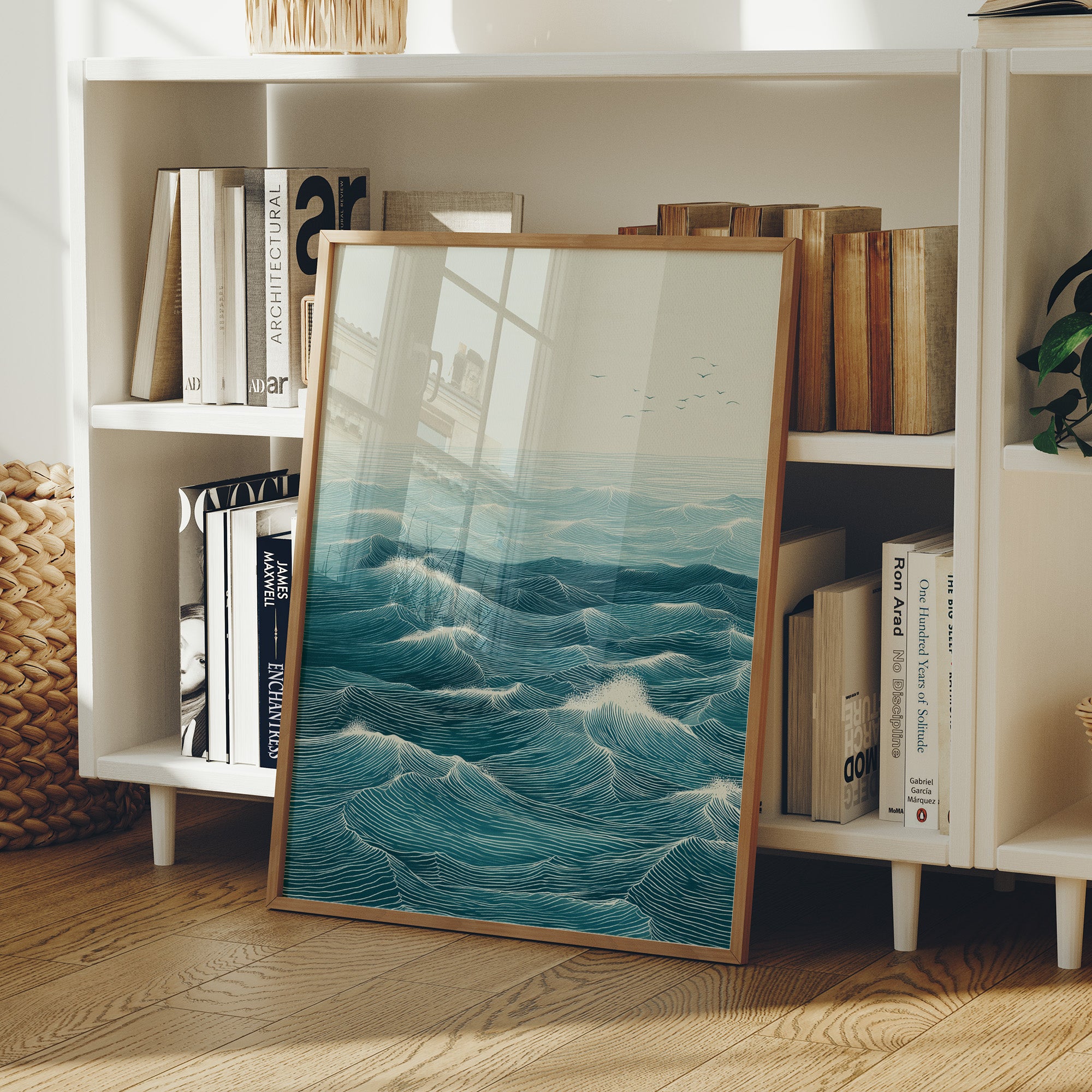 Rhythmic waves pulse across a vast seascape, their turquoise depths catching hints of morning light. Each carefully rendered line creates a hypnotic pattern of rolling swells, suggesting both motion and timeless stability in their endless dance. The minimalist composition draws focus to the intricate details of the ocean's surface, where distant birds soar above the maritime expanse. This statement piece brings coastal serenity to modern interiors, creating a window to the ocean in contemporary homes and spaces. Perfect for brightening a minimal living room or adding depth to a bright, plant-filled sunroom.
