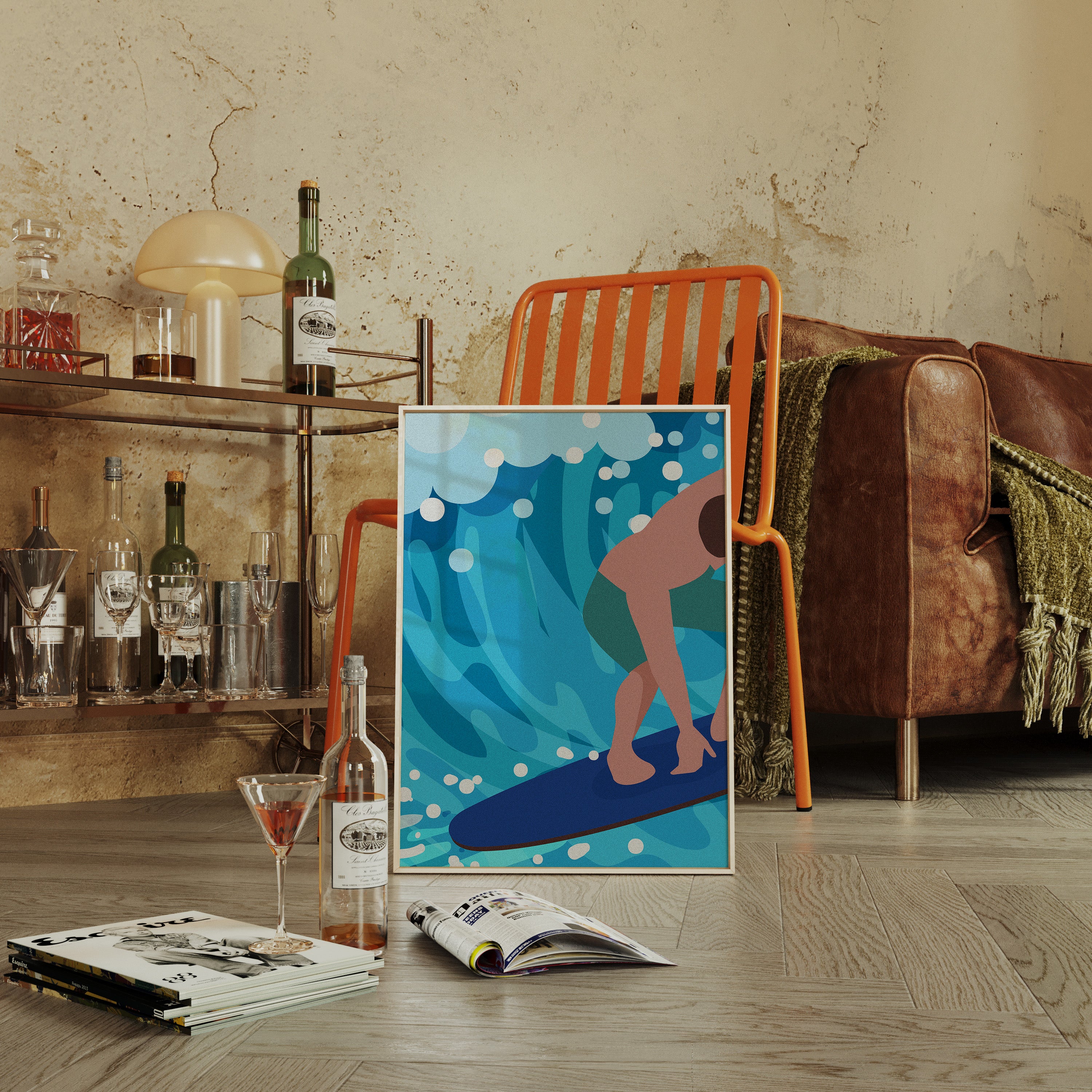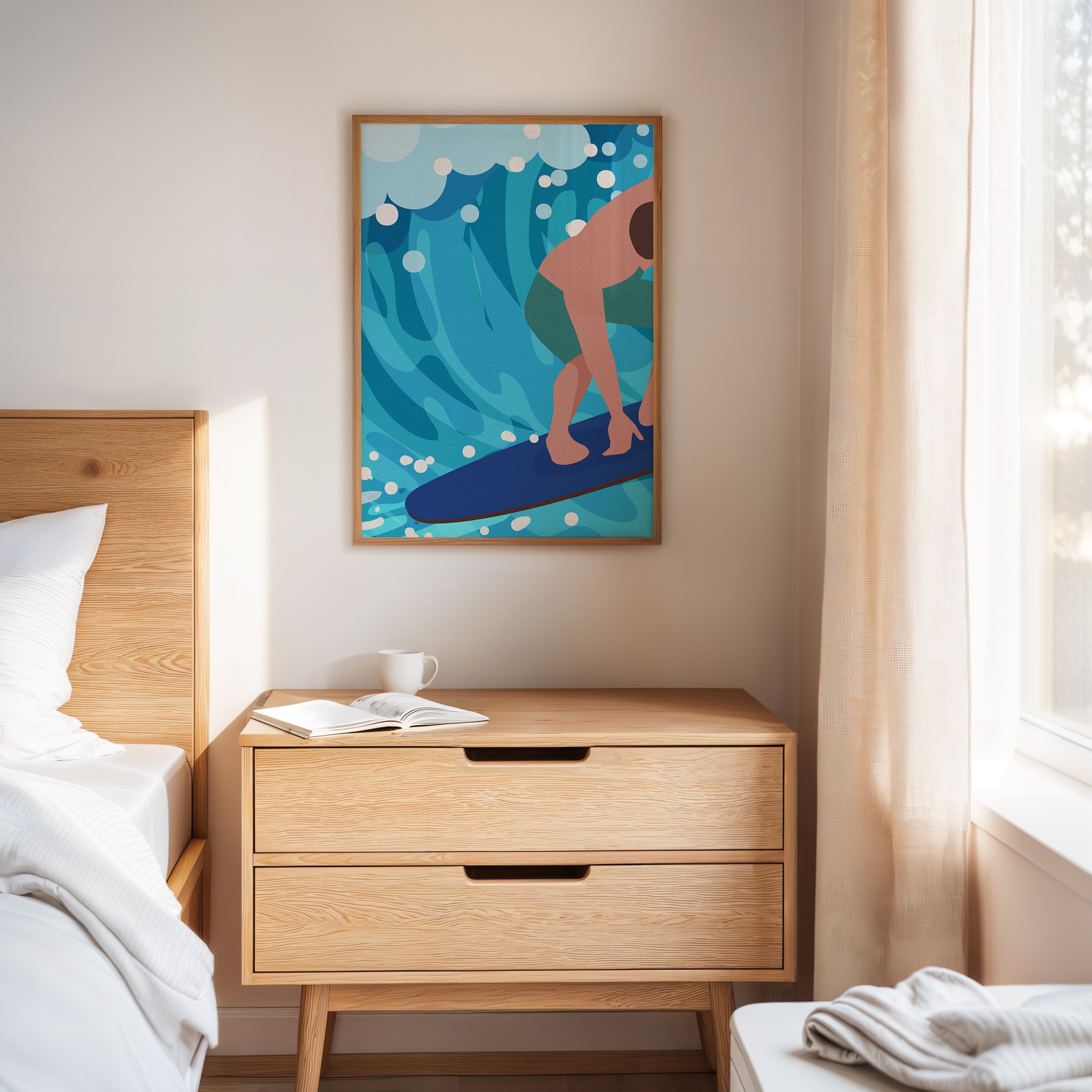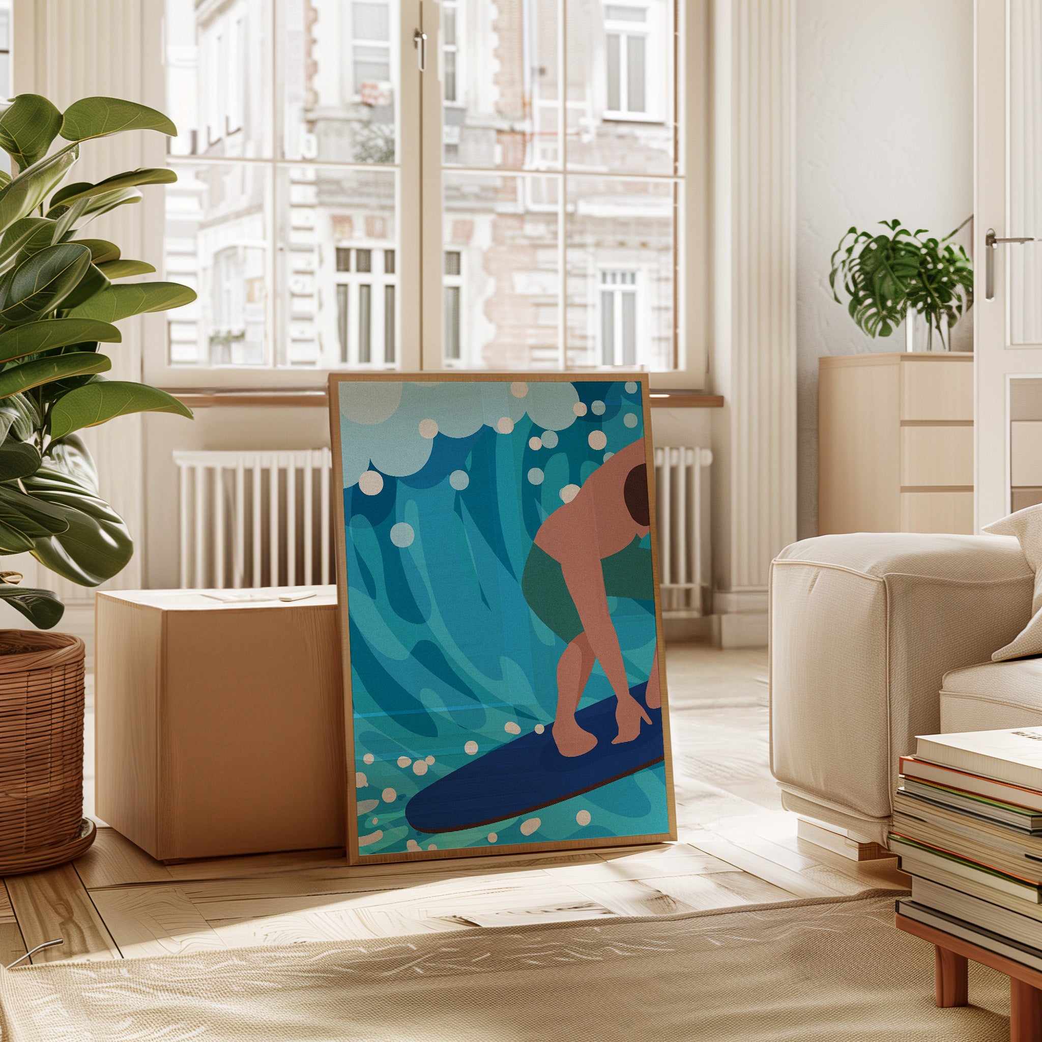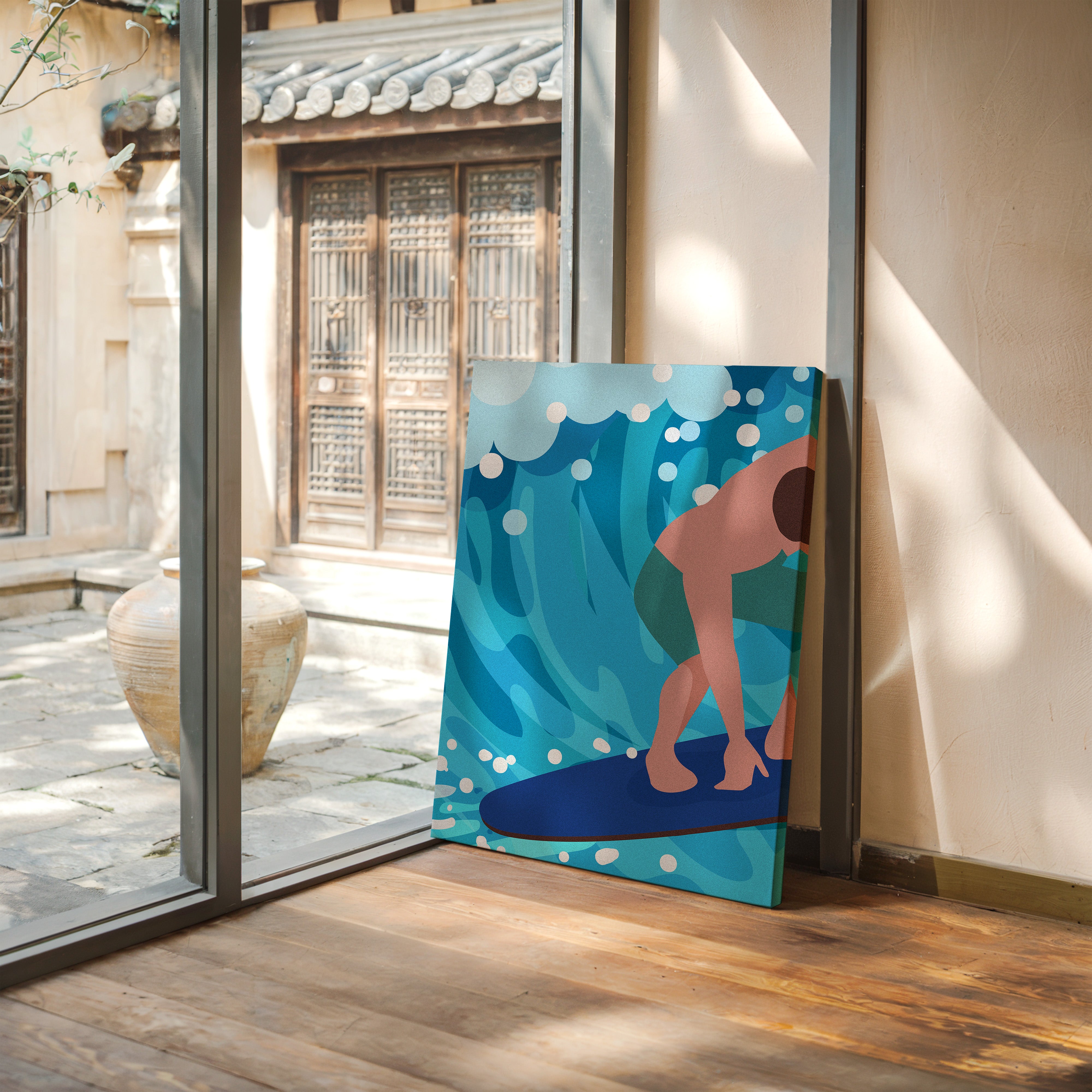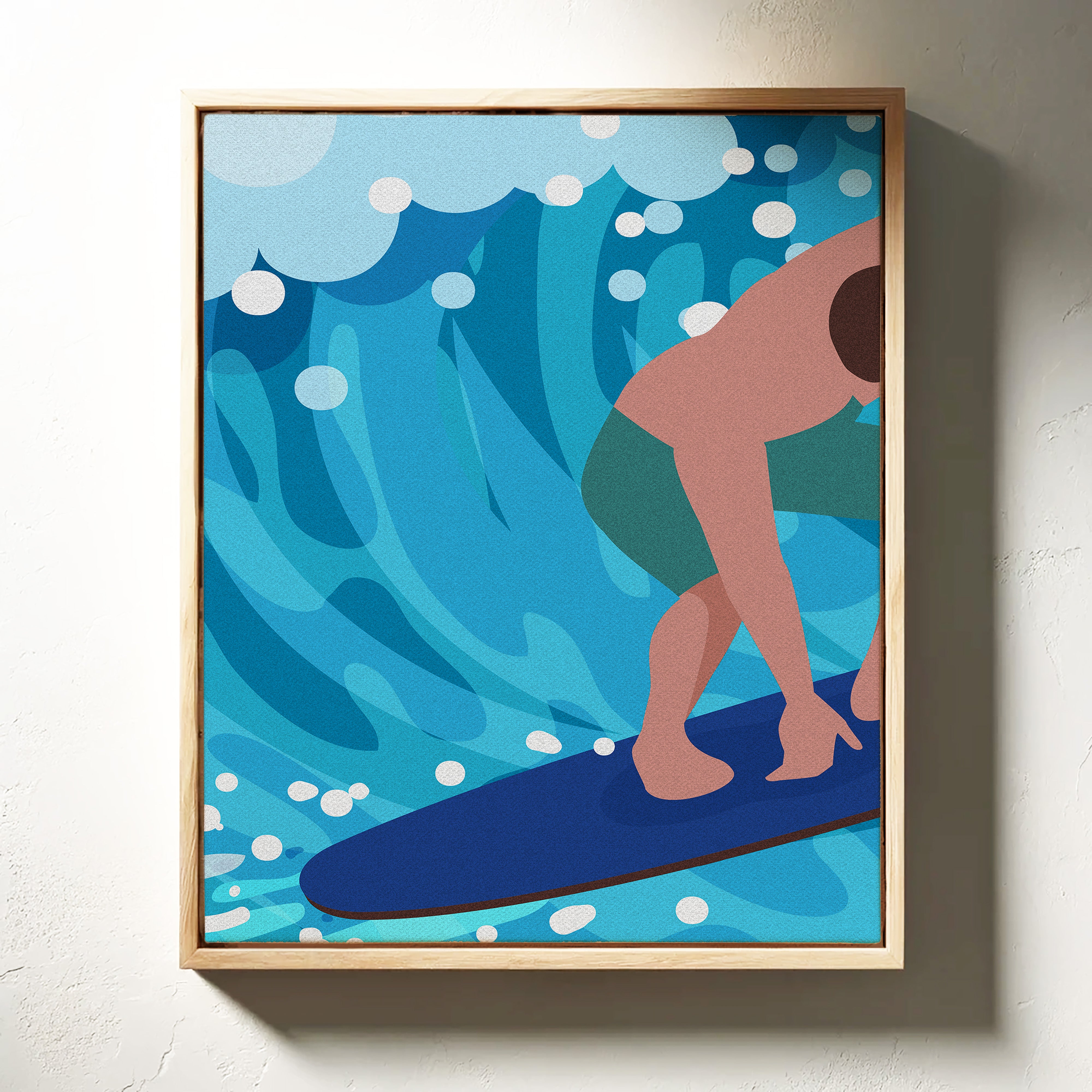 Sea spray catches the morning light as a lone surfer glides through crystalline waves, each droplet a fleeting jewel in the coastal air. This piece from our Contemporary collection captures the fluid grace of ocean sports with bold, minimalist forms. Rendered in vibrant aqua blues and coral pink, the composition celebrates the dynamic relationship between rider and wave, where every curve tells a story of balance and motion. The simplified shapes and striking color palette create a modern interpretation of classic surf culture. This piece brings coastal energy to any space, particularly suited for a bright bedroom or modern living area where its fresh palette can energize the room while maintaining sophistication.